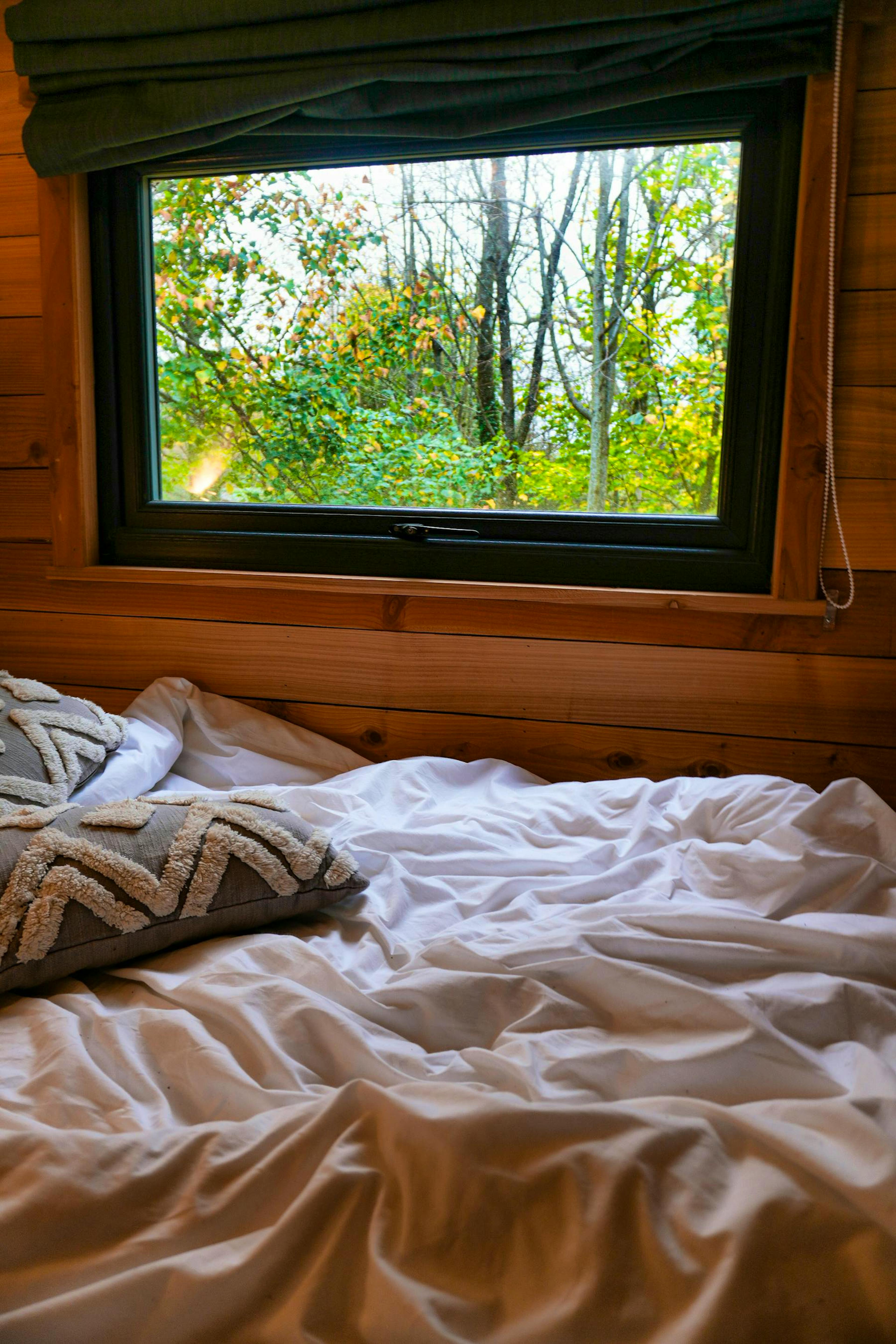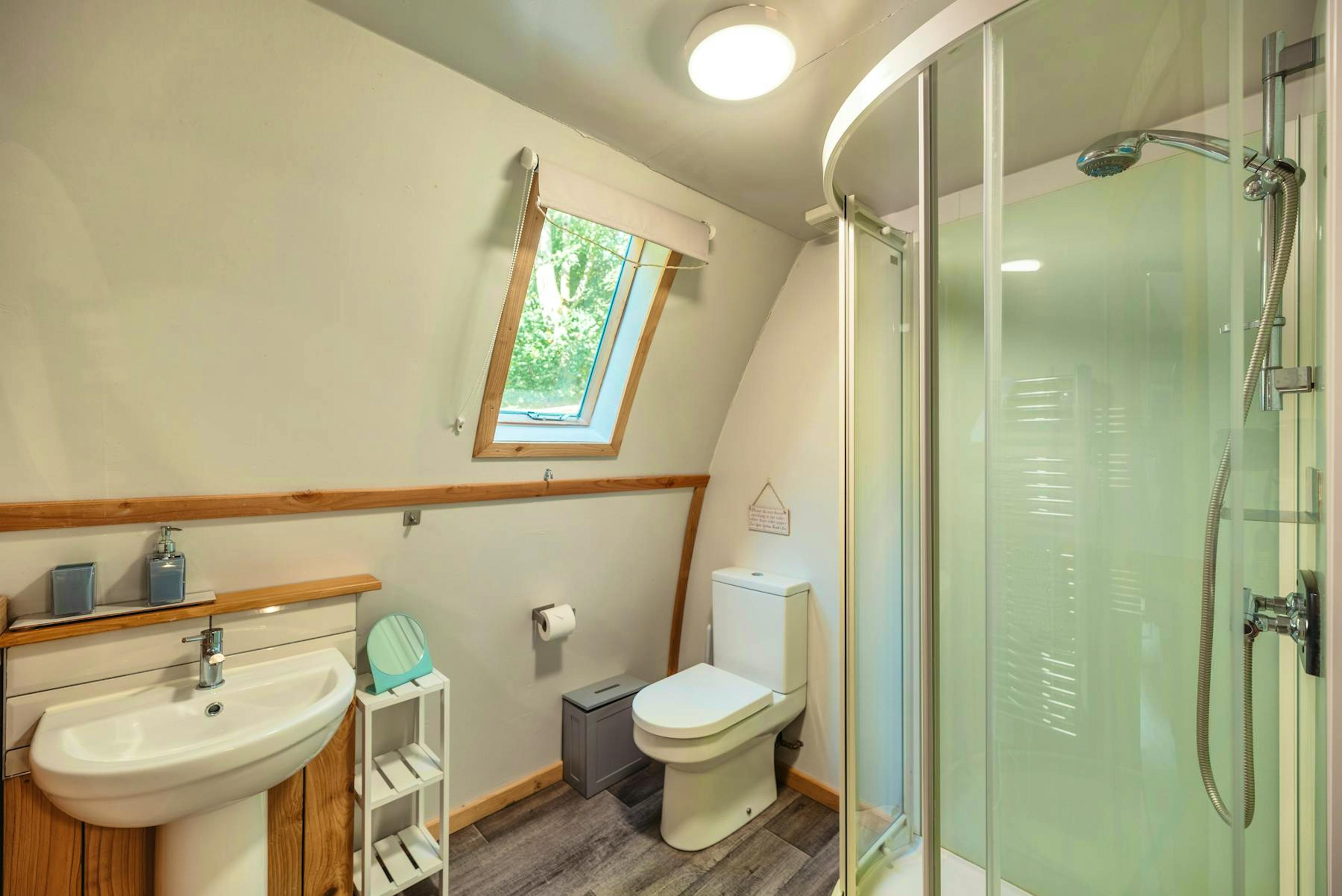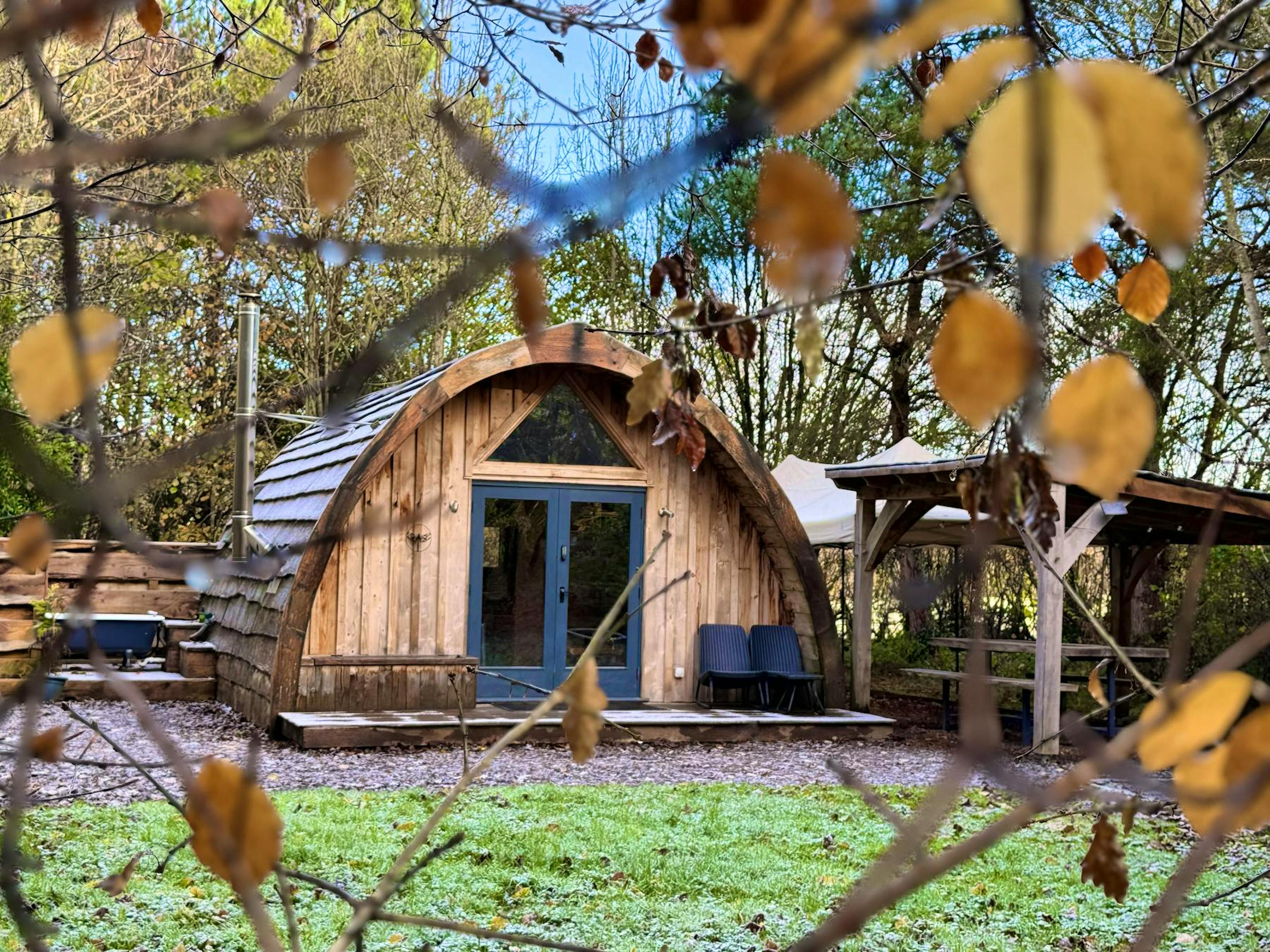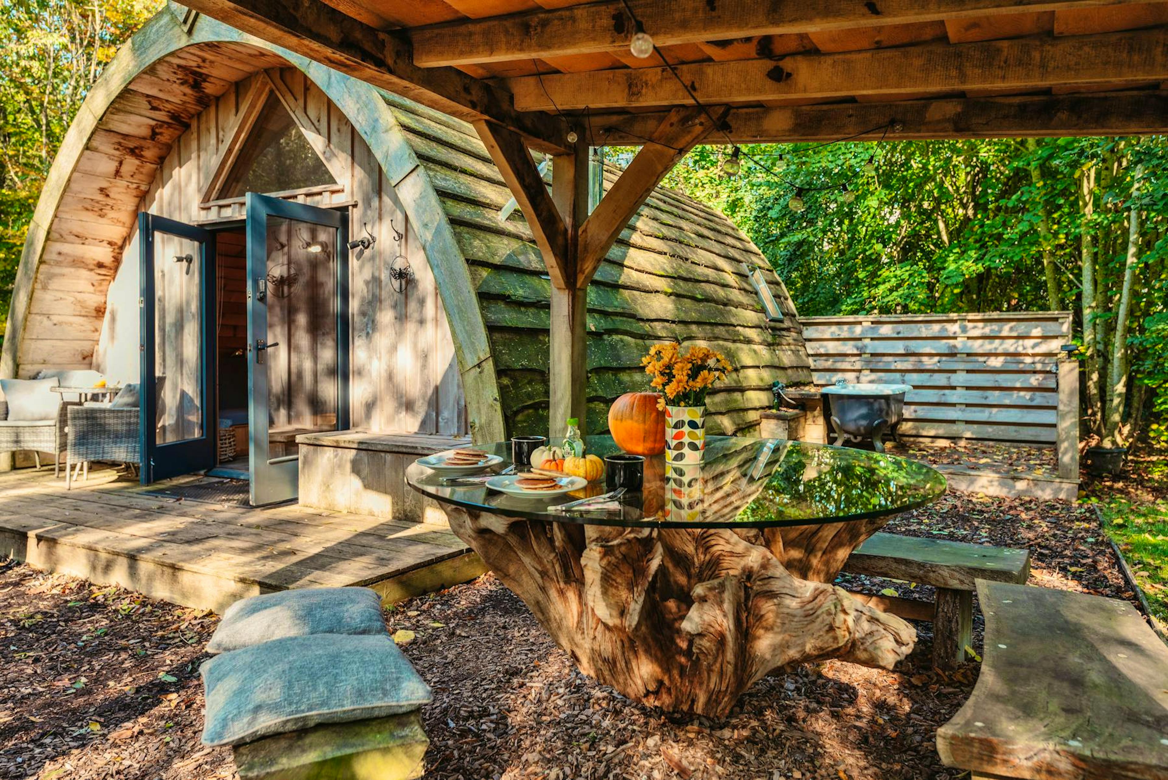Step inside to find a charming living space with a comfy sofa, Smart TV with Netflix and large glass doors that frame stunning woodland views.