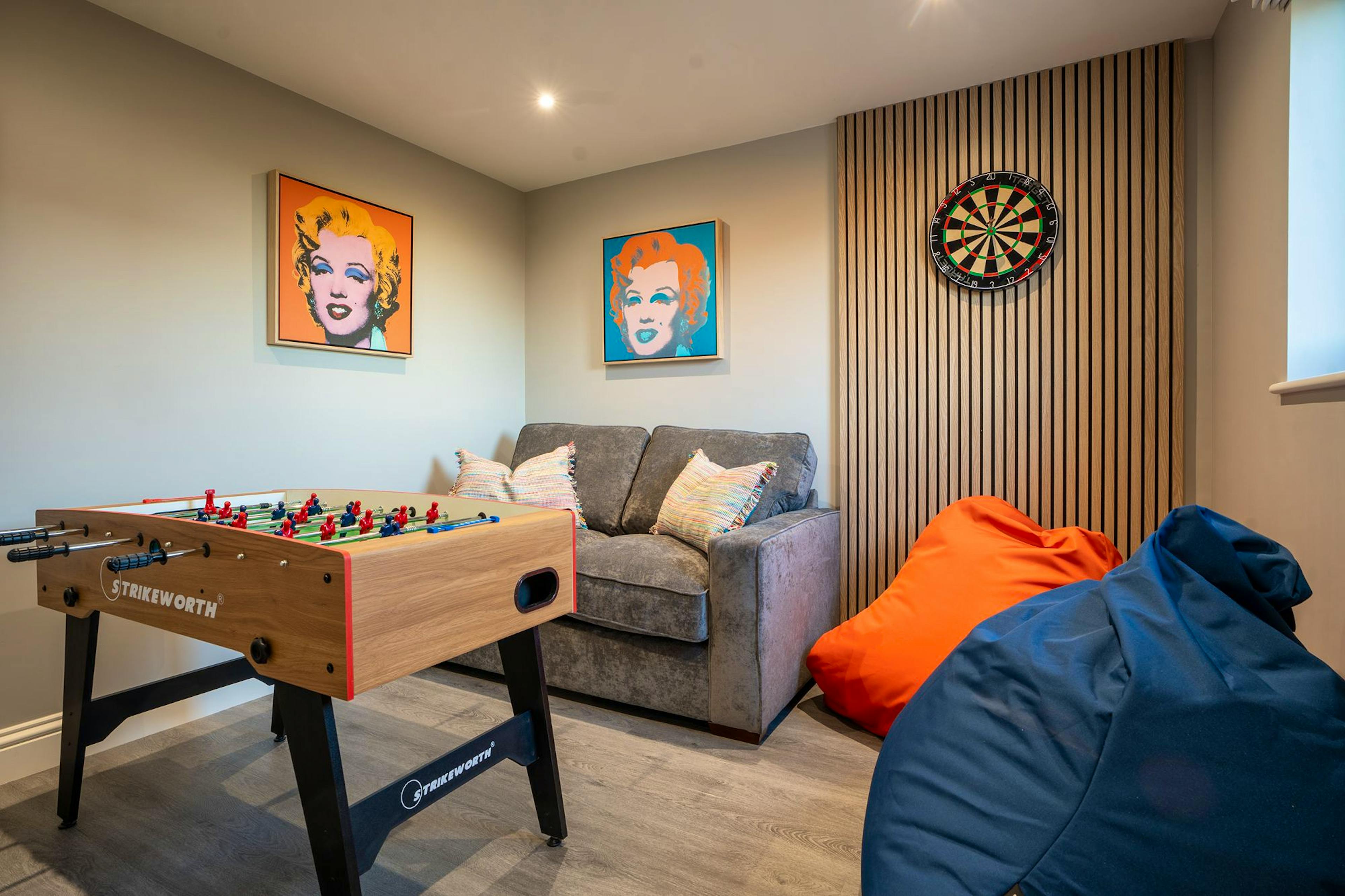 A dedicated games room with table football, darts, comfy seating and a Smart TV for all ages.