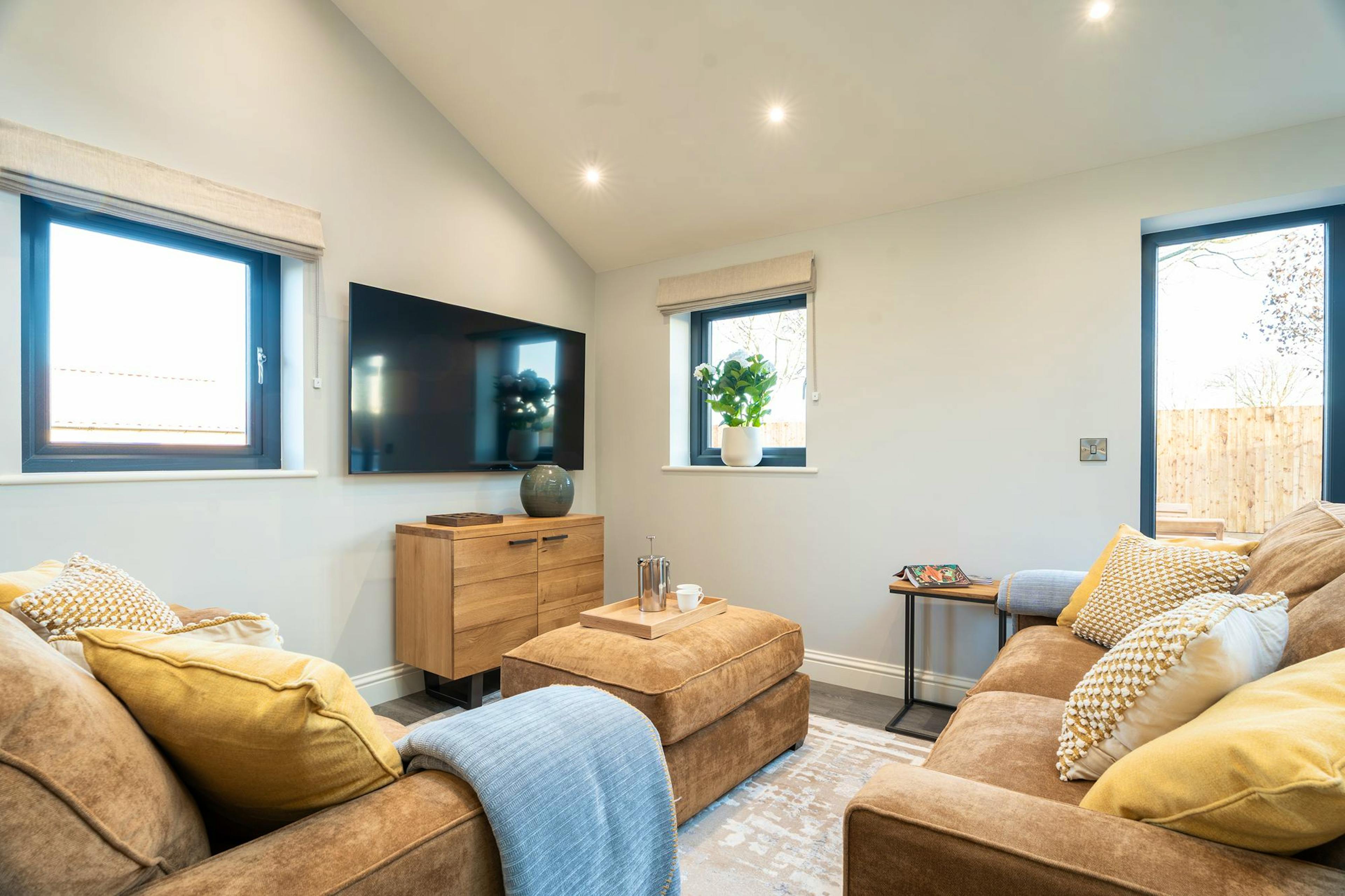 Light-filled open-plan living with generous seating, a Smart TV and patio doors opening straight to the garden.