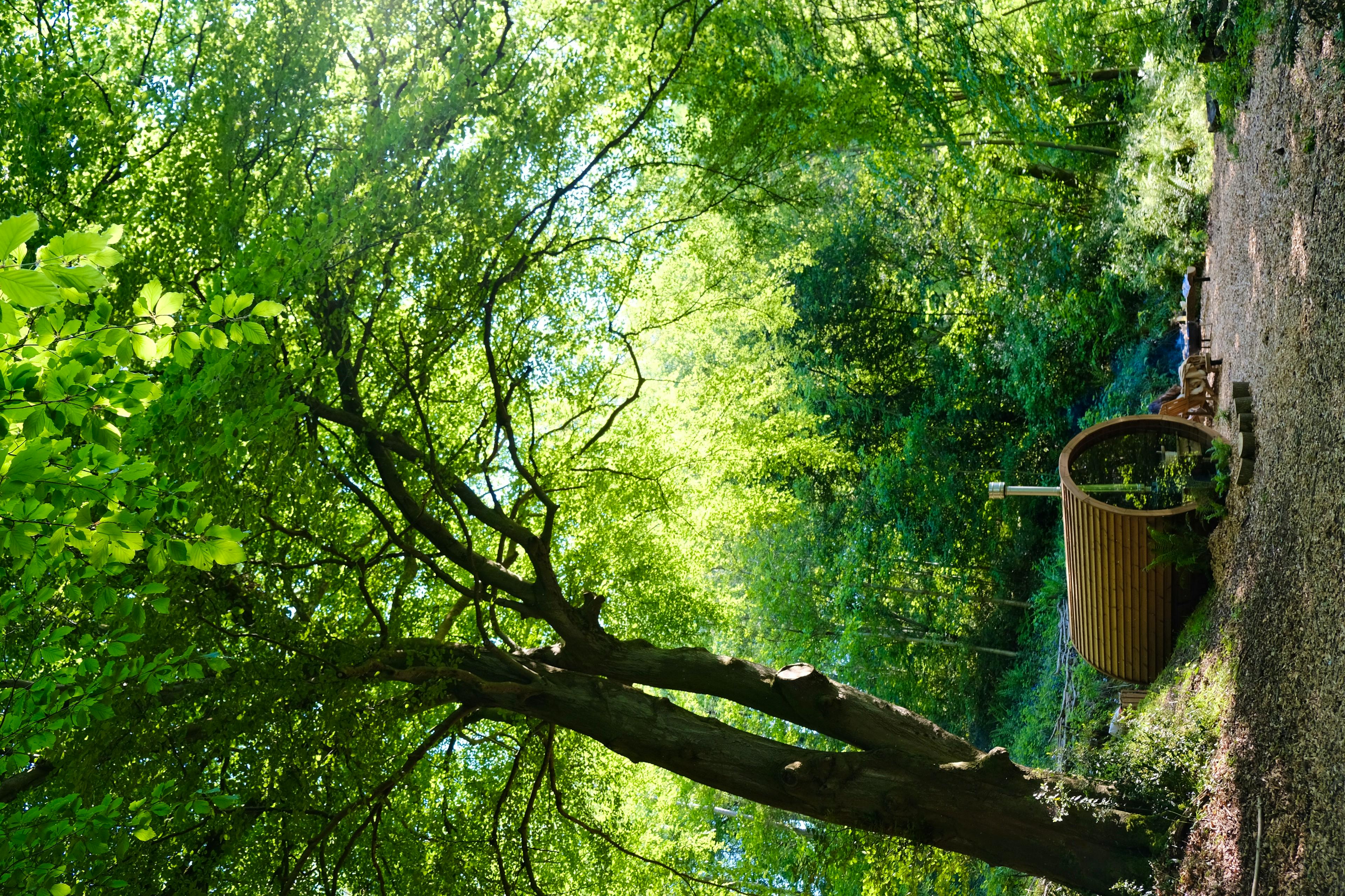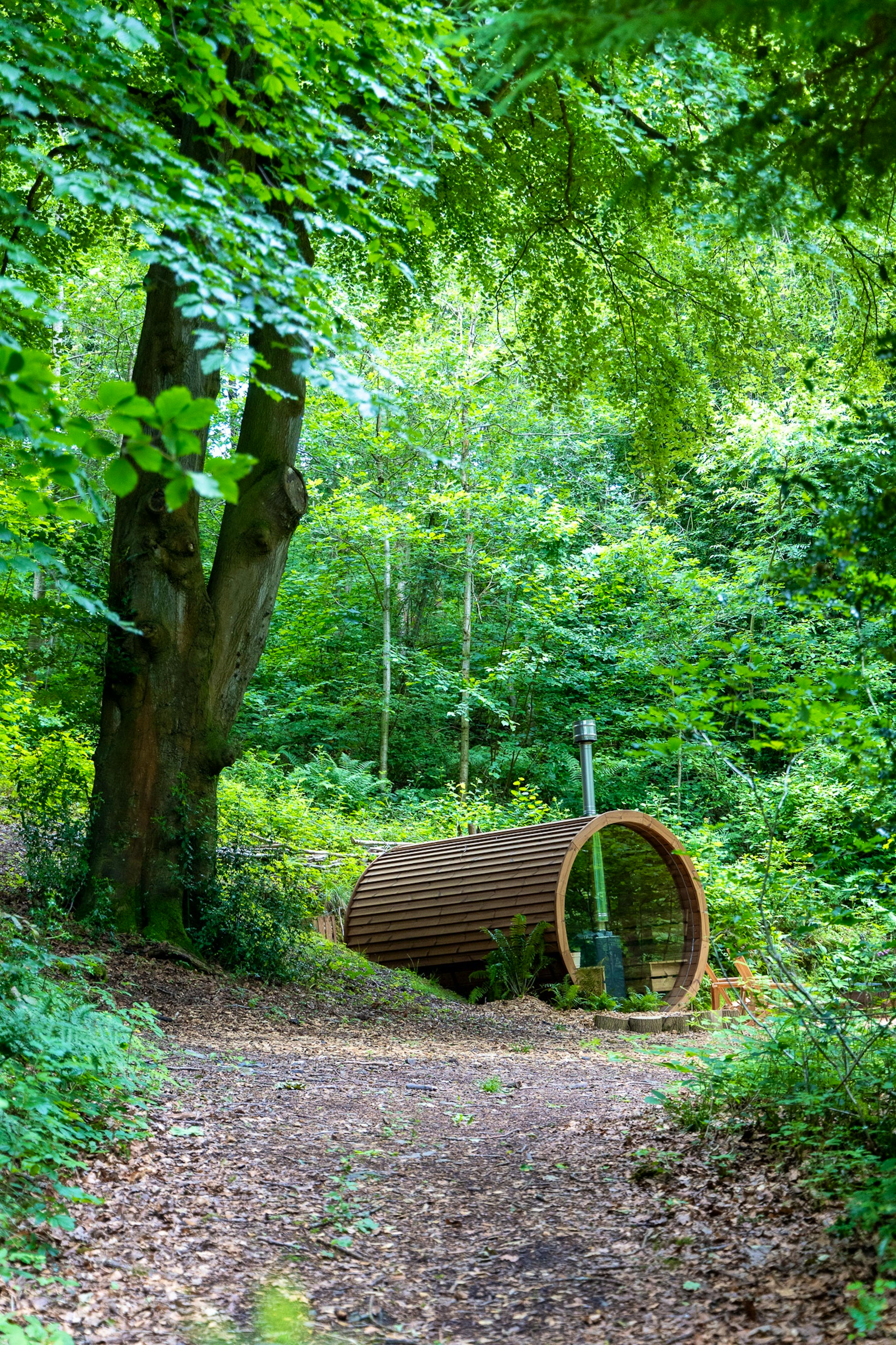 Woodland sauna set beneath a majestic beech tree, complete with a fire pit and seating area.