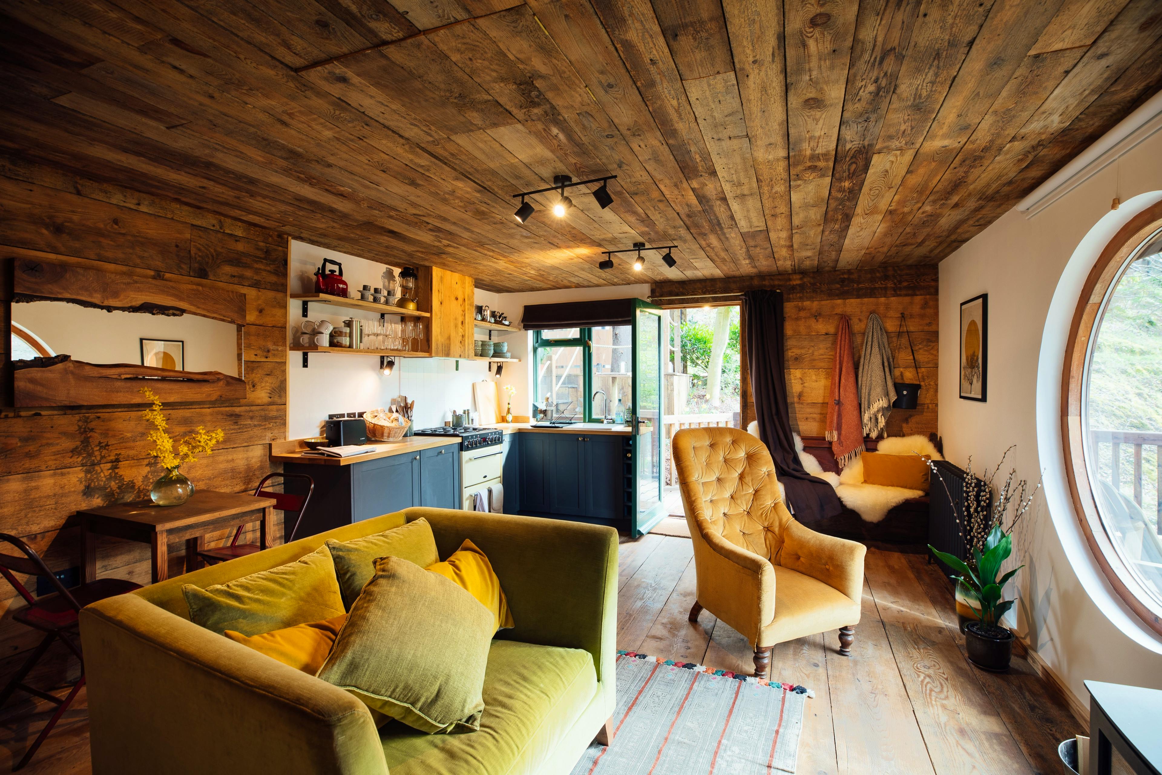 Nestled deep on the edge of a private Welsh woodland, The Forager’s Cabin is a true back-to-nature escape where slow living, thoughtful design and woodland luxury come together effortlessly. Surrounded by mature trees and overlooking 10 acres of semi-ancient broadleaved woodland, this handcrafted hideaway invites you to switch off, breathe deeply and let the rhythm of the forest set the pace. Designed with sustainability at its heart, the cabin has been built using reclaimed materials and finished with earthy textures, rich tones and nature-inspired art. Inside, it feels wonderfully calm and cocooning. A cloud-like super-king size bed promises blissful nights to the soundtrack of rustling leaves, while the cosy living space centres around a crackling wood-burning stove and a huge round picture window that frames the woodland beyond. The modern kitchen is fully equipped for slow breakfasts and hearty suppers, and the bathroom features a walk-in rain shower with eco toiletries and a flushing loo. Step outside and the experience truly unfolds. Two separate decks give you different ways to soak up the setting. One is perfect for alfresco dining with a BBQ, big wooden chairs and space for long evenings of stargazing. The other is tucked deeper into the trees, creating a secluded nook for sinking into the wood-fired hot tub, glass in hand, as the day fades away. A short stroll into the woods brings you to the woodland spa. Beneath a majestic beech tree sits the wood-fired sauna, complete with its own fire pit and seating area. Whether you’re starting the day gently or unwinding after a hike, this is a place to reconnect with nature and yourself. At the far end of the woods, a specially created sundowner spot looks out towards rolling hills, perfect for fireside cooking, sunset drinks and moments of complete stillness. When you’re ready to explore, Wild Wales stretches out in every direction. The cabin sits between the Shropshire Hills and Snowdonia, with quiet trails, hill walks and soulful views on the doorstep. From scenic hikes to river swims, castle ruins and standout local food spots, there’s plenty to discover before retreating back to your woodland sanctuary.