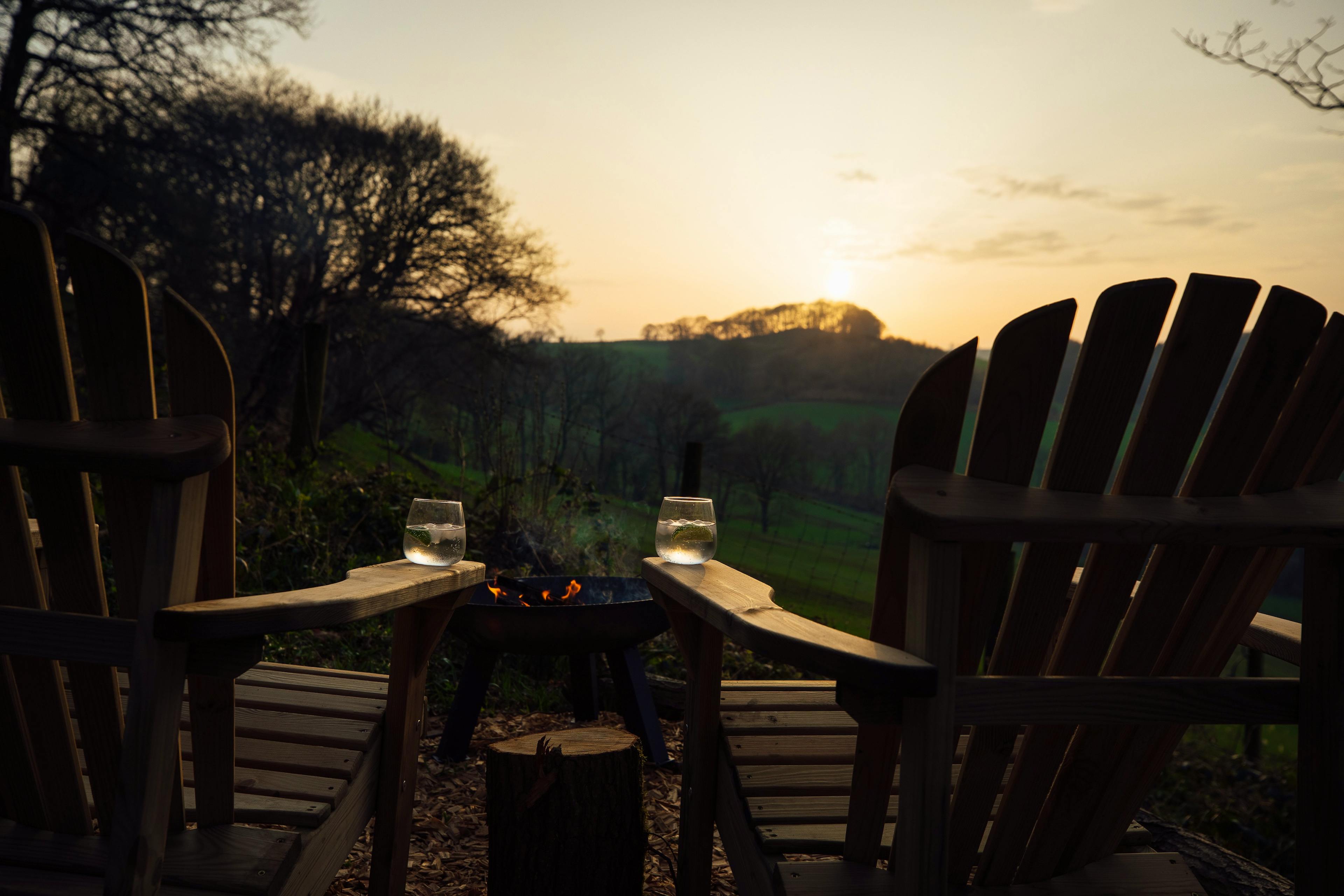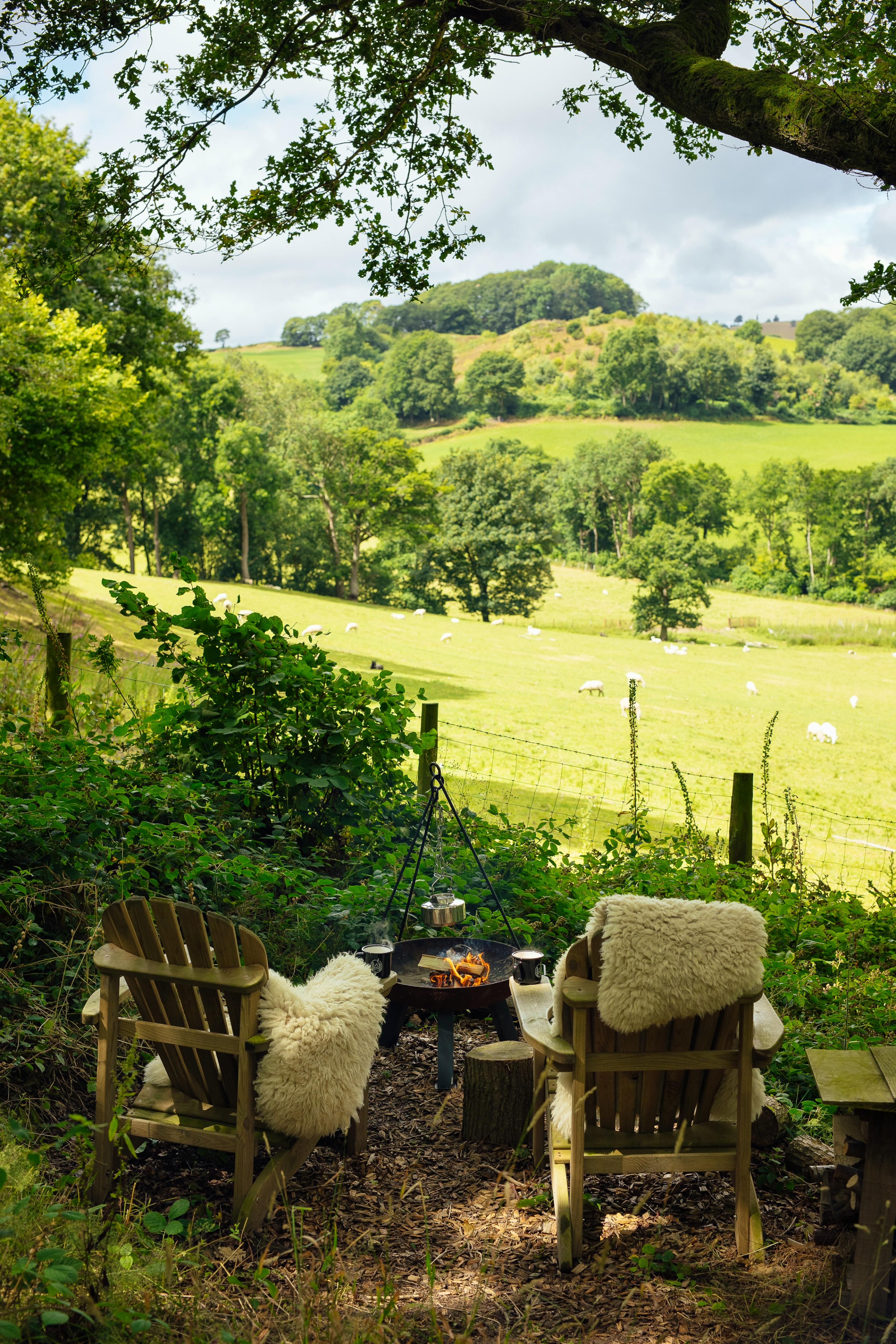 A secluded sundowner area at the end of the woods with hillside views and a firebowl grill.