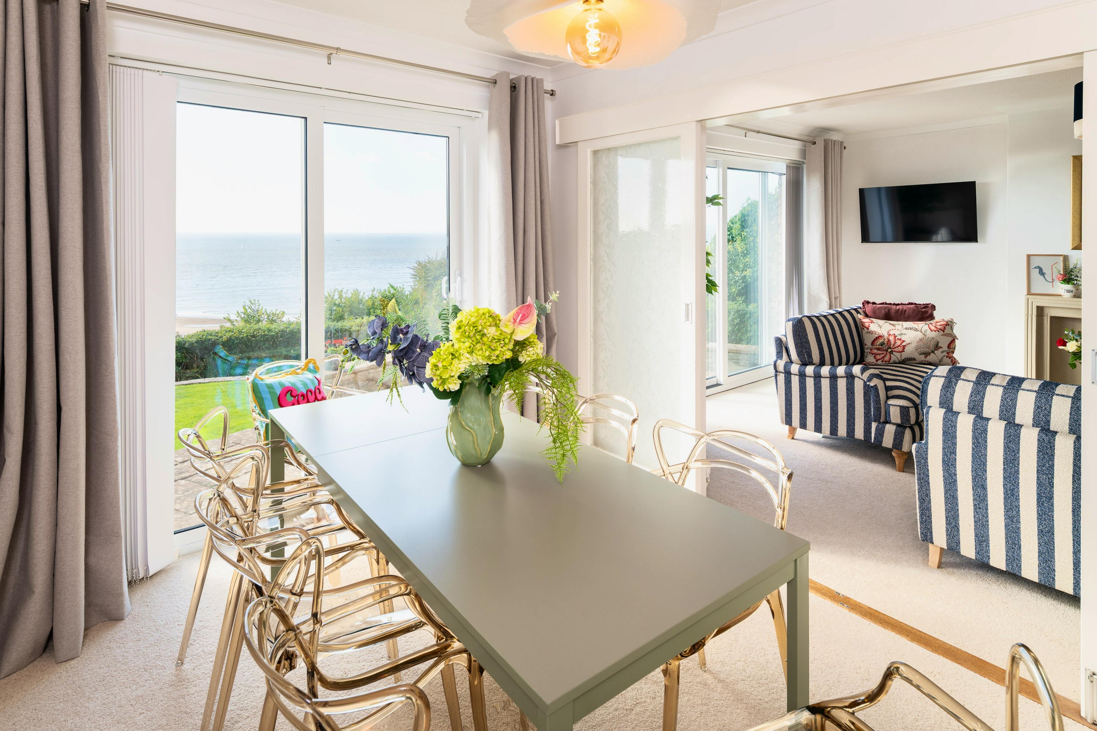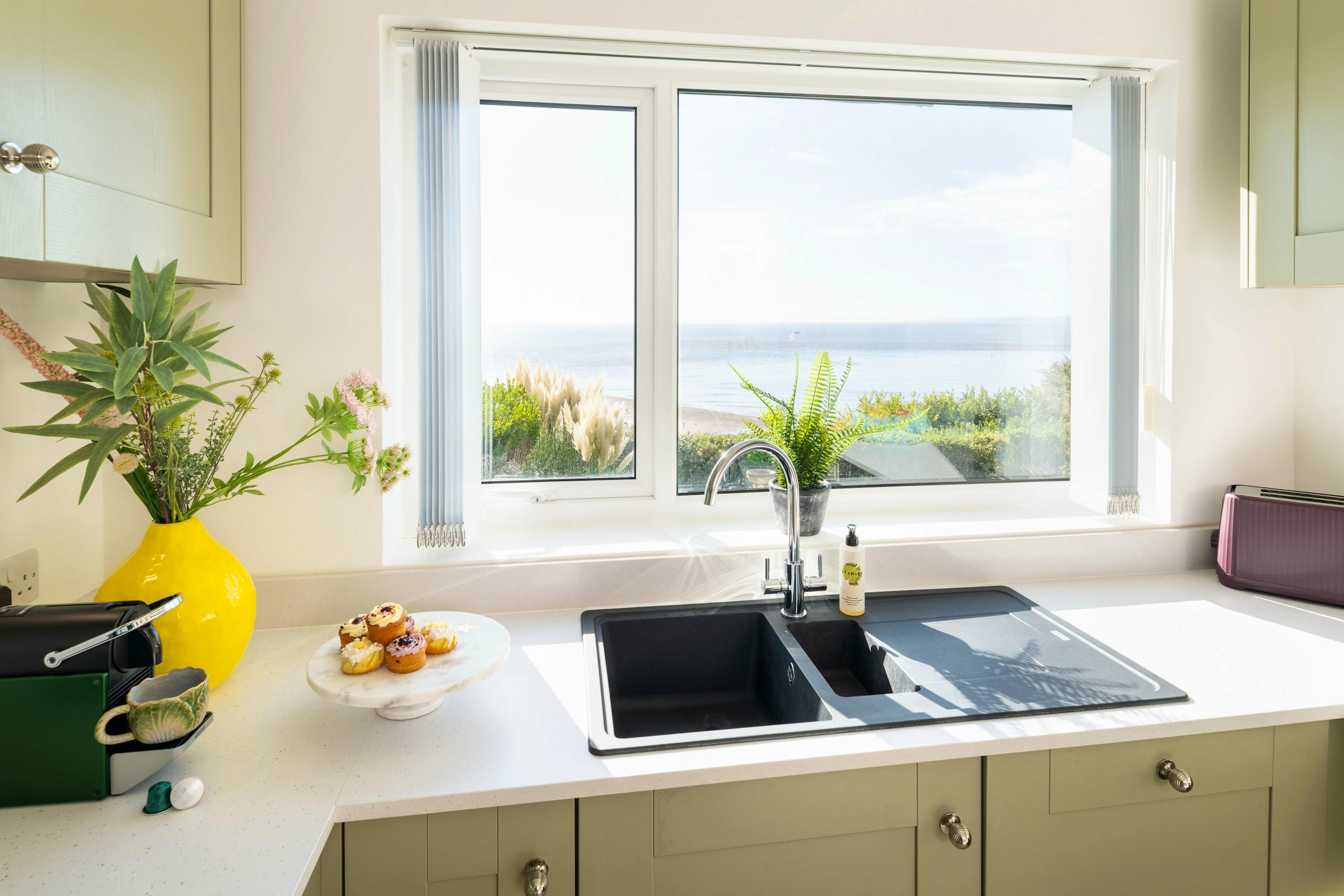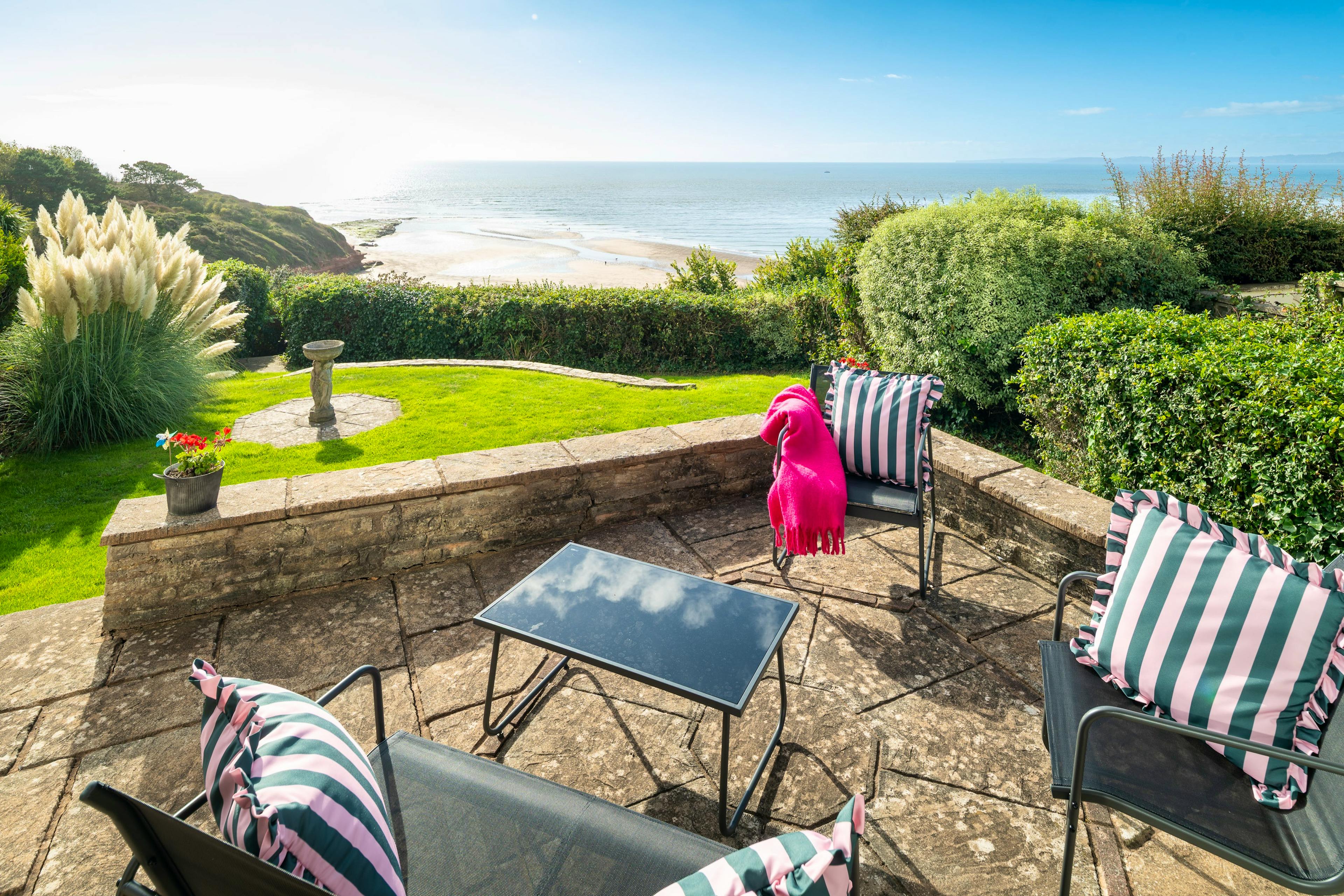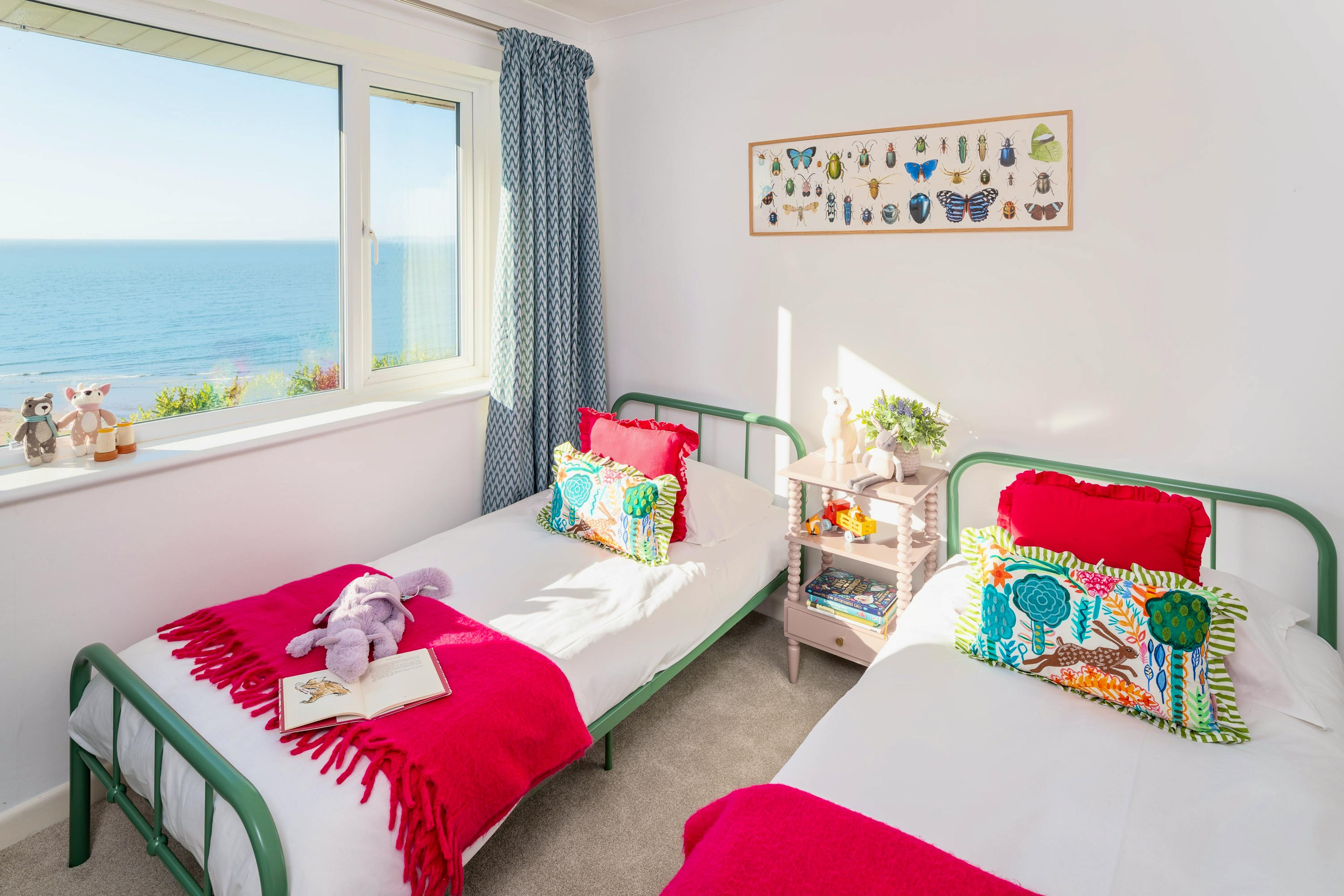 Wake each morning to the ever-changing blues of Lyme Bay and the Exe Estuary at this wonderfully positioned Exmouth hideaway. Foxholes is all about those mesmerising views — the kind that stop you in your tracks the moment you arrive. Perched above the eastern end of the beach, this light-filled coastal home blends fresh, fun interiors with a truly unforgettable outlook, giving families and friends a serene base where seaside living unfolds from dawn to dusk. Step inside and you’ll find an inviting upside-down layout designed to soak up the scenery. The spacious ground-floor living area sits high above the shoreline, with full-width windows framing the garden, beach and distant headlands. Morning coffee is a ritual here, especially when the sea is shifting colour and paddleboarders glide silently across the estuary. In cooler months, the gas fire turns this bright space into a cosy retreat after windswept walks along the South West Coast Path, accessible straight from the garden gate. The sage-green kitchen and dining space continues the calming coastal palette and is beautifully equipped for leisurely breakfasts and laid-back dinners. A Nespresso machine, wine cooler, plate warmer and a full suite of appliances ensure you have everything needed, whether you are whipping up a feast or heading out to sample Exmouth’s impressive seafood scene. Upstairs, three of the four bedrooms offer dreamy sea views, each capturing a slightly different slice of coastline. The king bedroom with ensuite bathroom is the star — soft pink tones, generous storage, its own balcony and a vista made for sunrise coffees. Children will adore their themed twin room with a morning view that sparks instant excitement for the beach. Another pretty double room, complete with playful aquatic touches, also looks seaward, while the final small double sits on the middle level, cosy and restful. A family bathroom with a jacuzzi bath adds a little extra indulgence. Outside, a sunny patio opens onto a charming lawned garden, with the coastal path just beyond the private gate. It’s a blissful spot for long lunches, sunset drinks and simply absorbing the rhythm of seaside life. Should you wish to venture out, Exmouth is a treasure trove of cafés, independent shops, excellent restaurants and watersports. Wander into town, spend a day on the sands, hire paddleboards or take a boat trip up the estuary. With Budleigh Salterton, Topsham and Dartmoor all within easy reach, this is the perfect base for a classic Devon escape.