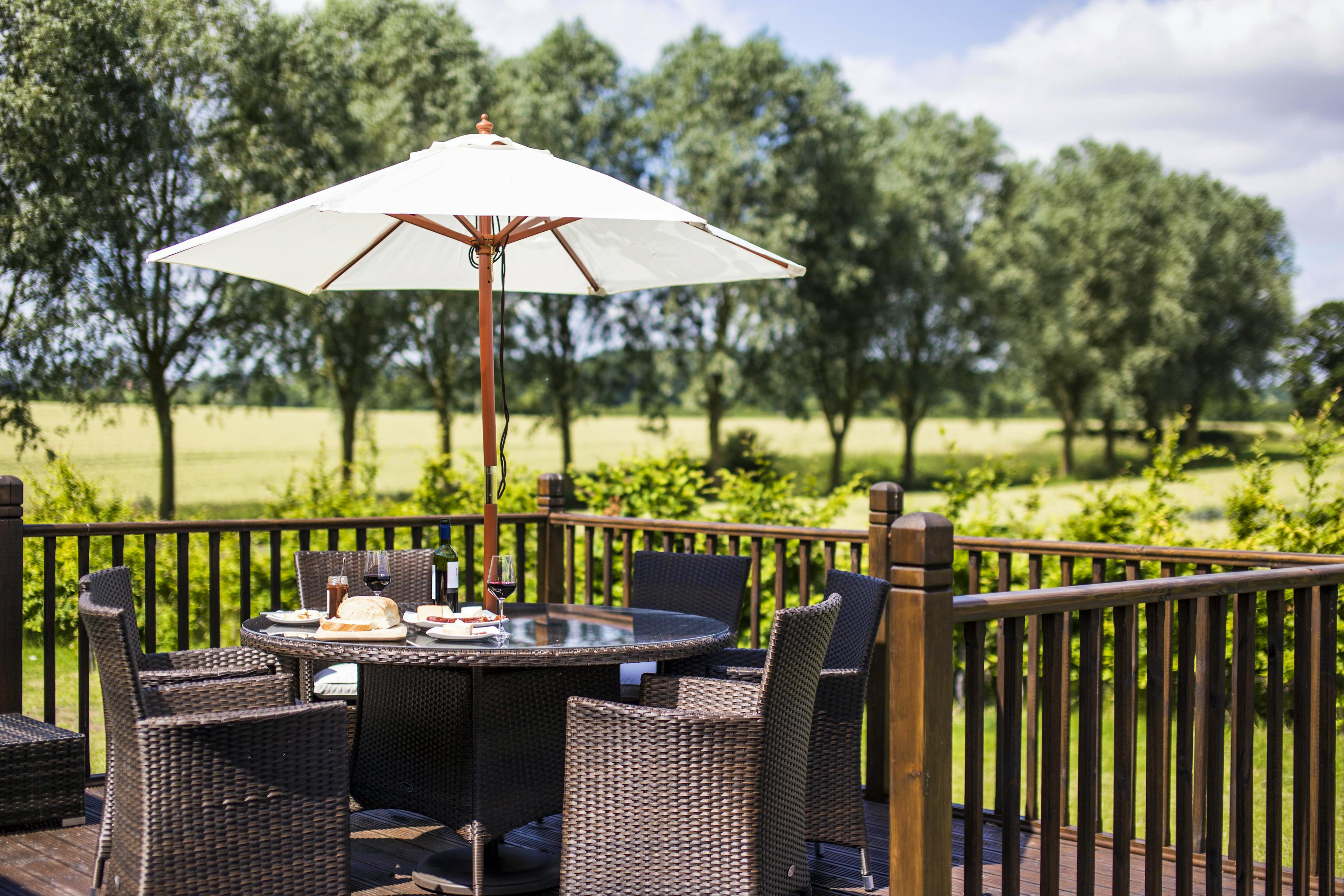 Large decked area outside with furniture and barbecue.