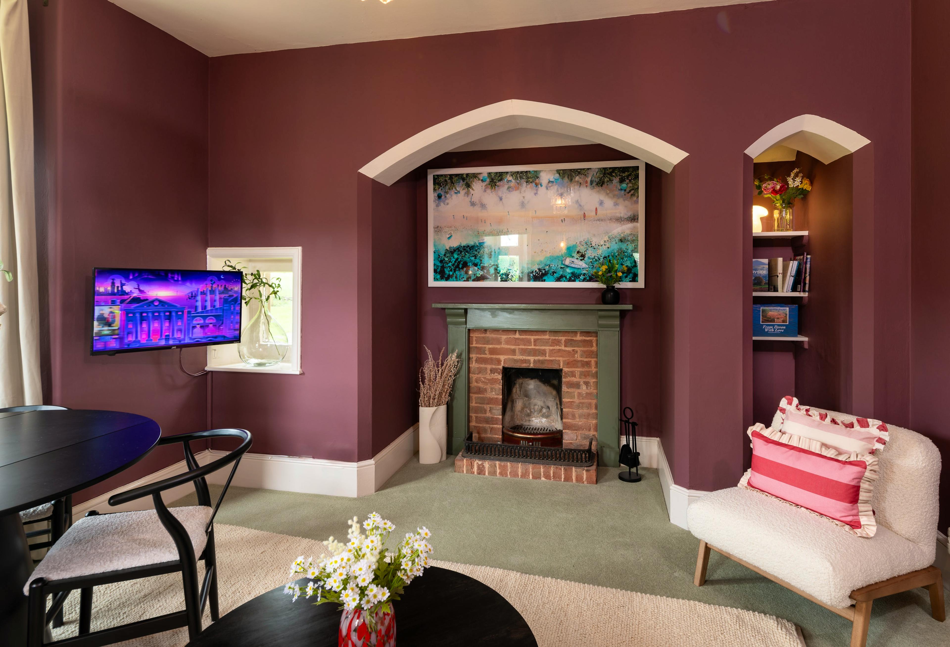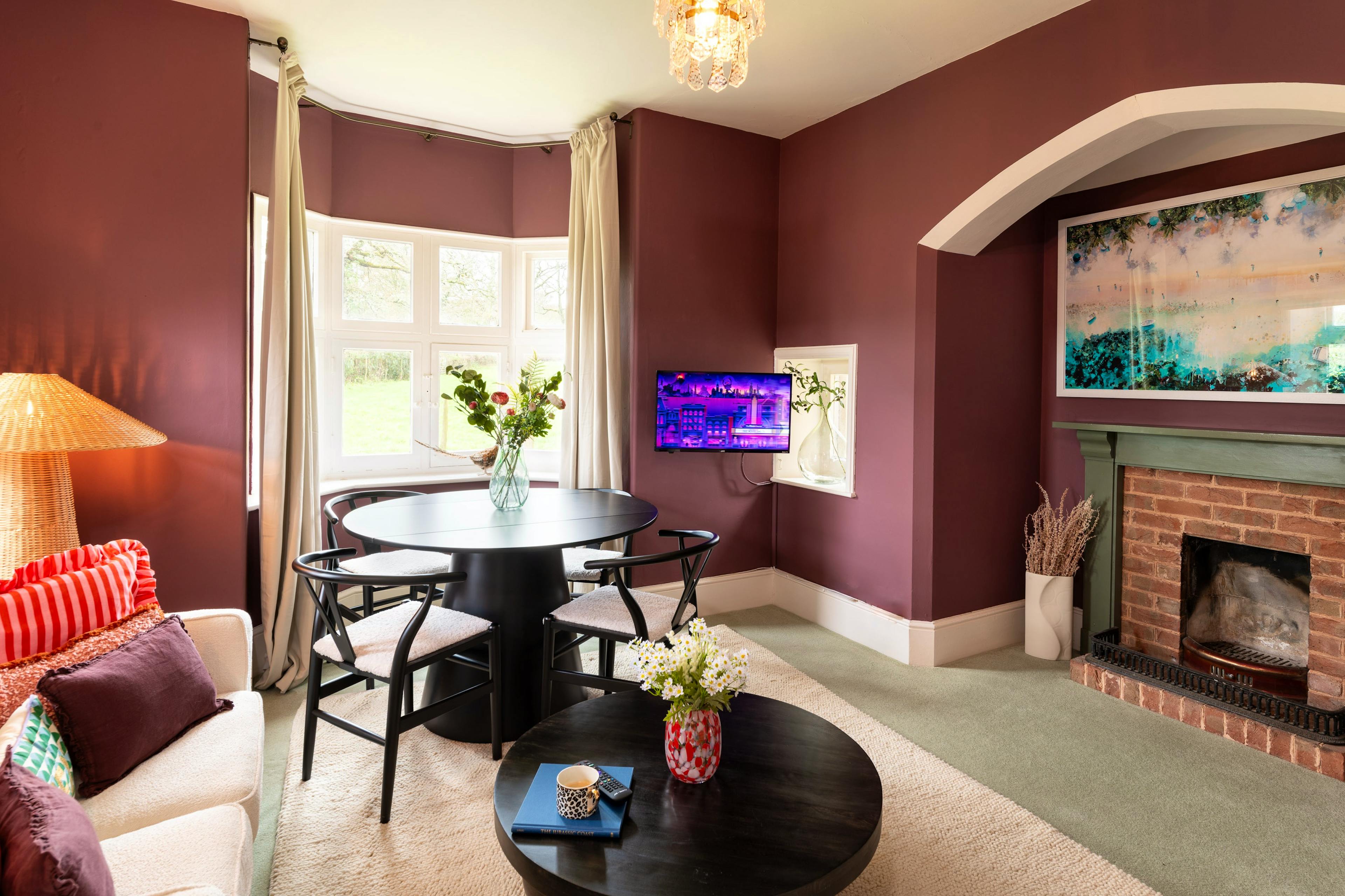 Sink into the warm, plum-toned living room after country walks and unwind on the inviting boucle sofa as the day slows around you.