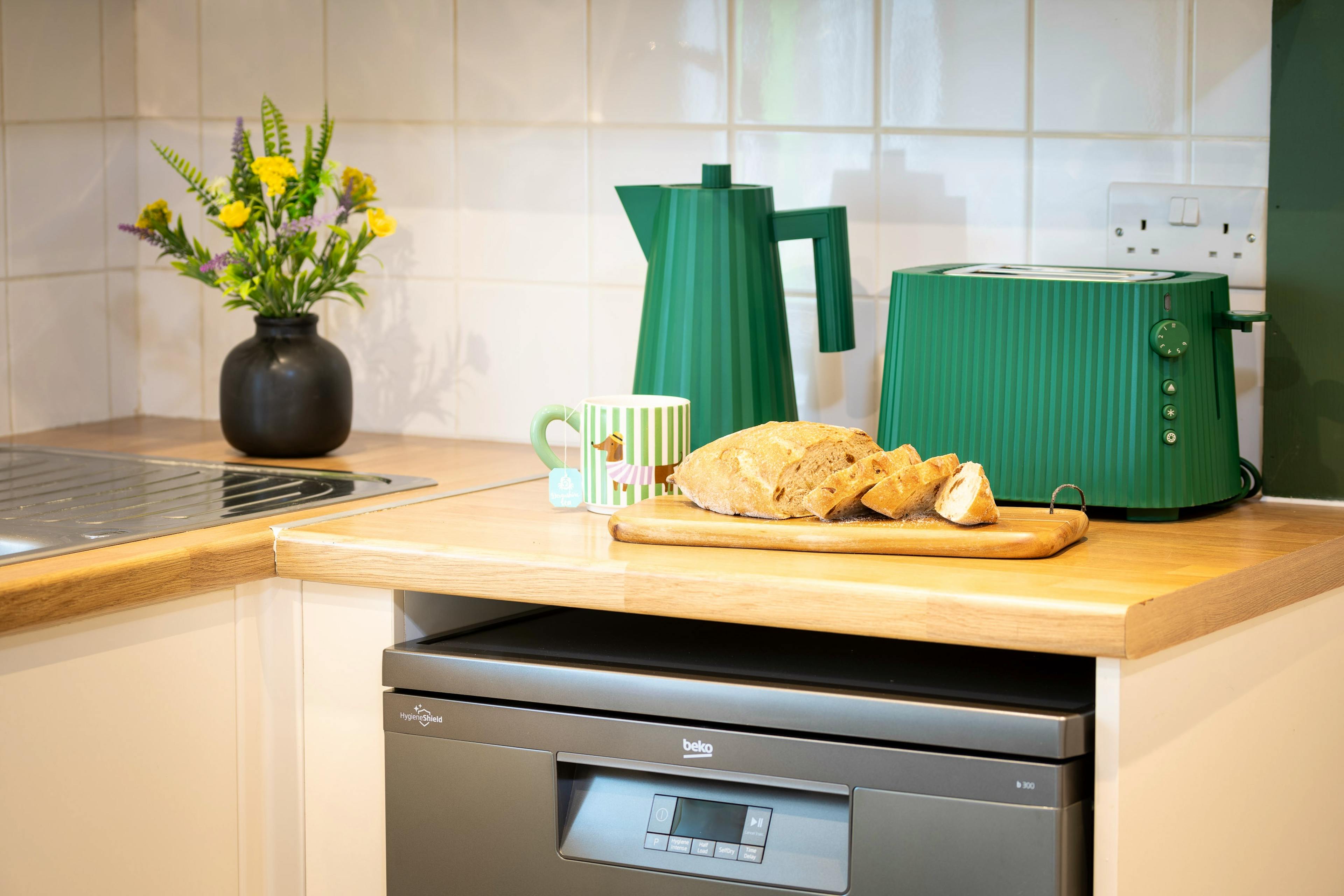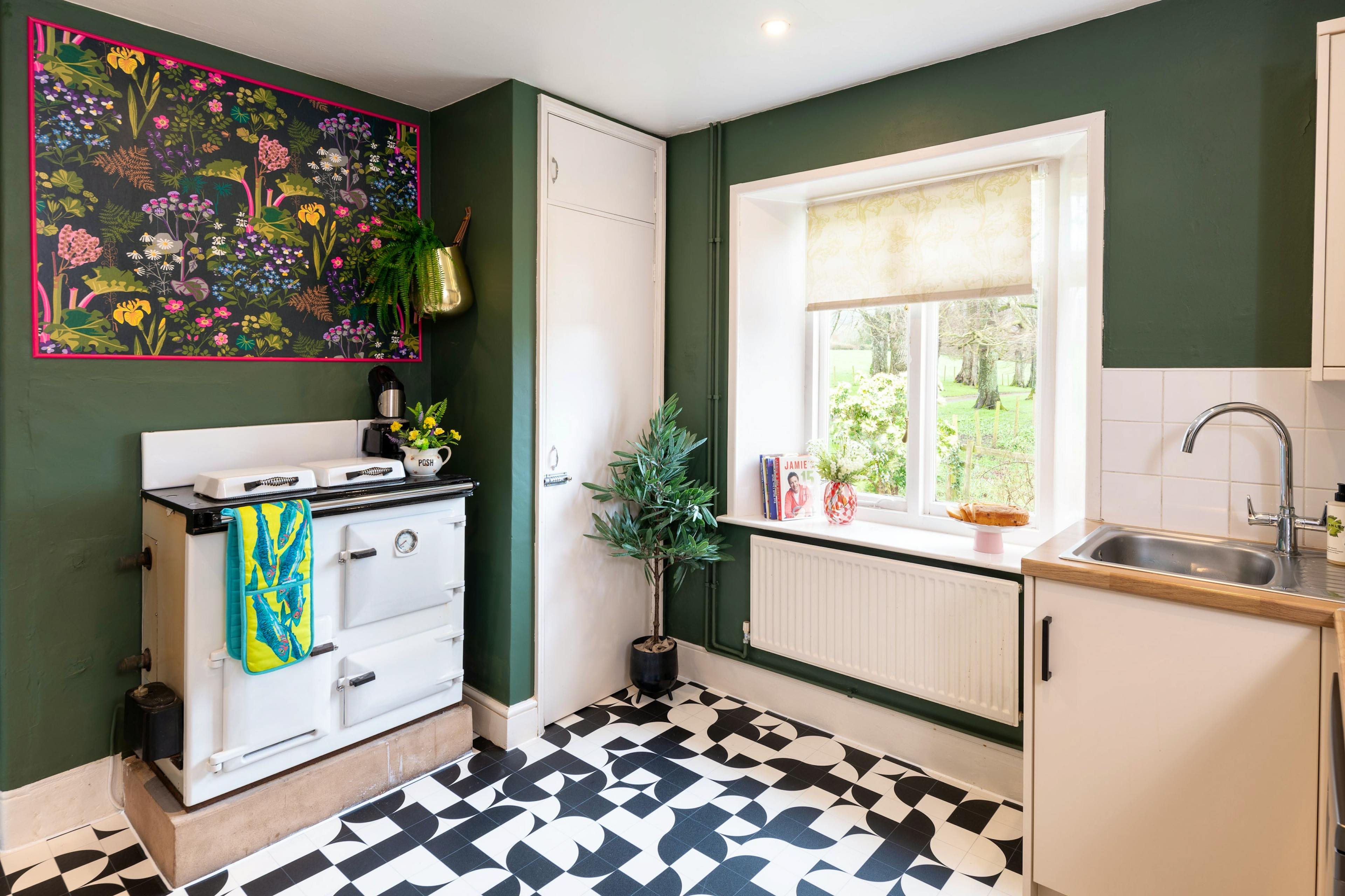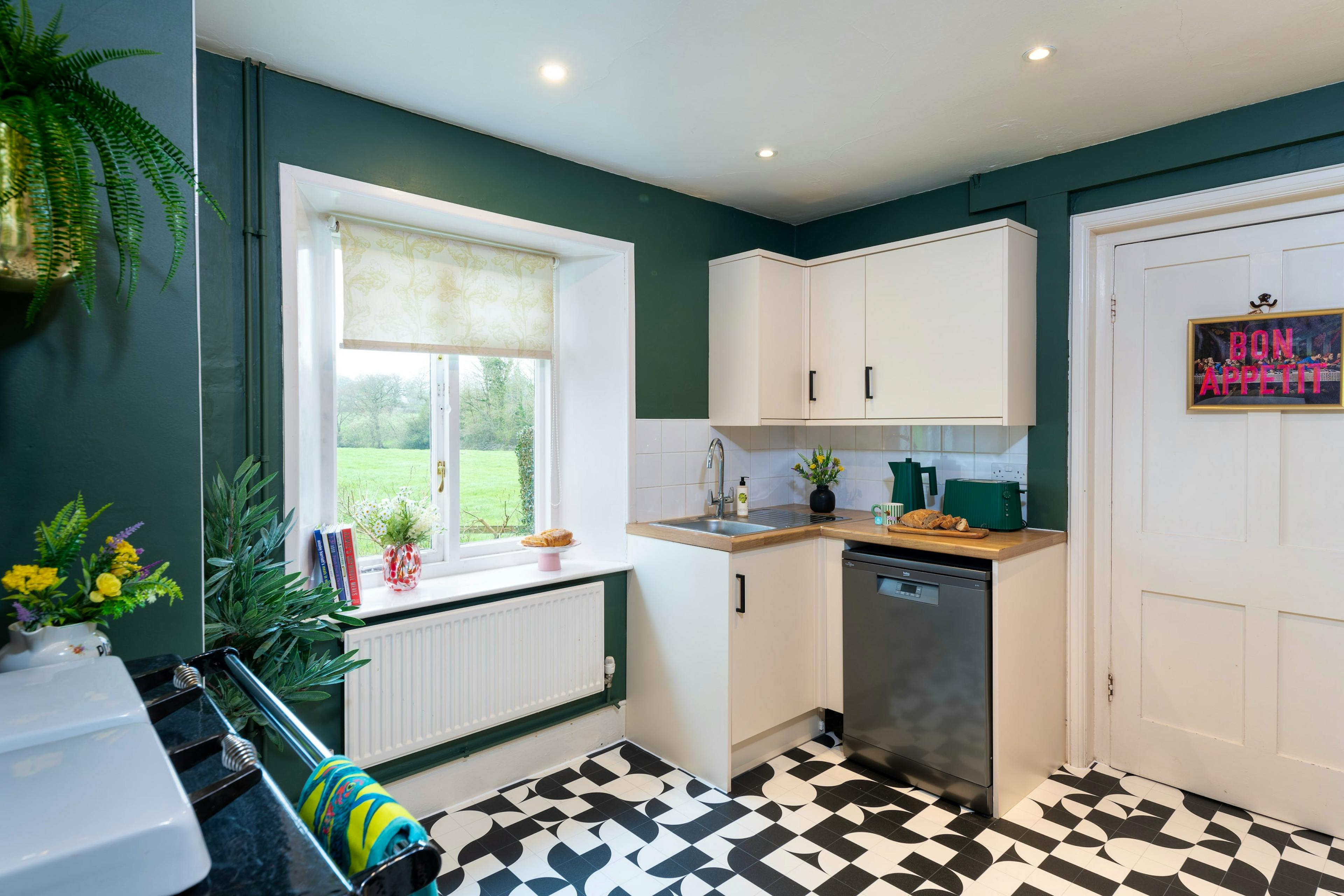 Cook in style in the playful sage green kitchen with its bold tile-effect floor and enjoy everything from quick breakfasts to cosy suppers.