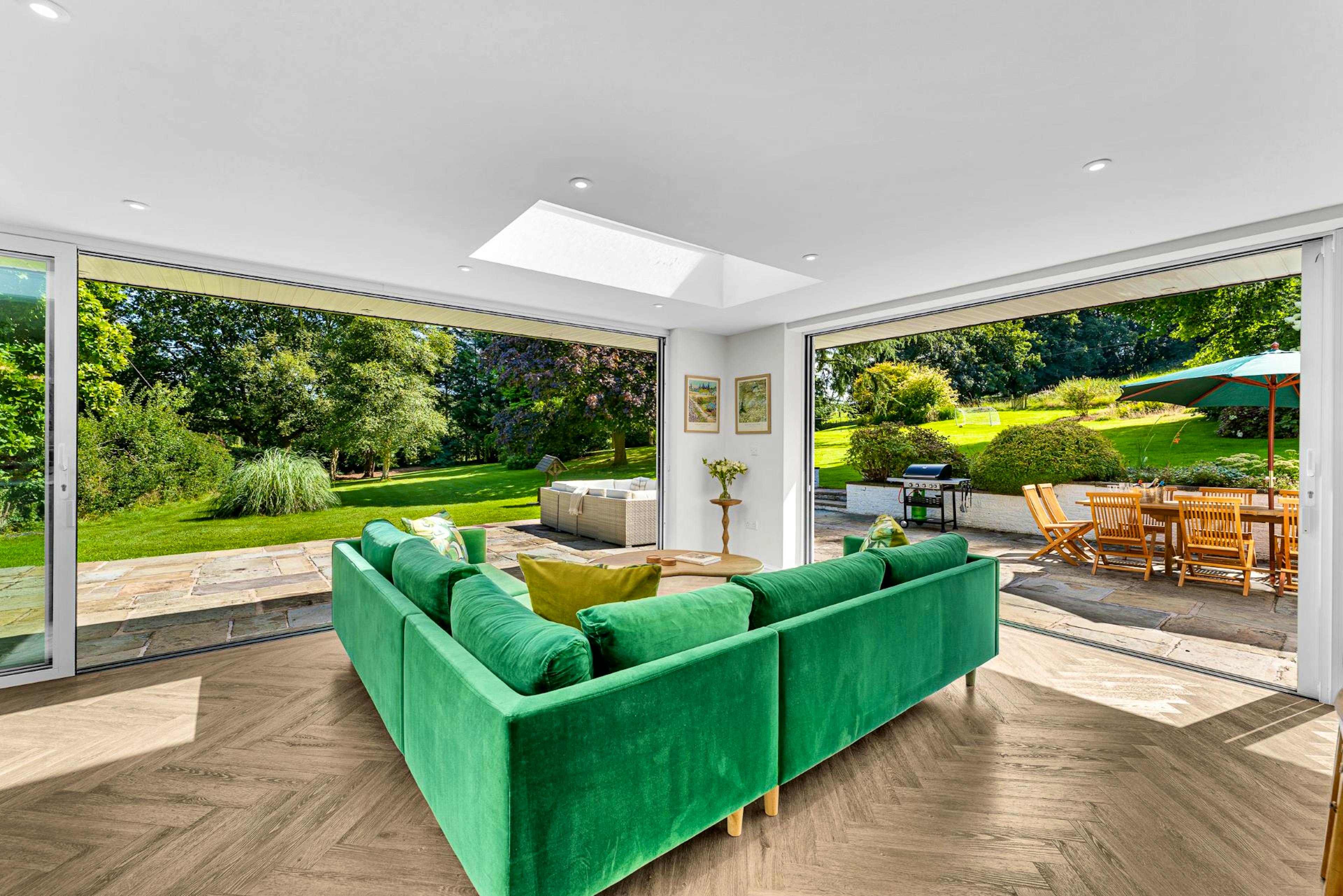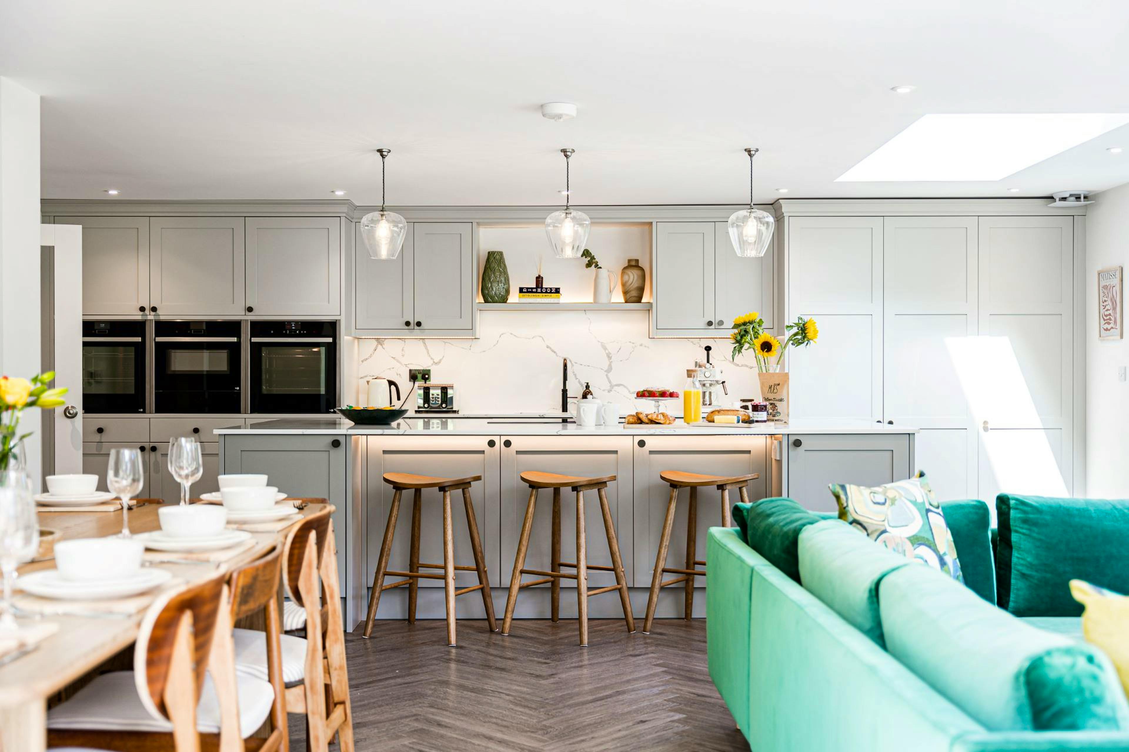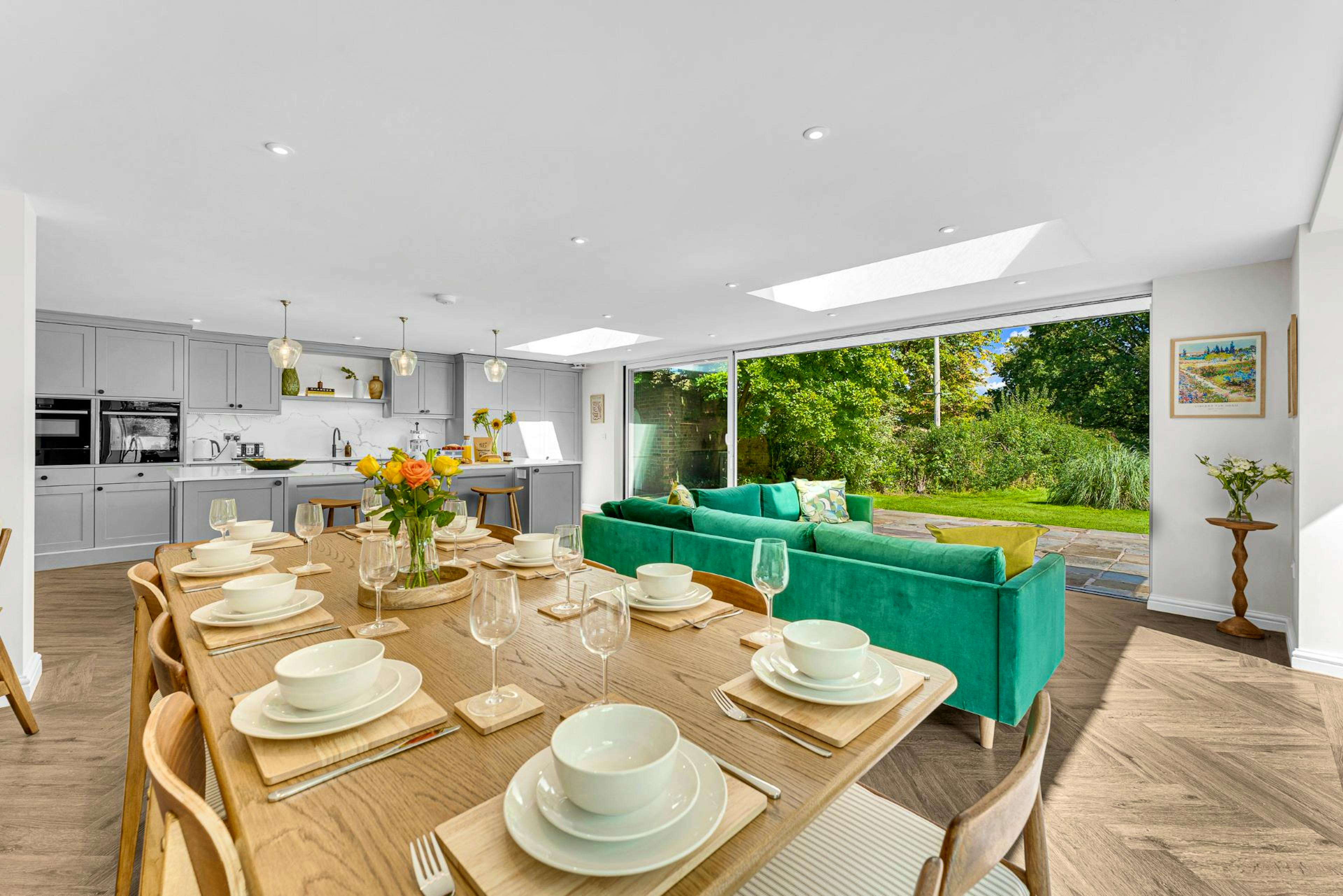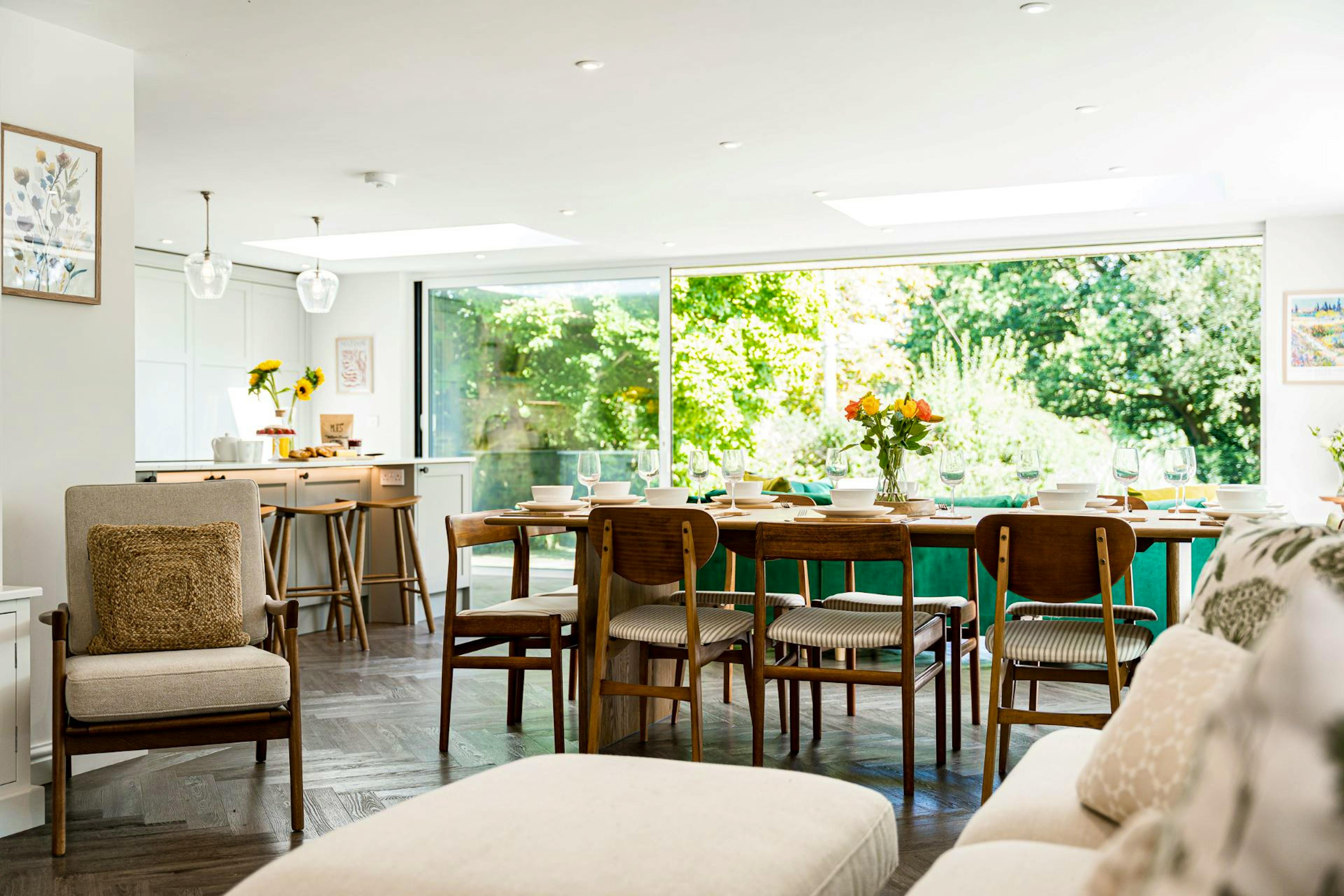 Vast open-plan kitchen and living space with multiple seating areas and a ten-seater dining table.