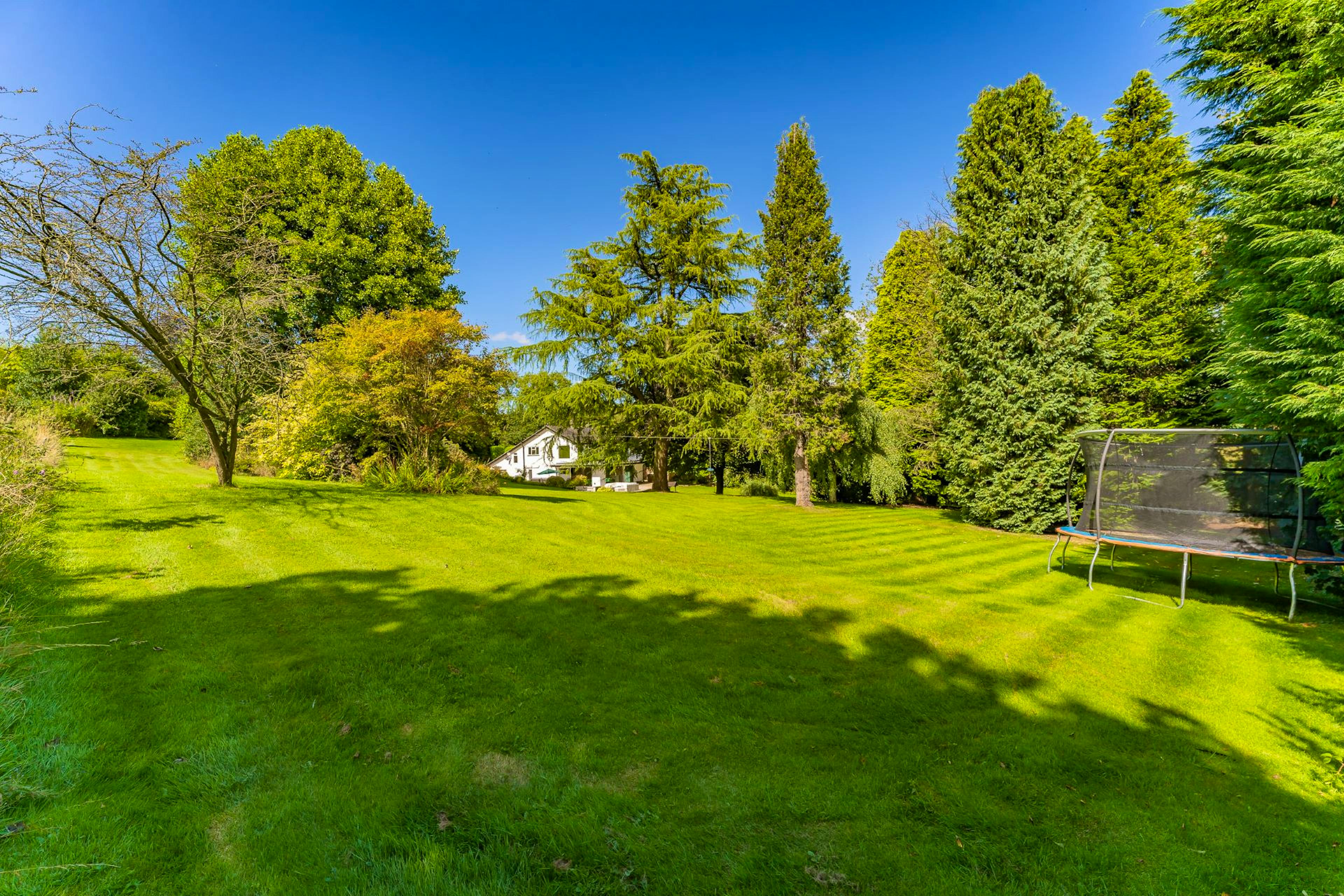 Expansive enclosed gardens with trampoline, garden games and secure gates for children and dogs.