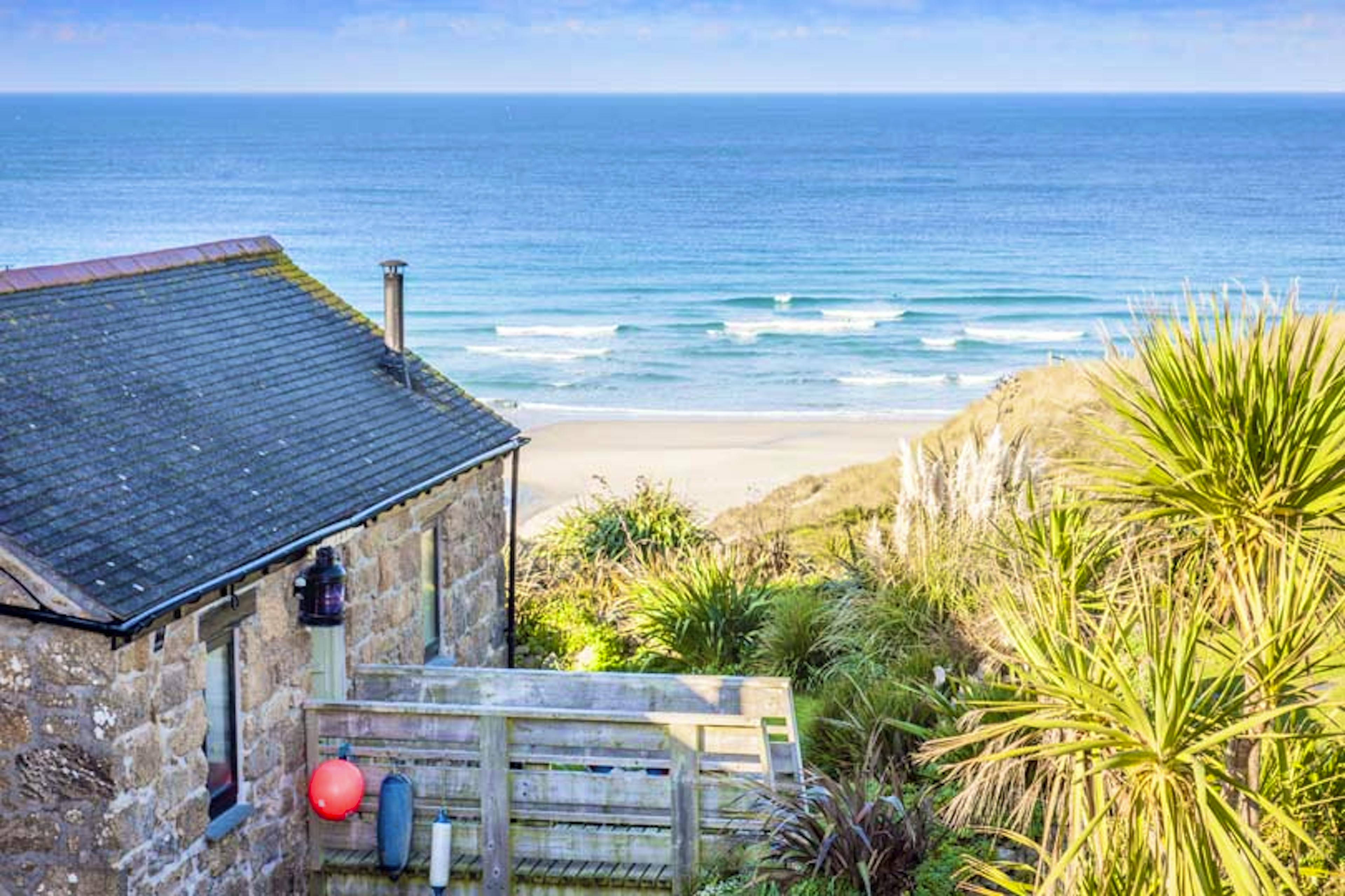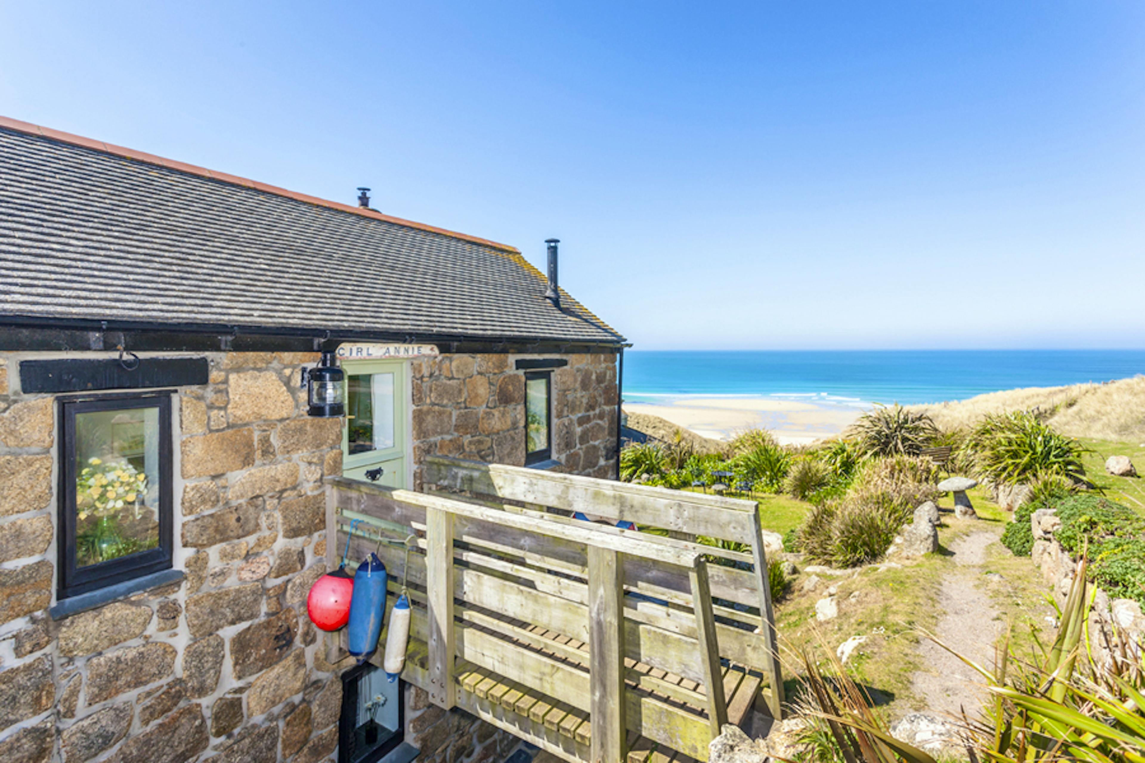 Welcome to Girl Annie, a great cottage for four that’s ideally situated next to the sea. Step aboard, via a nautical style bridge, and into a welcoming open-plan first floor living room with exposed beams, ‘Victorian’ wood-burning stove and pine floor with rug. The large picture windows offer you fantastic beach and sea-views with glorious sunsets. The kitchen/dining area comes well equipped and is great spot for family meals in together. Open-sided stairs led to ground floor, where you’ll find a double bedroom with superb sea views and a cosy bunk bed bedroom with single bed and built-in bed that’s great for children. The bathroom includes a shower attachment and toilet, and all ground floor rooms have slate floors with rugs. As well as being only 200 metres from the beach, the cottage is also near a local inn, award winning Beach Restaurant, Round House Gallery and the attractive little fishing harbour of Sennen Cove, only 10 minutes’ walk across the vast expanse of the sandy Blue Flag beach, which is perfect for swimming, water sports and great for kids with the assurance of the RNLI Lifeguards. If you are lucky, you may even spot dolphins, the odd seal or even a basking shark. There are dozens of beaches on the Land’s End peninsula and they are amongst the most unpolluted in Europe. They range from safe, sandy family beaches with life guards to wild and rocky coves. The water is clear and jade-coloured; superb for swimming and surfing, and the beaches are ideal for sun bathing. Beaches vary from sandy to rocky and pebbly, and some have safe and shallow bathing for children, many have nearby shops and cafes catering for family visitors, but it is also easy to find remote and private places. Rock climbing is popular on the cliffs and headlands. This is superb walking country and great for cycling or mountain biking. Sennen is also a Mecca for surfing with countless options for all levels of ability. There are great Surf Schools and equipment hire close by in Sennen Cove and on the beach.