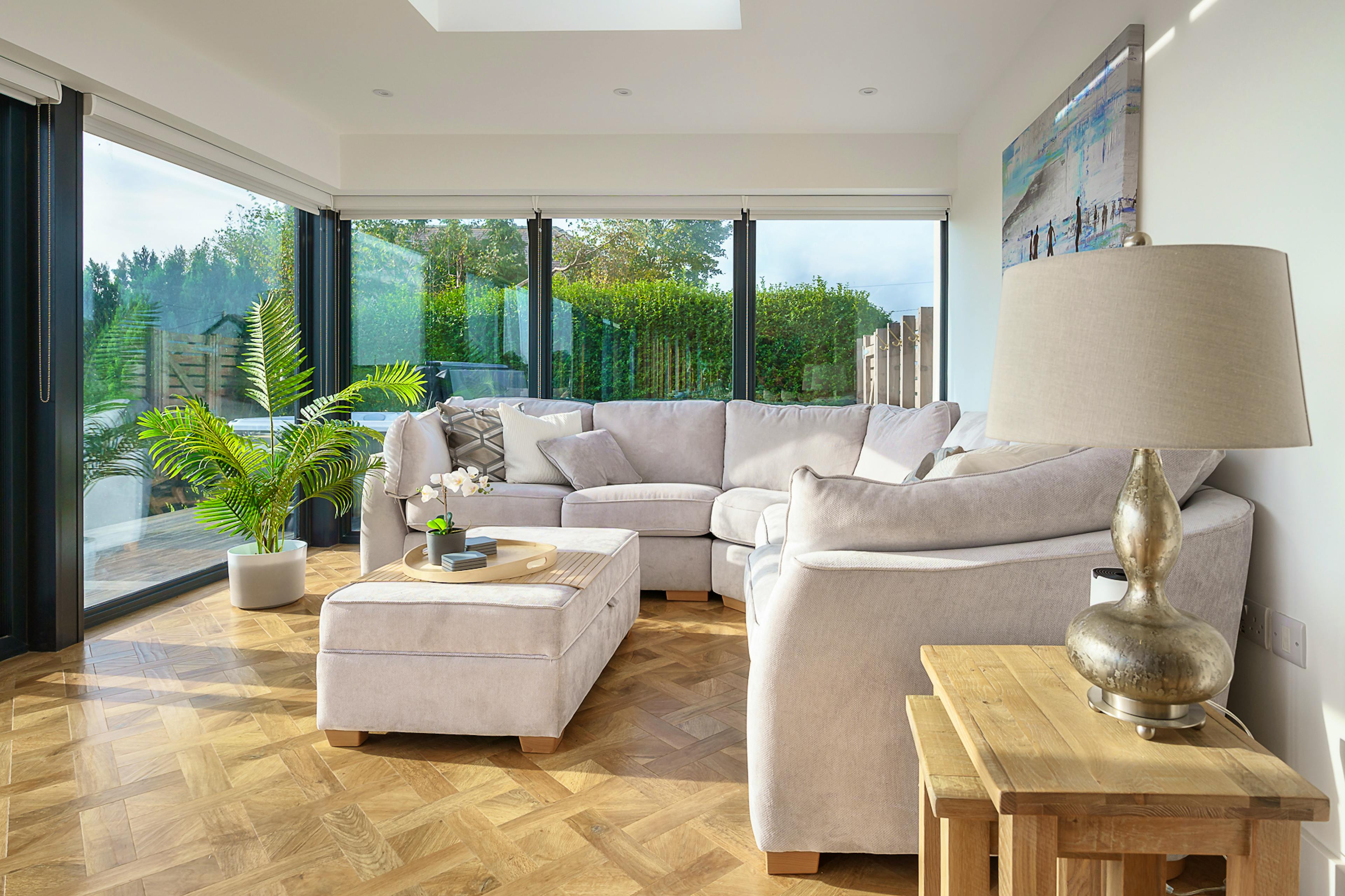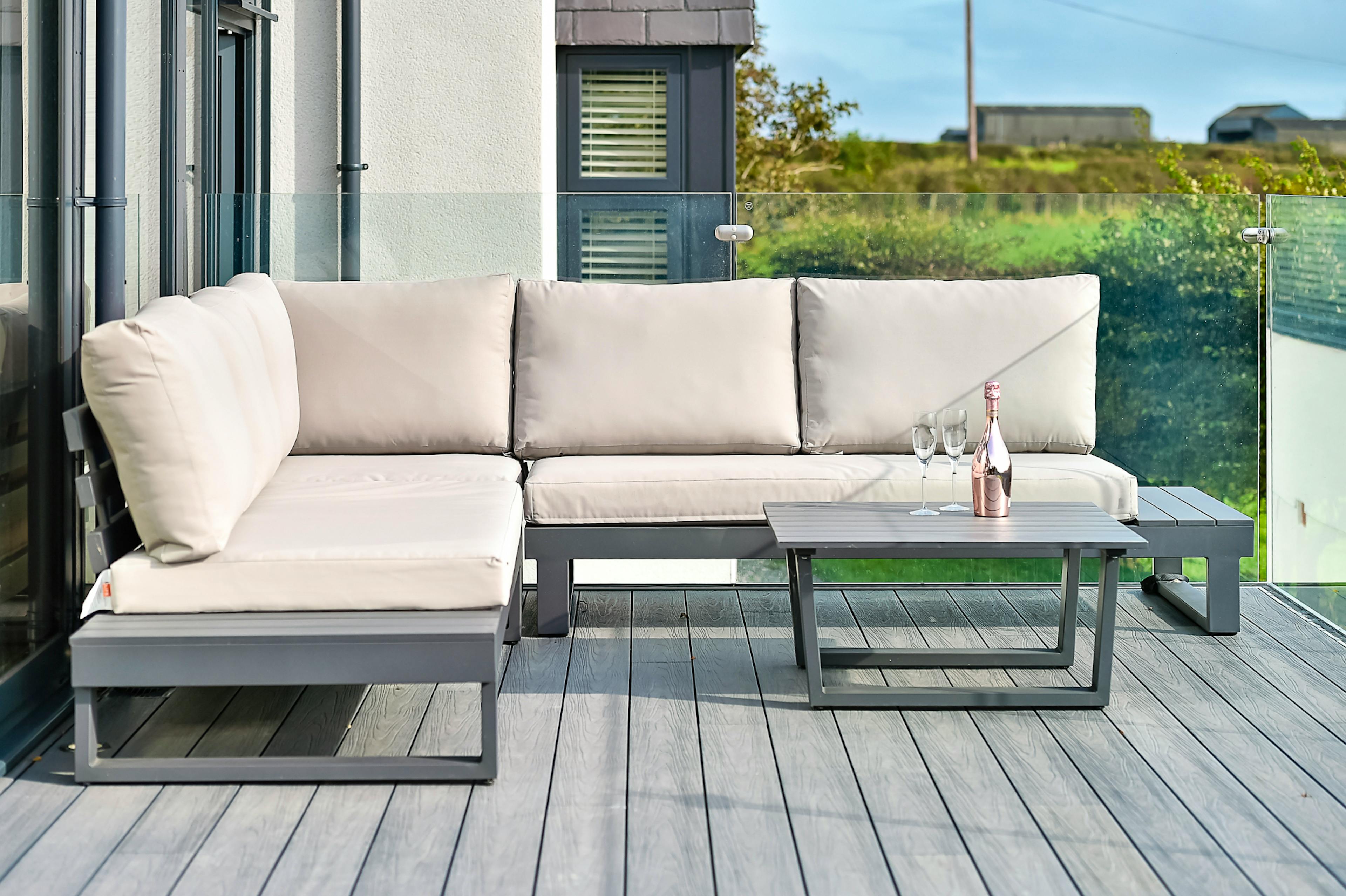 Balcony with hot tub, L-shaped sofa and alfresco dining area for unforgettable sunset gatherings.