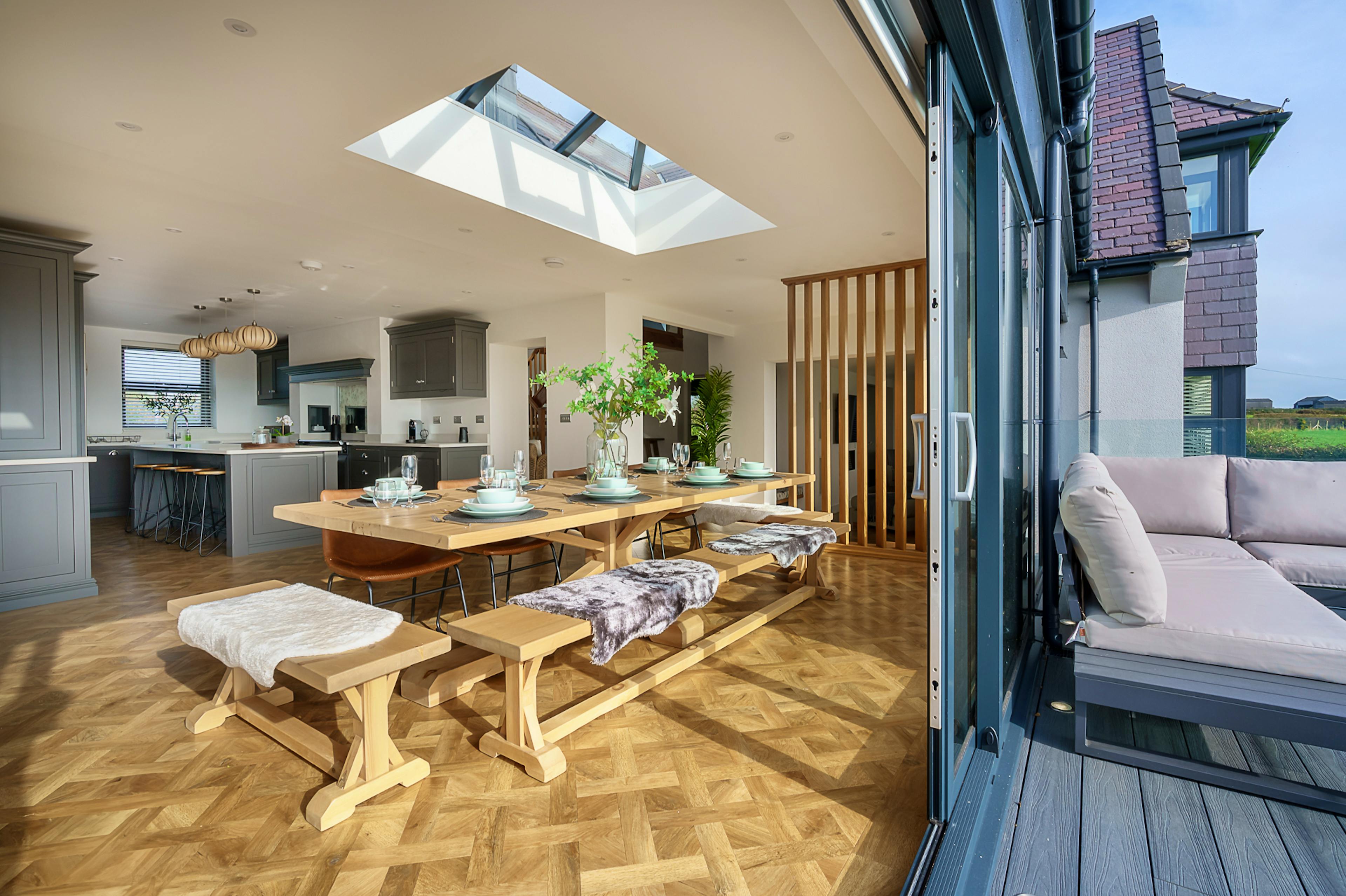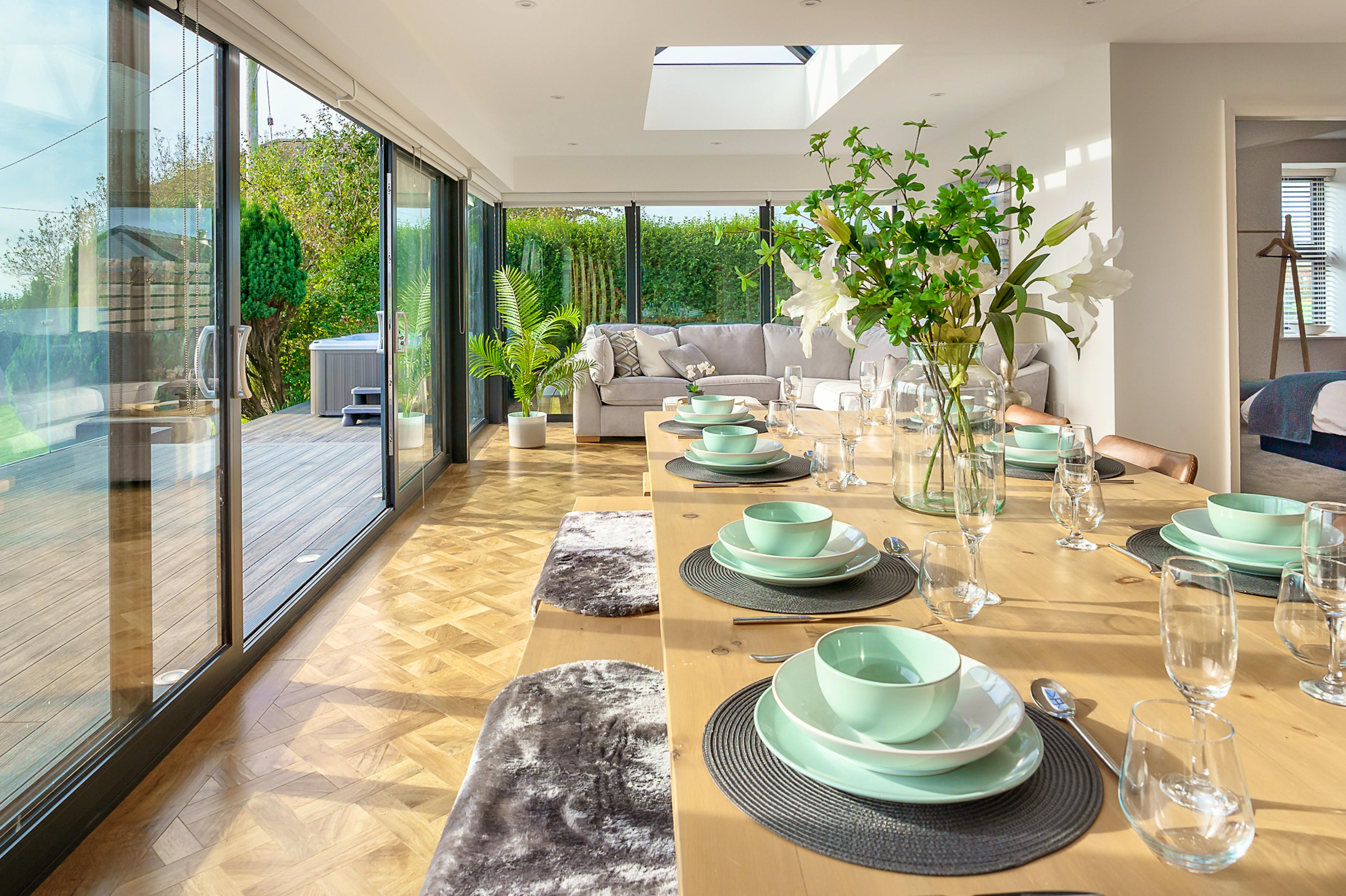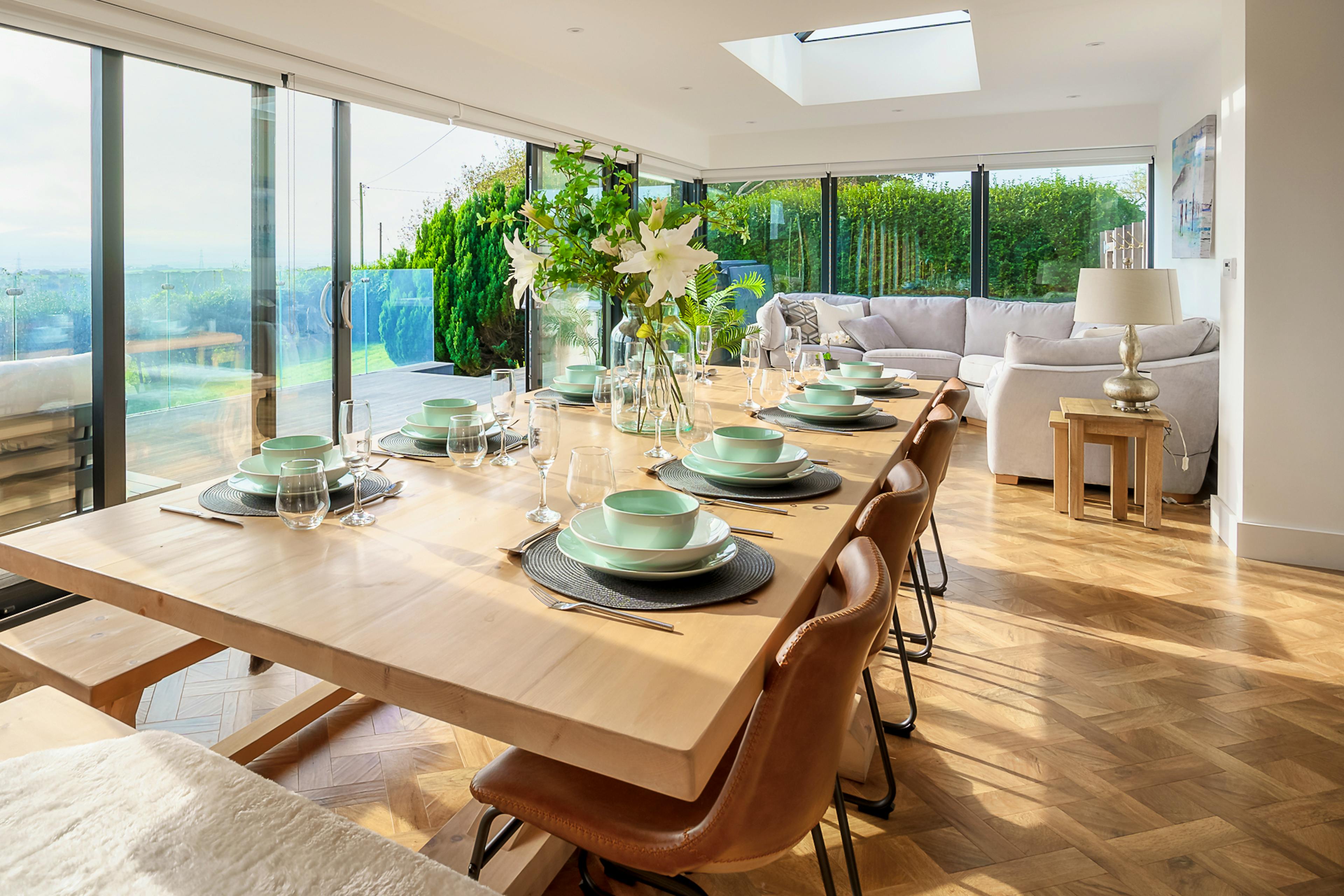 Open-plan kitchen and dining area with 12-seater table, floor-to-ceiling windows and breakfast island.