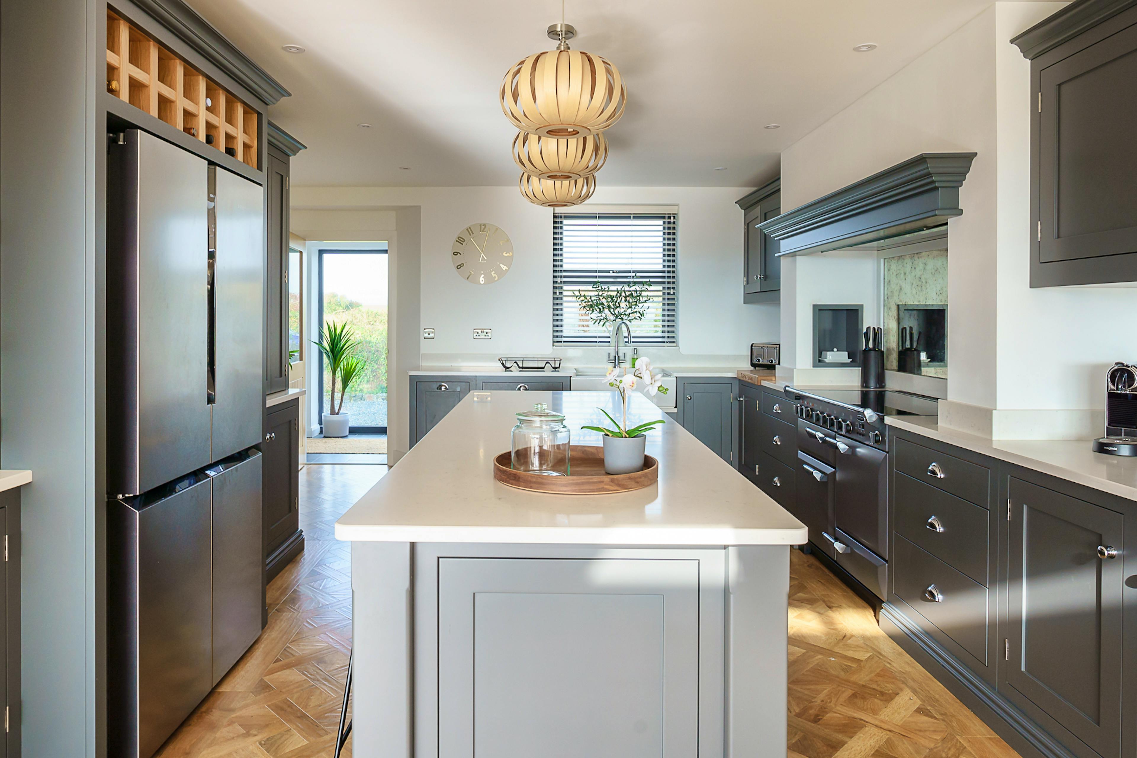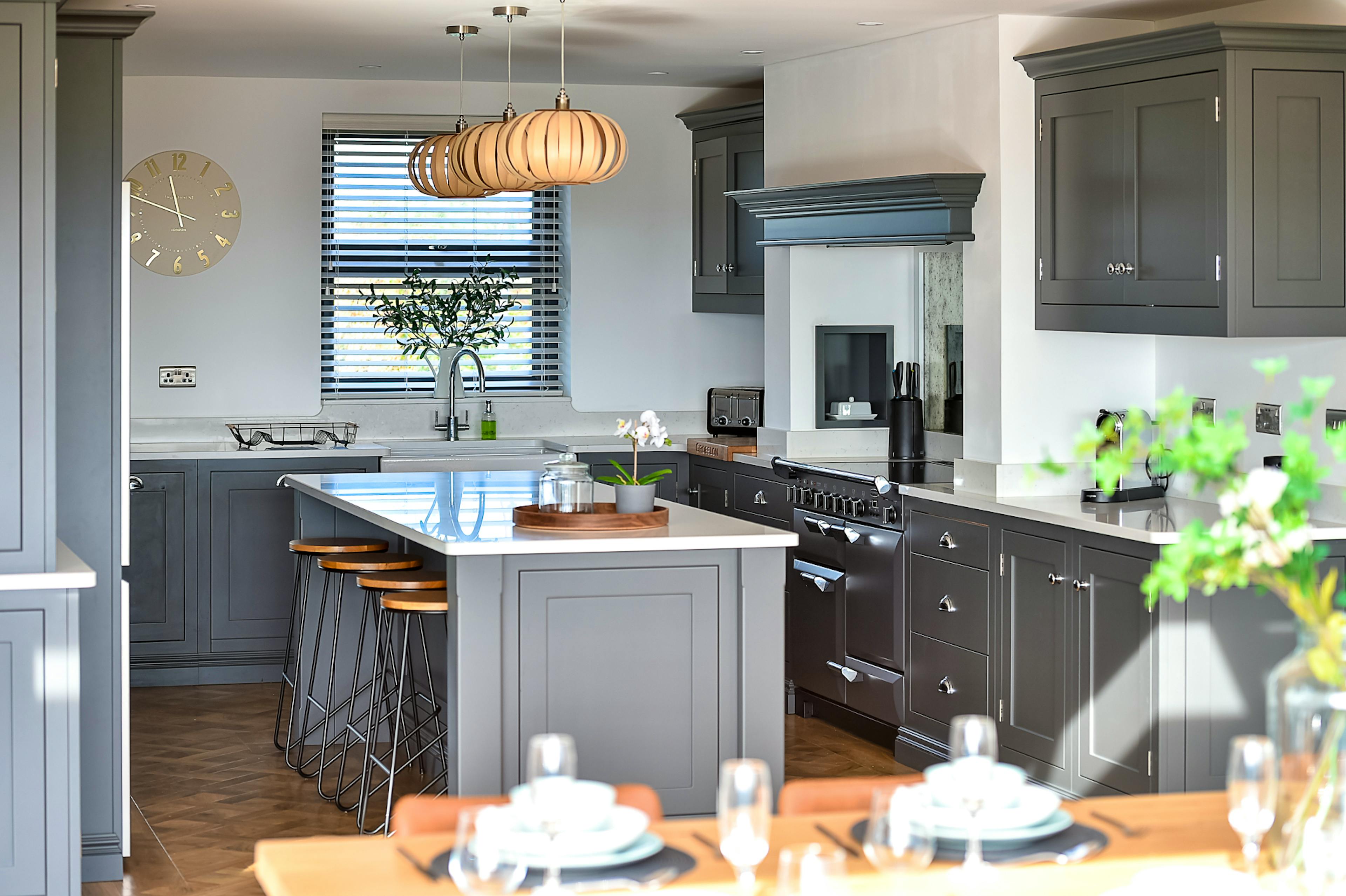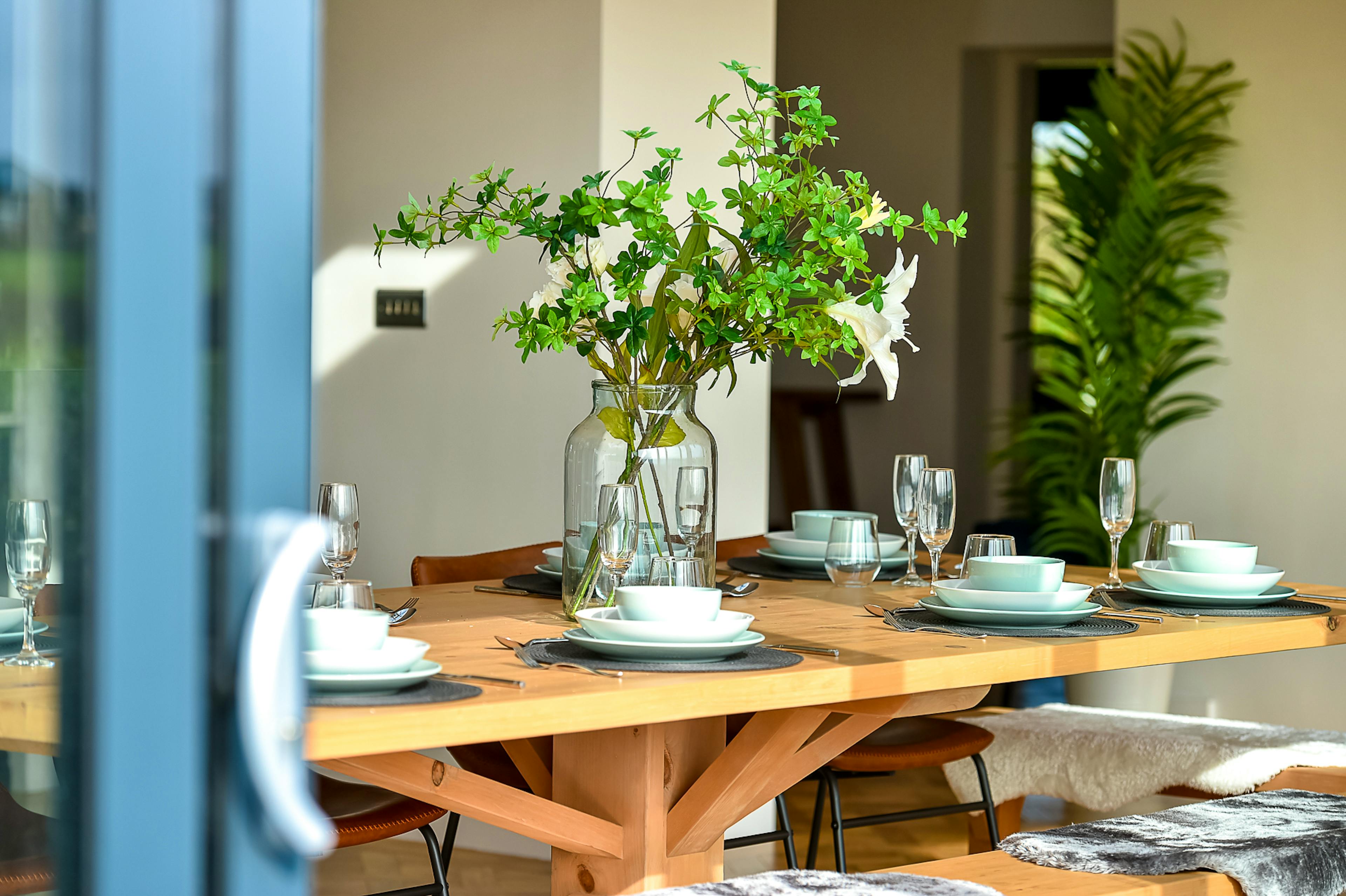 Open-plan kitchen and dining area with 12-seater table, floor-to-ceiling windows and breakfast island.