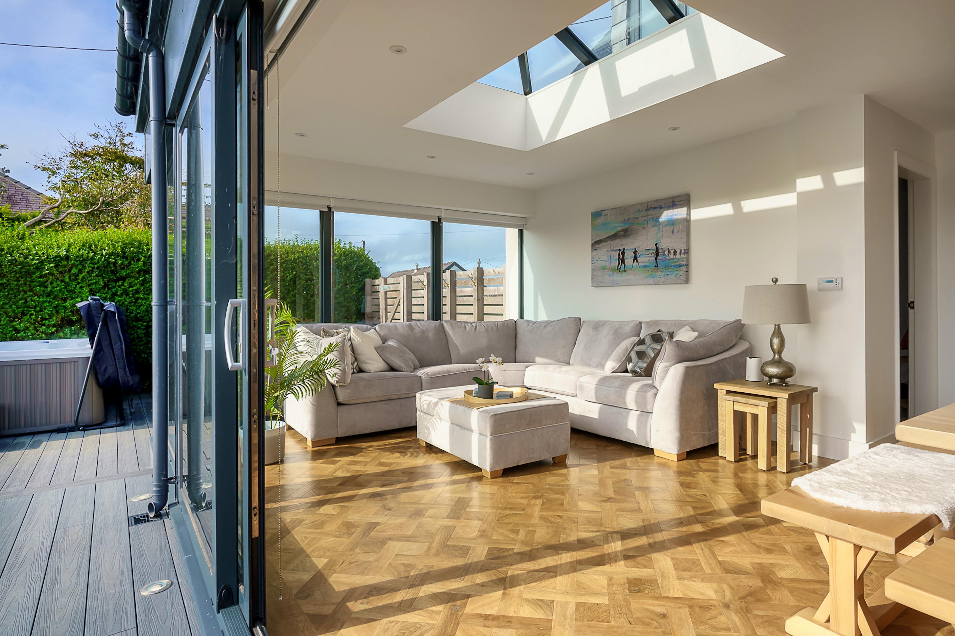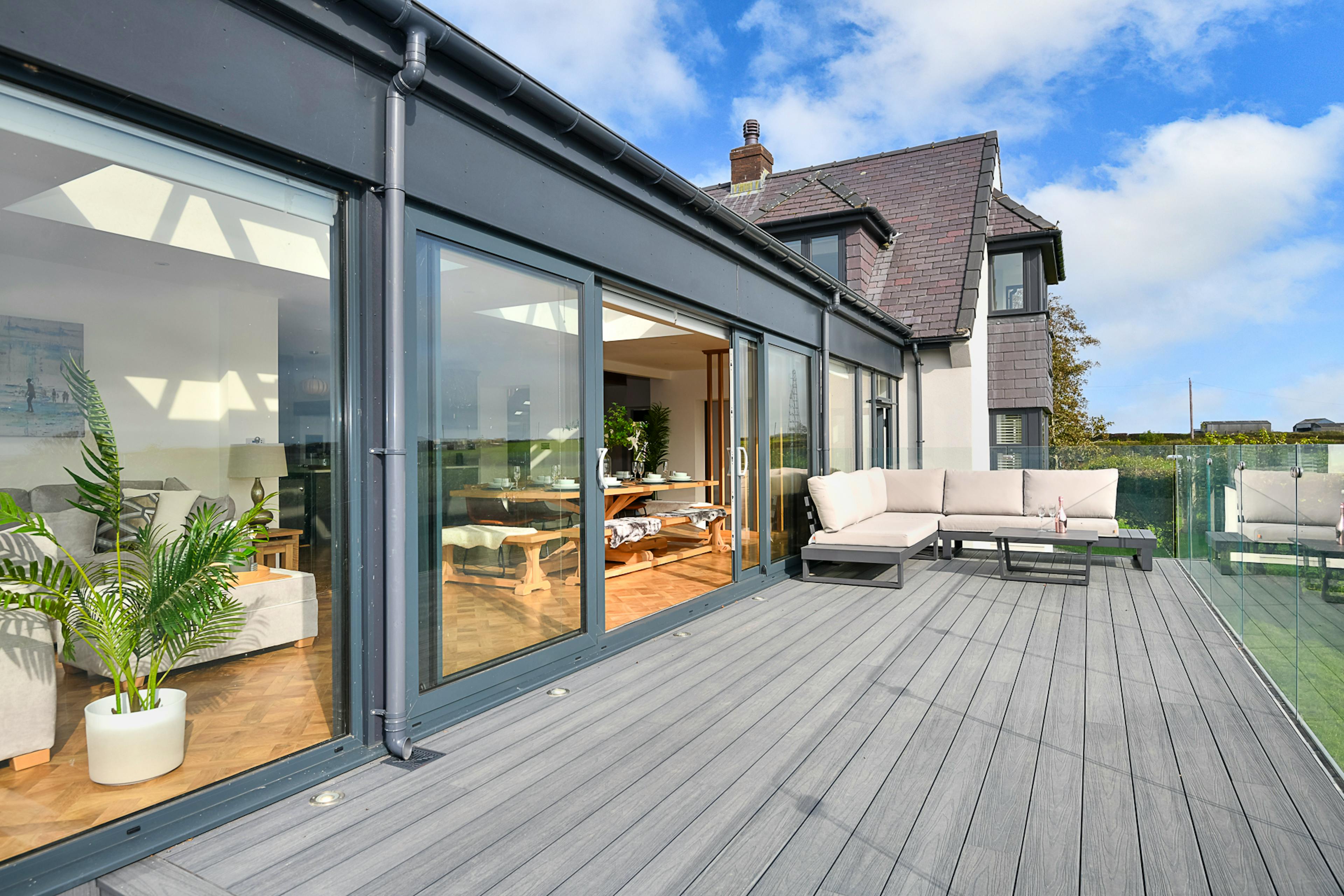 Gather family and friends for a luxurious break at Groeslon, a contemporary escape set in the peaceful hamlet of Penmynydd, just four miles from Menai Bridge. With panoramic views across the Menai Strait towards Snowdonia, six beautifully styled bedrooms, a games room and a bubbling hot tub, this is a house designed for sharing good times and making lasting memories. Whether you’re here for countryside walks from the doorstep, beach days on Anglesey or exploring the charming towns of Menai Bridge and Beaumaris, Groeslon provides the perfect base. The heart of the house is the impressive open-plan kitchen, dining and living space, flooded with natural light from floor-to-ceiling windows. Cook up a feast in the fully equipped modern kitchen, complete with range master cooker, coffee machine and breakfast island, before gathering around the 12-seater dining table for leisurely meals. A sumptuous seating area lets you admire the scenery in comfort, and on warmer days, bi-fold doors open onto a balcony with an L-shaped sofa, alfresco dining space and hot tub with mountain views. For cosy evenings, retreat to the lounge, where a smart TV, ample seating and a fireplace create a warm and inviting atmosphere. Entertainment continues in the games room, which features a pool table, snug area and plenty of games to keep the whole group entertained. A handy utility room and additional WC add to the convenience. Across the house, six bedrooms promise restful nights. On the ground floor, a king-size bedroom with ensuite shower room offers privacy, while upstairs you’ll find a master bedroom with super-king-size bed, countryside views and ensuite, along with two twin rooms and three further king-size rooms, all beautifully styled with calming tones and soft furnishings. Three modern shower rooms serve the upstairs bedrooms, making the layout ideal for families or groups. Outside, a lawned garden and football area provide plenty of space for kids to play, while the balcony offers the best seat in the house for sunsets over Snowdonia. With Anglesey’s beaches and Snowdonia’s rugged peaks within easy reach, days out are as varied as they are unforgettable. Menai Bridge, just minutes away, is a hub for foodies and adventurers alike, with RibRide boat trips, sailing experiences and wildlife tours on the Menai Strait all waiting to be discovered.