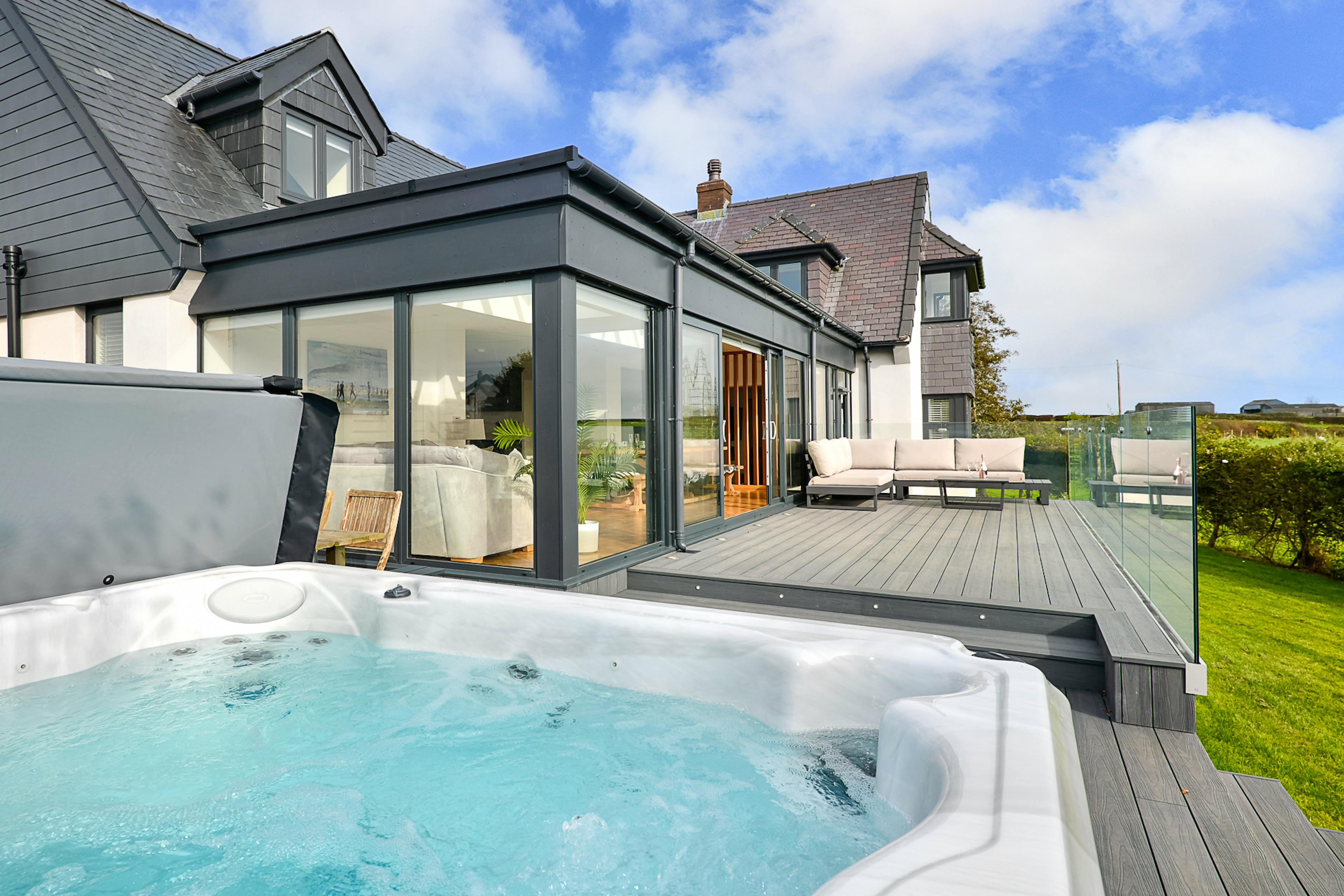 Modern holiday home with hot tub, games room and sweeping Eryri (Snowdonia) views near Menai Bridge on the Isle of Anglesey.