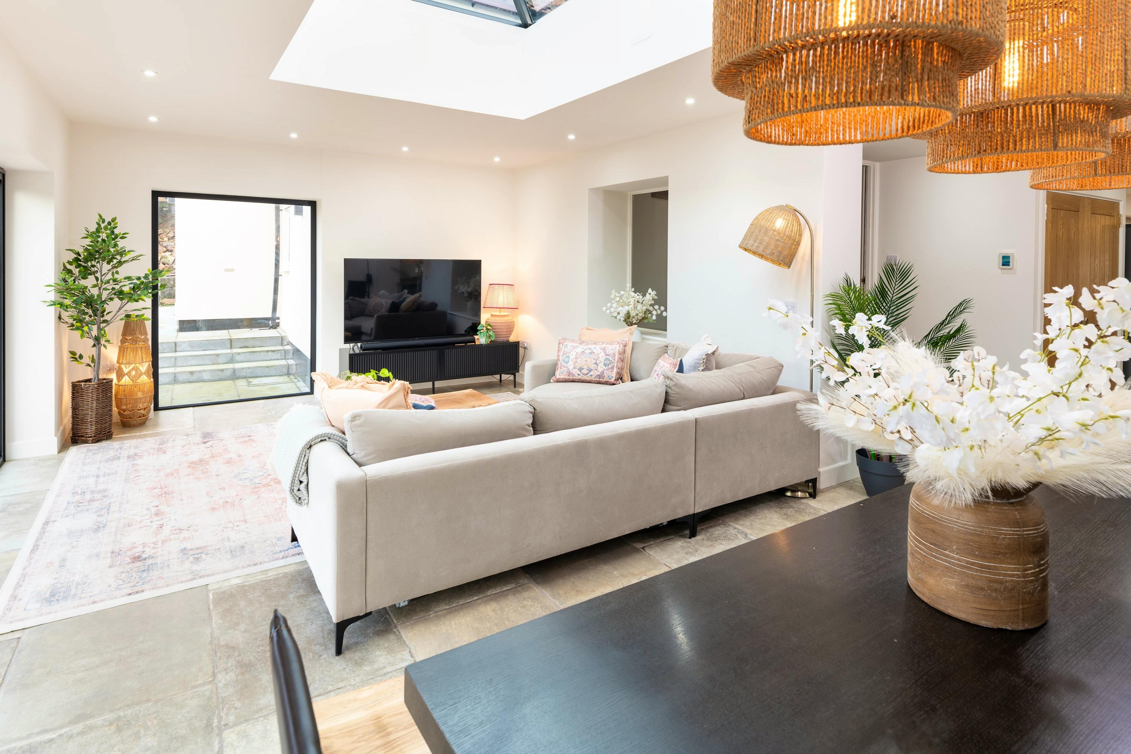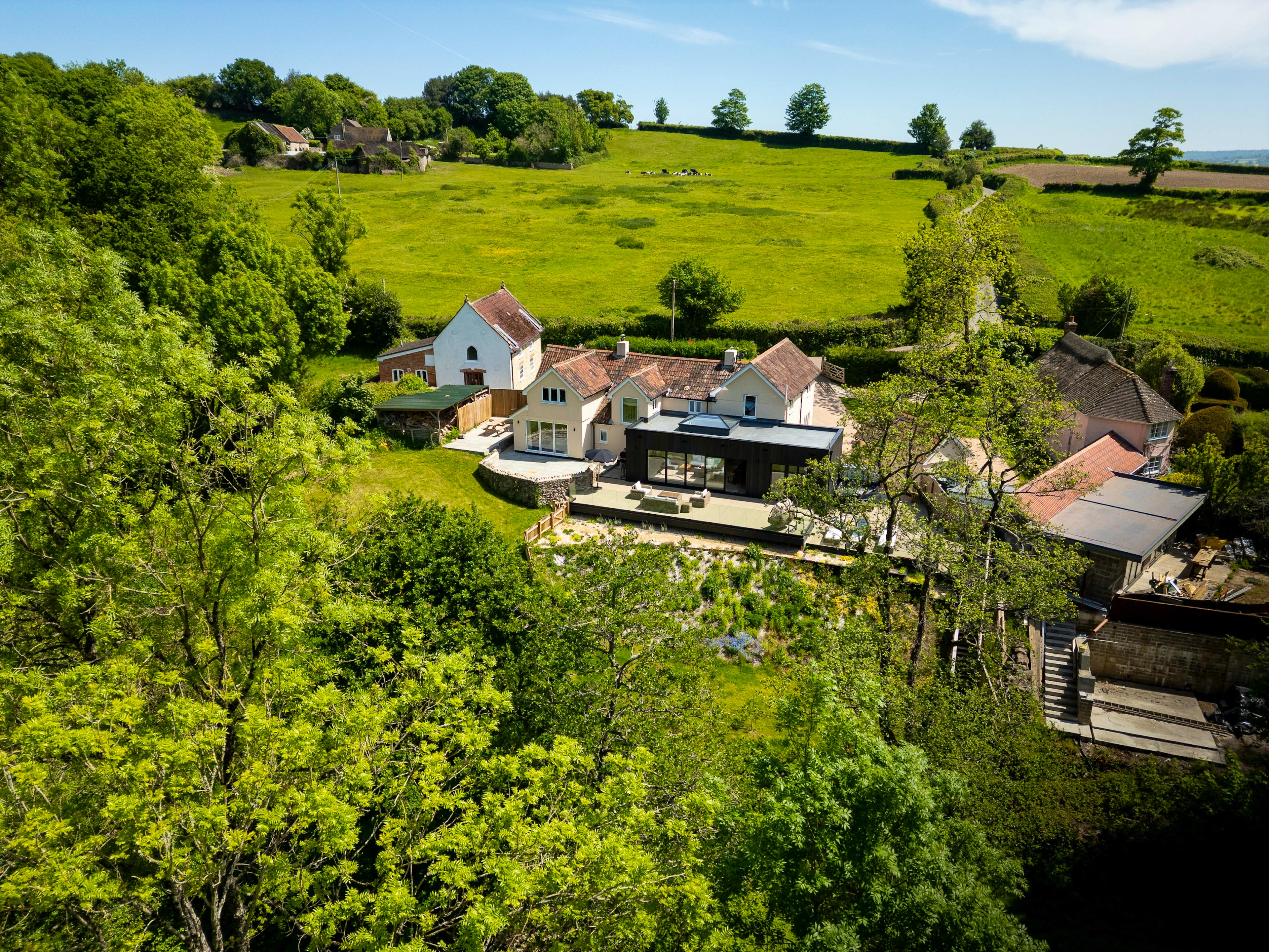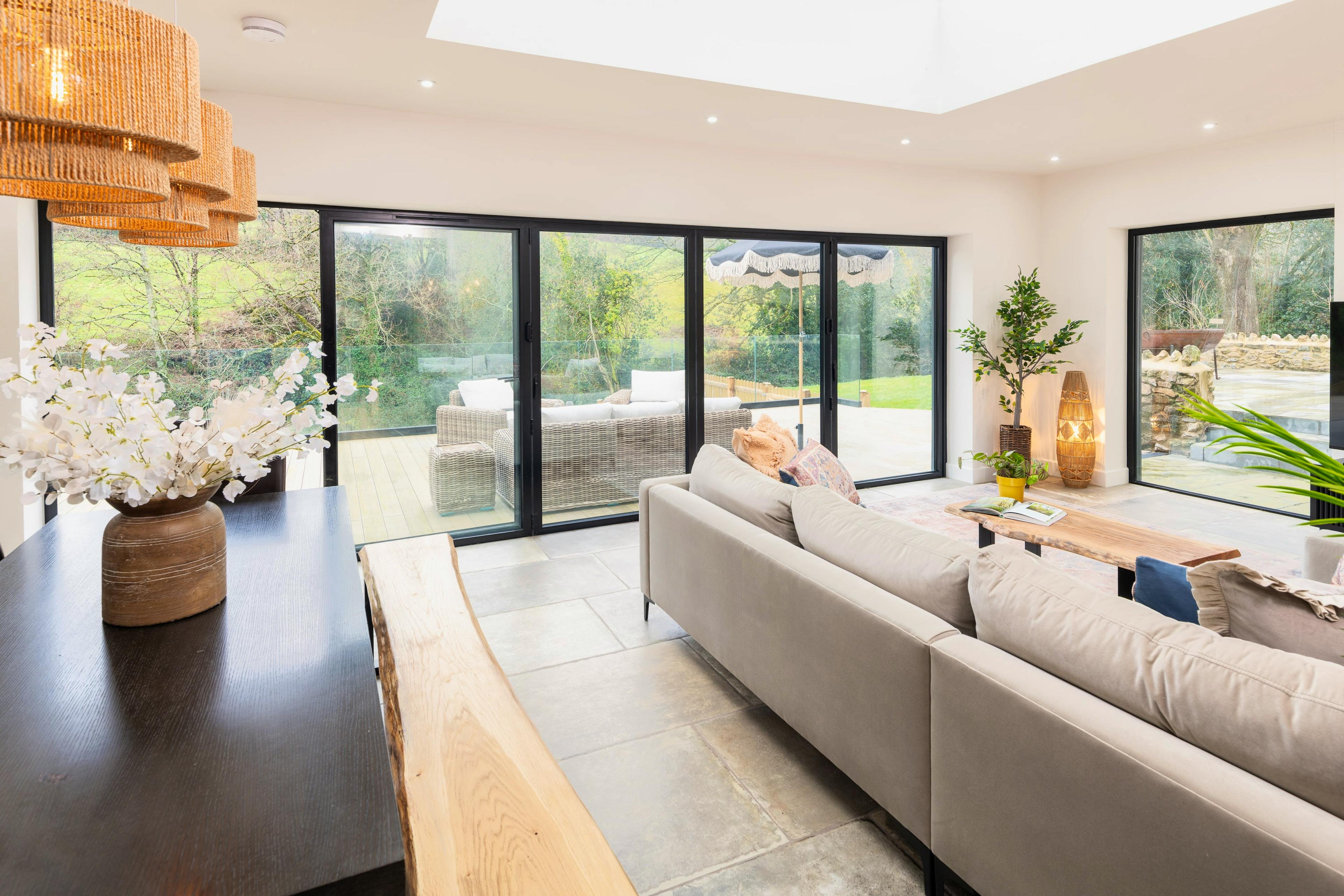 Enjoy long leisurely meals in the open plan kitchen and dining area where bi-fold doors frame peaceful views of the garden and countryside beyond.