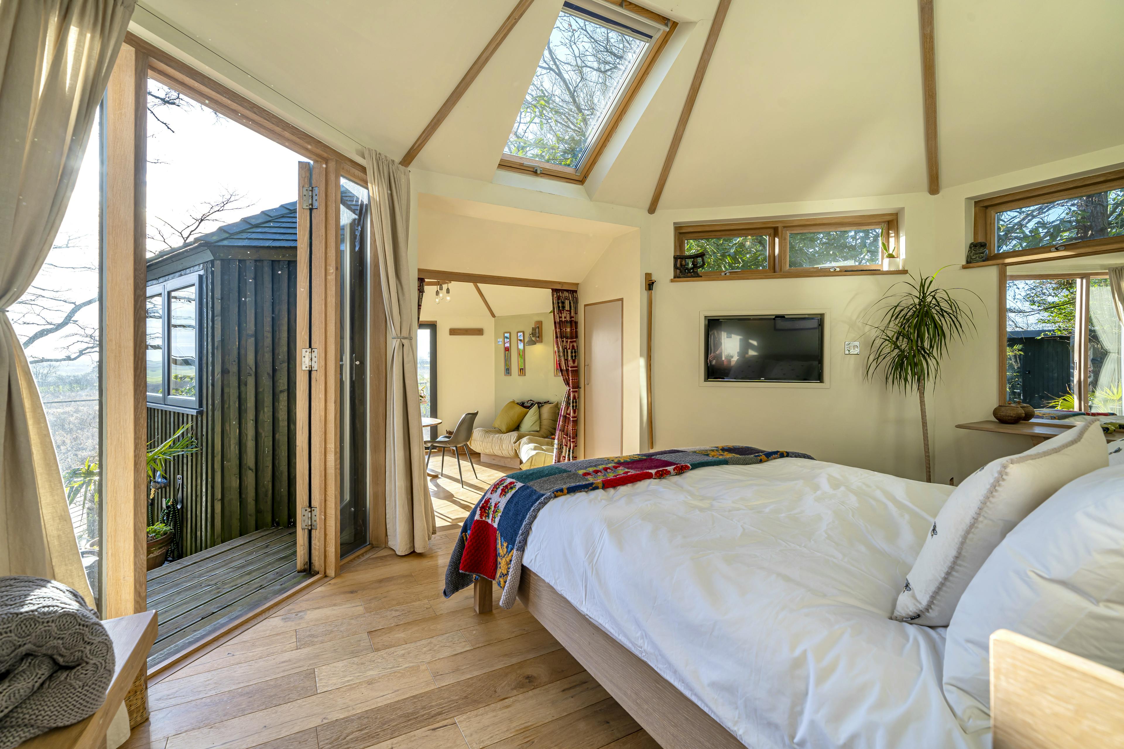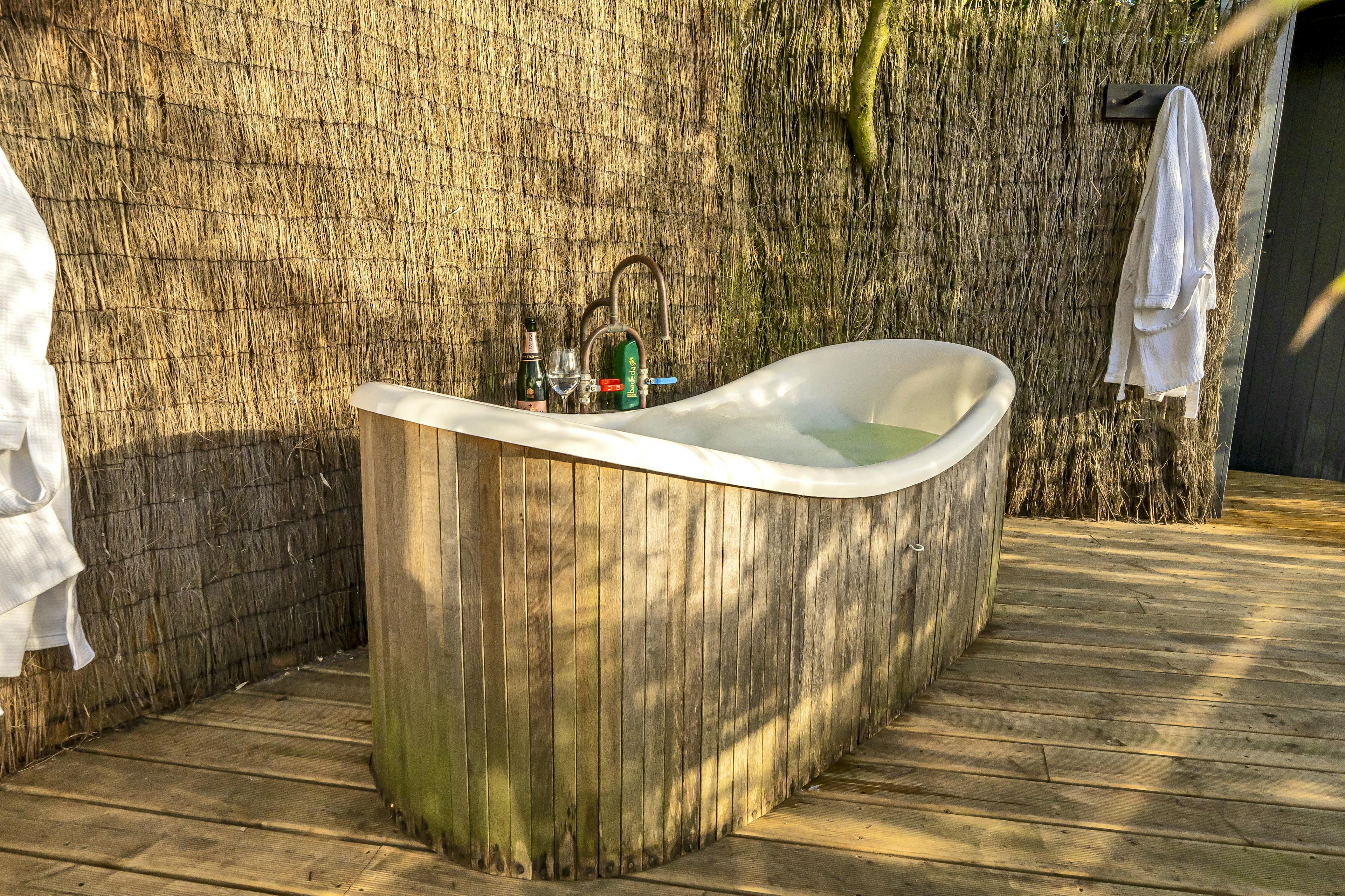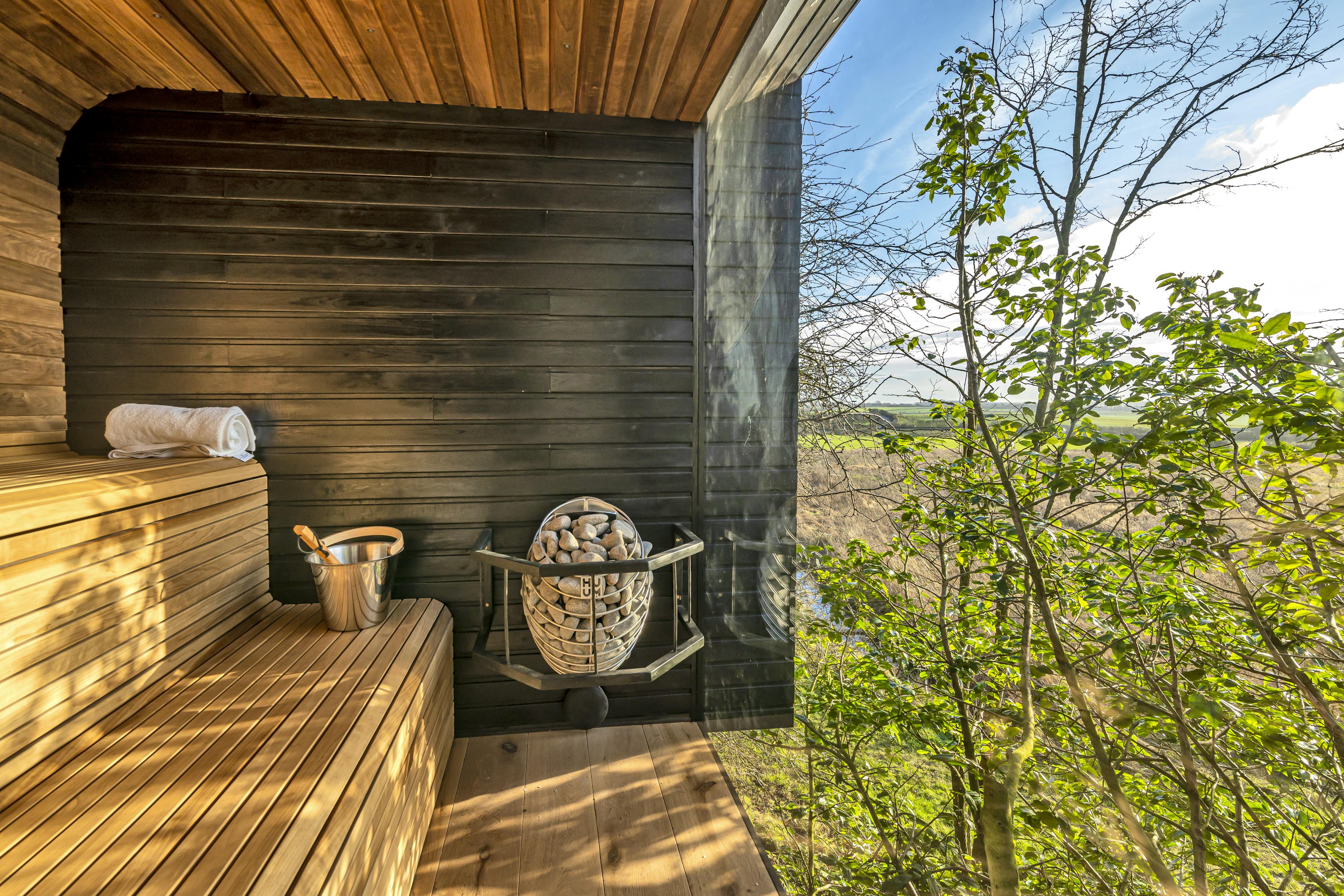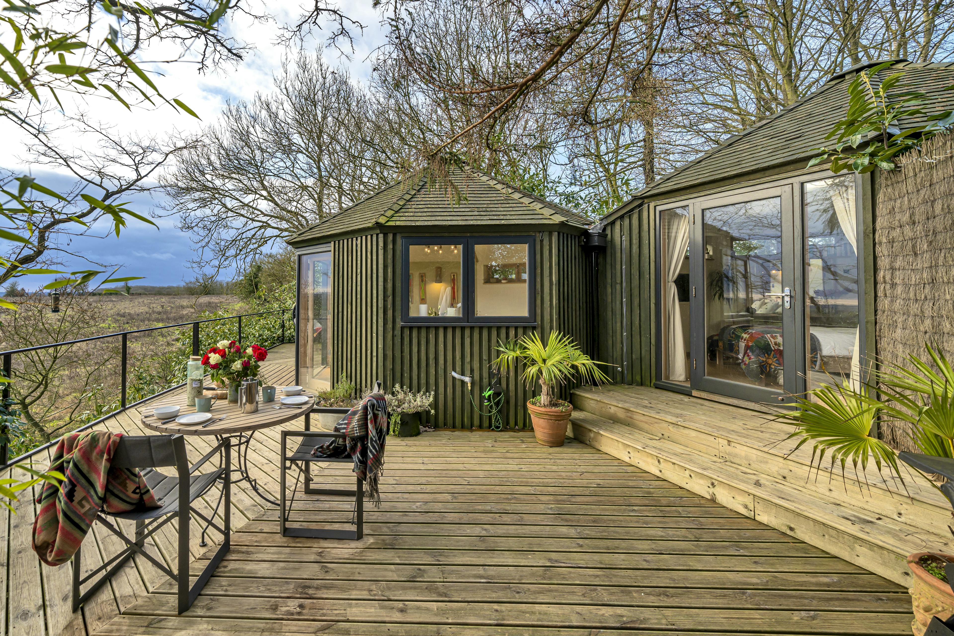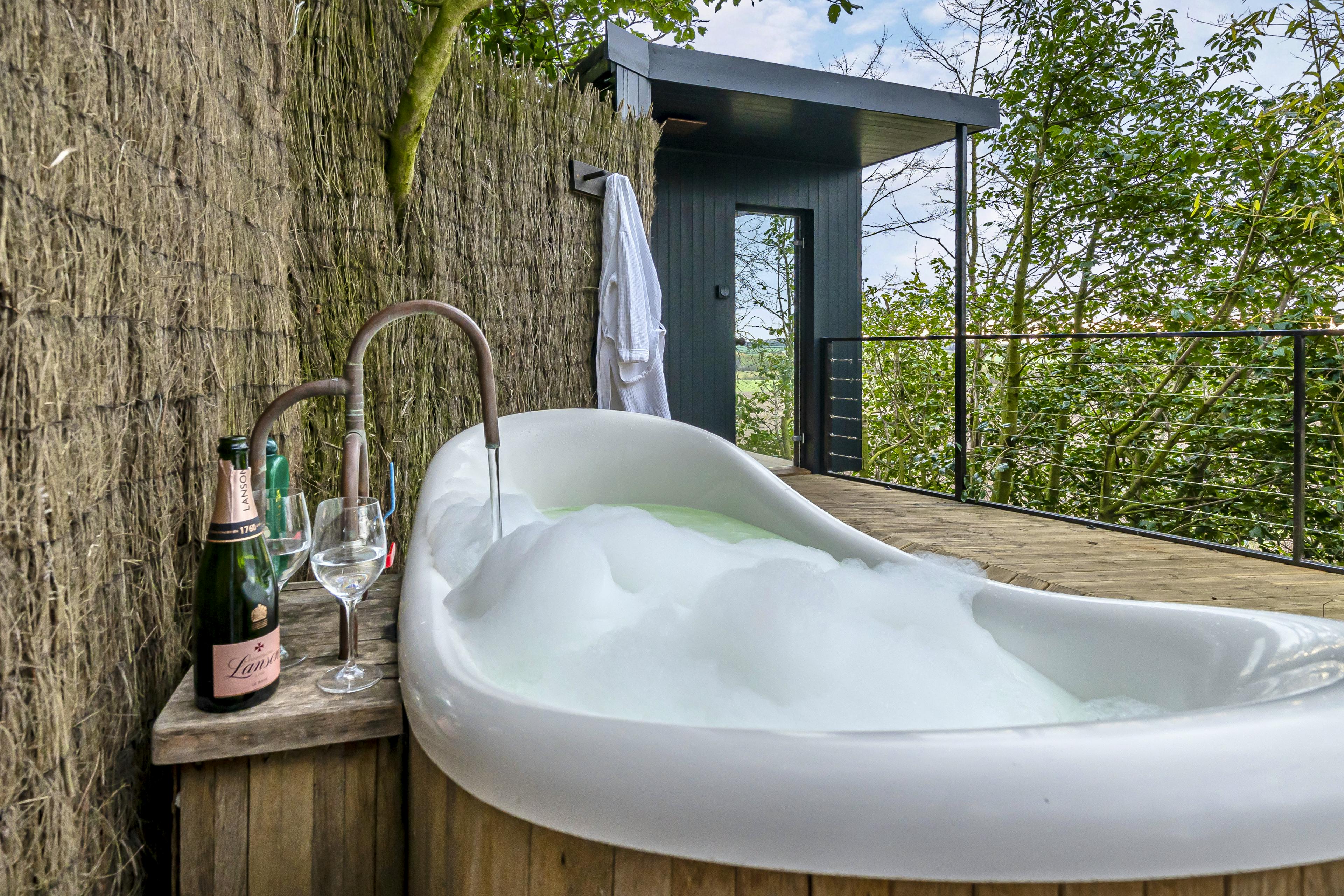 A luxurious and romantic treehouse for two with an outdoor bath, Finnish-style sauna and views across the Cambridgeshire countryside.
