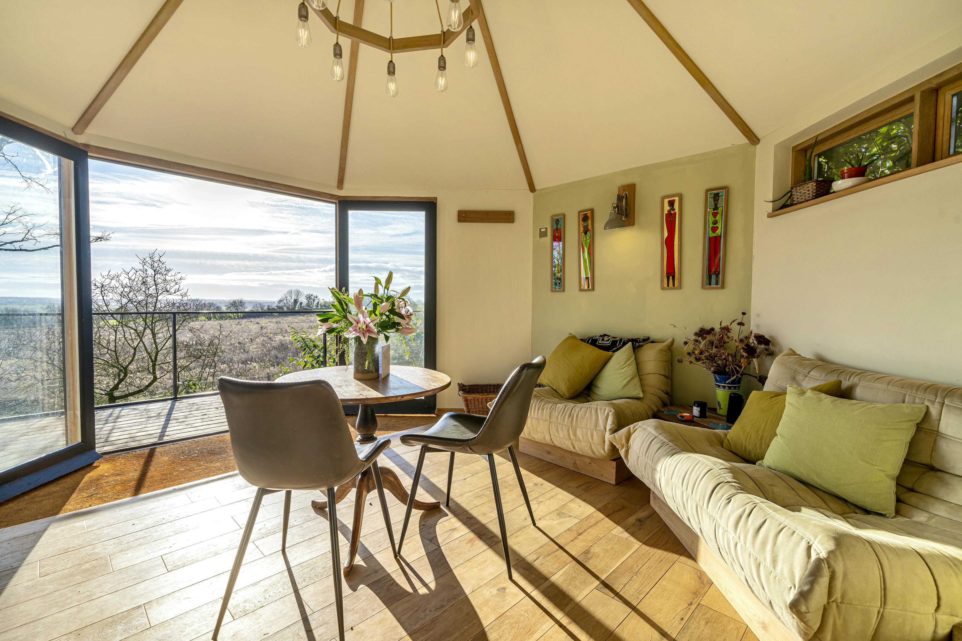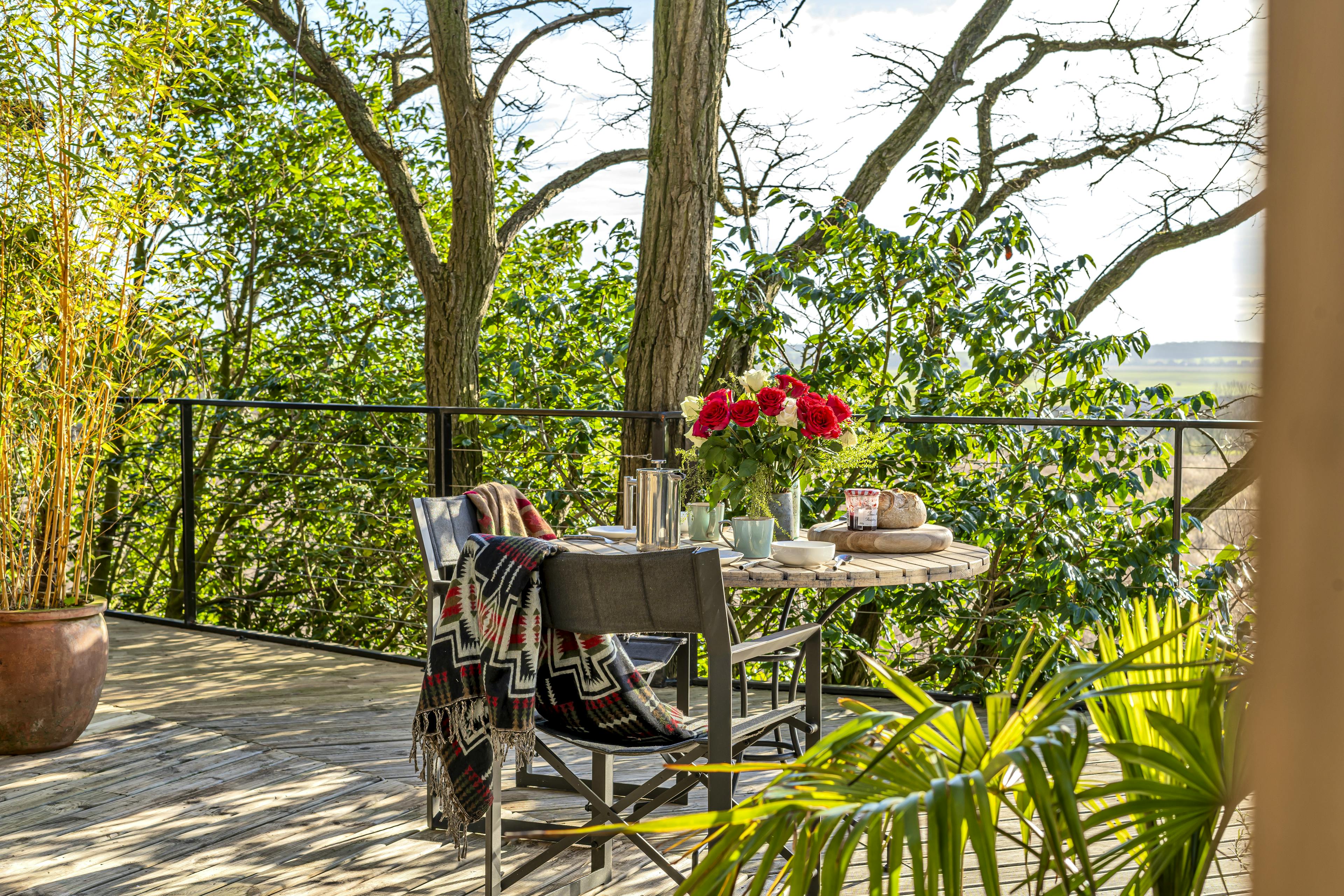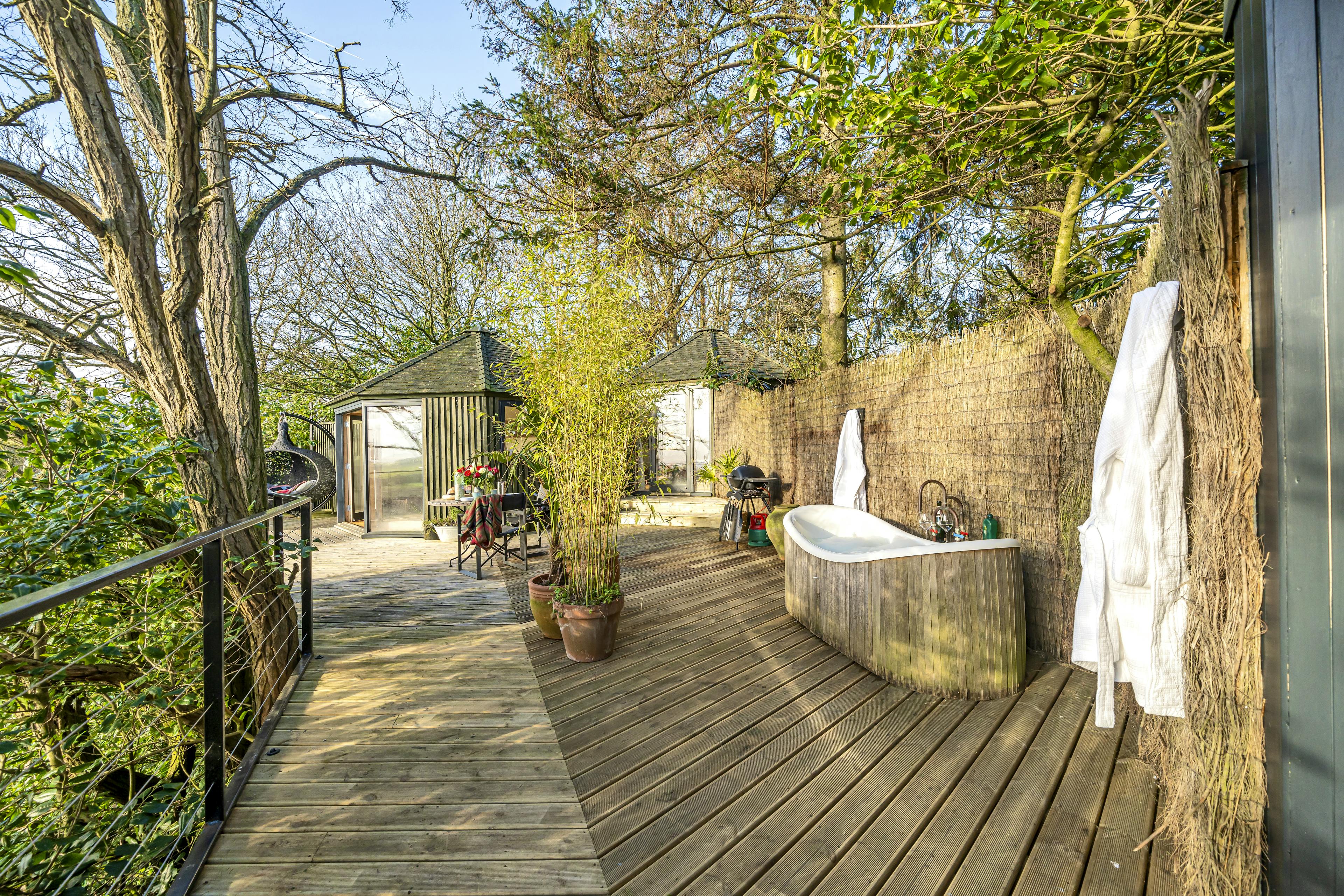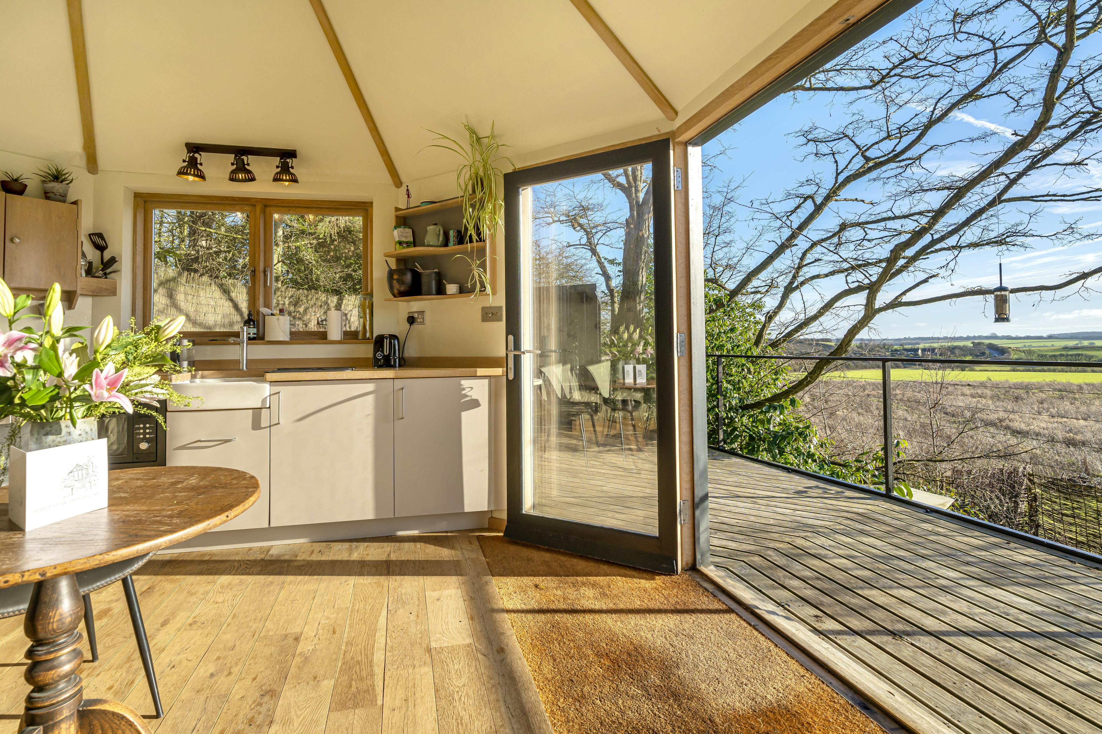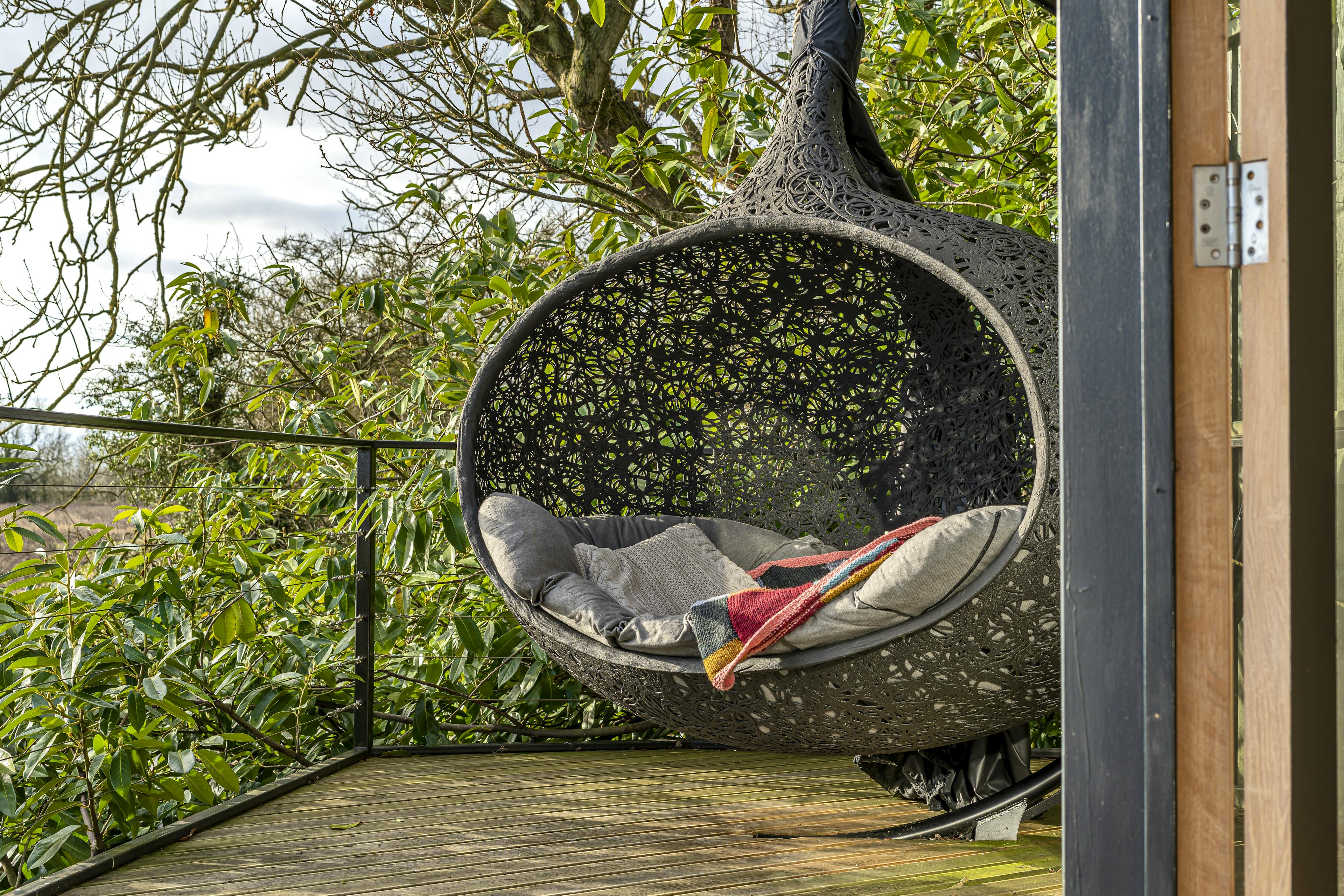 A luxurious and romantic treehouse for two with an outdoor bath, Finnish-style sauna and views across the Cambridgeshire countryside.