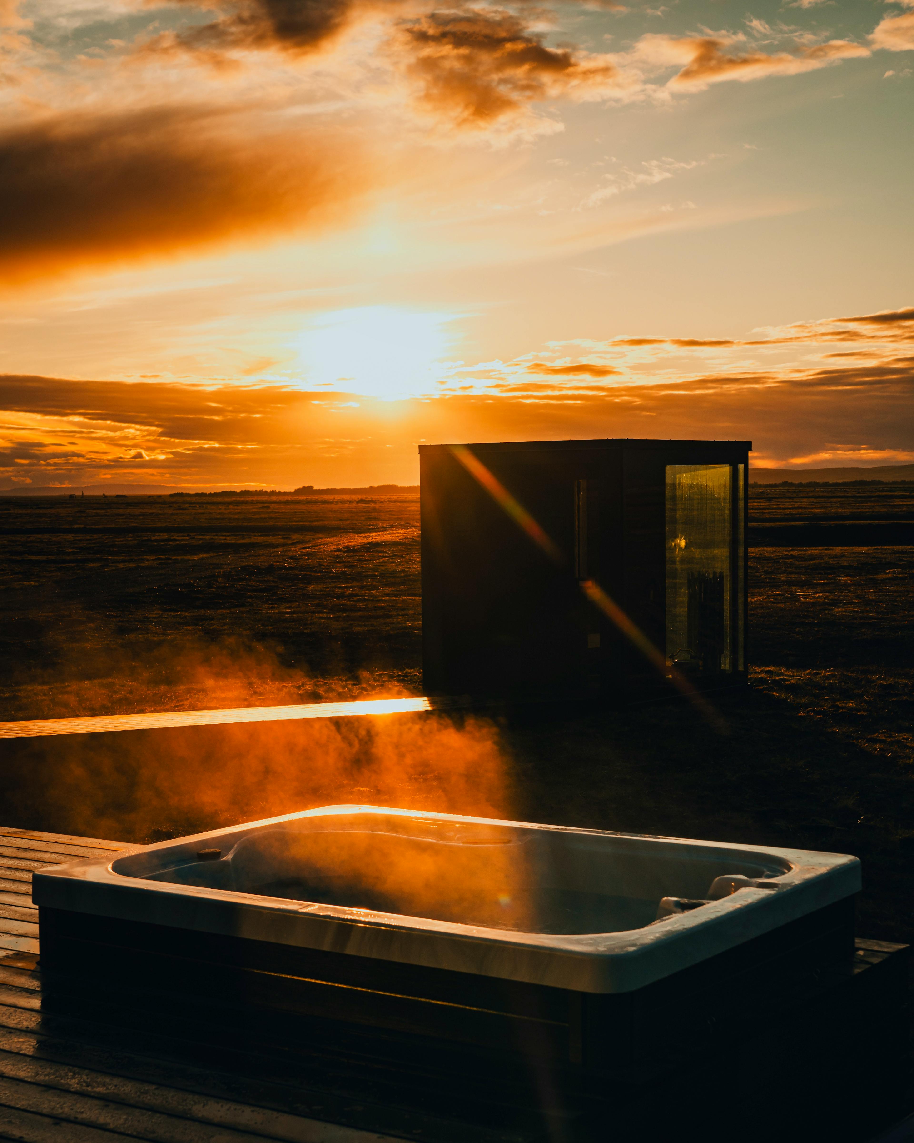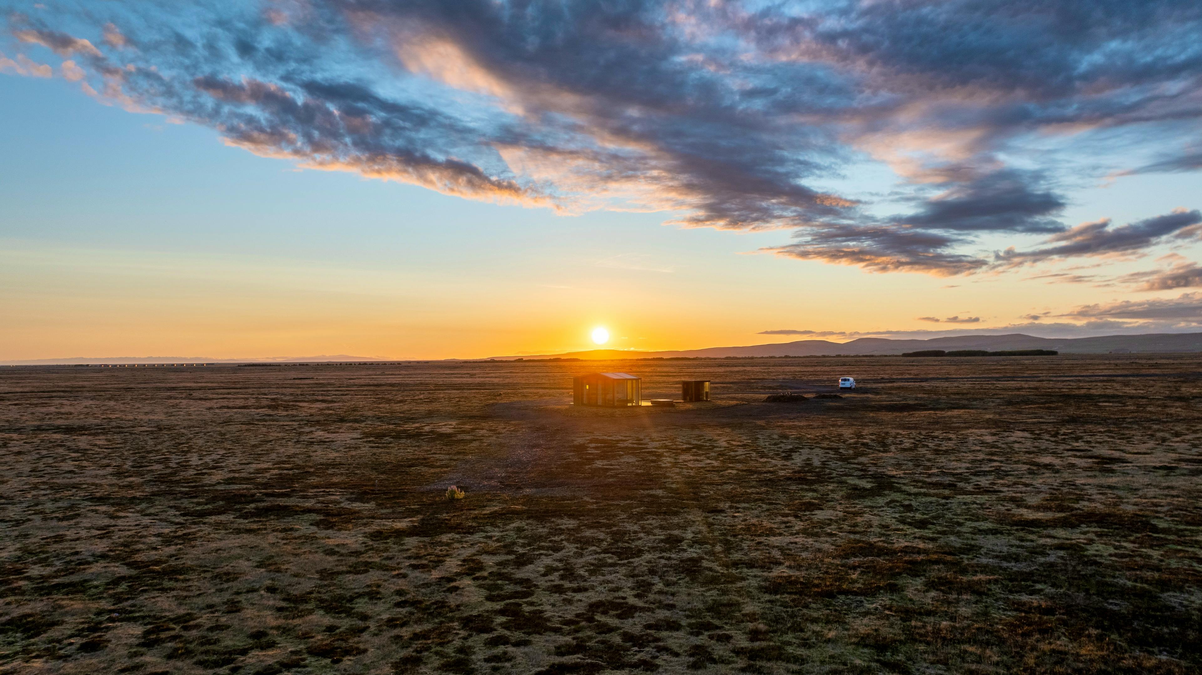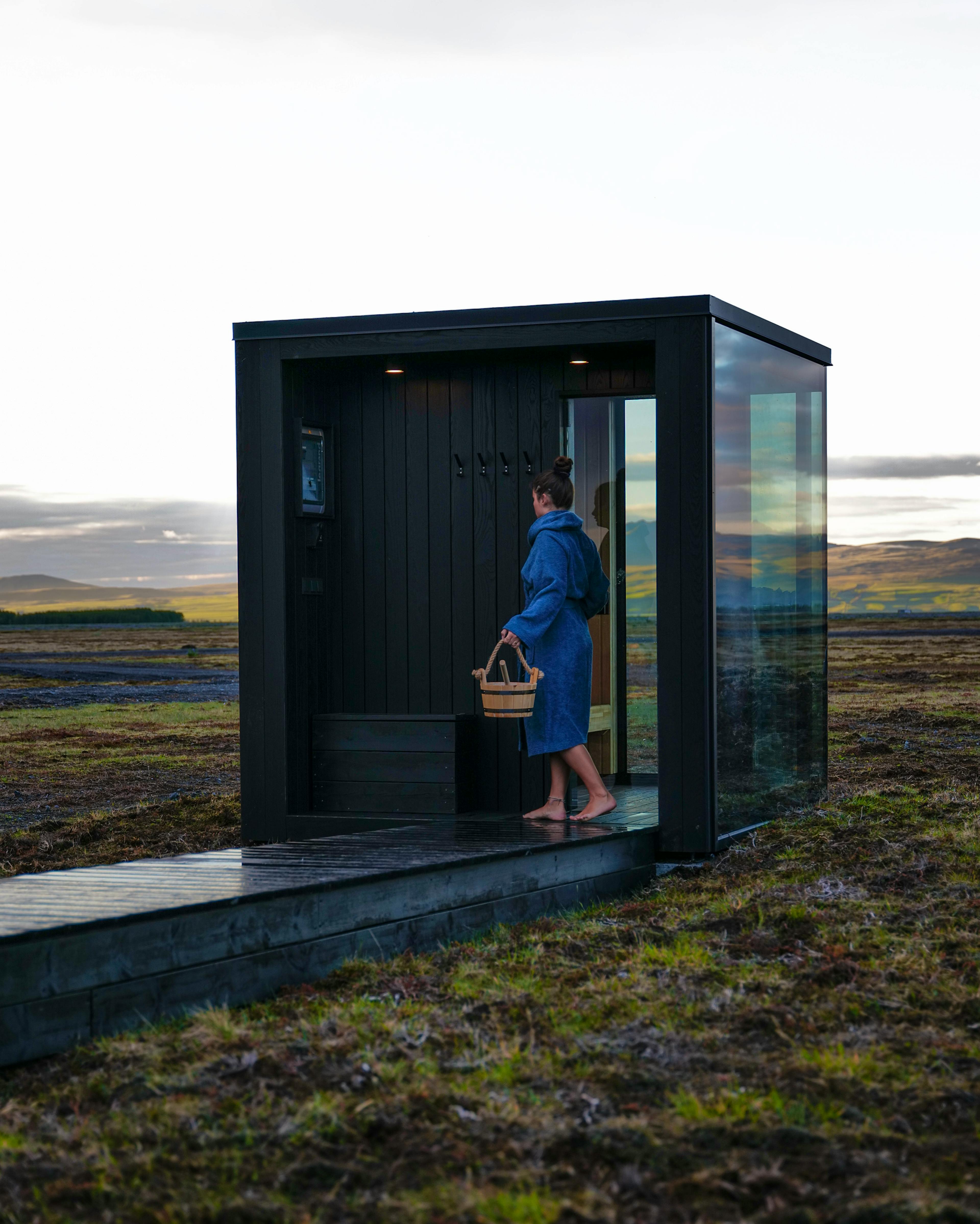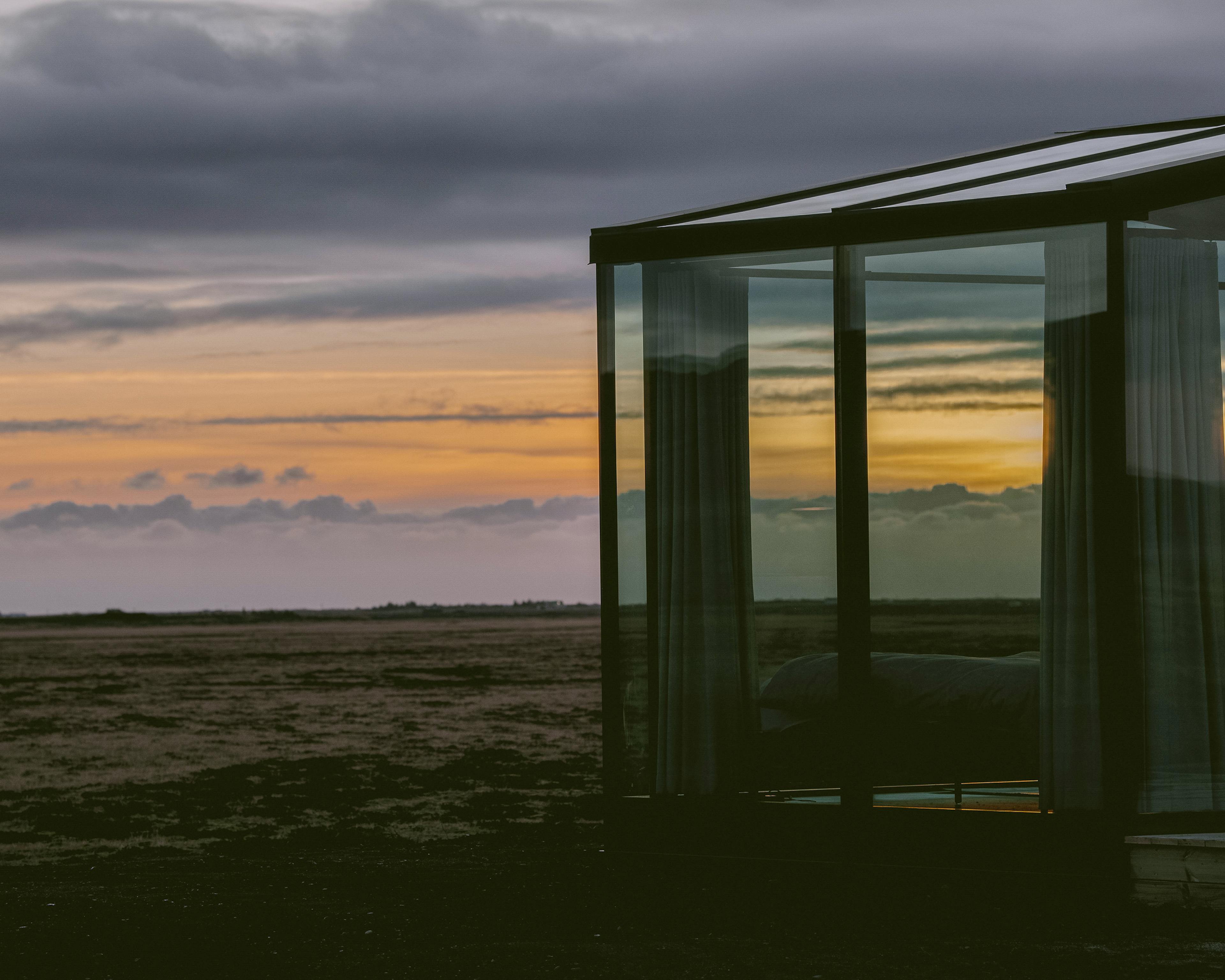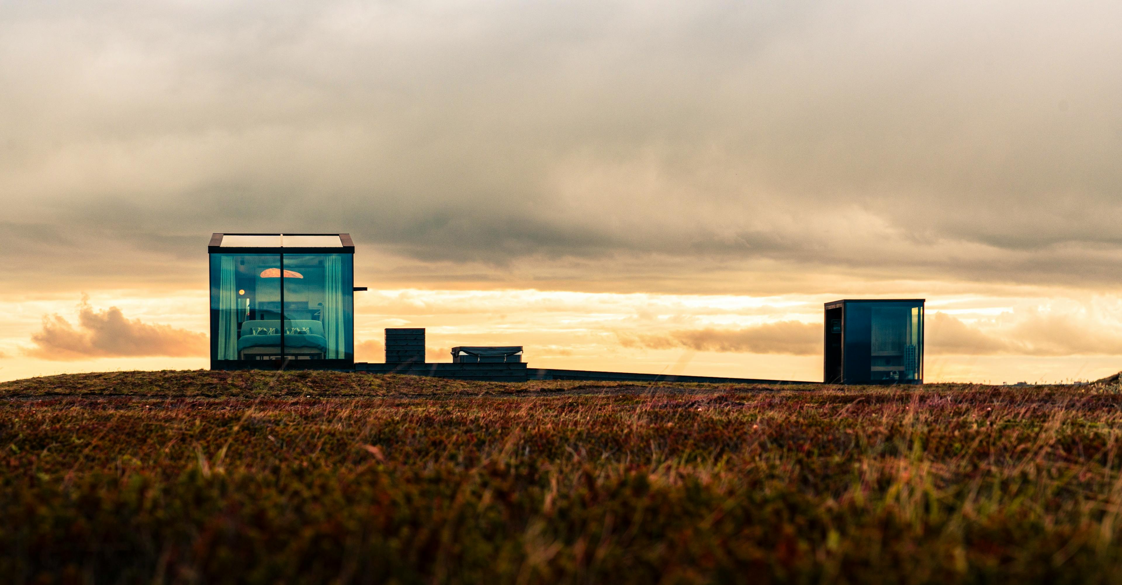 The rate includes a private sauna, an outdoor hot tub, and uninterrupted views of the Icelandic landscape.