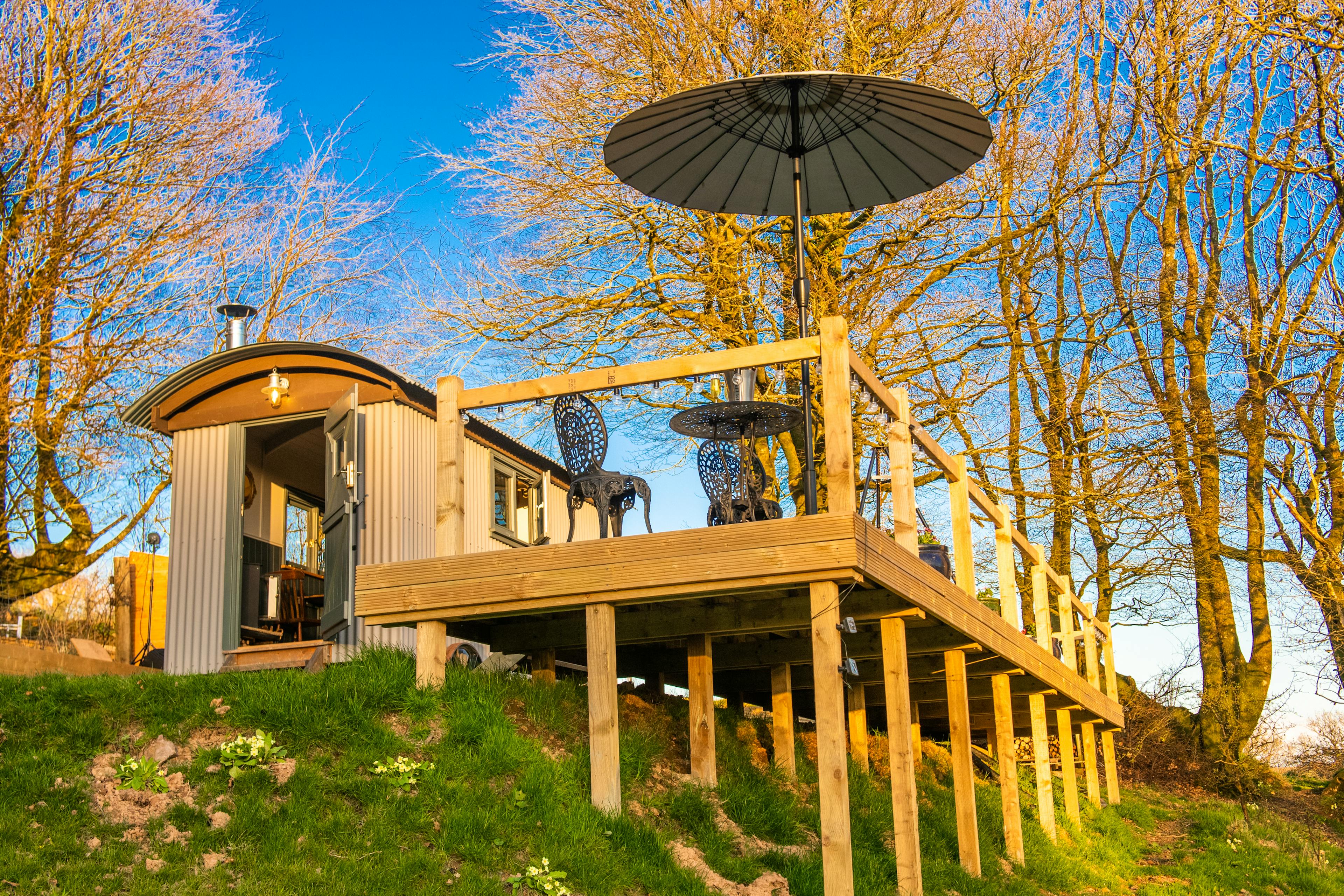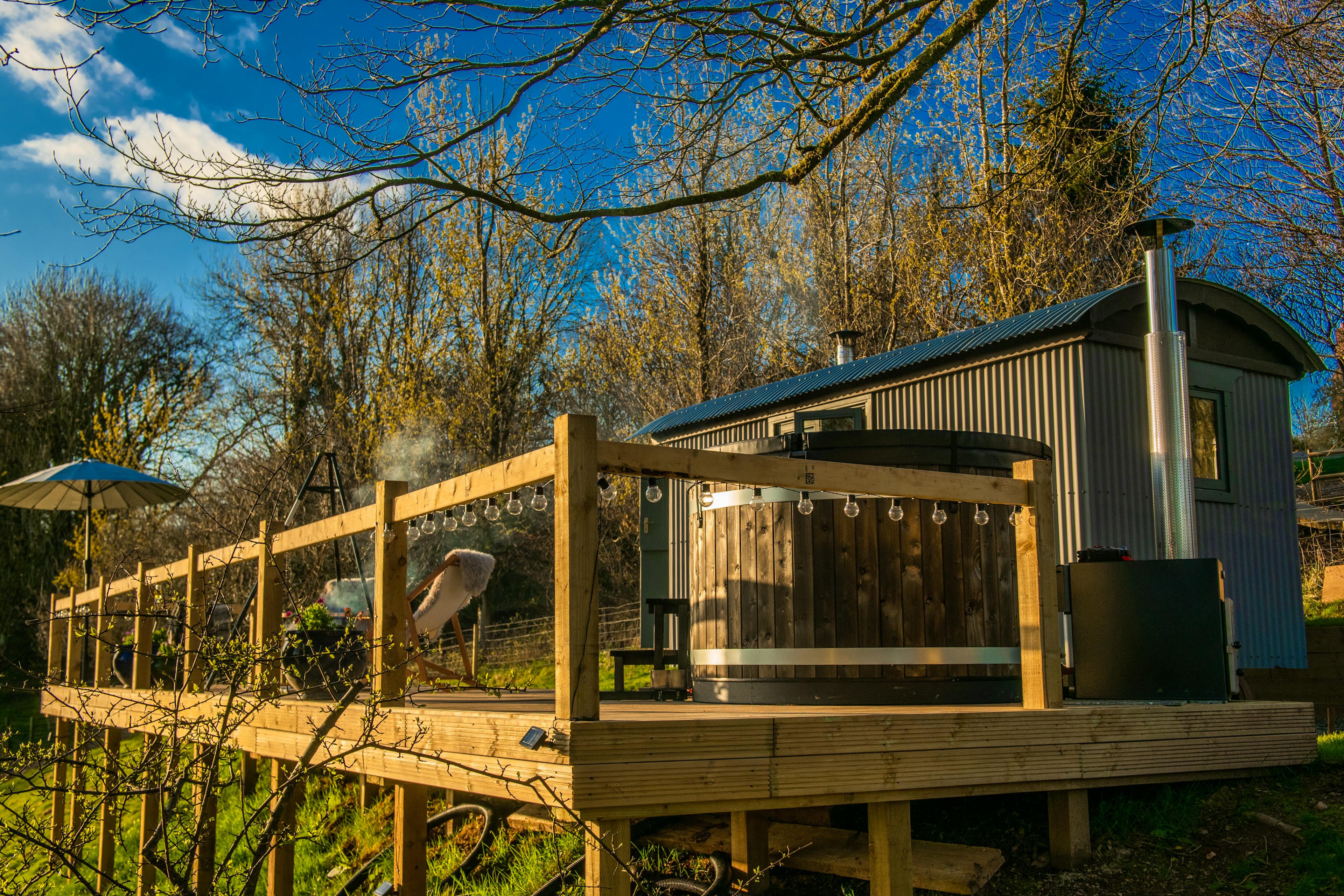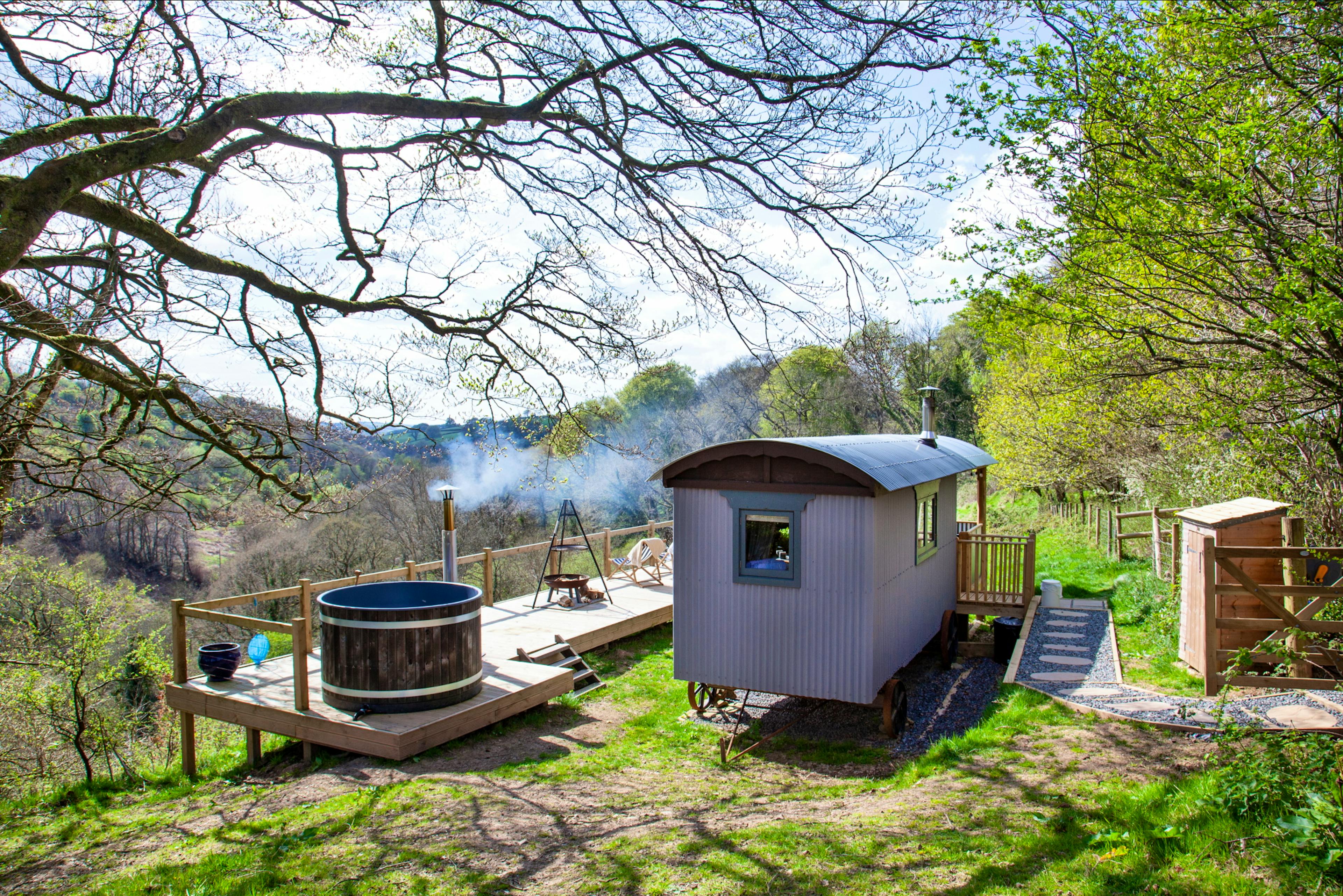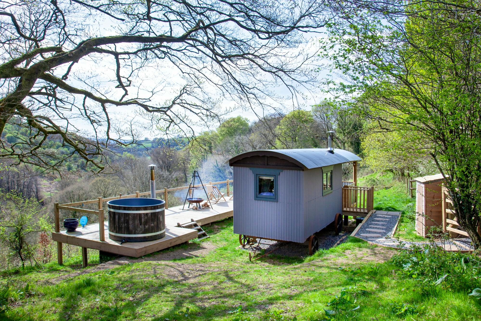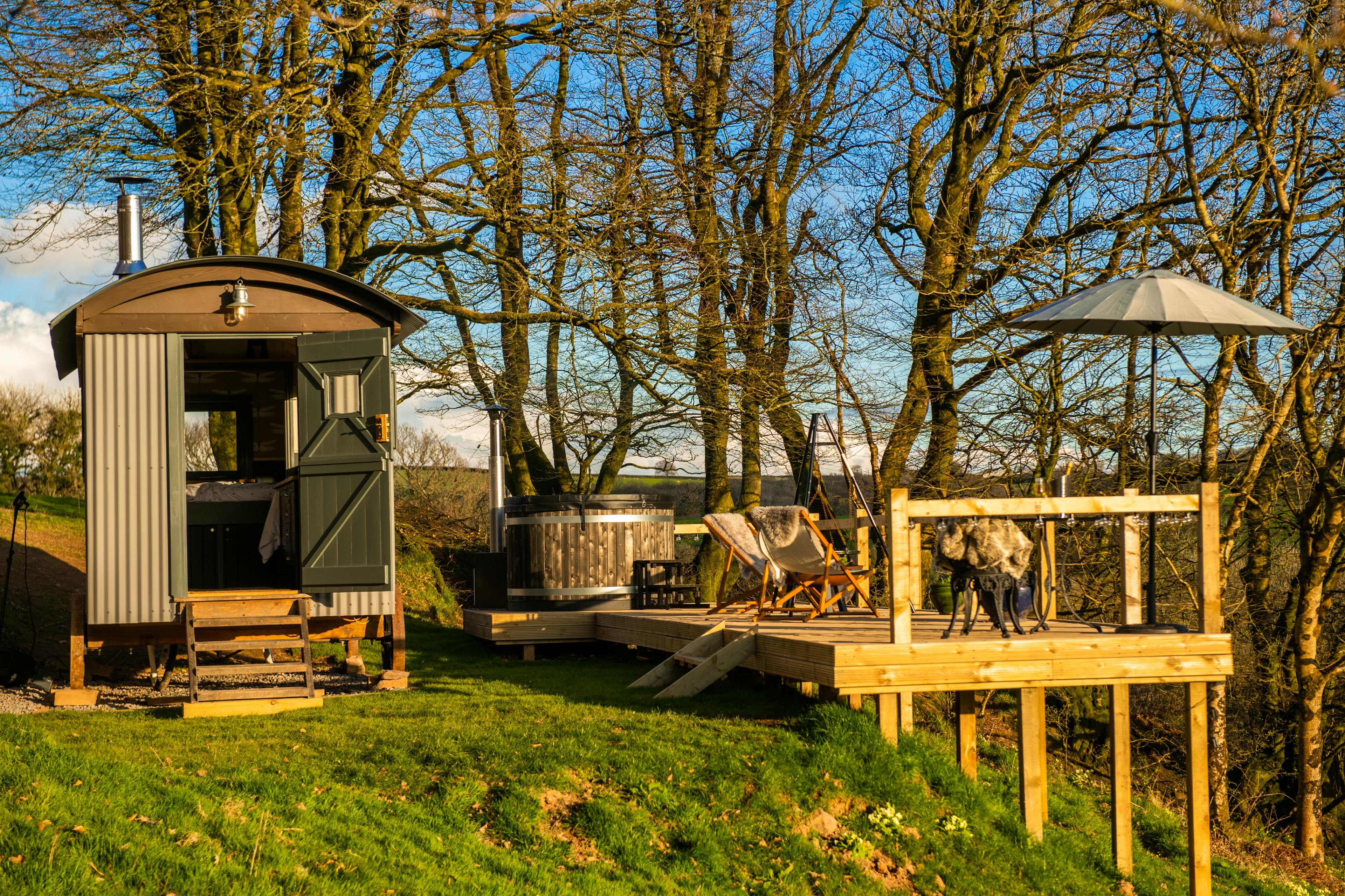 Cosy shepherd’s hut with a wood-fired hot tub and spectacular views on a farm in North Devon, a romantic rural escape.