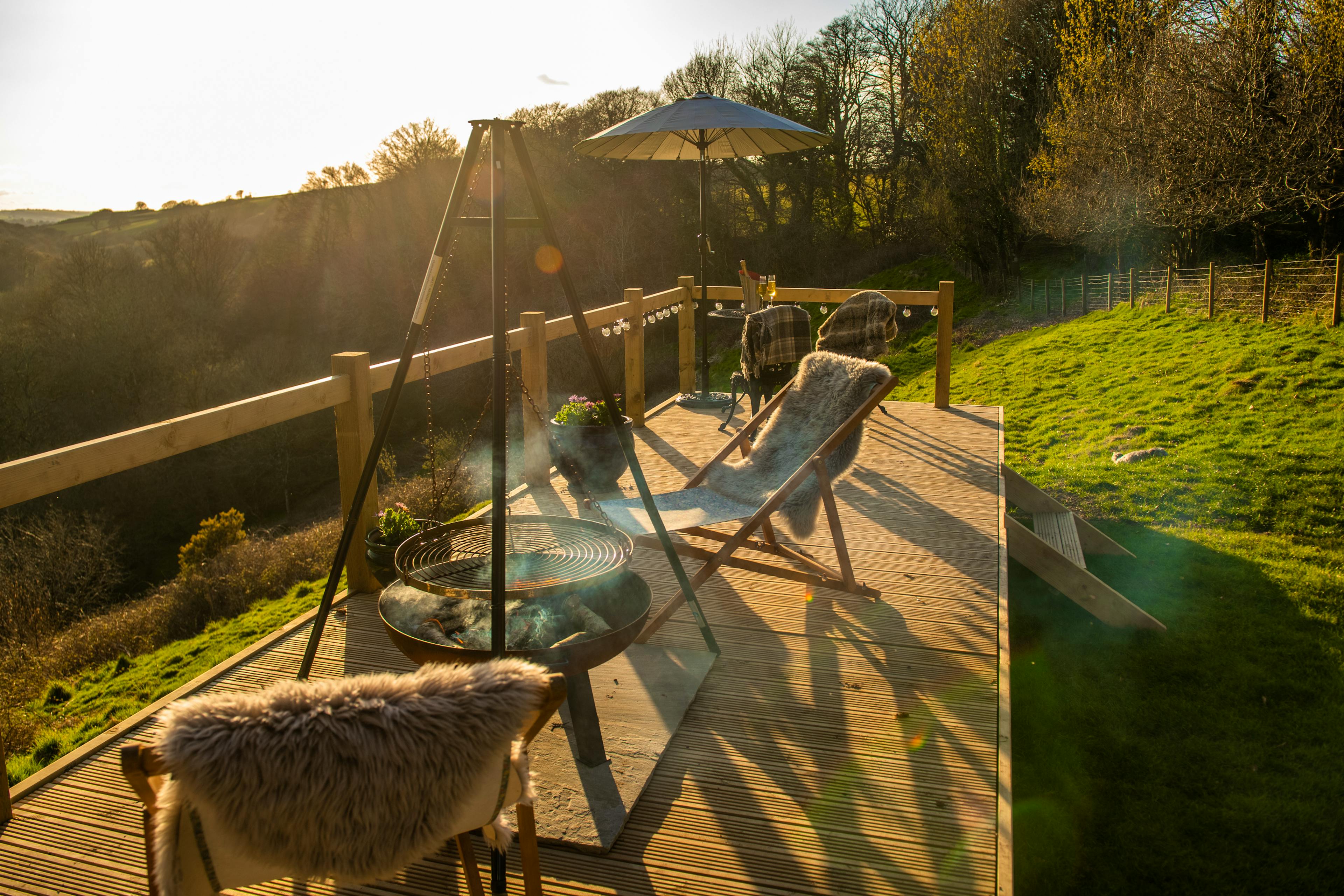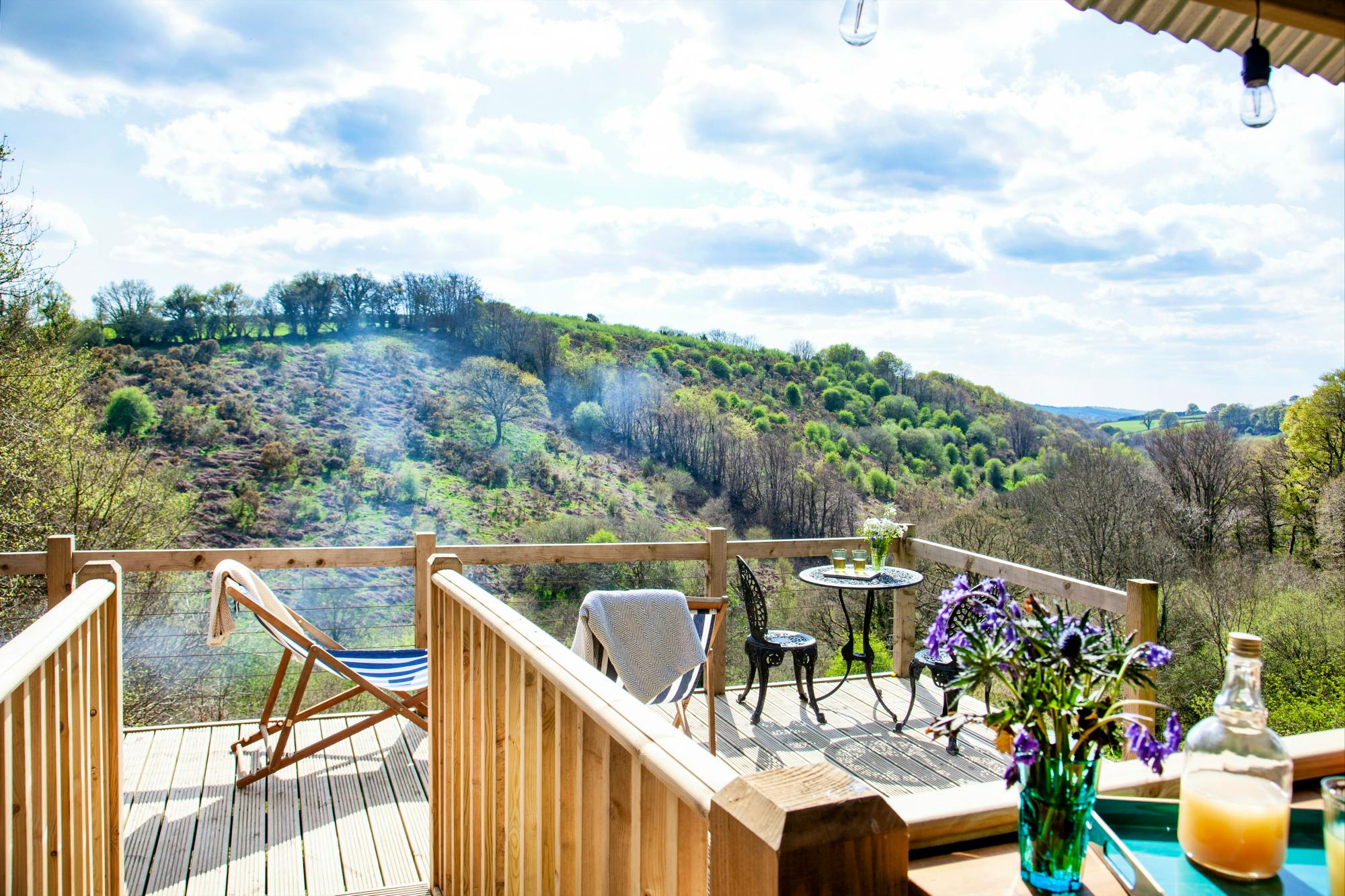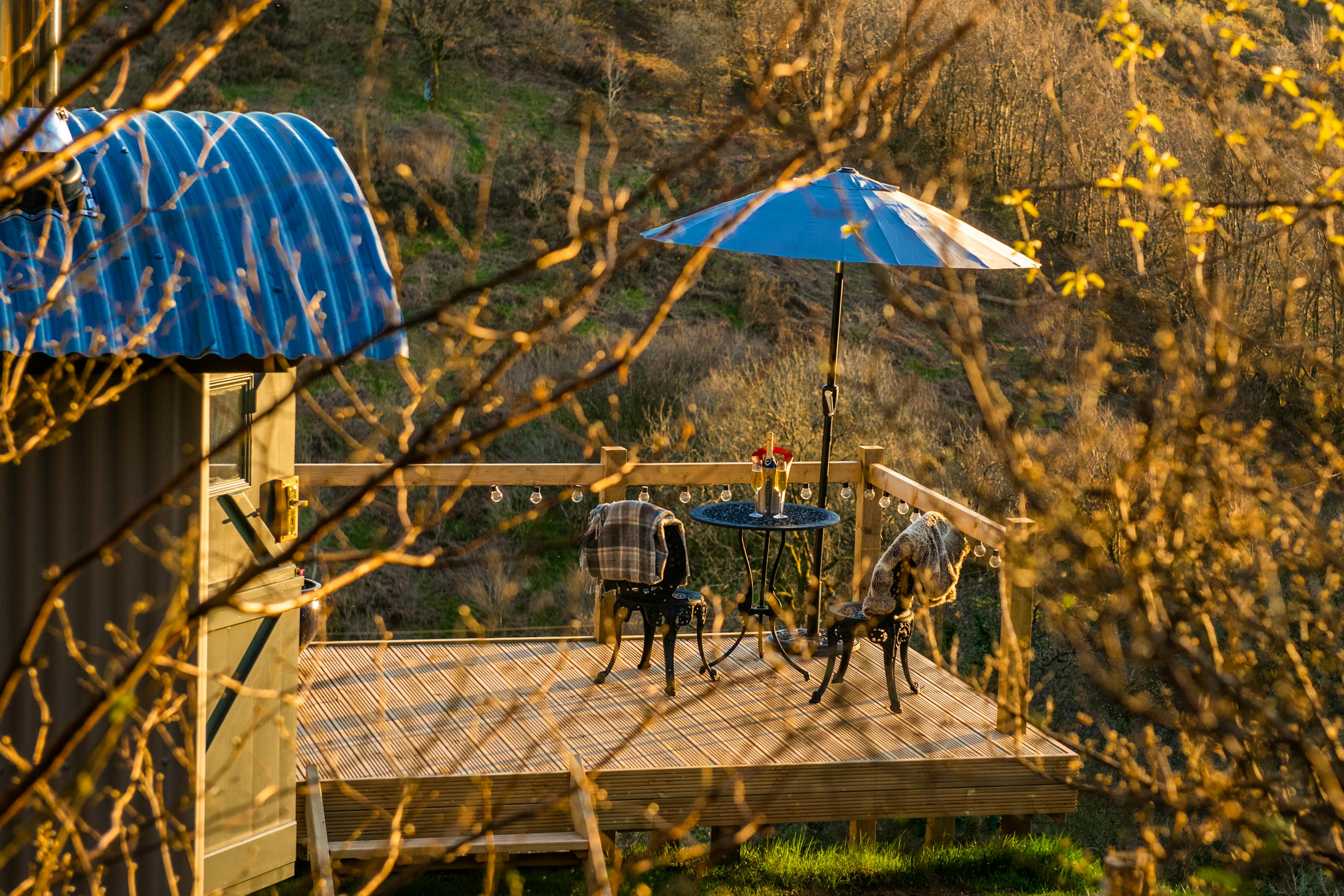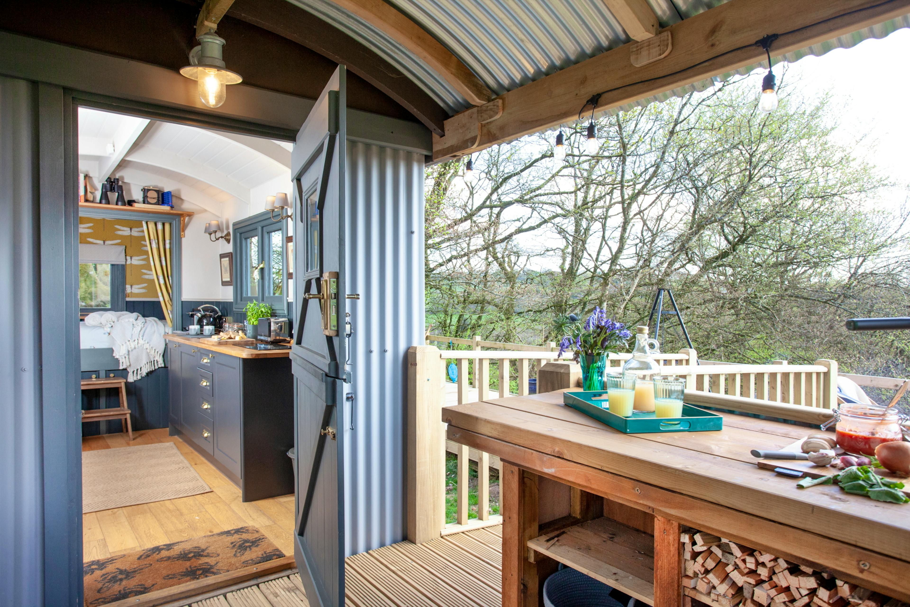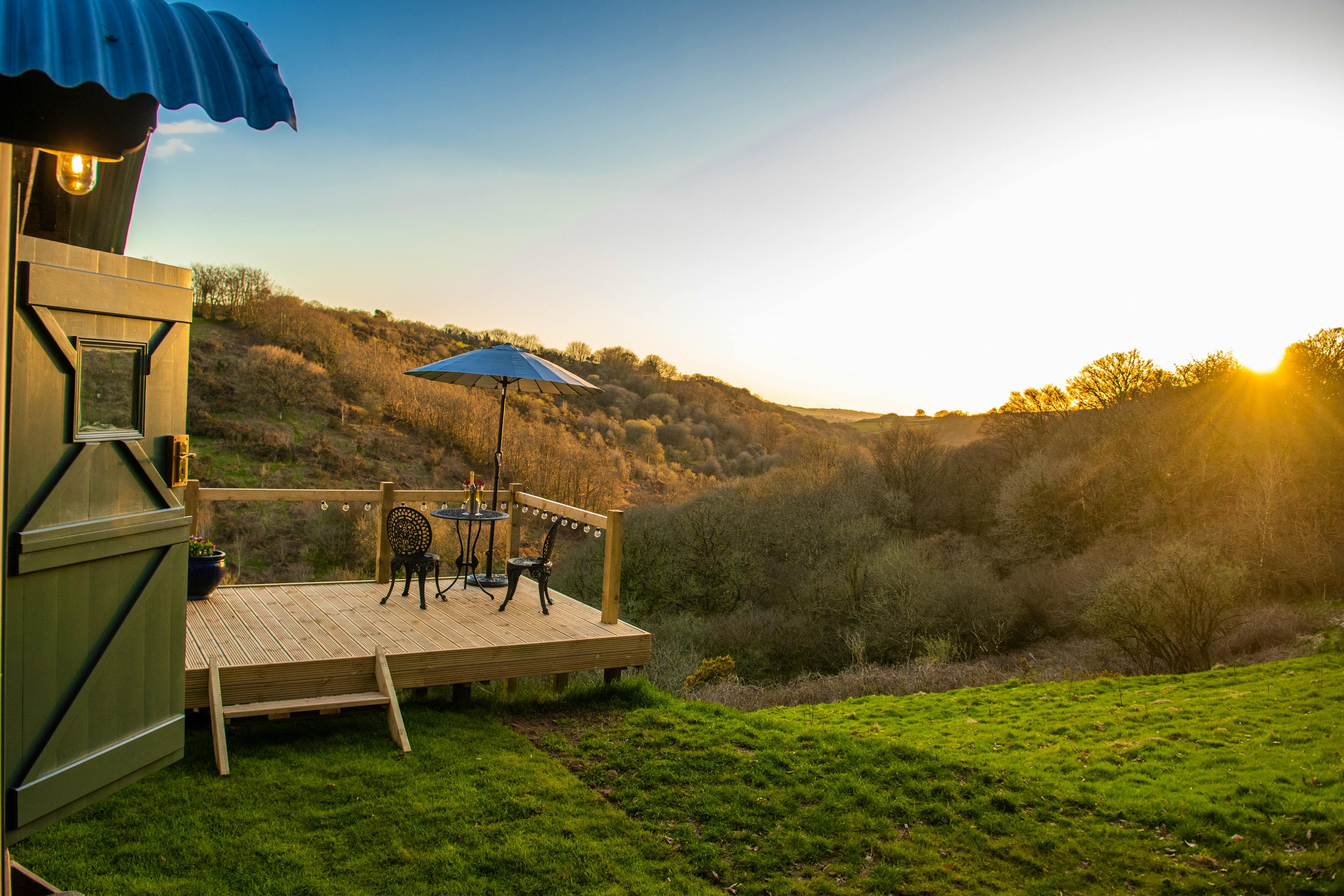 Cosy shepherd’s hut with a wood-fired hot tub and spectacular views on a farm in North Devon, a romantic rural escape.