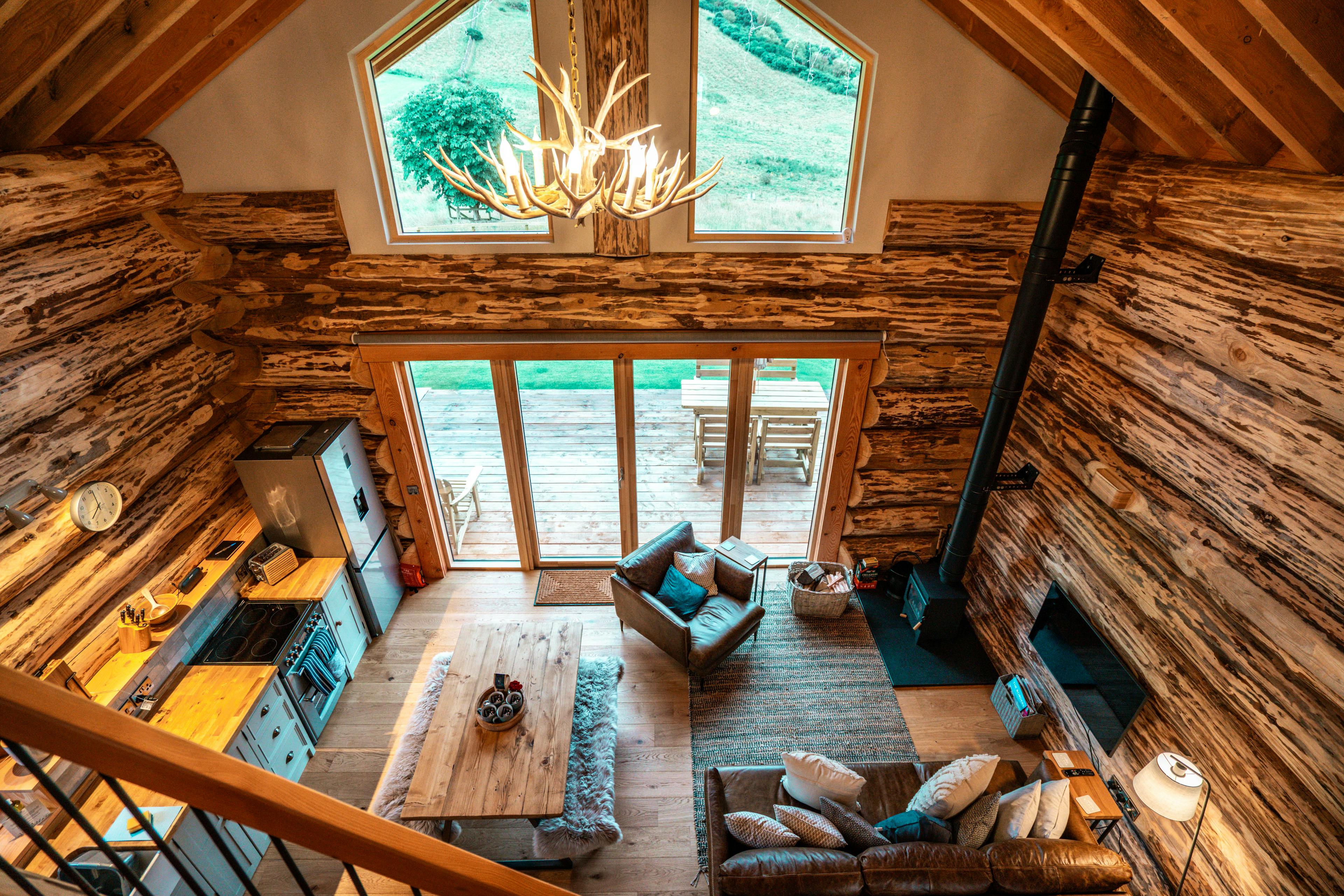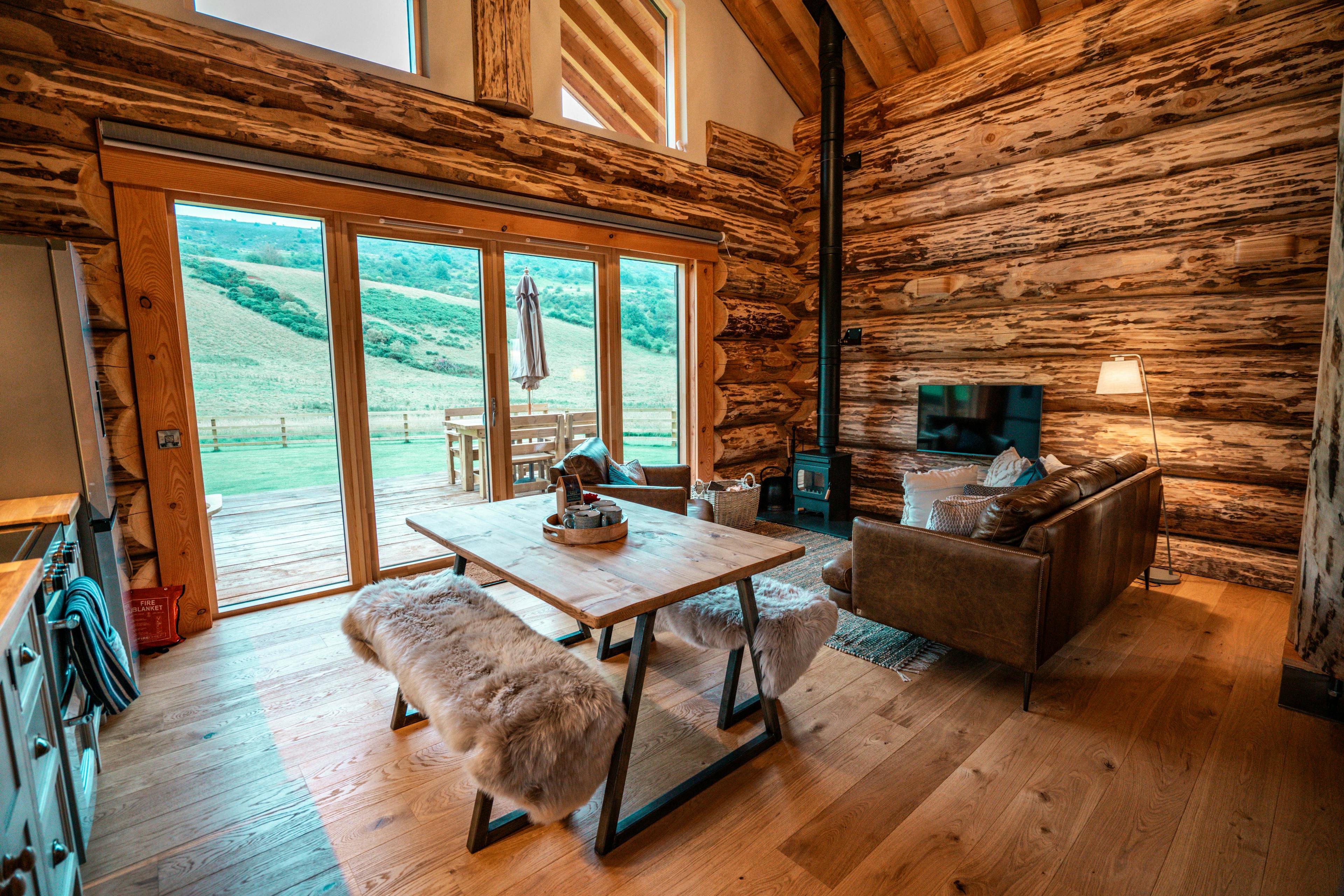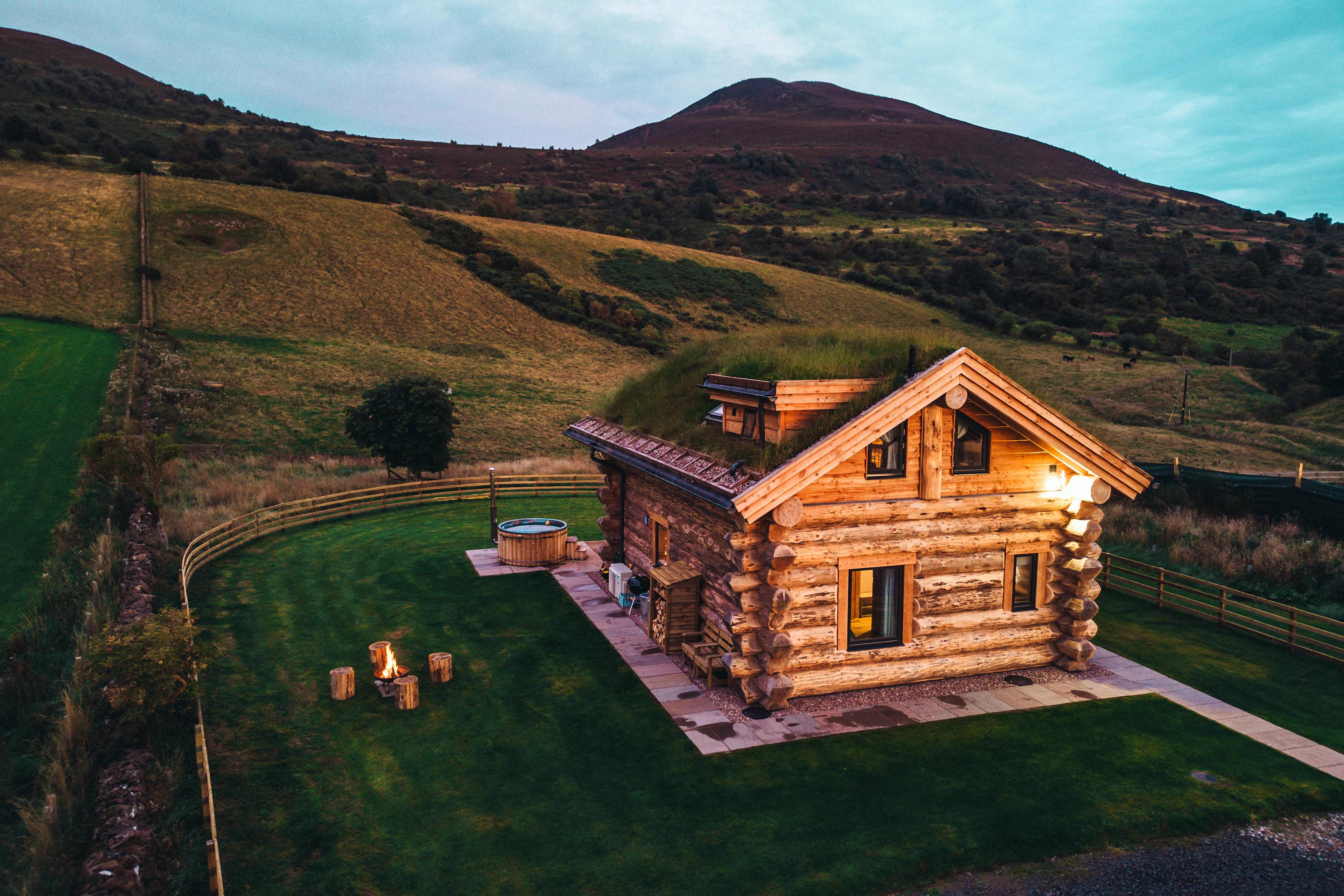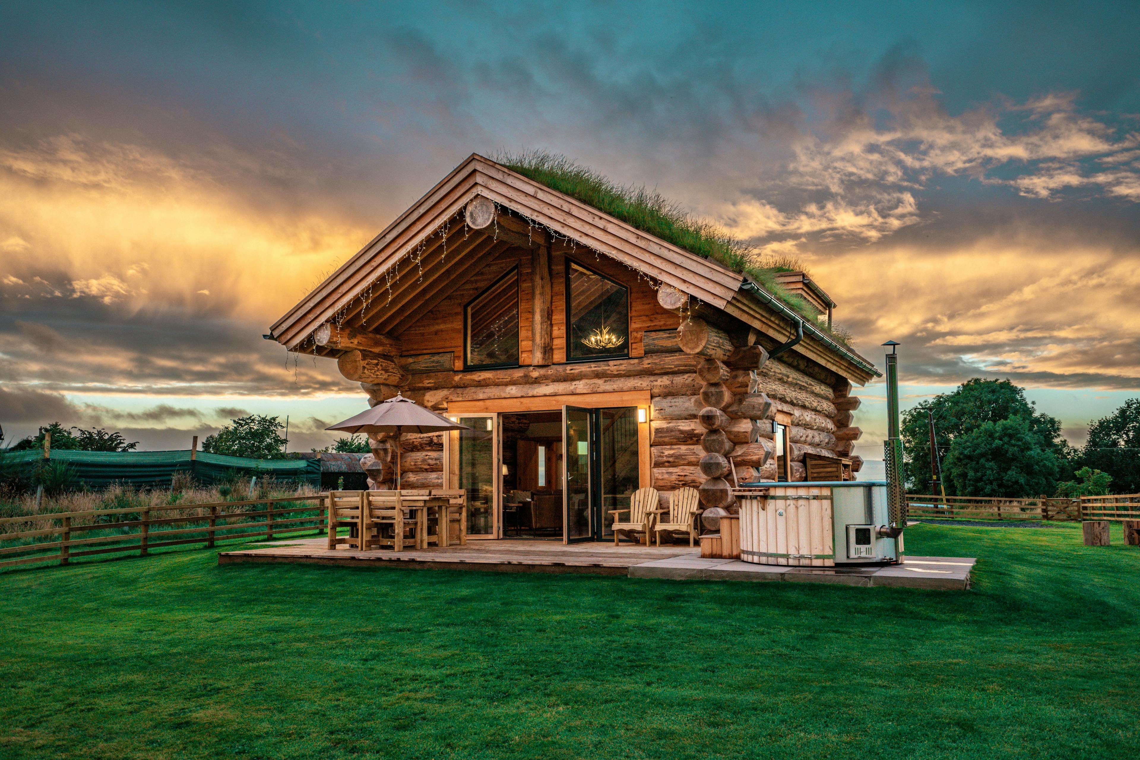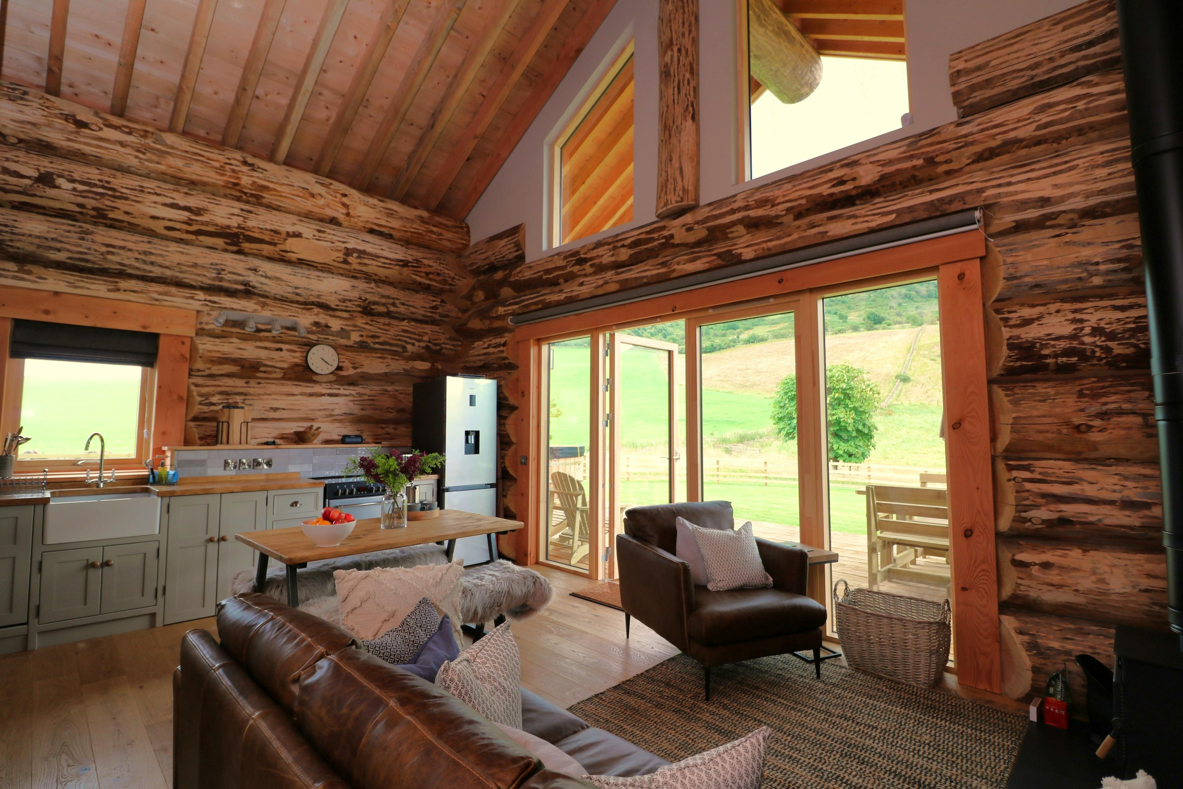 Beautifully crafted traditional log cabin in the Scottish Borders with stunning views and a hot tub, perfect for a family escape.