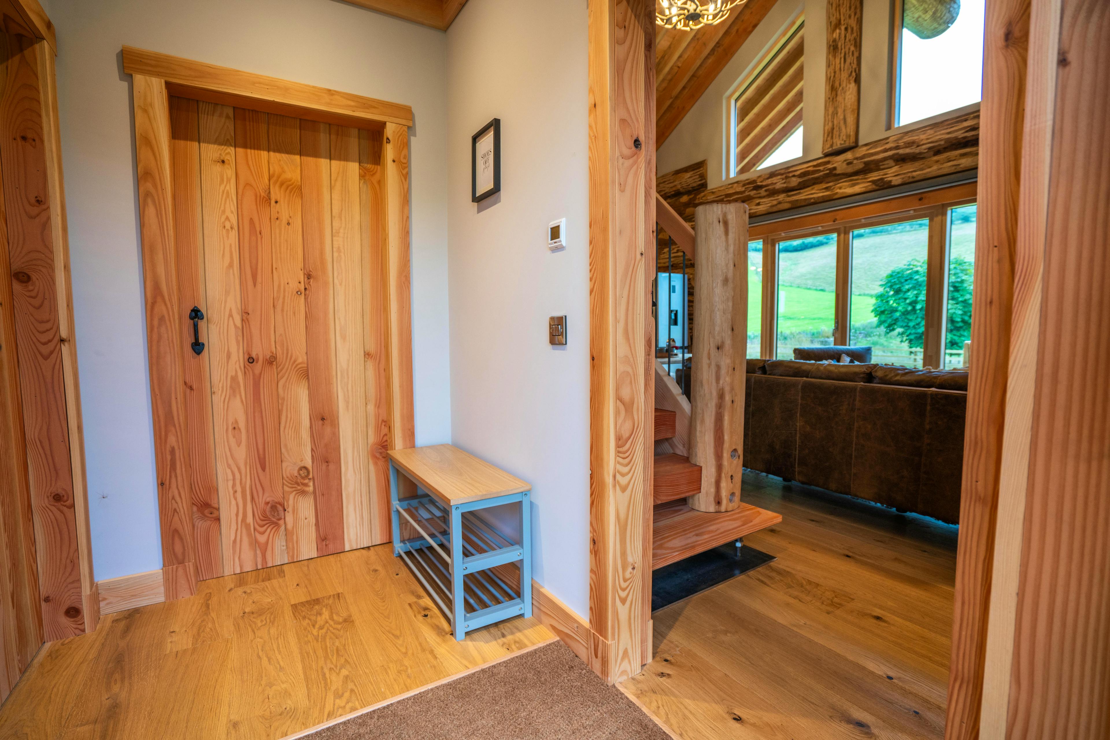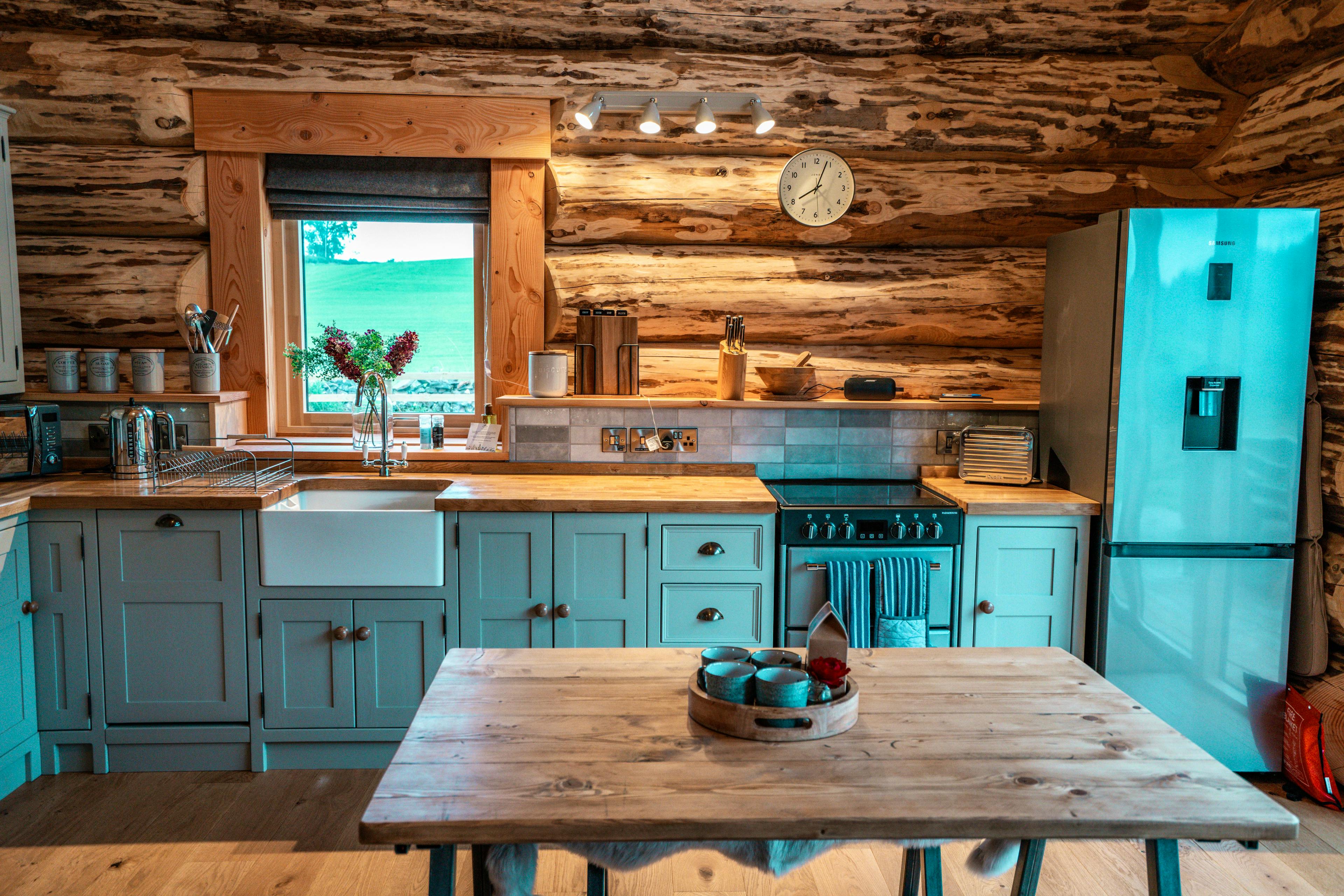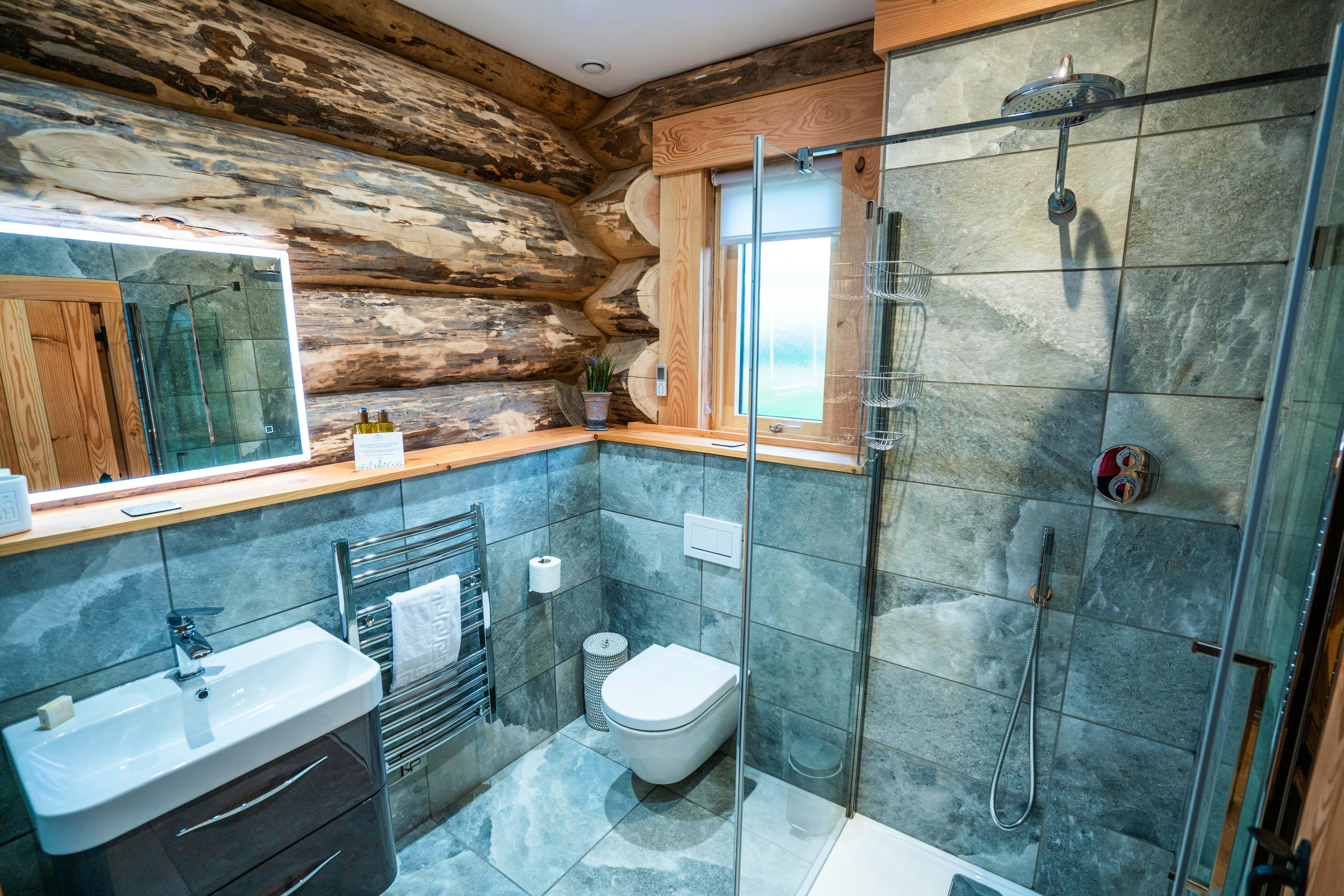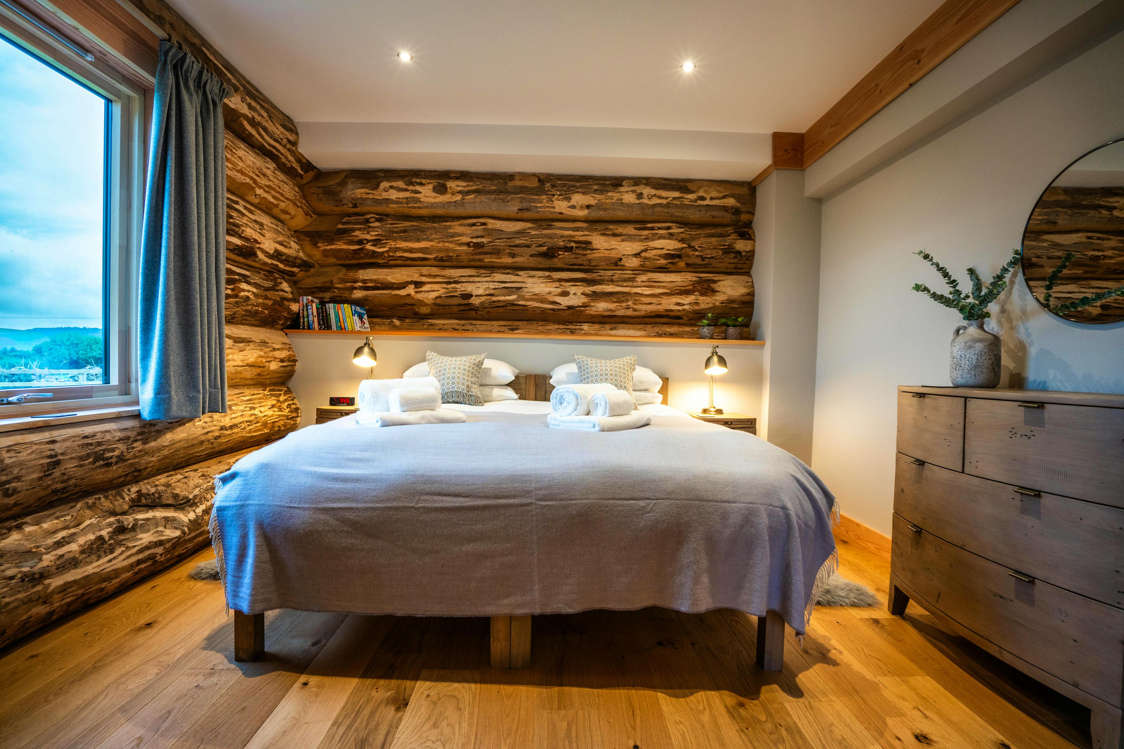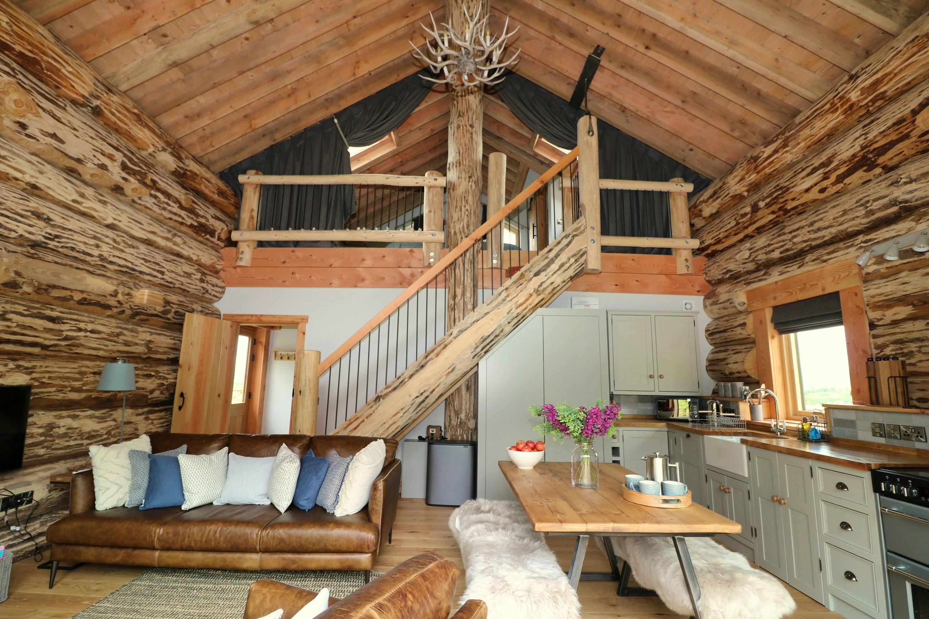Beautifully crafted traditional log cabin in the Scottish Borders with stunning views and a hot tub, perfect for a family escape.