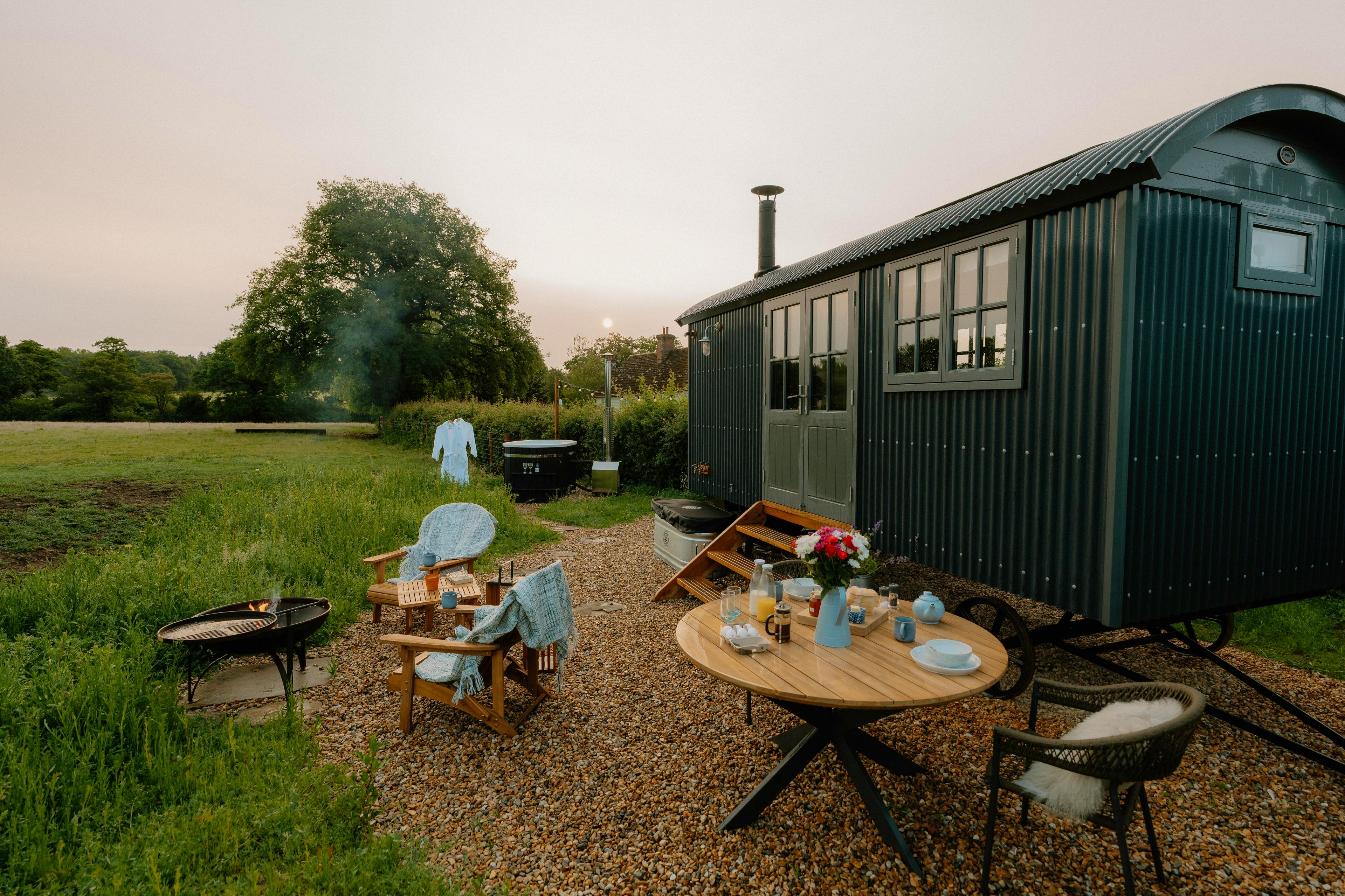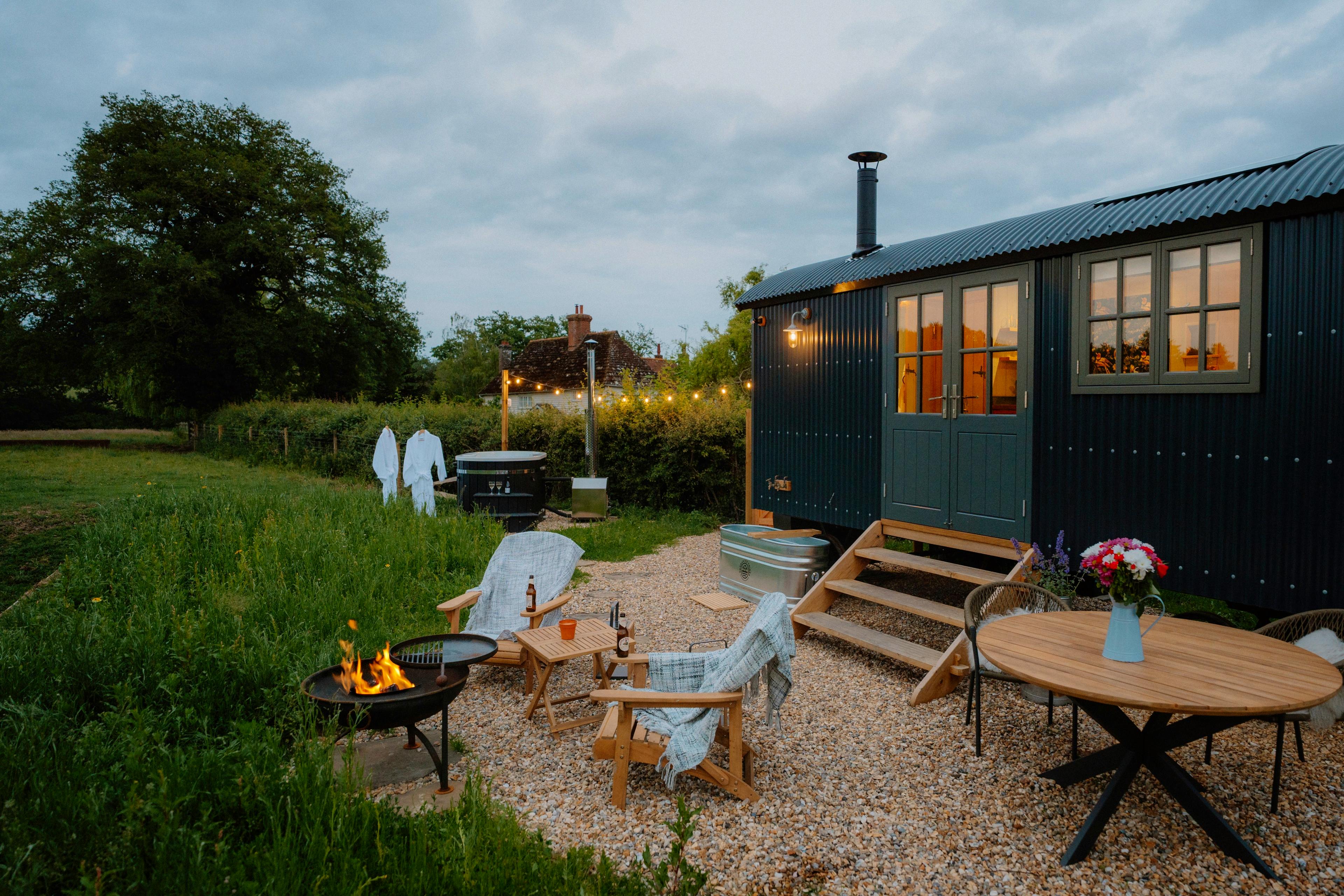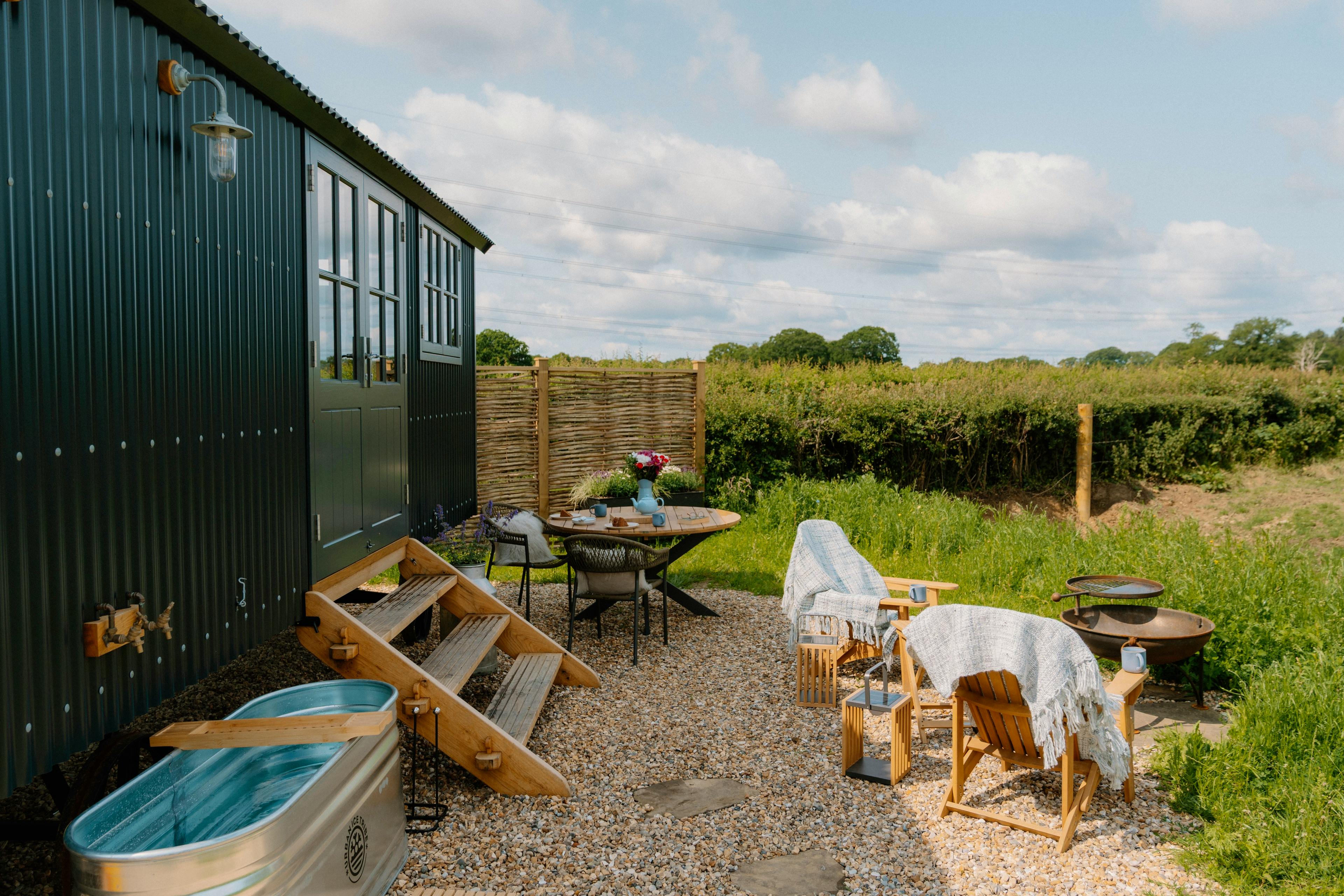 This charming shepherds hut offers couples or pairs of friends a fabulous stay on a working farm with a private hot tub and luxurious outdoor bath.