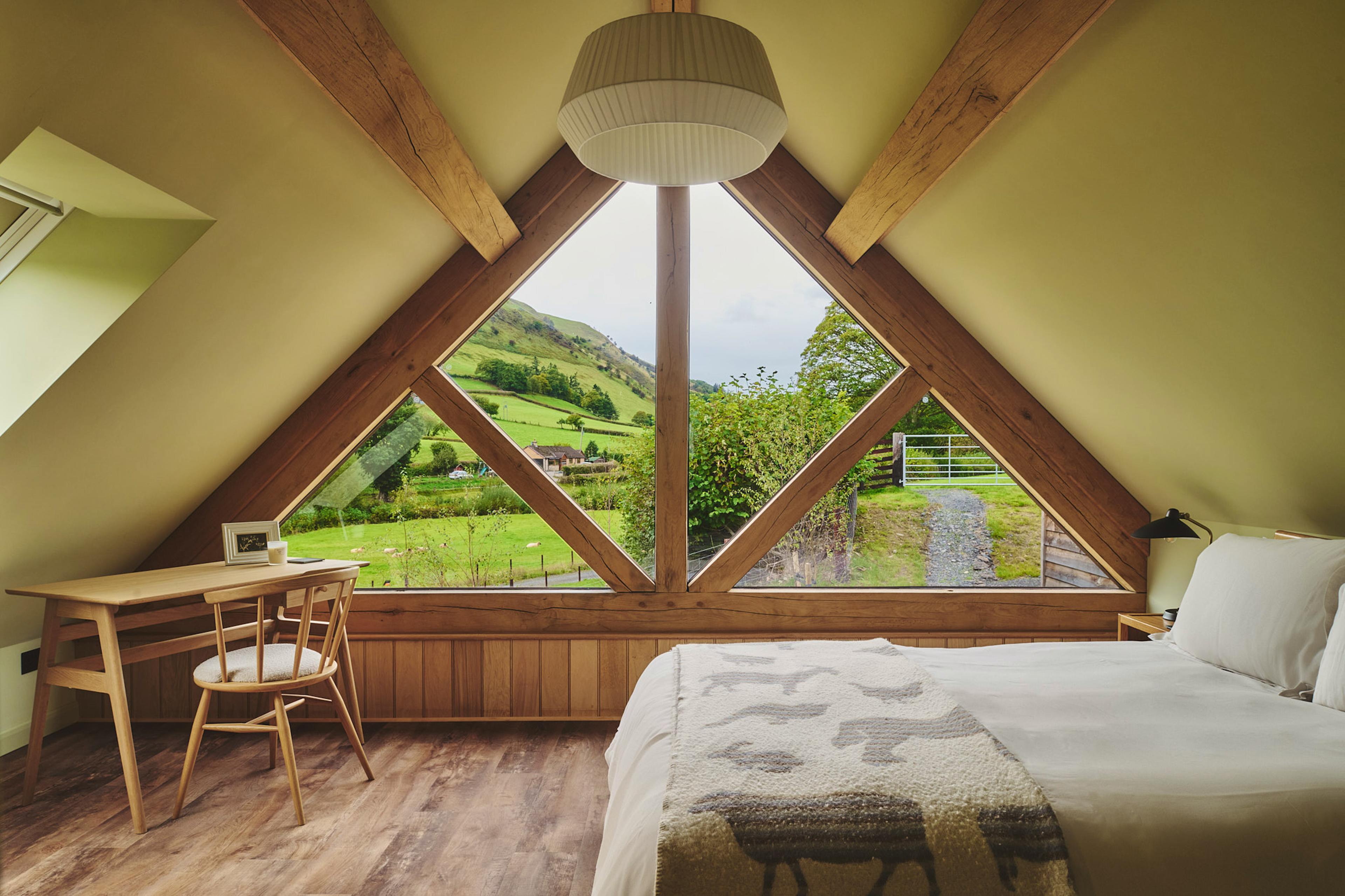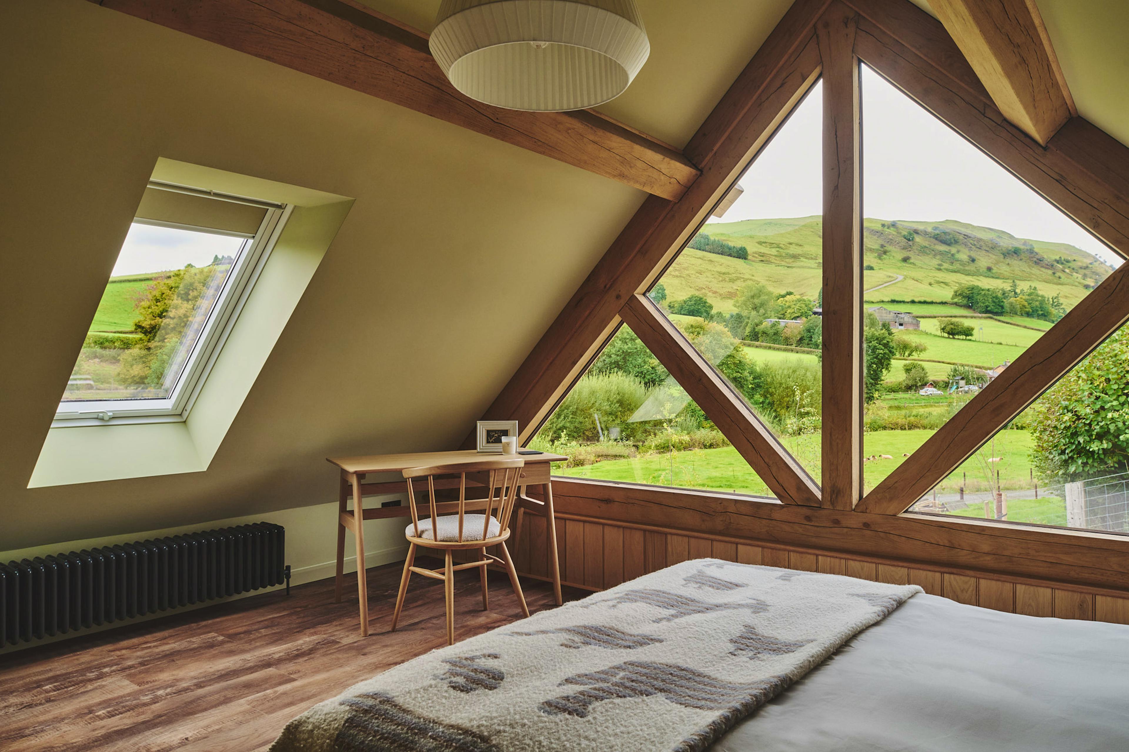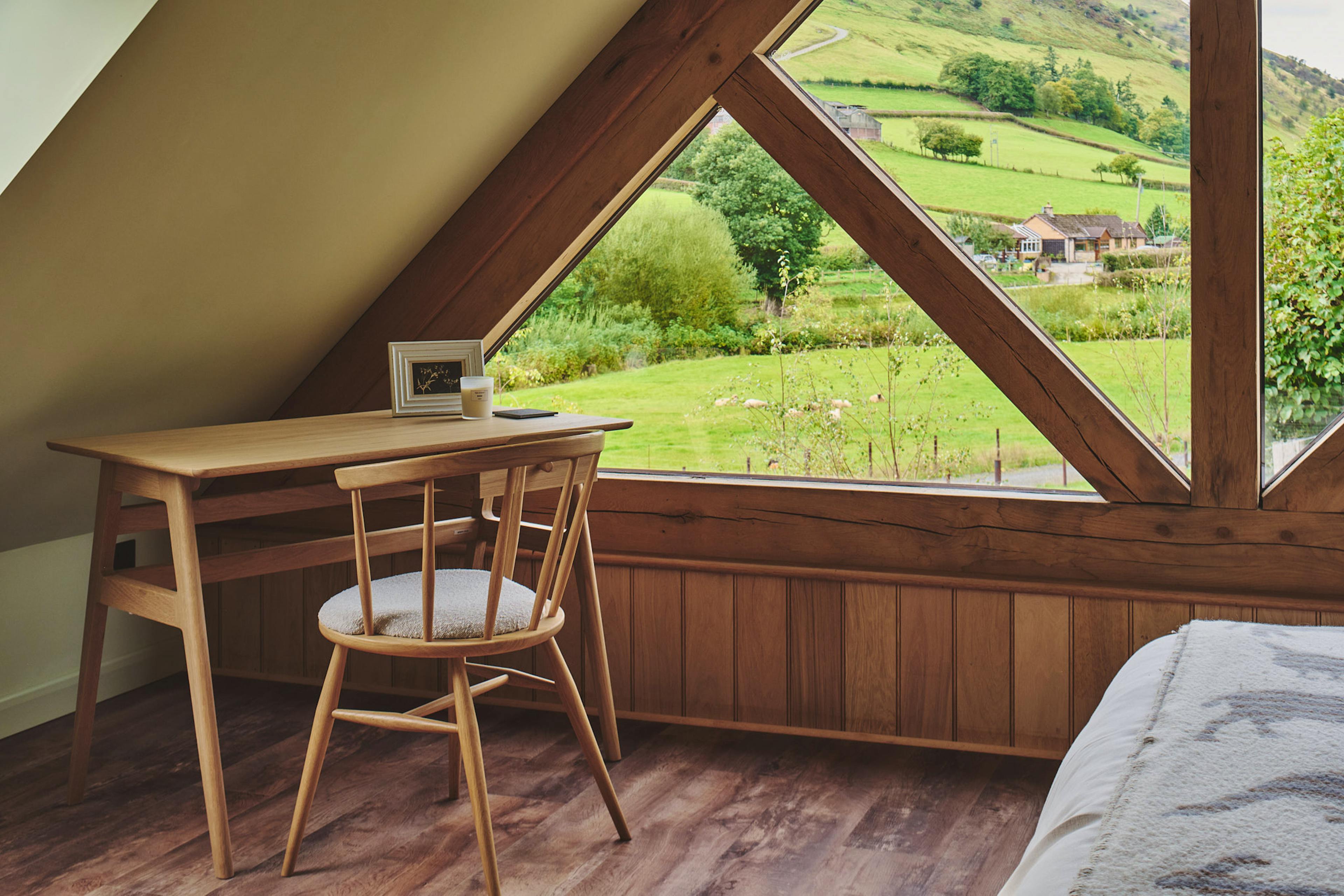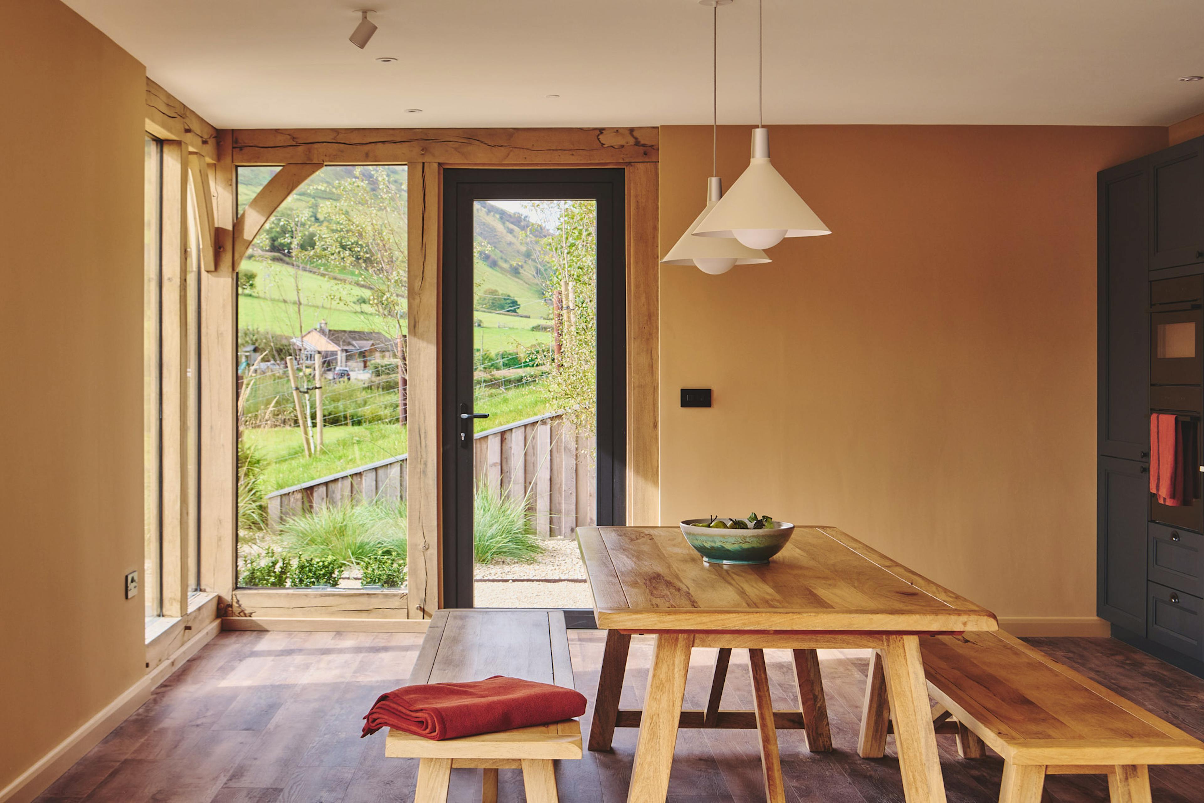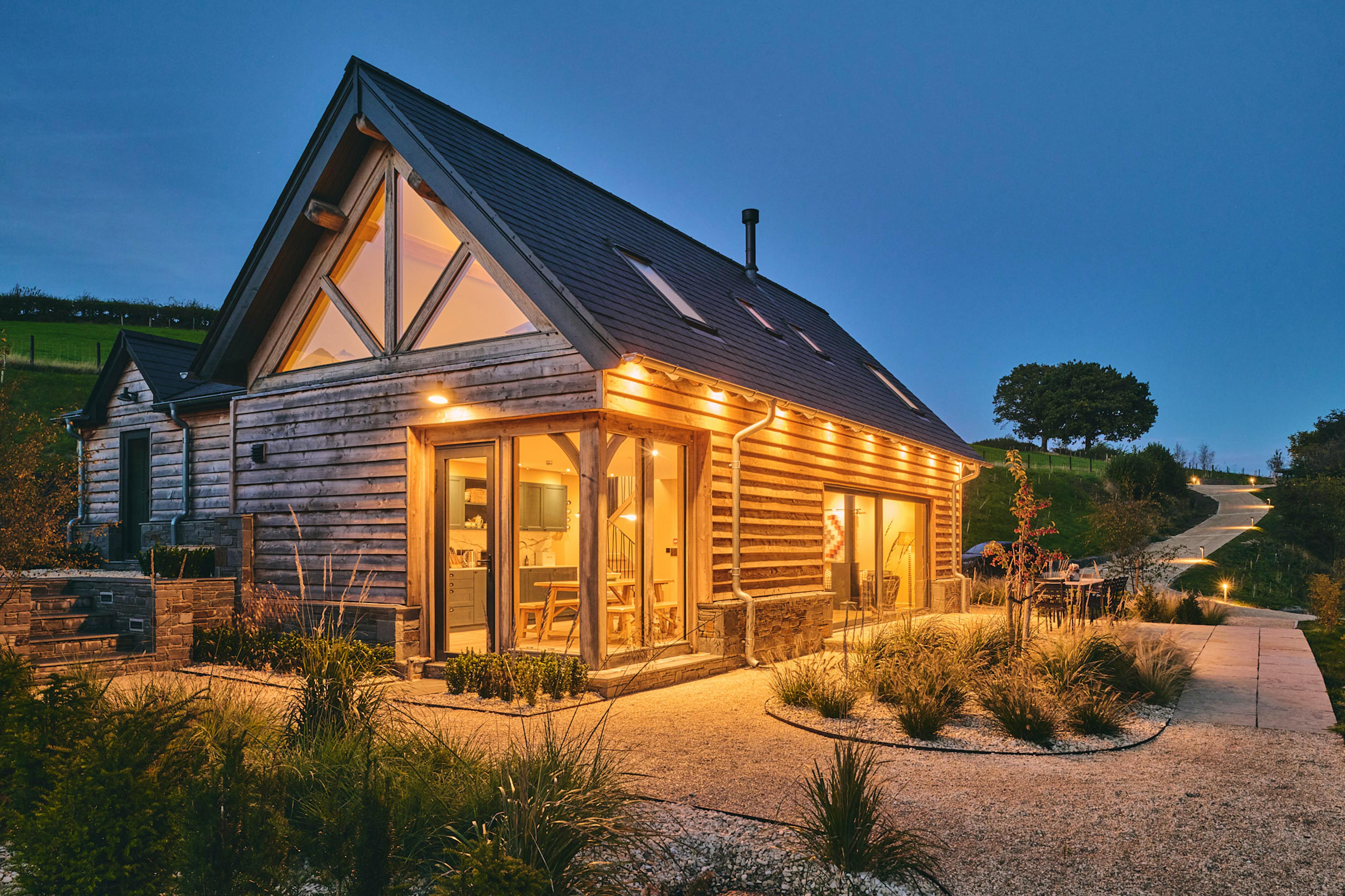 Stylish oak-framed escape in a peaceful Mid Wales valley with sweeping countryside views.