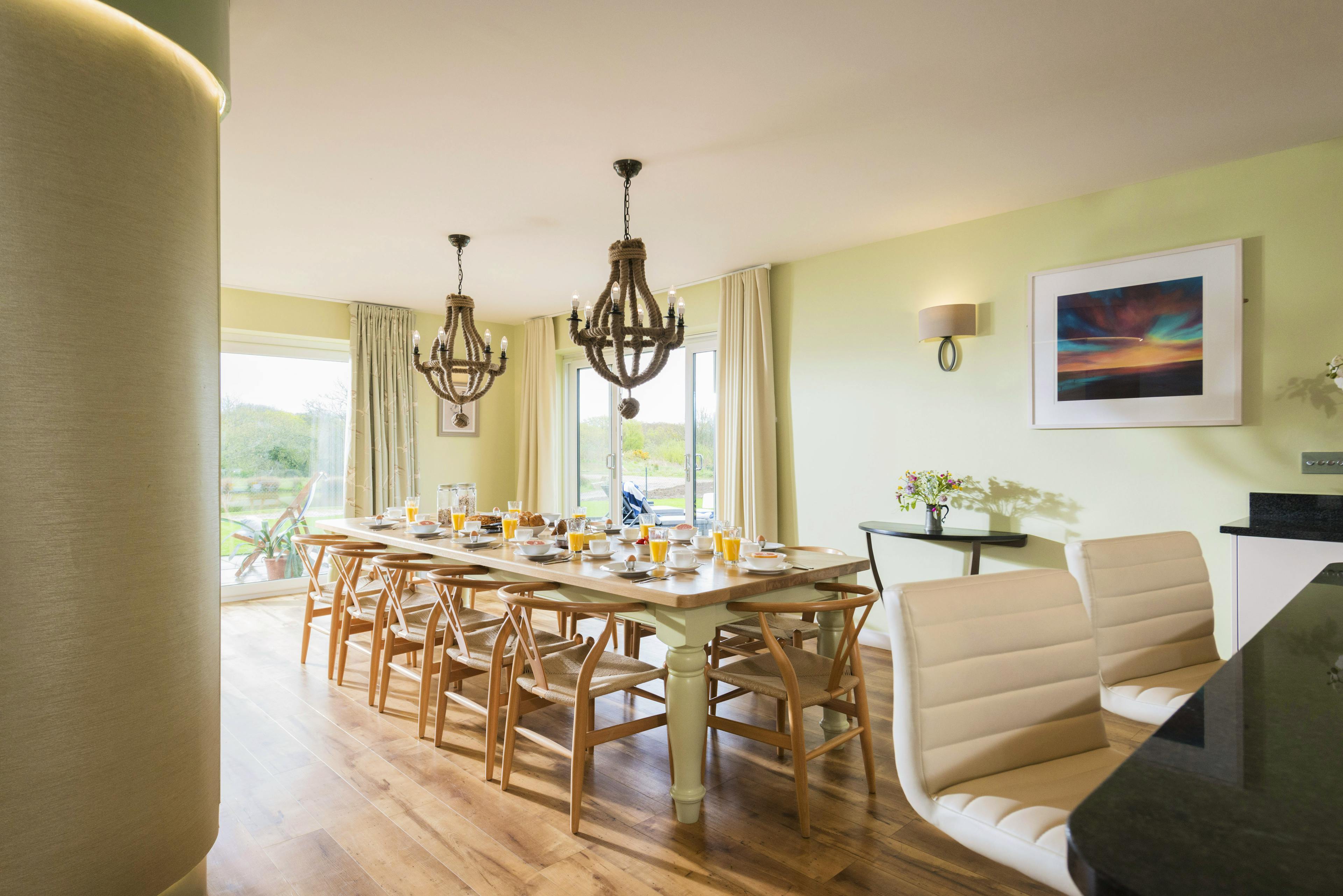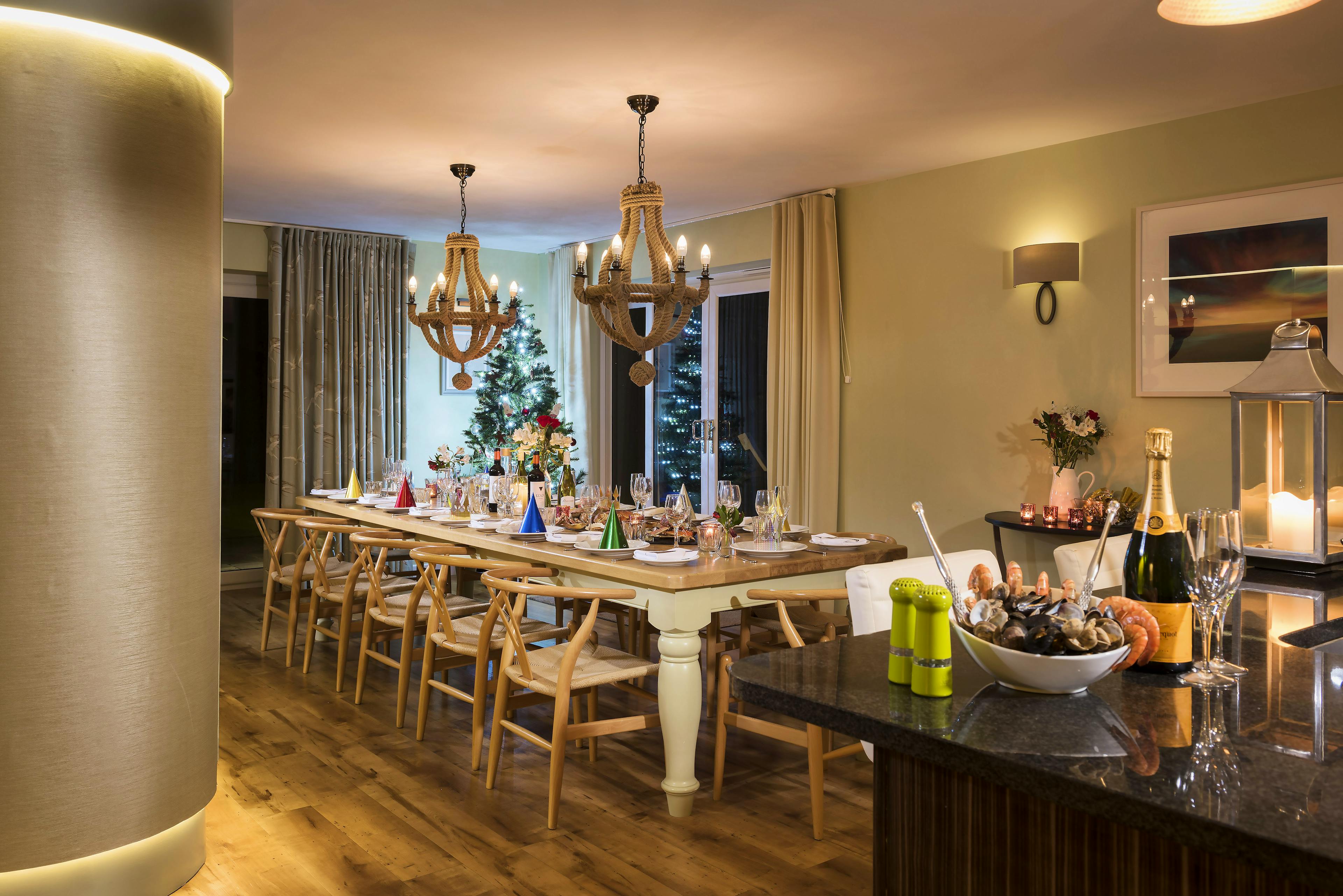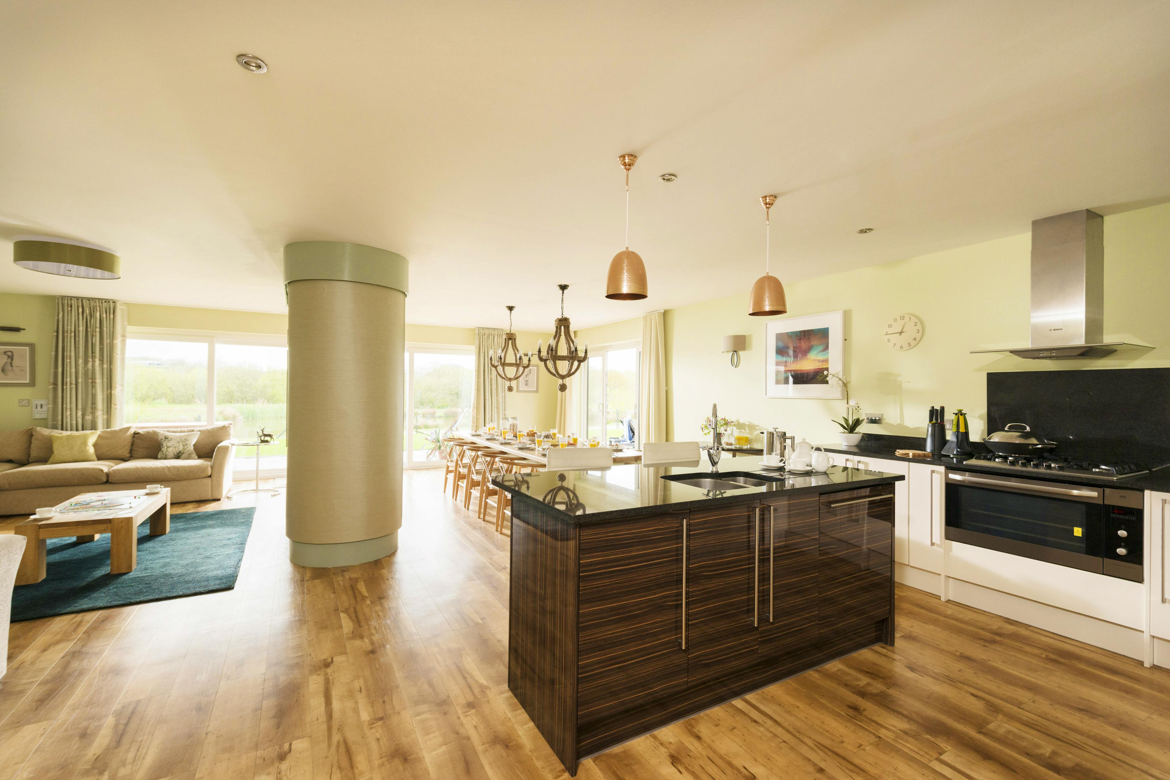 Inside, you’ll find a huge living space set up for entertaining with plenty of room for everyone to relax, cook and eat together while enjoying the views over the garden.