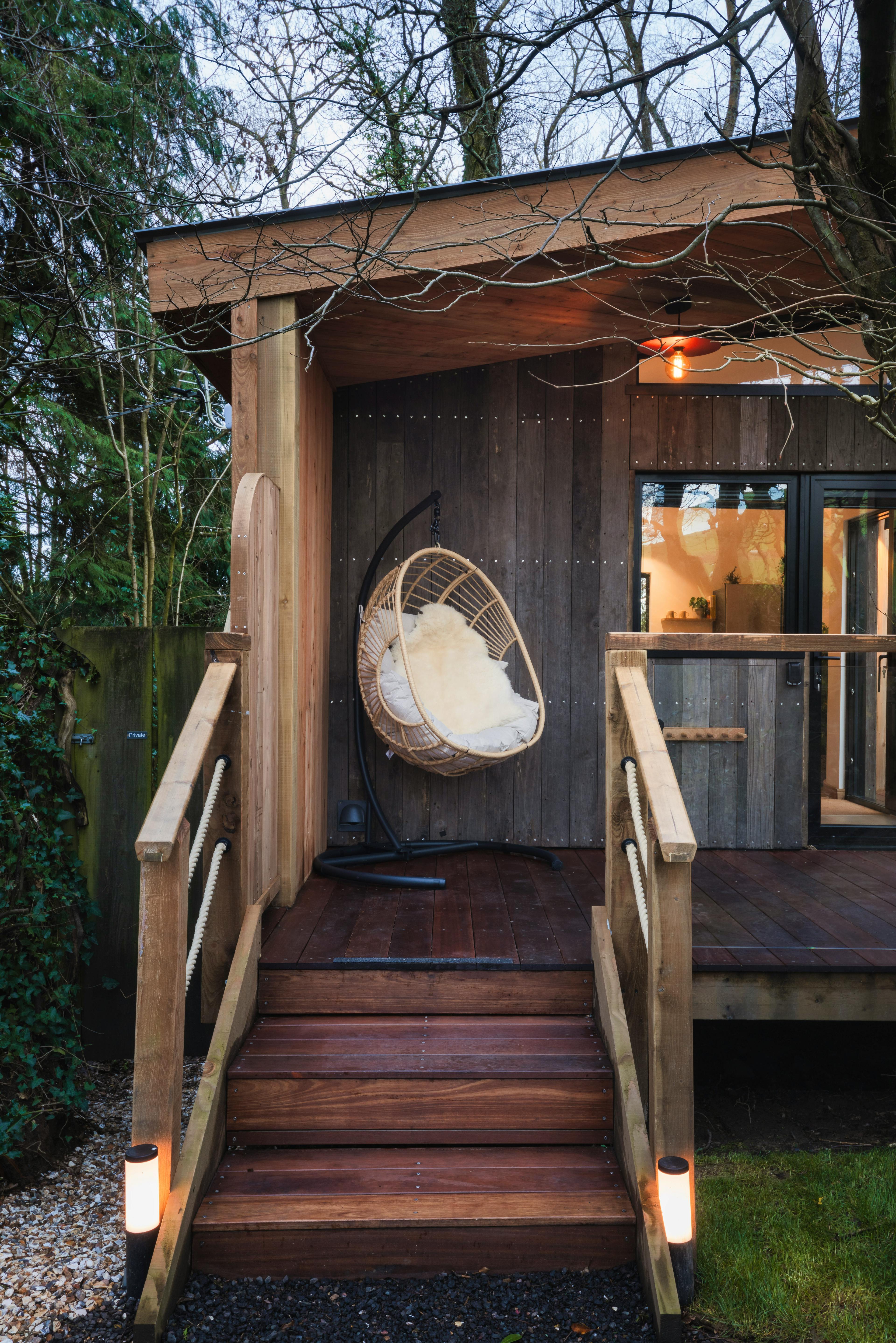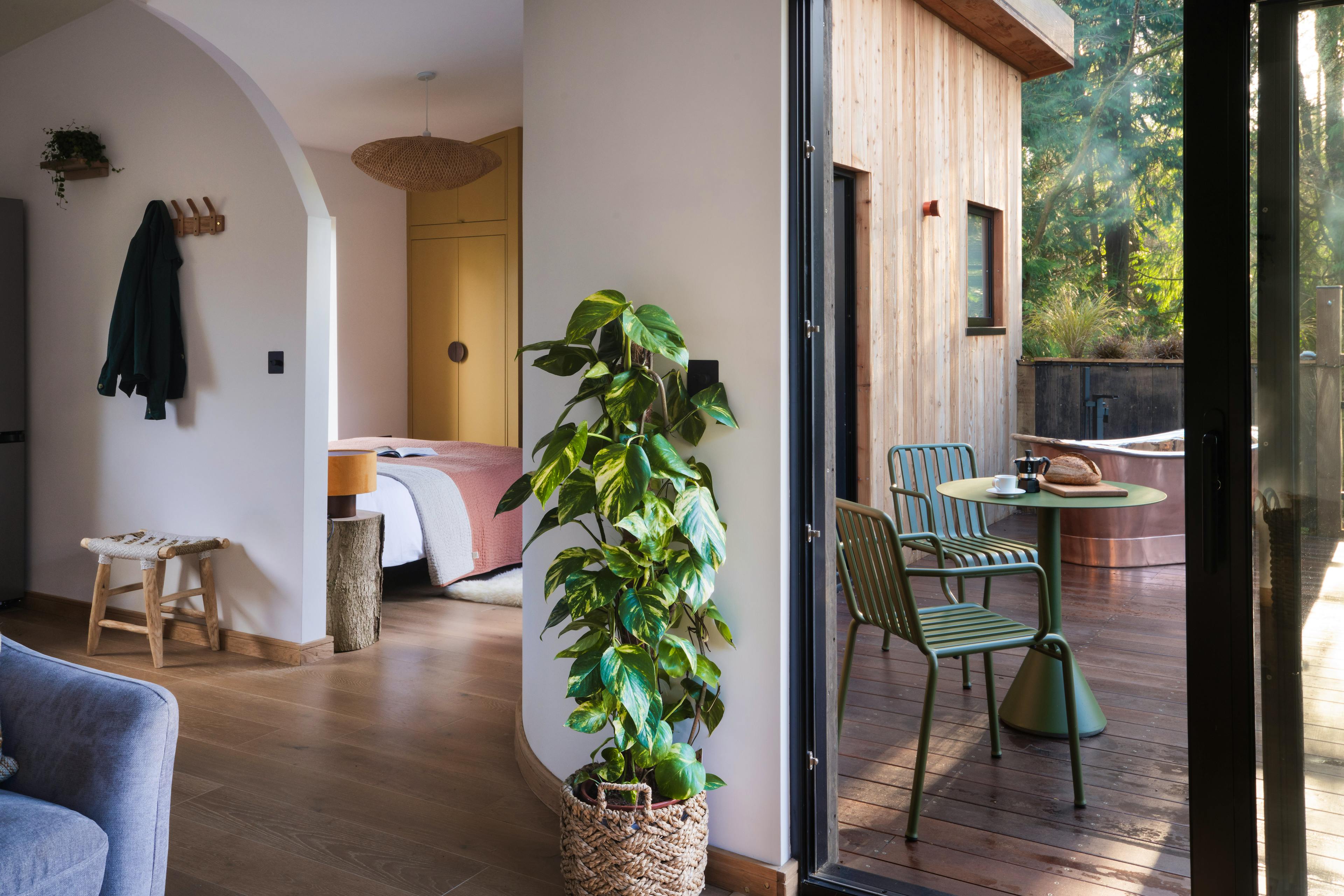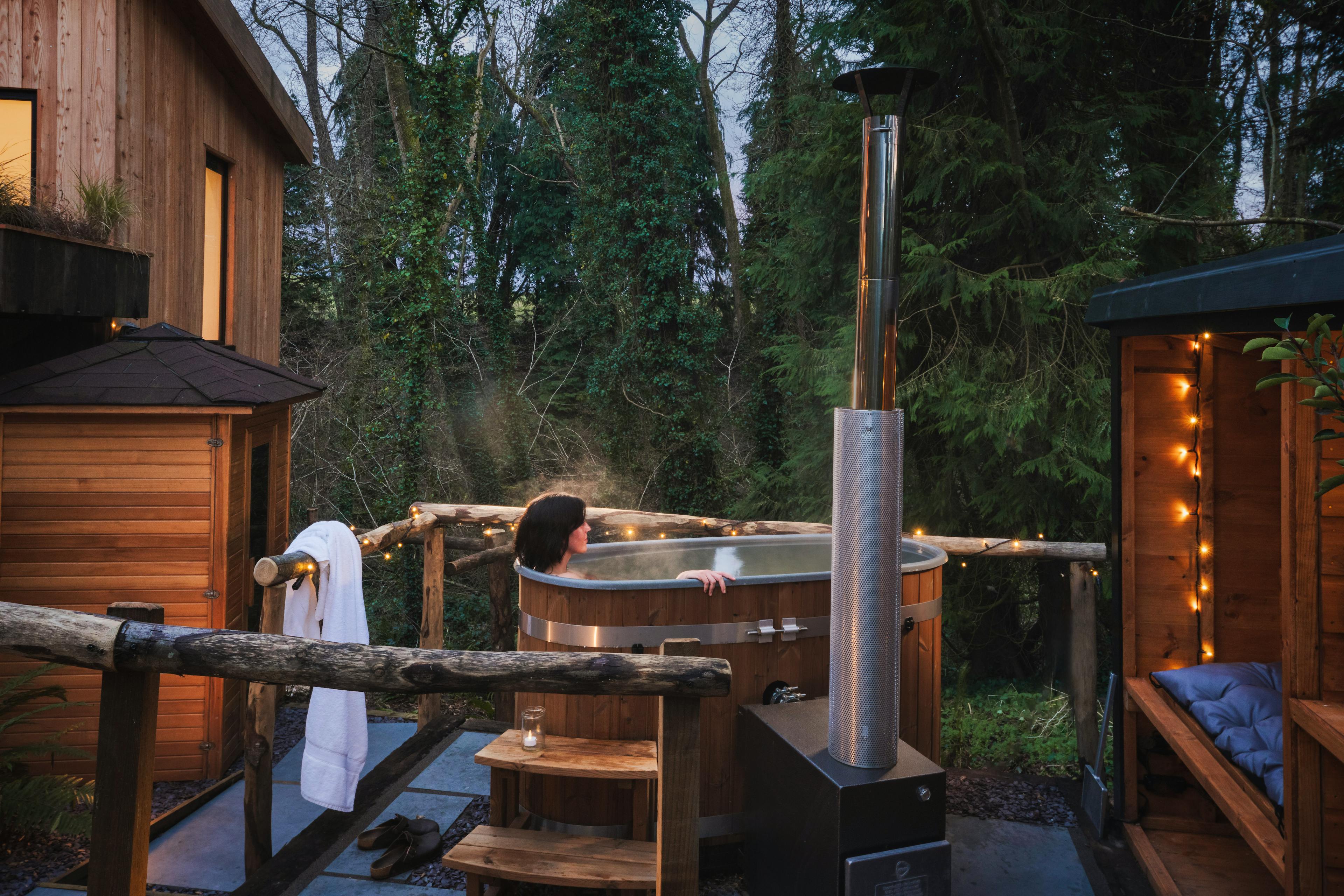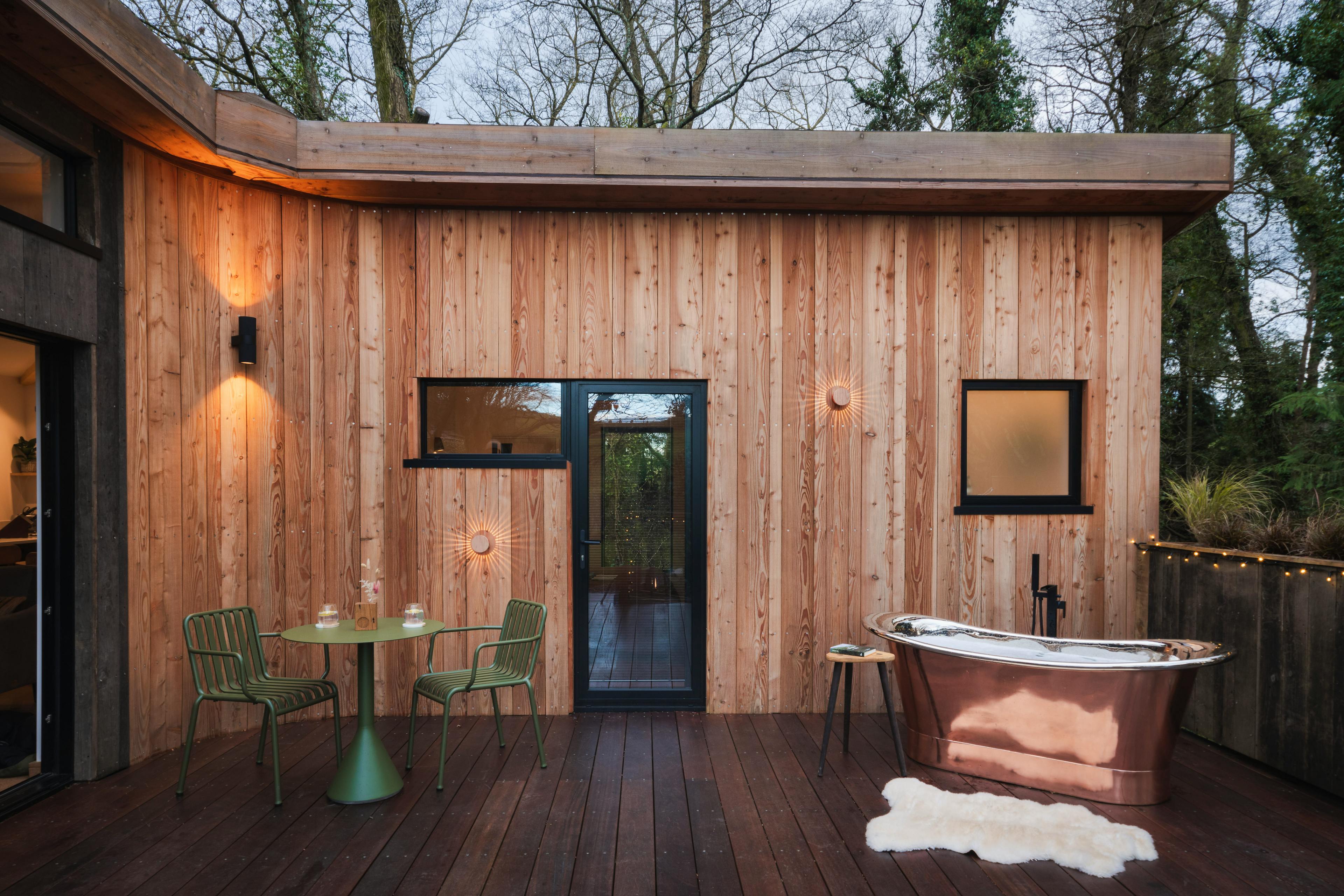 Stylish cabin nestled amongst the trees on a farm in Somerset with its own outdoor spa, perfect for a peaceful romantic escape.
