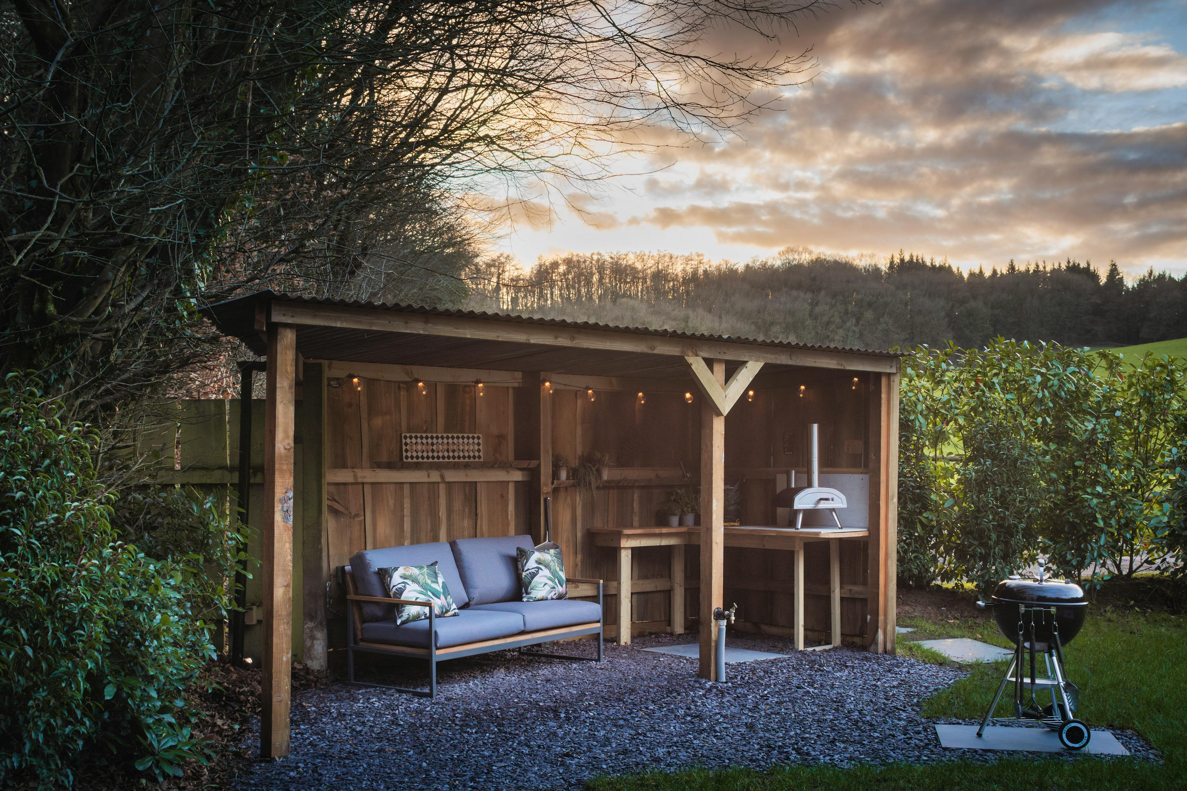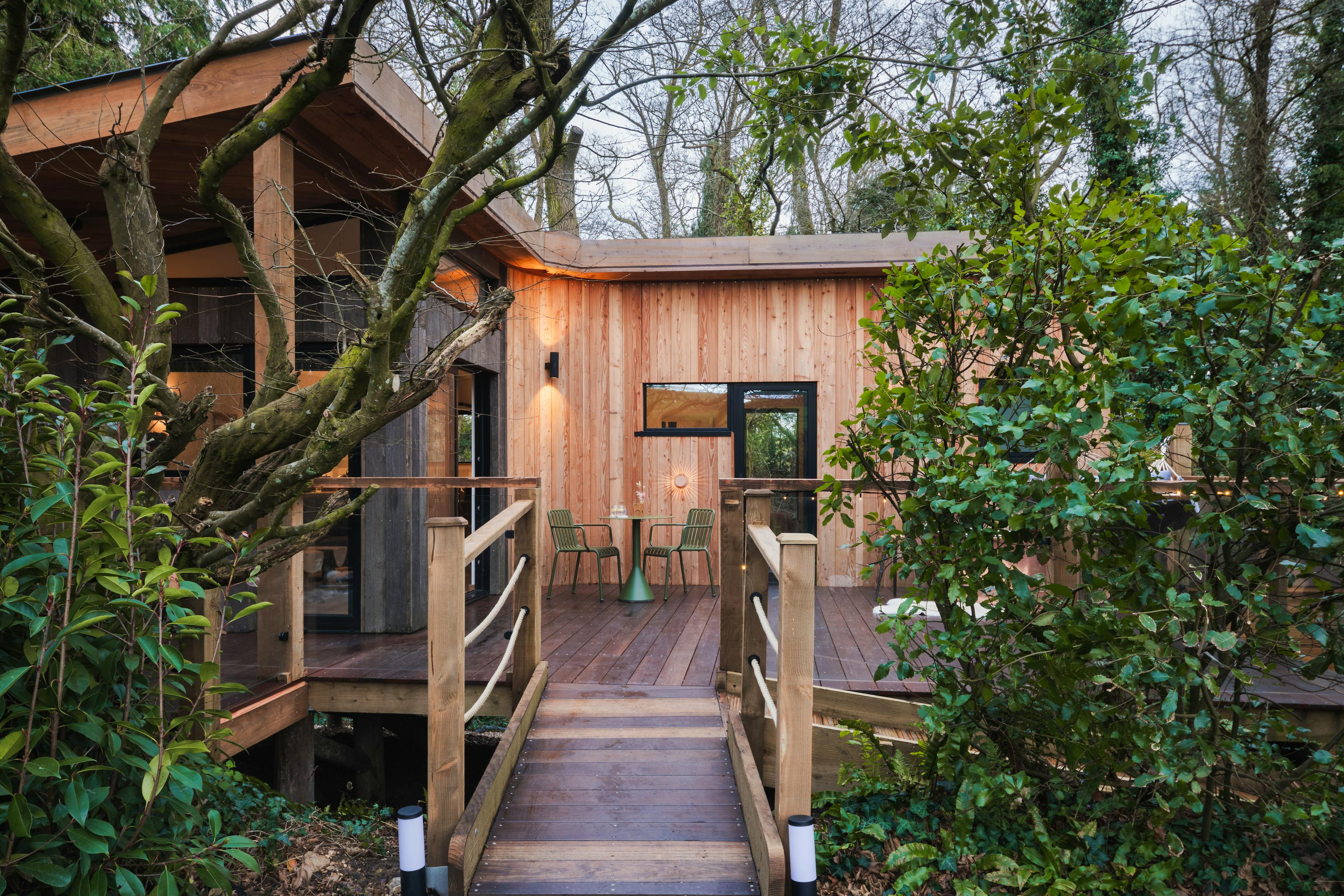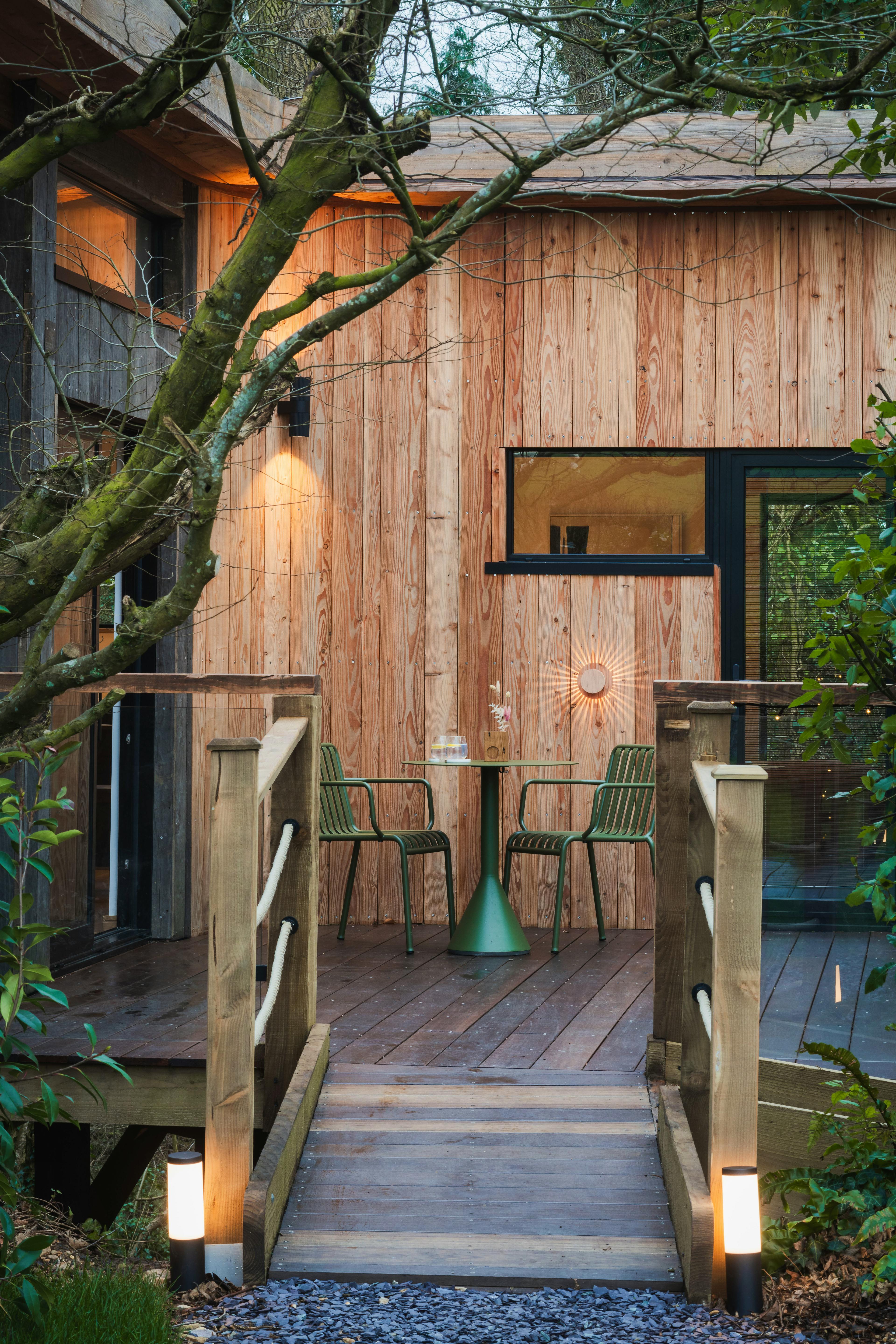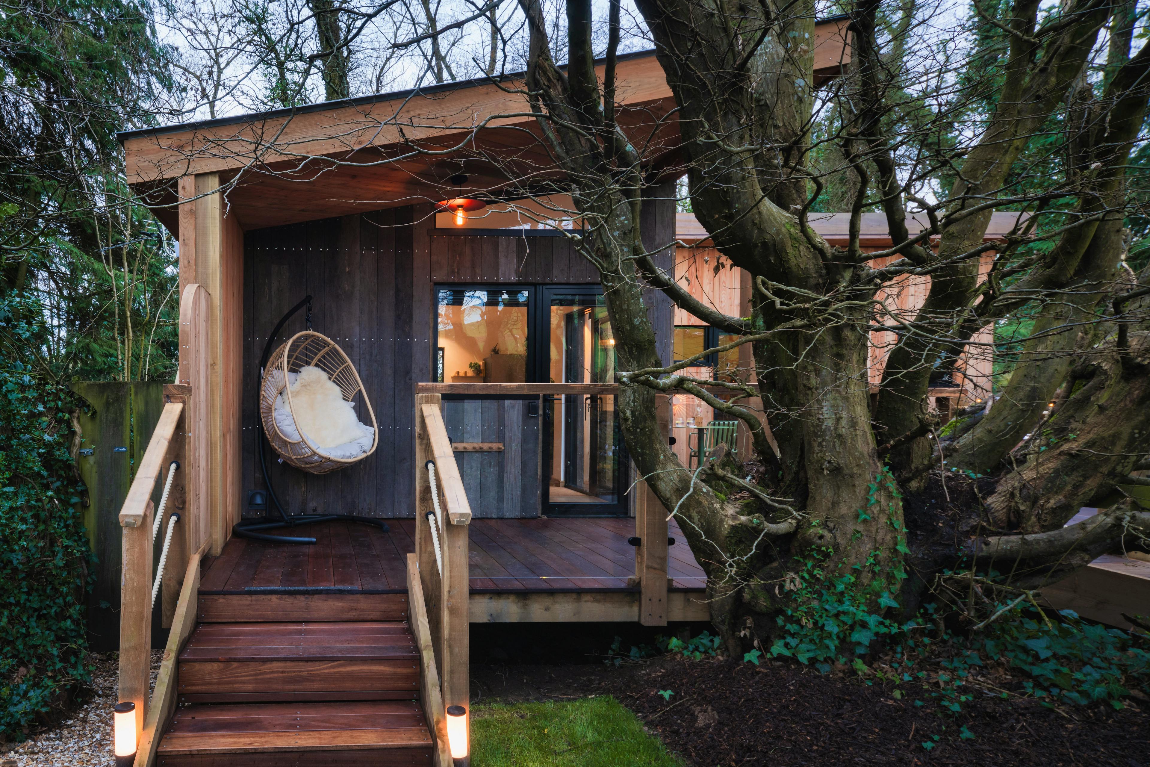 Stylish cabin nestled amongst the trees on a farm in Somerset with its own outdoor spa, perfect for a peaceful romantic escape.