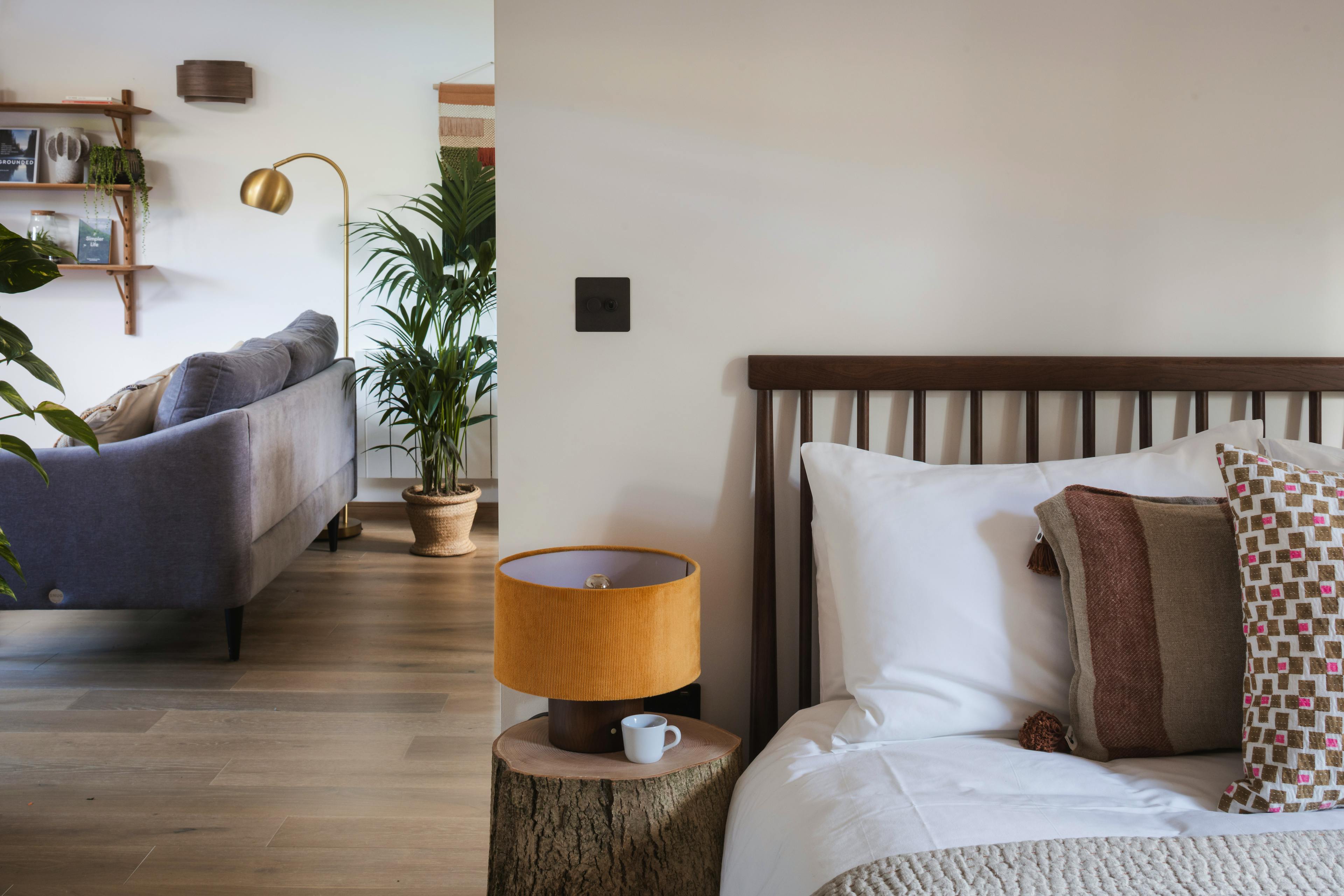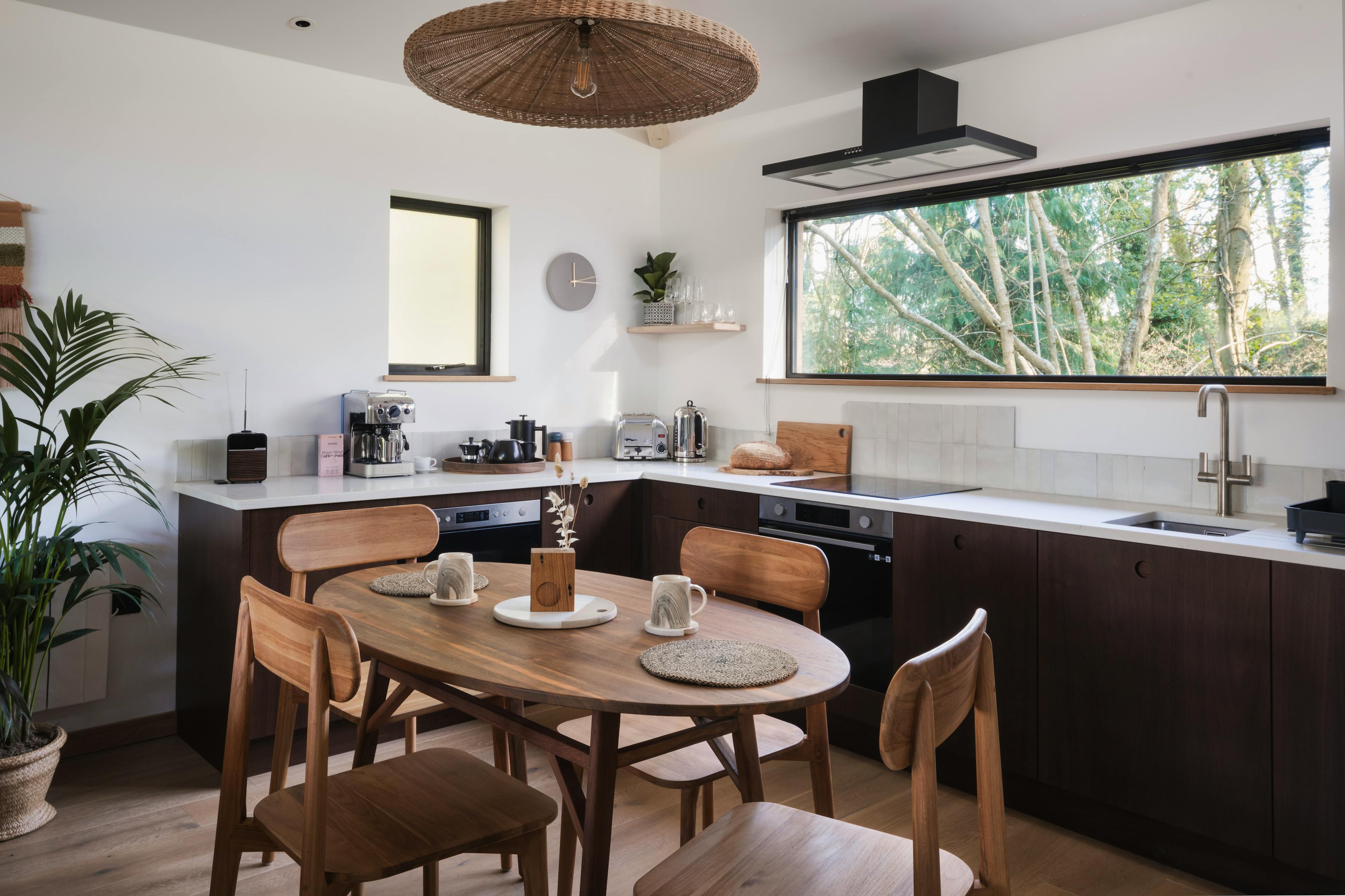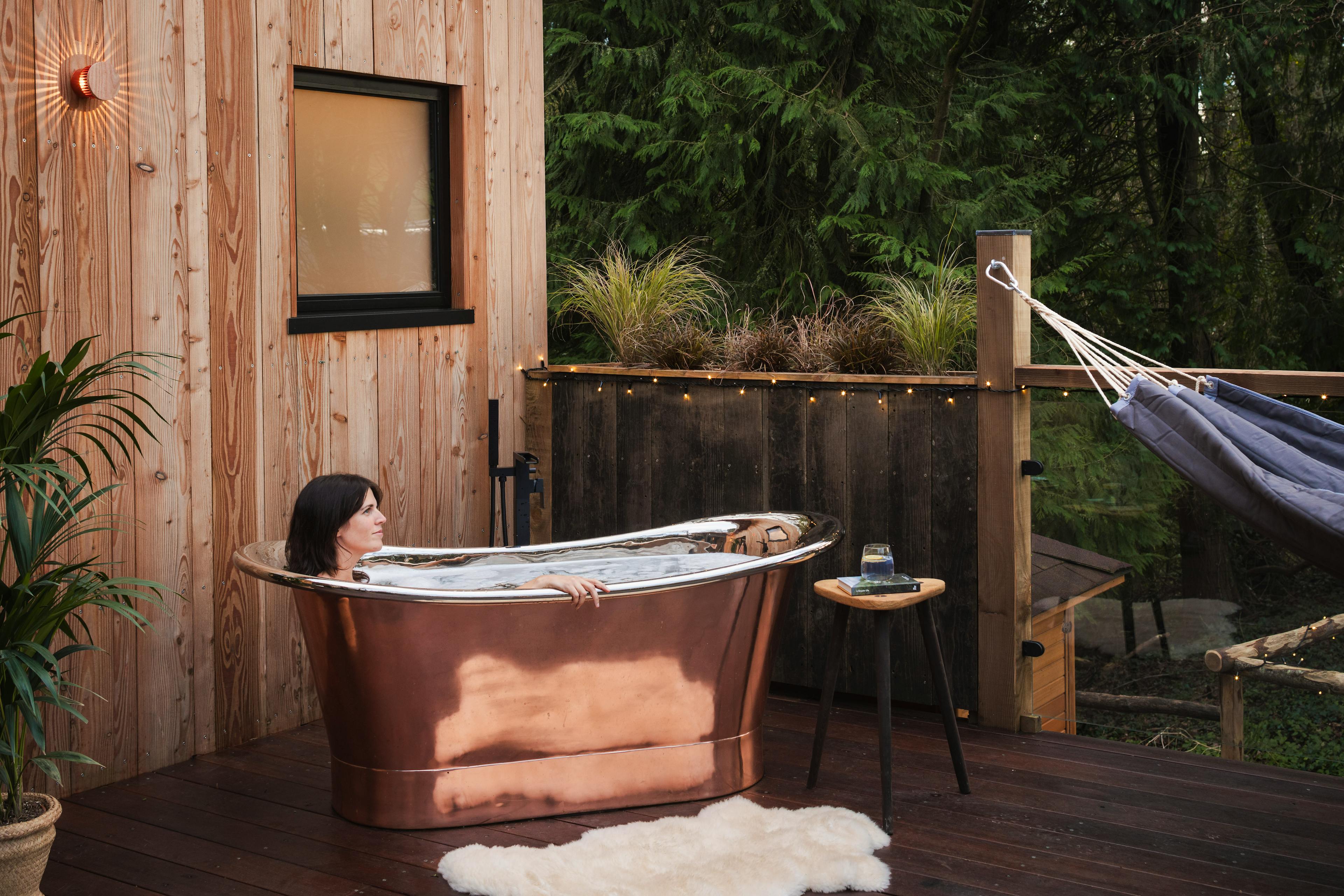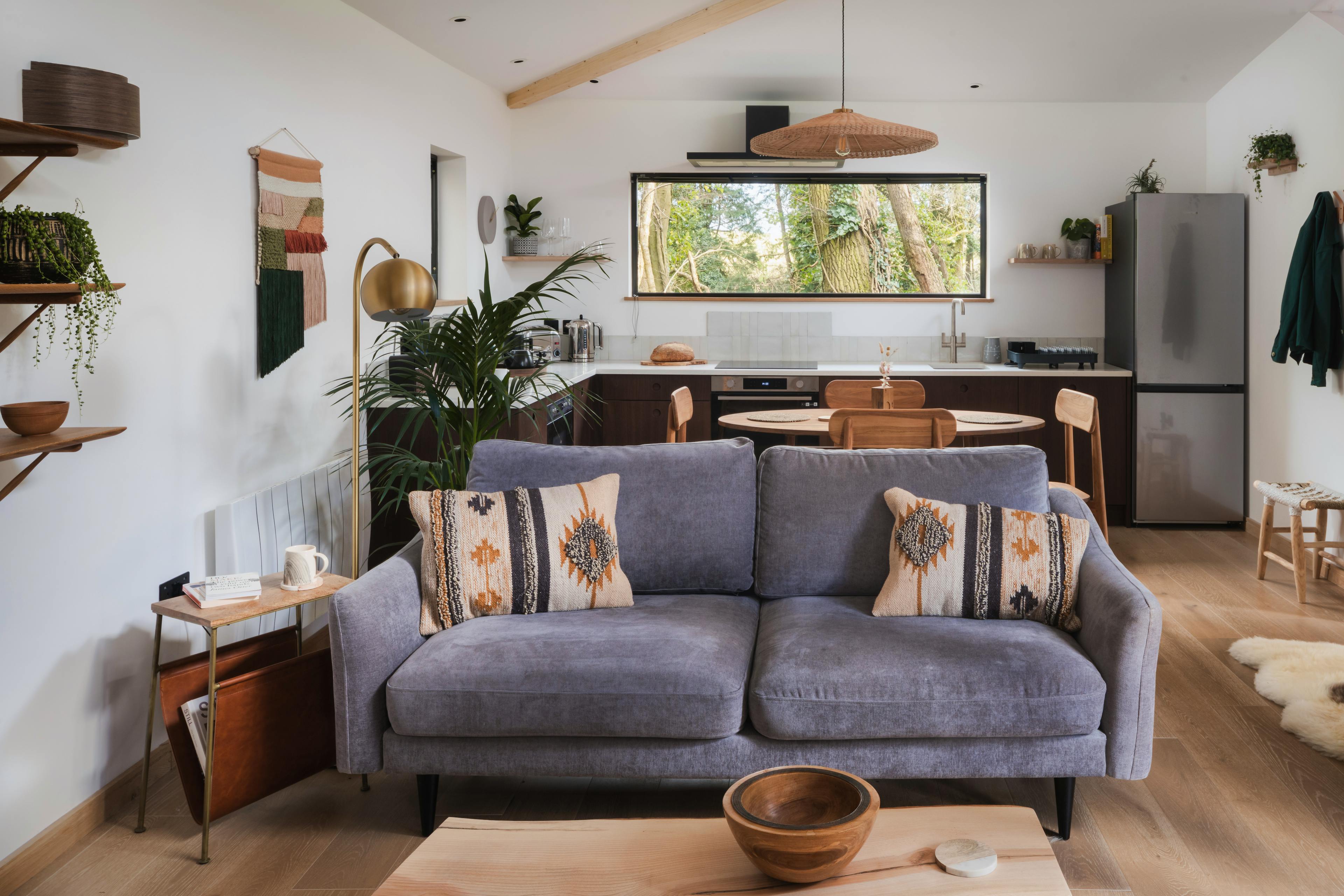 Stylish cabin nestled amongst the trees on a farm in Somerset with its own outdoor spa, perfect for a peaceful romantic escape.