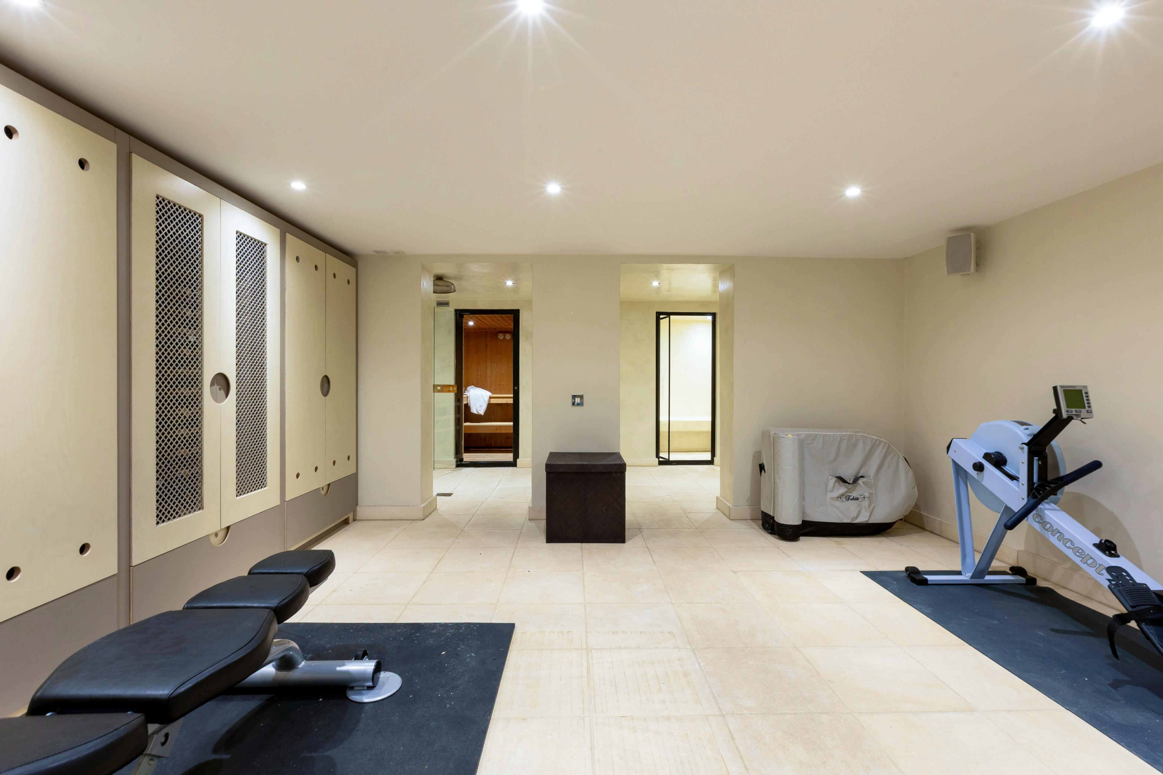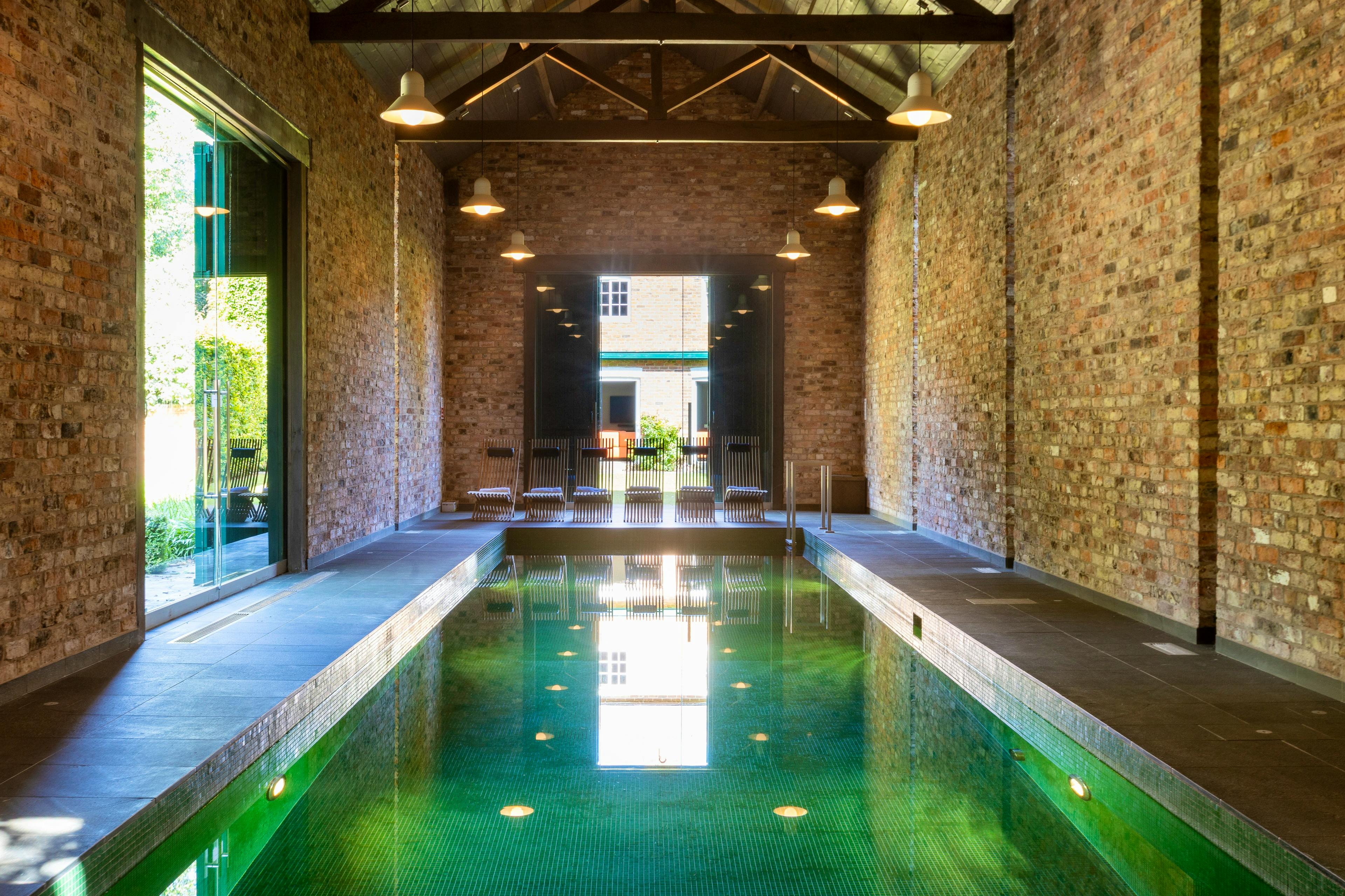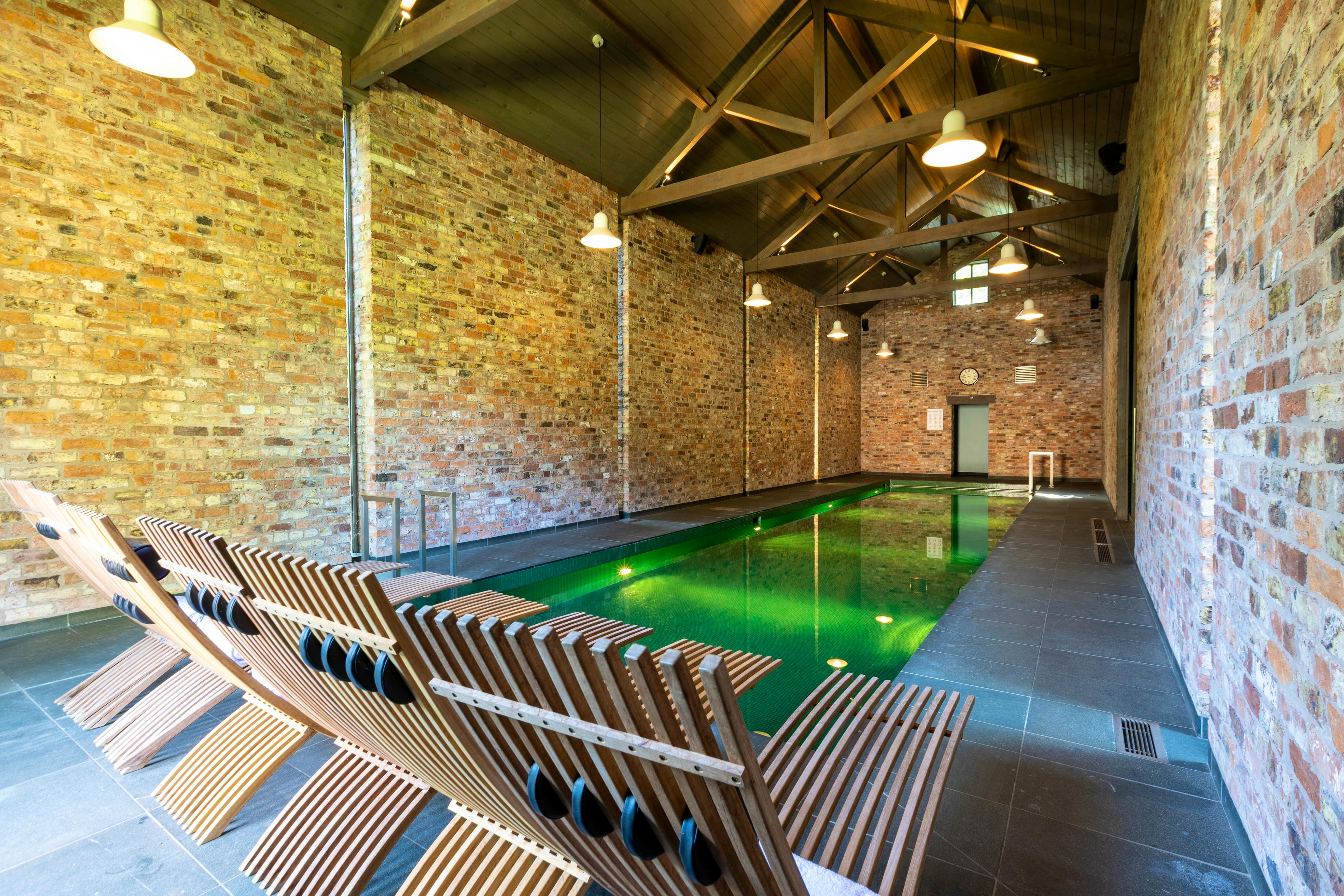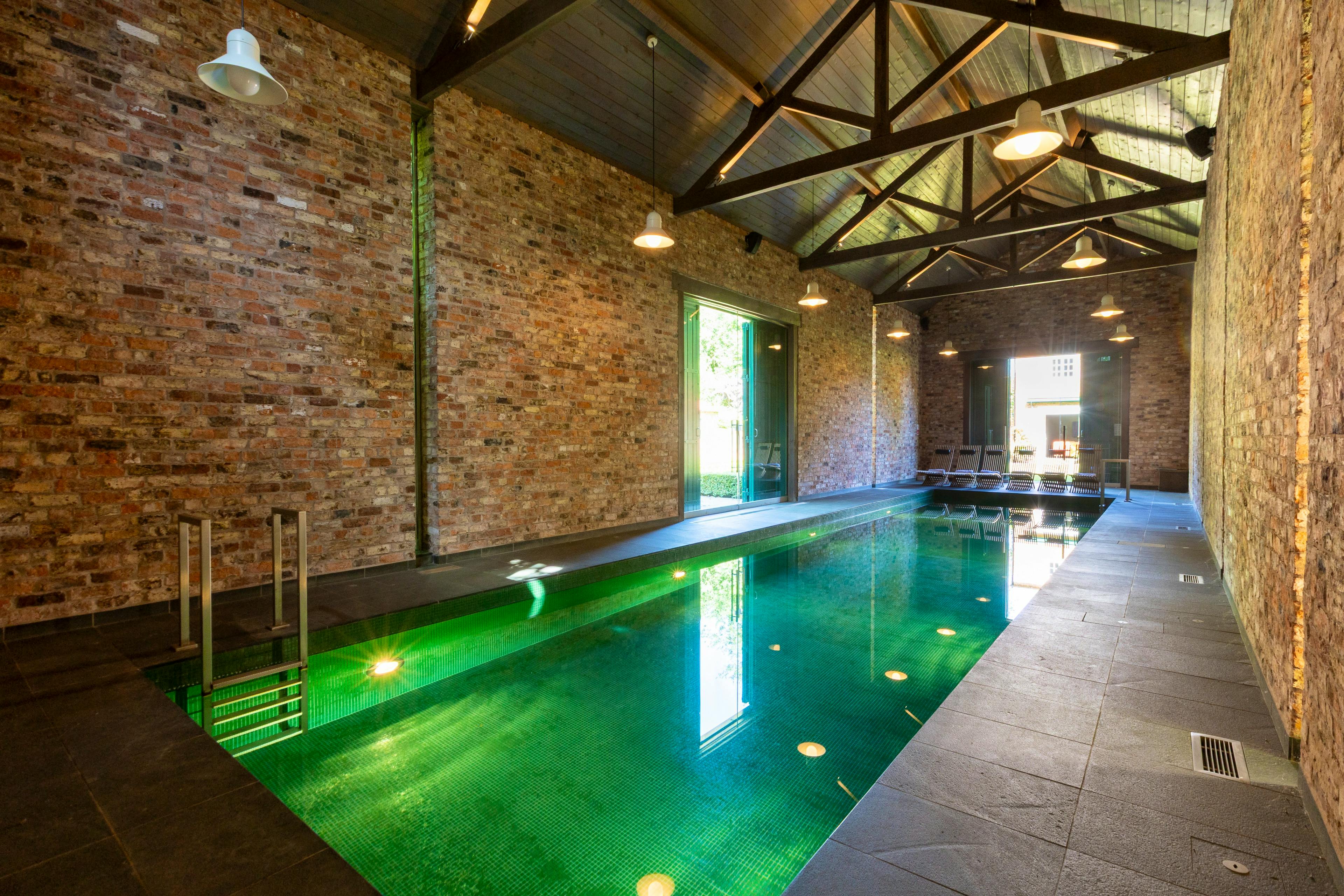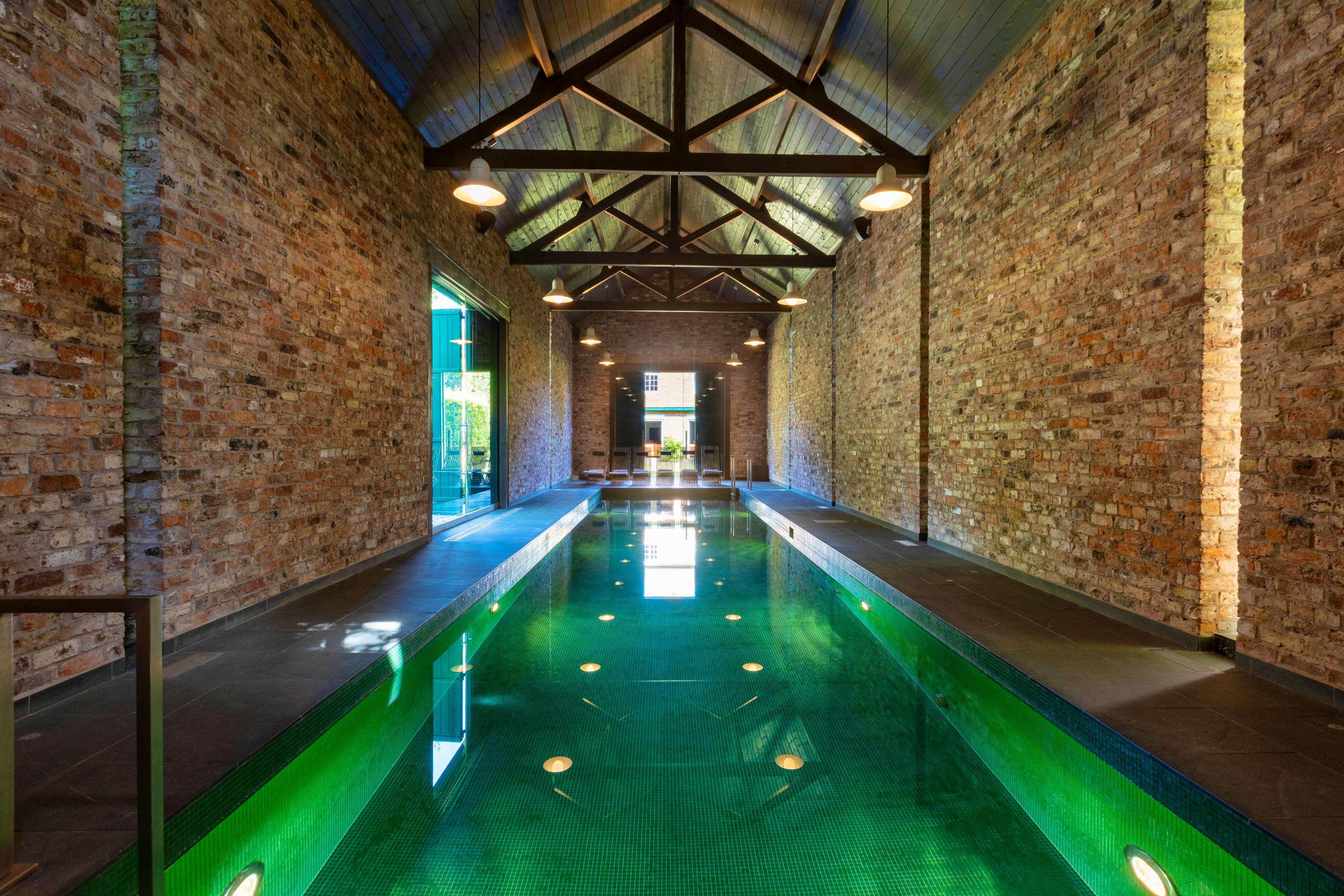 Indoor 15m heated swimming pool and sauna set in a striking pool house with vaulted ceilings and garden views.