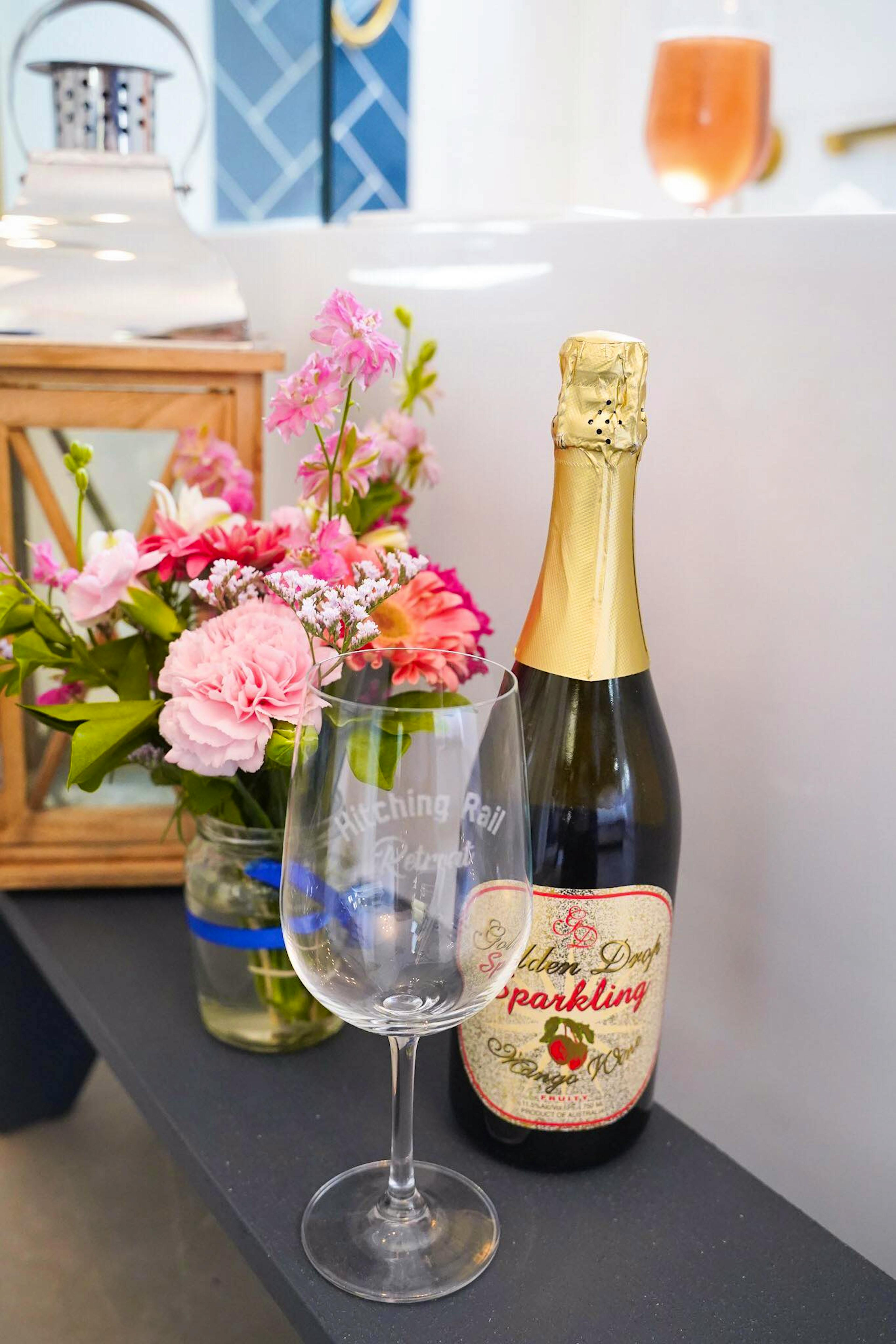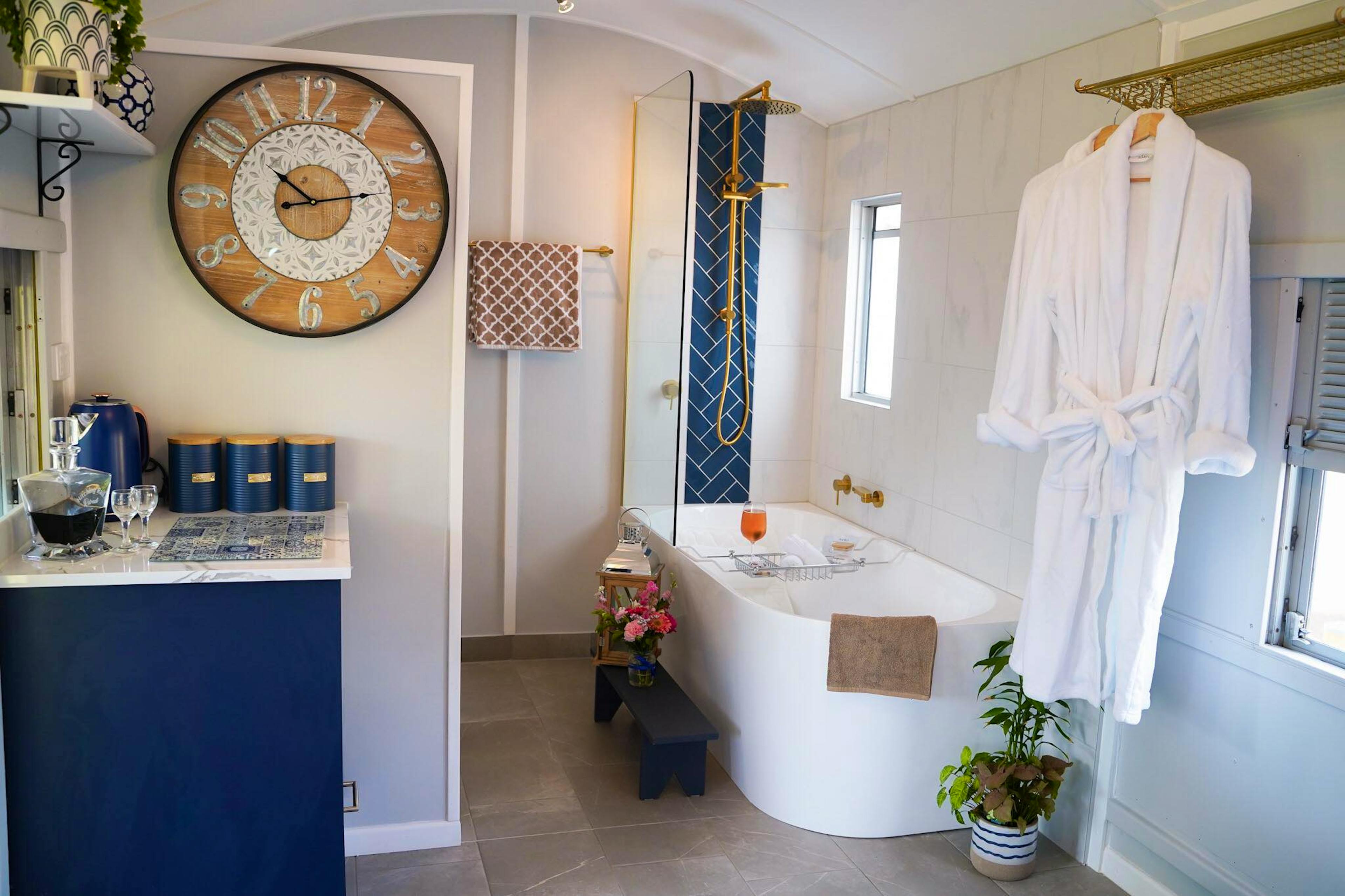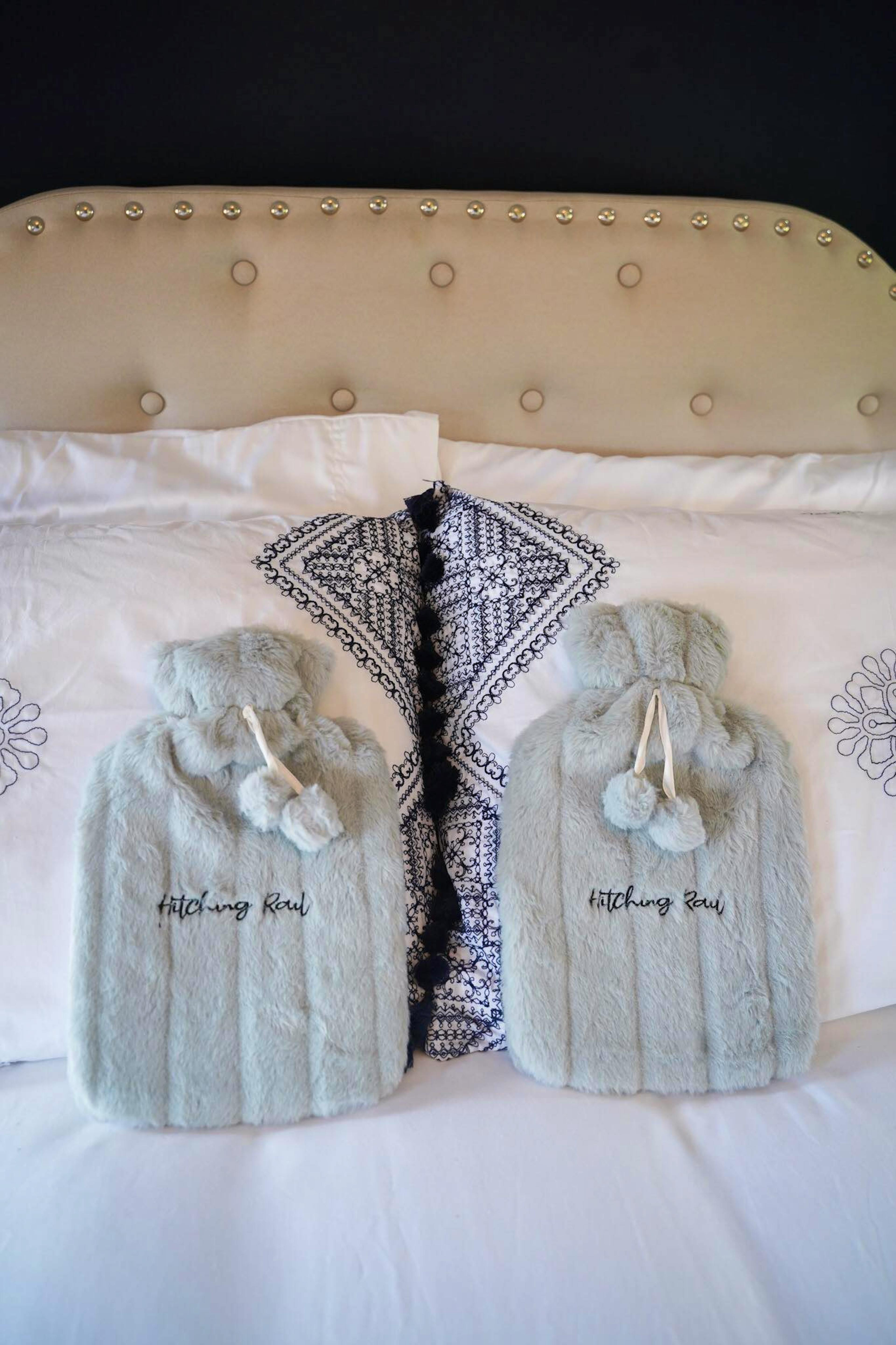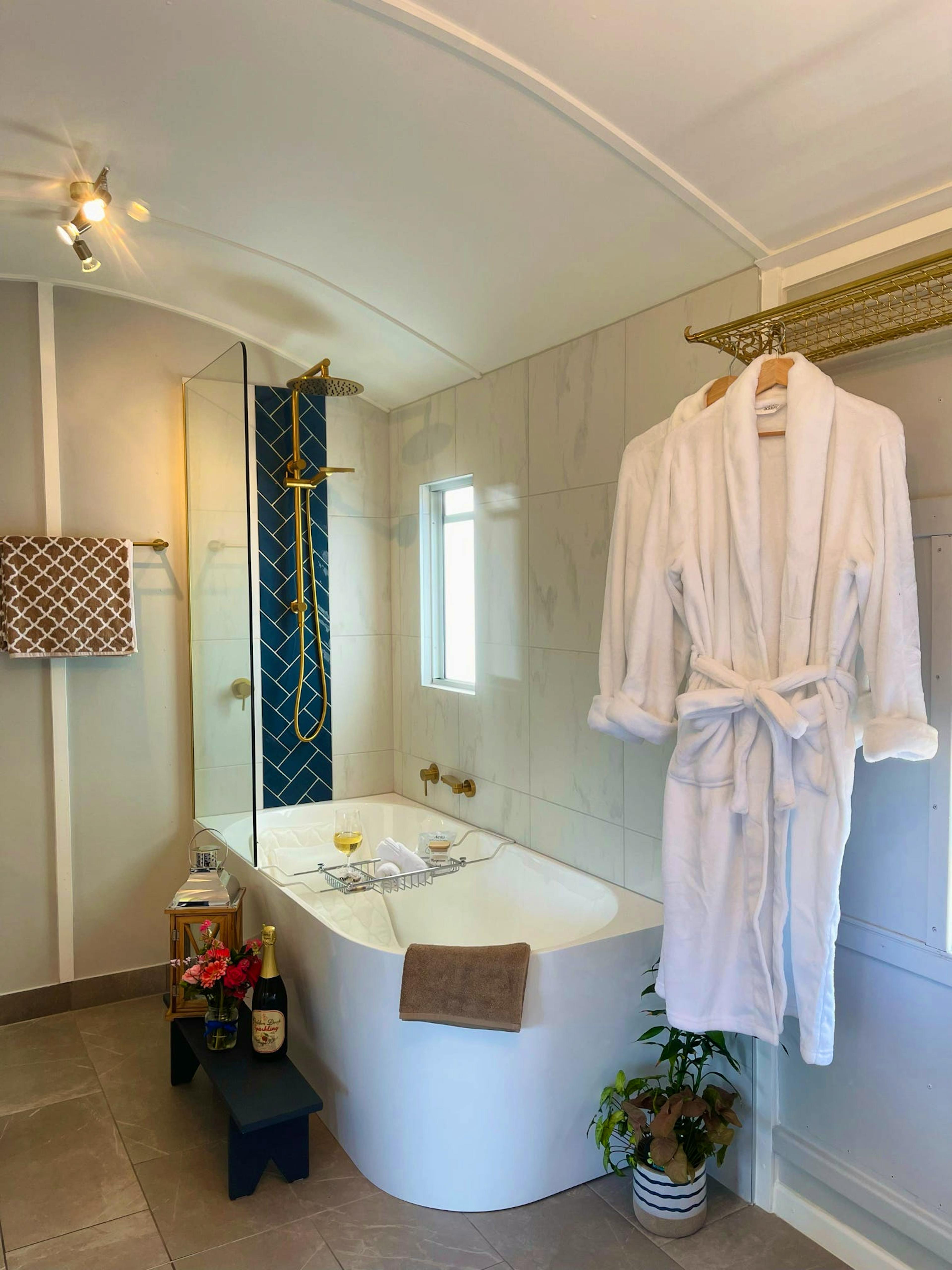 Guests are welcomed with thoughtful extras, including a local cheese platter, a small bottle of wine, engraved wine glasses, a port decanter, magnesium bath soak, hot water bottles, plush bathrobes and natural toiletries.