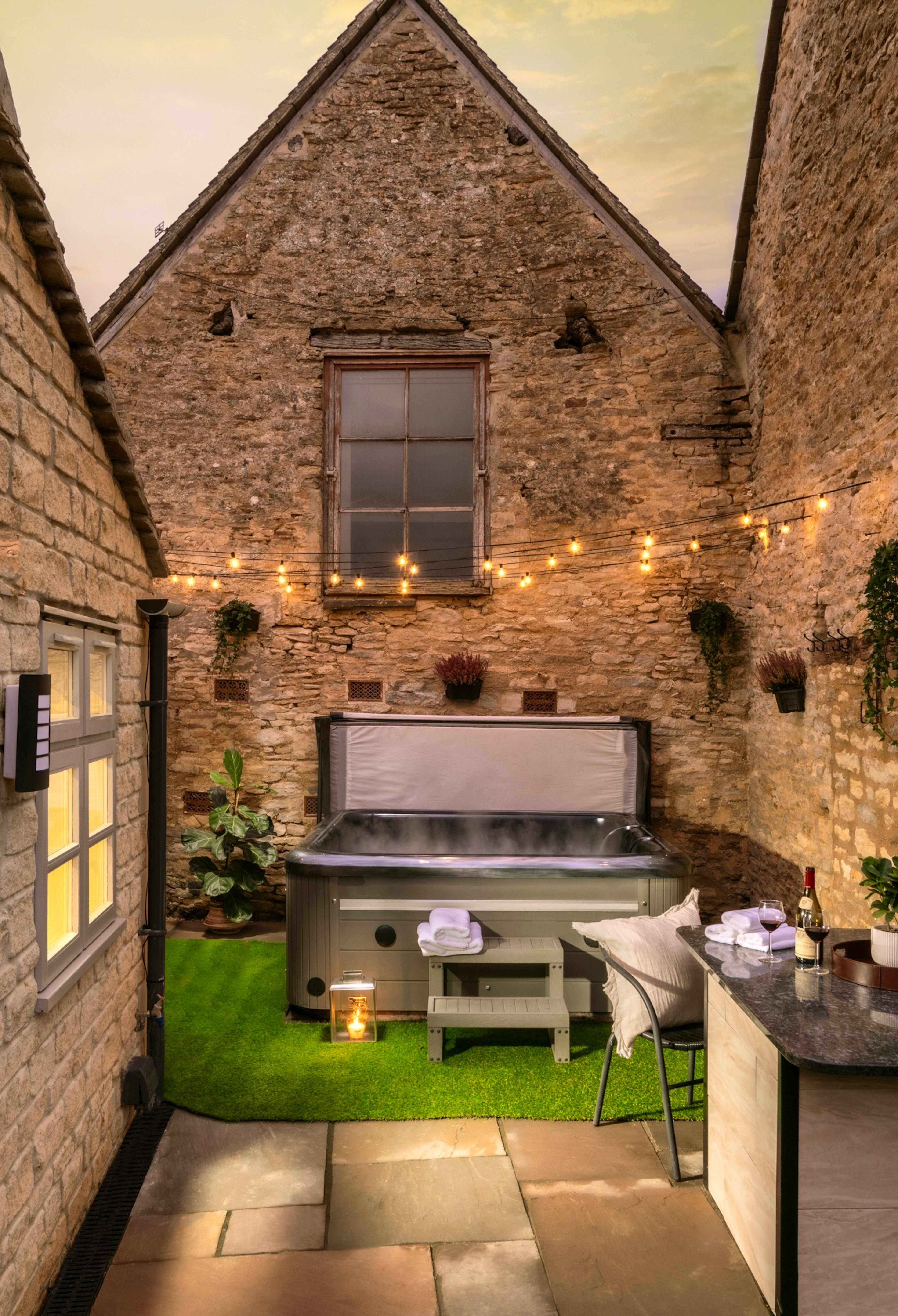 Sink into the bubbling hot tub beneath festoon lights as the garden glows softly around you, creating magical evenings whatever the season.