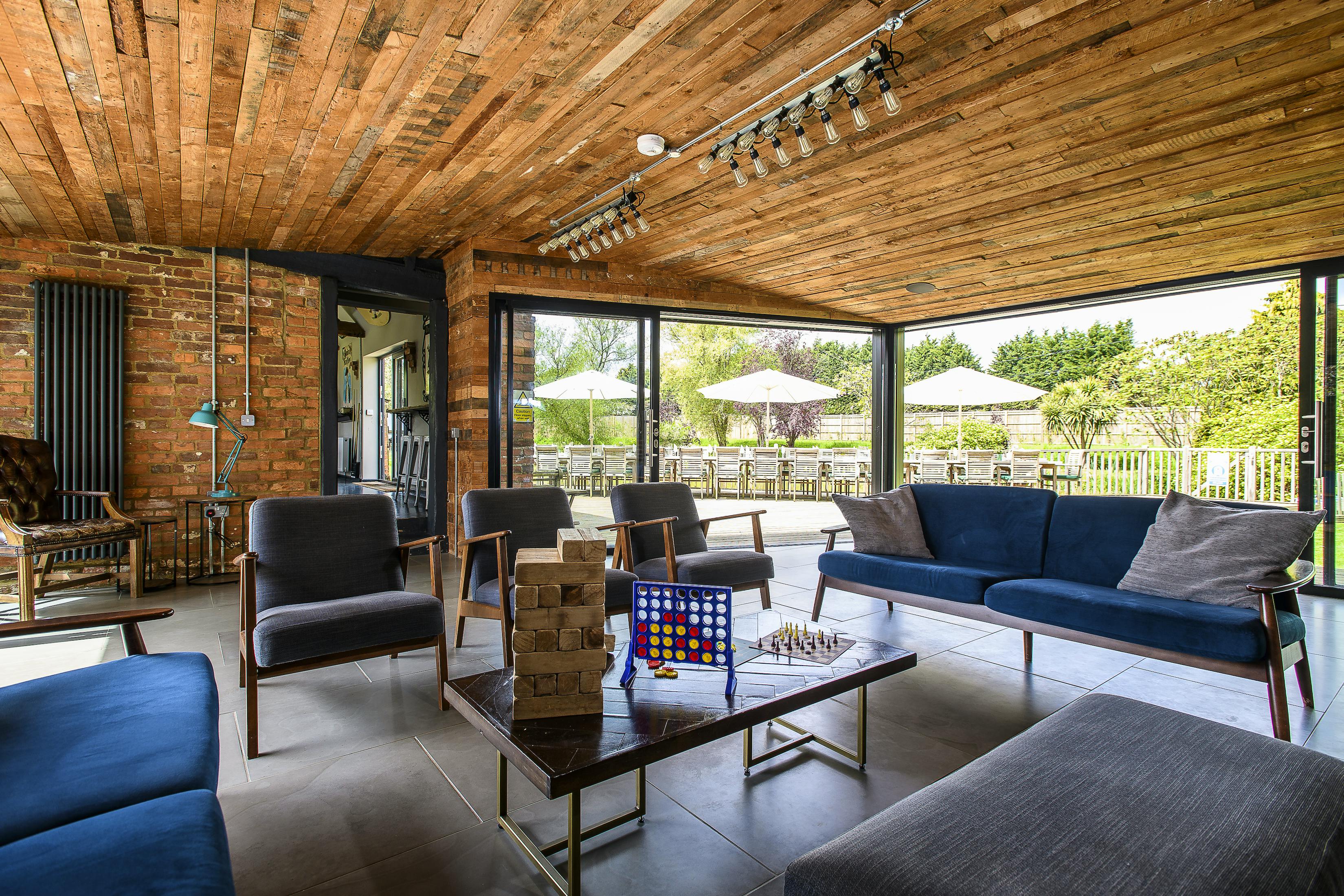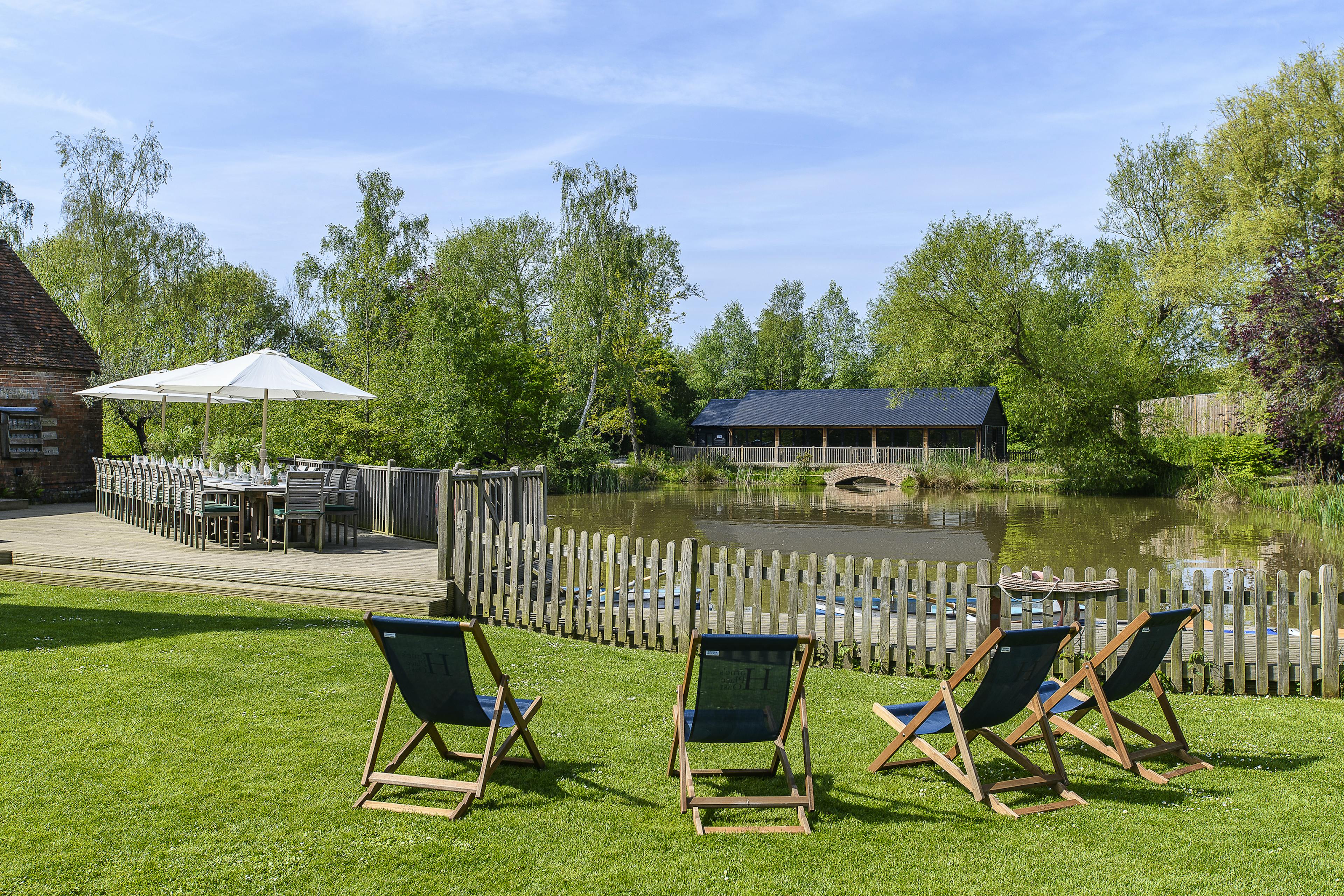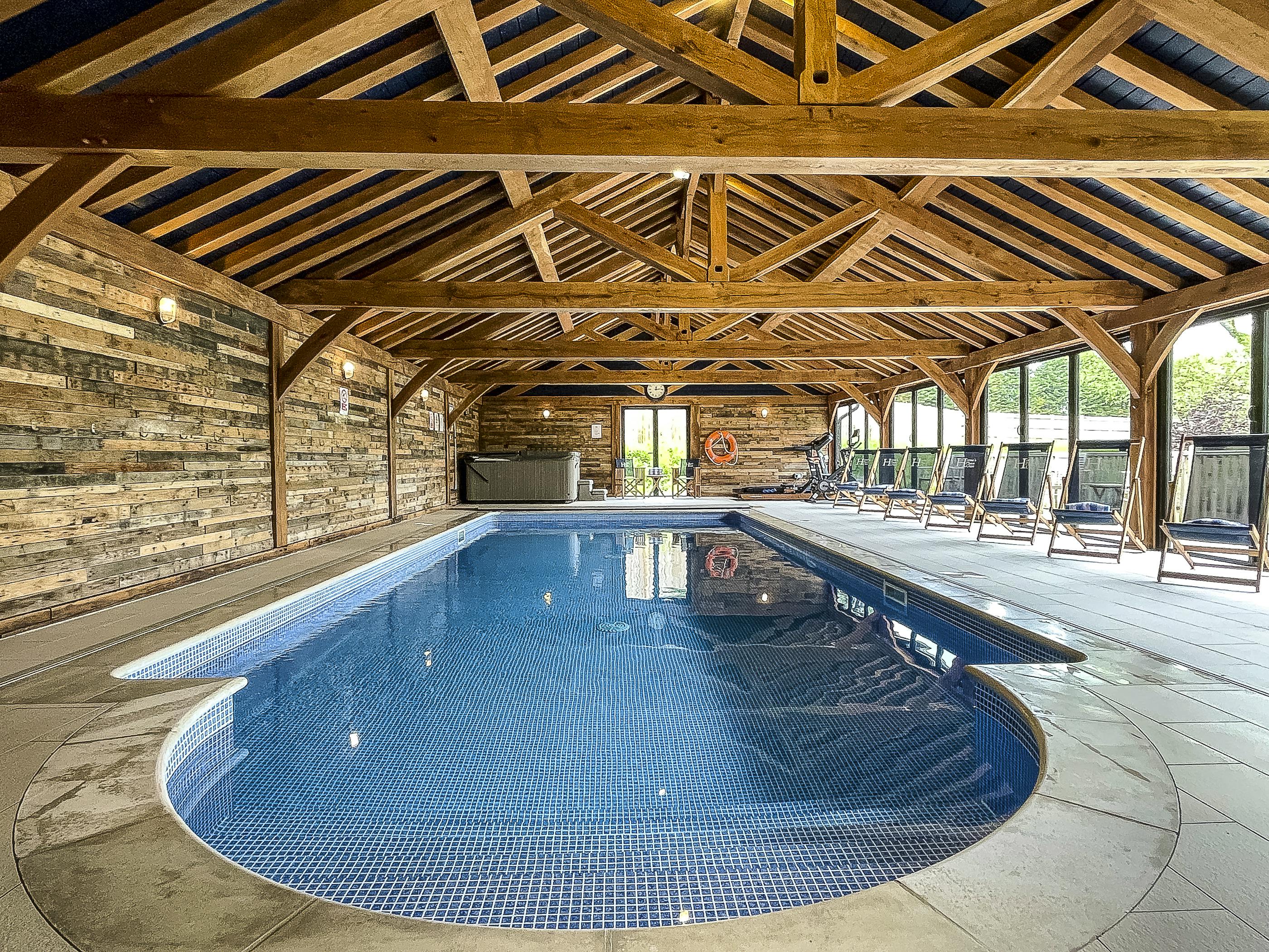 Large, characterful group retreat in Kent with peaceful private pond, indoor heated pool, hot tub, games room and abundant social space.