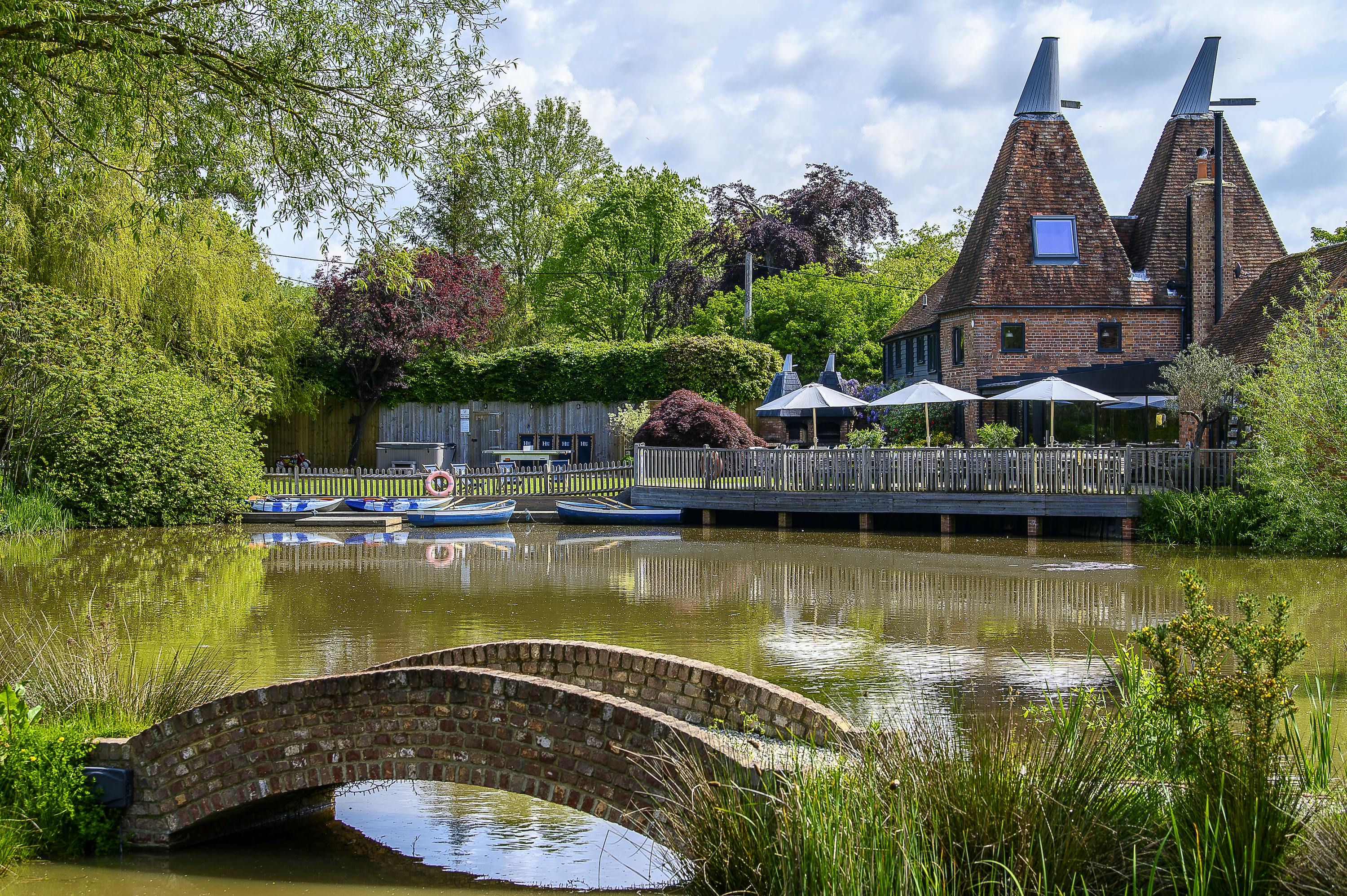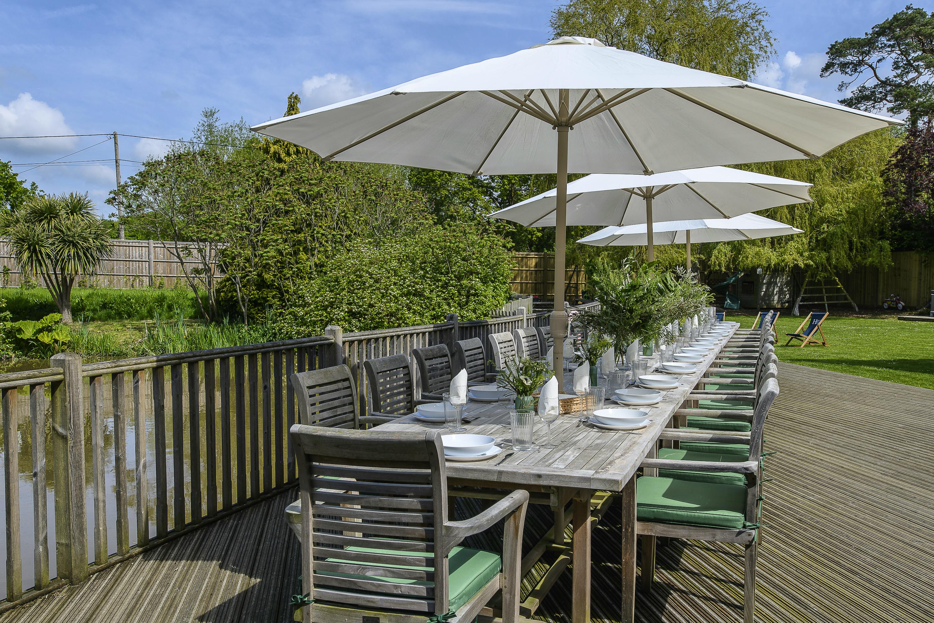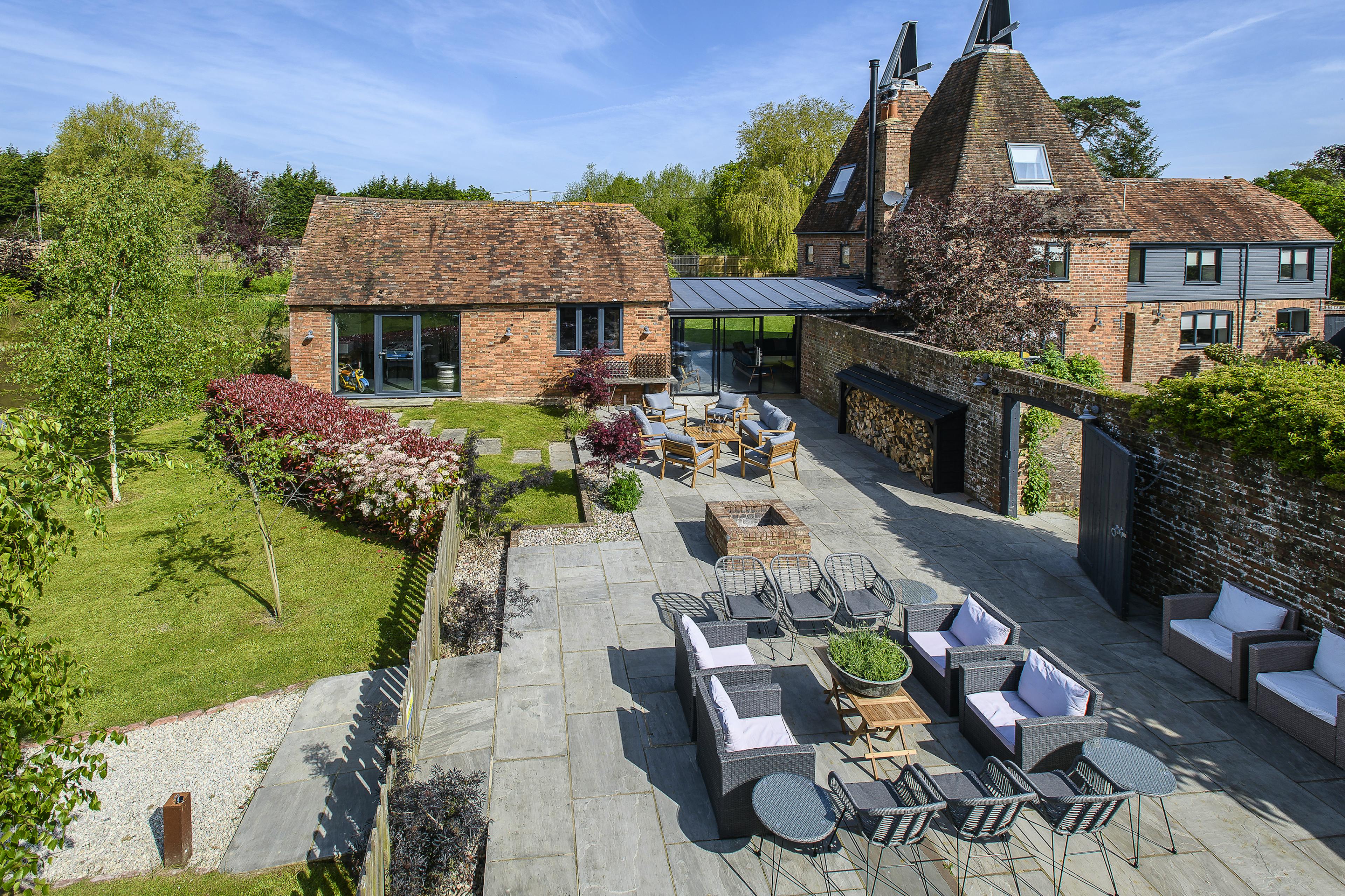 Large, characterful group retreat in Kent with peaceful private pond, indoor heated pool, hot tub, games room and abundant social space.