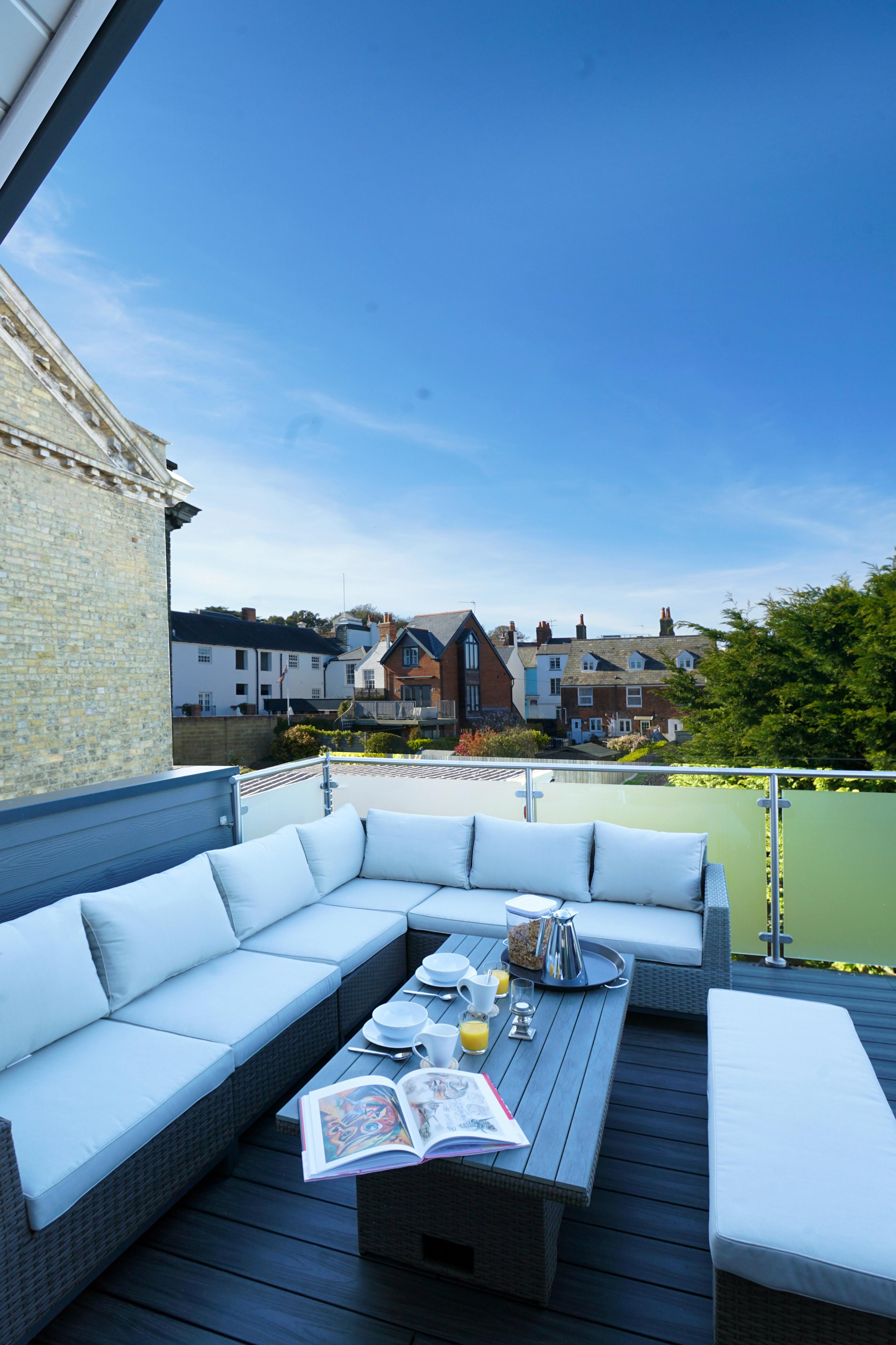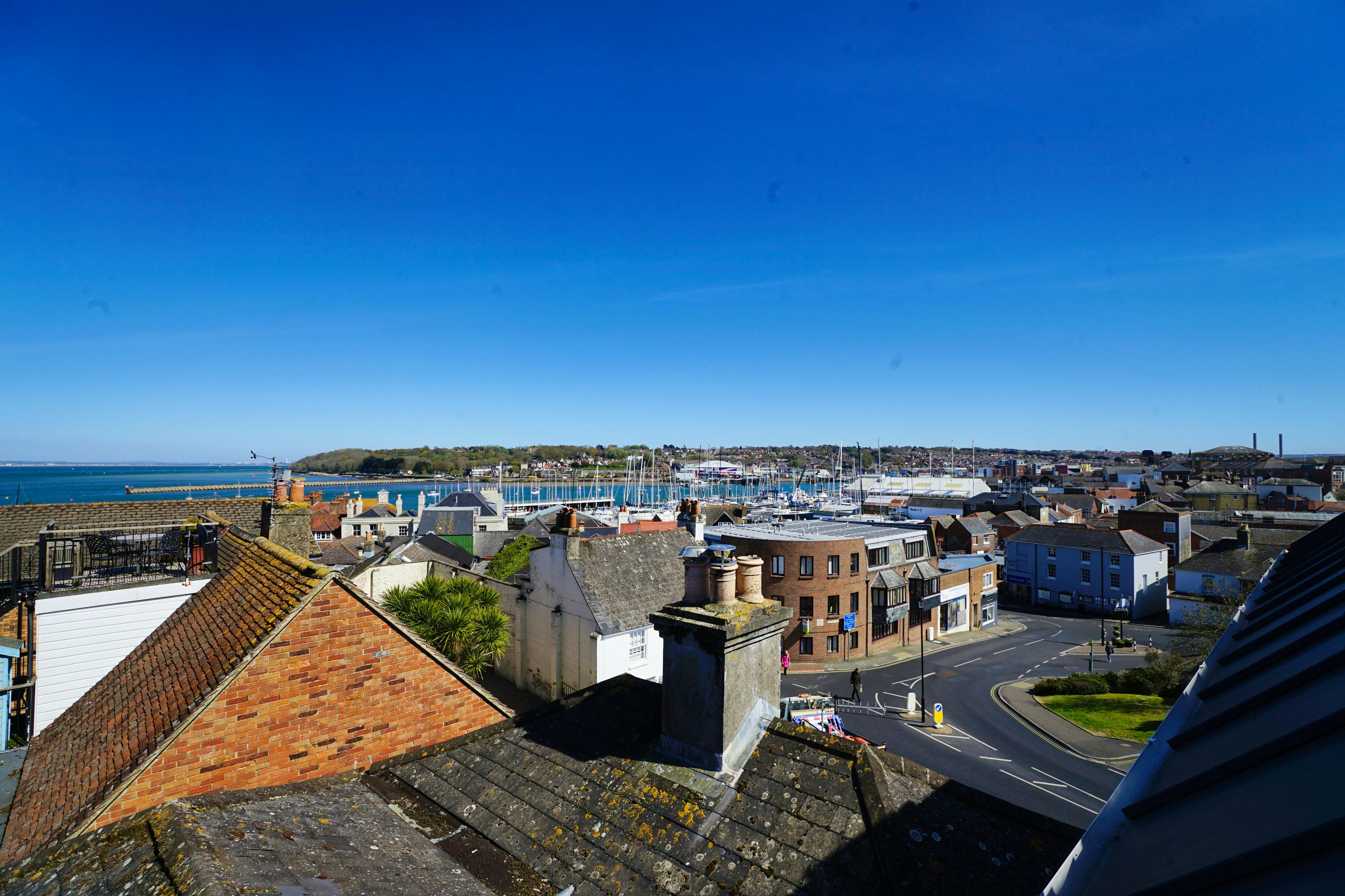 Spacious coastal townhouse in central Cowes with roof terrace, harbour views and room for 12.