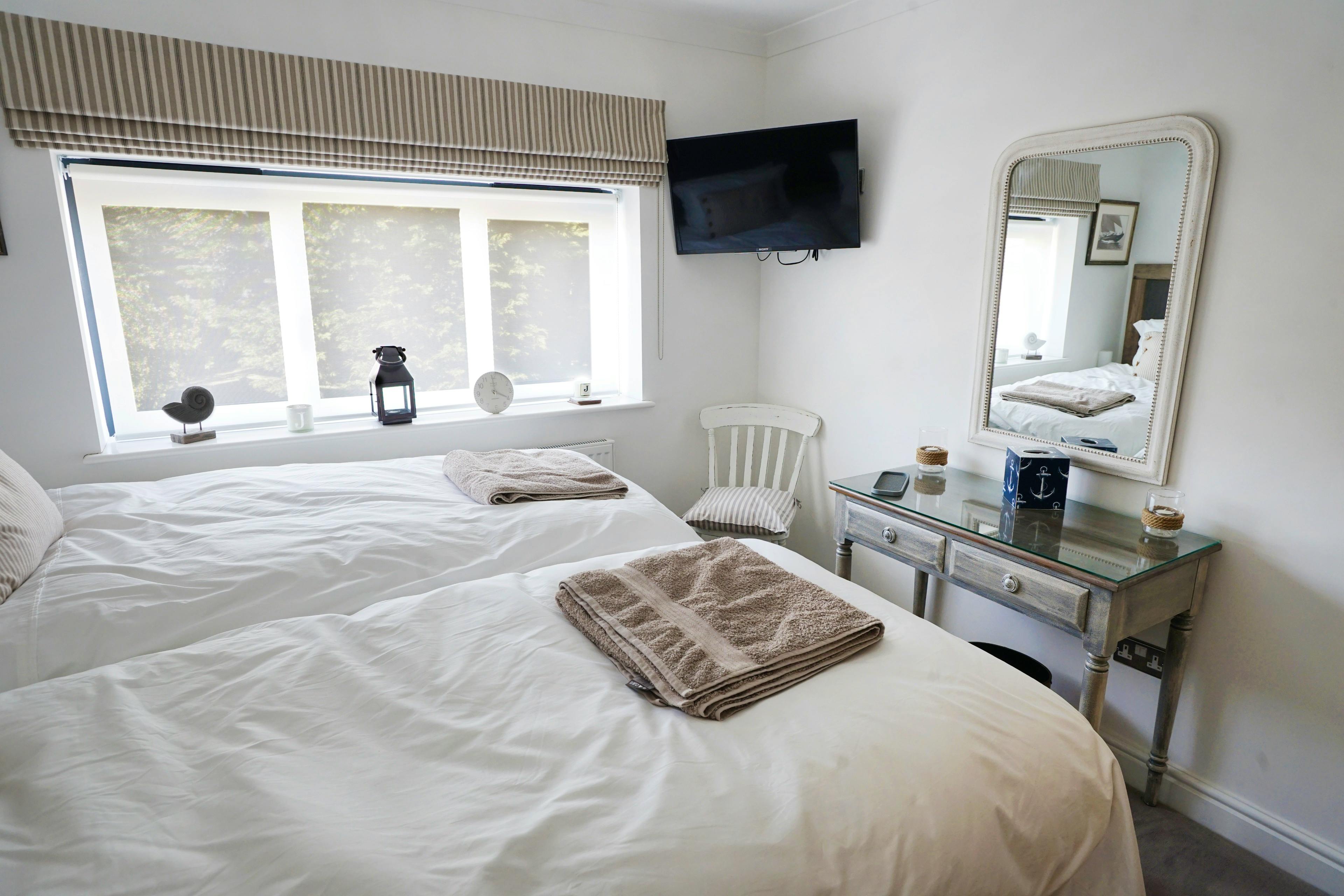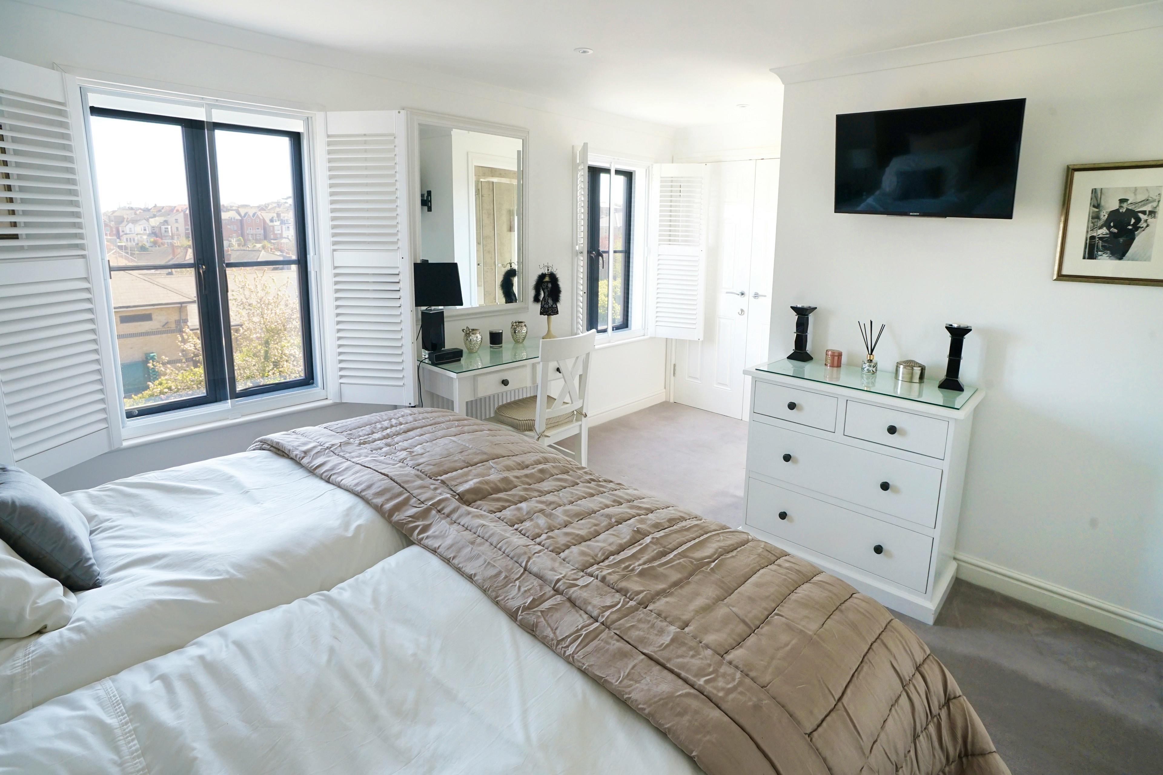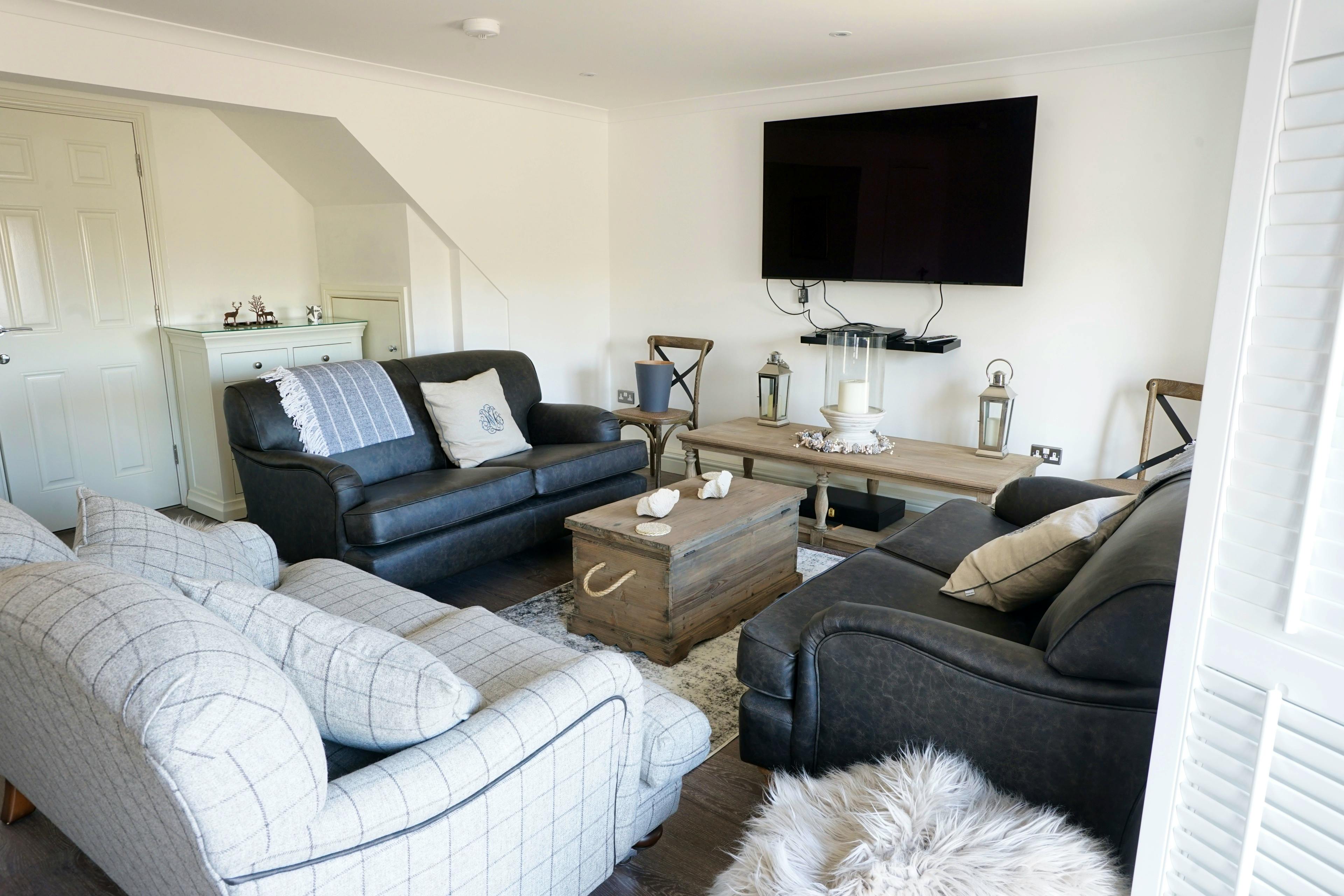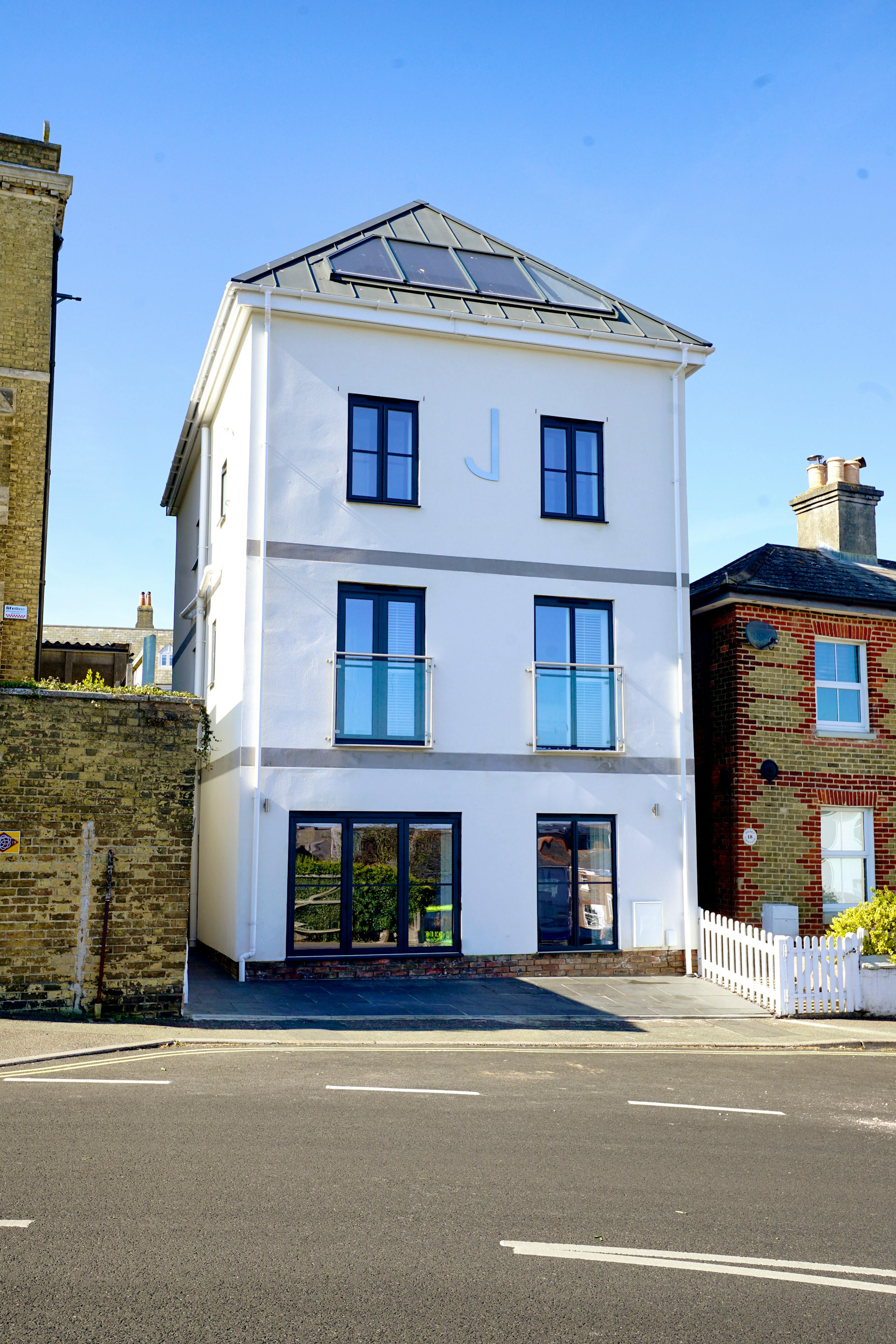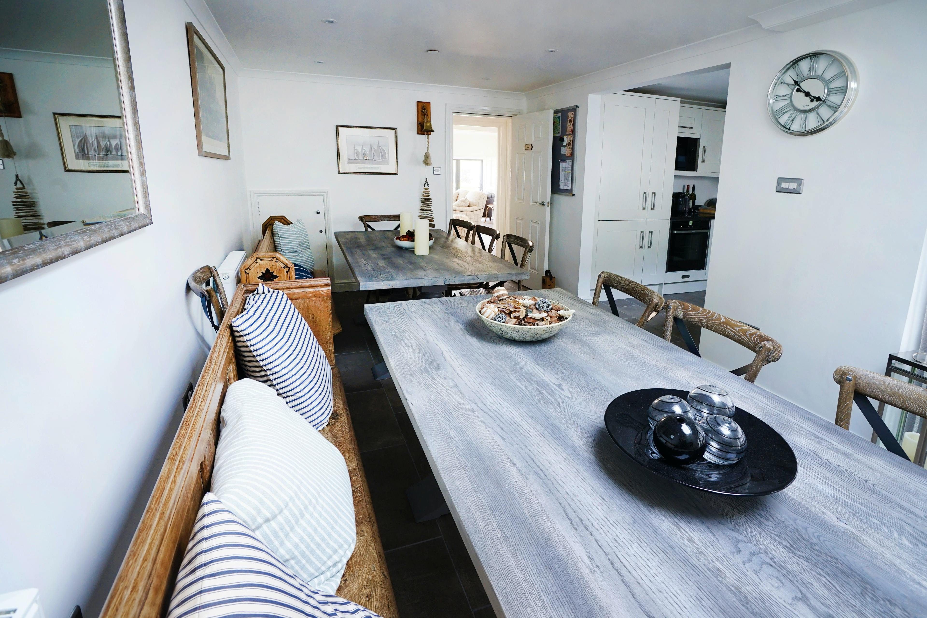 Just moments from the moorings of Cowes Harbour and tucked between historic cottages and a handsome 18th-century church, The J House offers a stylish and wonderfully versatile base for groups of up to 12. Spread across four bright floors, it’s a generous, thoughtfully renovated home that blends nautical charm with modern comfort. With a sunlit roof terrace overlooking the Solent, a private courtyard and adaptable bedrooms designed for families, friends and sailing crews, it’s made for easy island living in the heart of Cowes. Step through the door and you’ll find a warm and welcoming space filled with coastal touches and subtle nods to the town’s sailing heritage. The ground floor is designed for group gatherings, with a well-equipped kitchen featuring two ovens and plenty of space for shared meal prep. The dining area seats 12 comfortably, making big breakfasts, seafood suppers or celebratory evenings feel wonderfully effortless. A door leads out to a secluded courtyard with outdoor seating and a refreshing shower that's perfect after days on the water or sandy afternoons on the beach. Also downstairs, the restful living room offers plump sofas, sailing prints and a Smart TV for unwinding after a busy day. The first and second floors give way to six calming bedrooms, each named after a classic J Class yacht. Two ensuite masters offer added privacy, while the four zip-and-link doubles and two bunk rooms make sleeping arrangements incredibly flexible, ideal for yacht crews, multi-generational families or mixed groups. Light pours in through large windows and the décor is gentle and uncluttered, giving the whole house an easy, breezy feel. Climb to the top floor and the mood lifts again as you enter a sun-soaked lounge with panoramic views across Cowes Marina. From here, step directly onto the roof terrace where the rooftops fall away and glimpses of the Solent stretch out in the distance. It’s a magnificent spot for morning coffee, sunset drinks or simply watching the movement of masts and rigging as the harbour comes to life. Outside your door lies everything that makes Cowes so special. Along the High Street and Shooters Hill you’ll find independent boutiques, long-standing chandlers and a fast-growing dining scene. Wander the colourful lanes around Sun Hill, embark on the coastal walk to Gurnard or hop aboard the Red Jet to Southampton just minutes away. With yacht clubs, beaches, waterfront bars and centuries of maritime heritage all within strolling distance, The J House places you at the very heart of this iconic sailing town.
