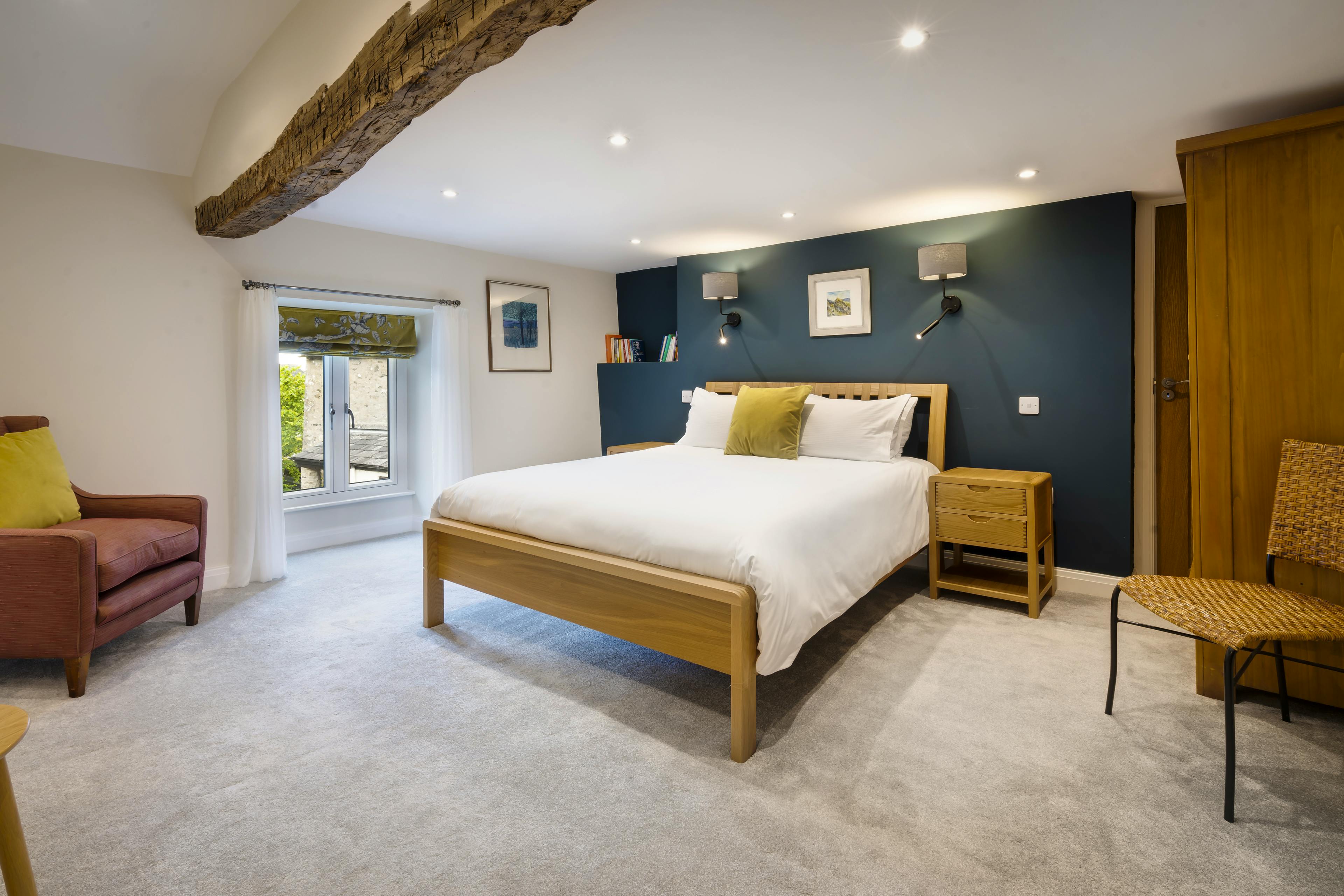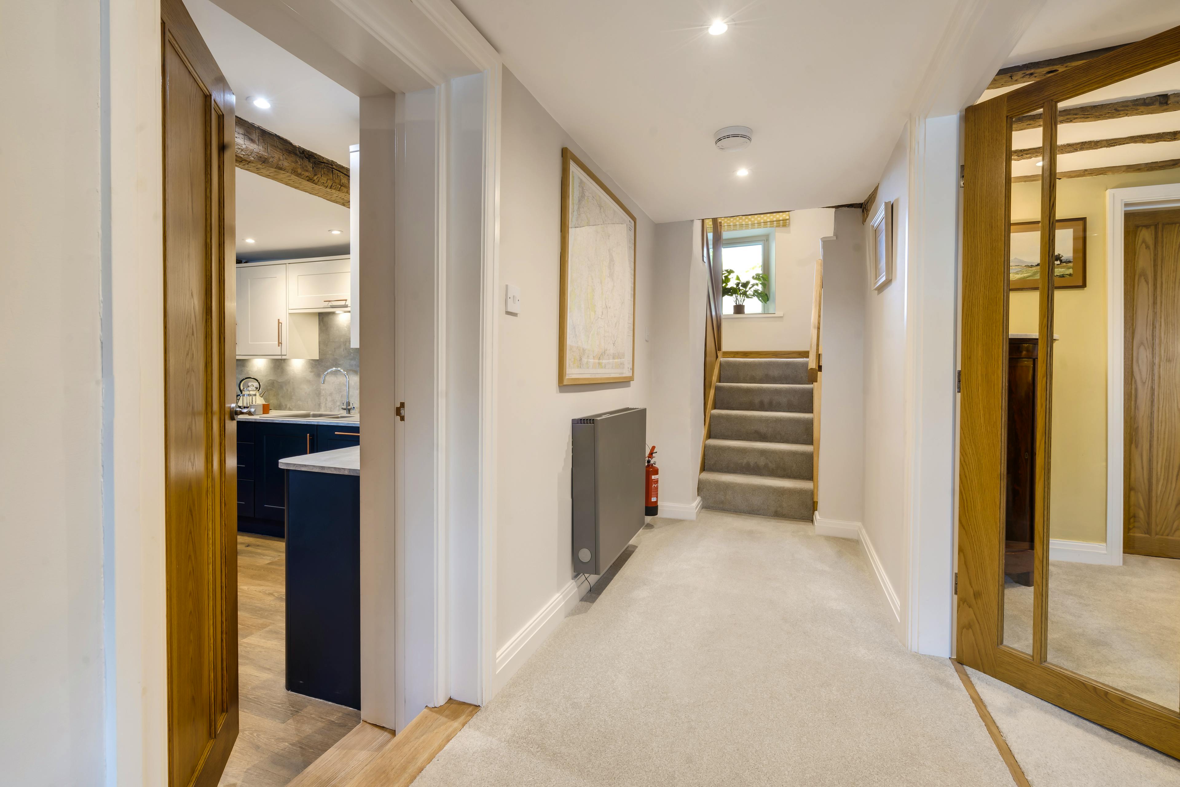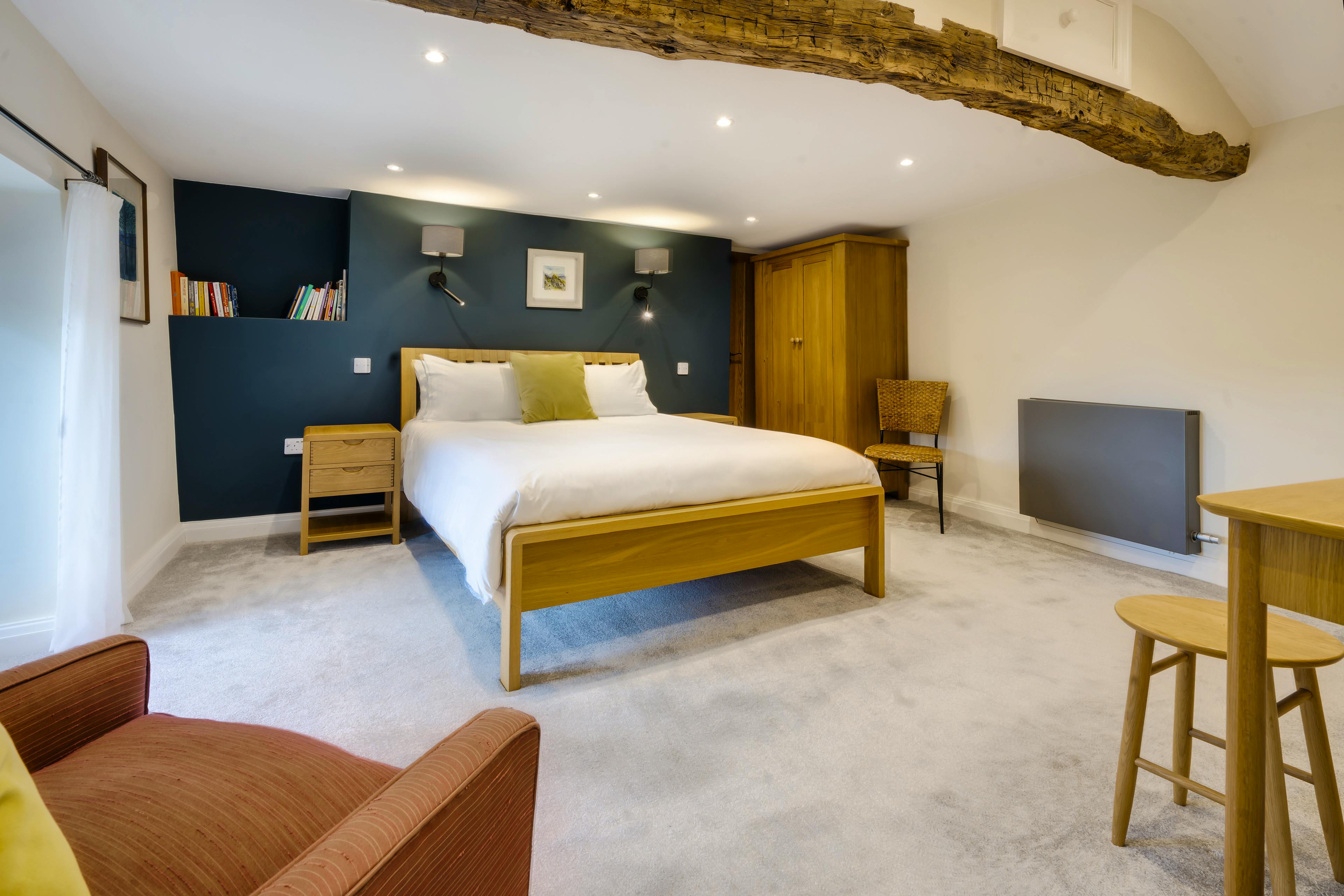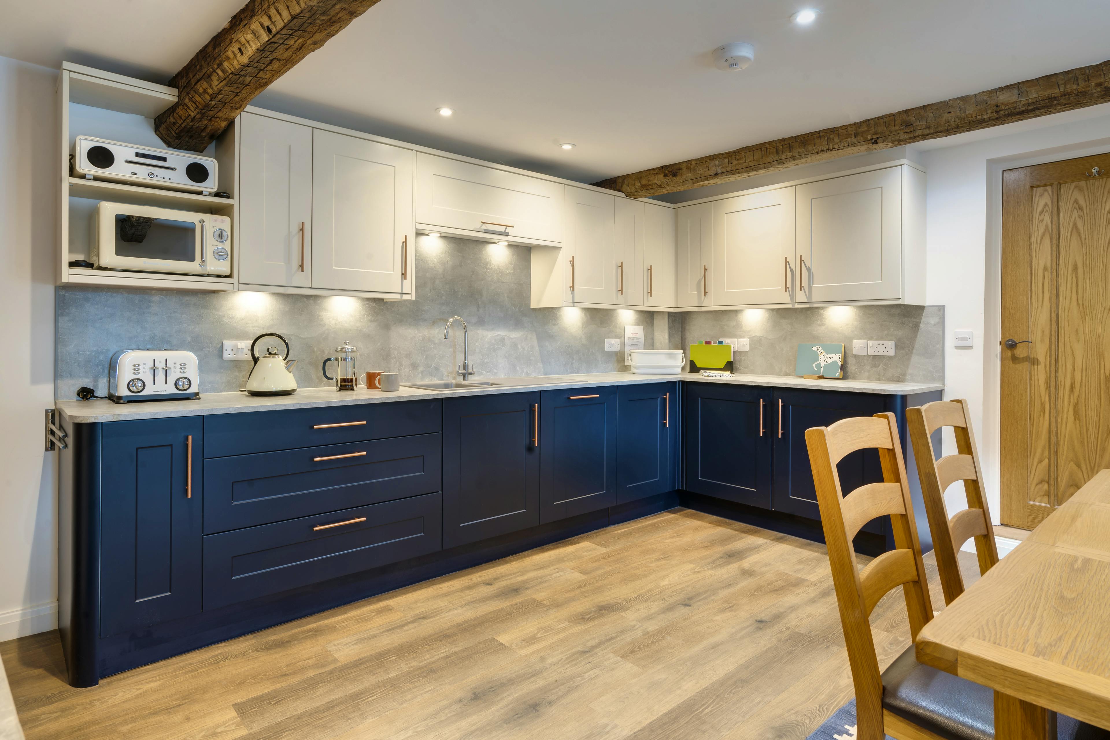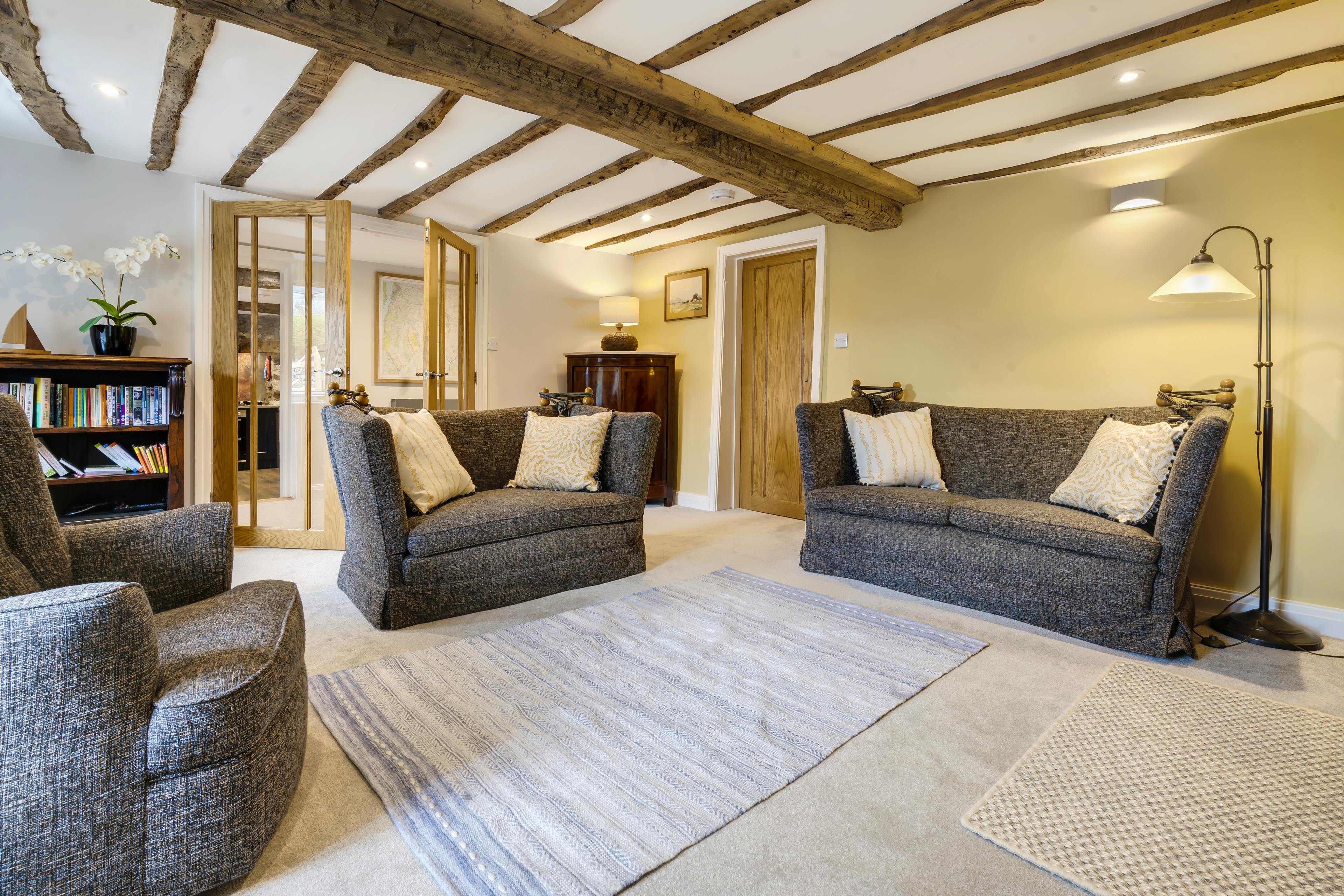 Two luxurious en suite bedrooms promise restful nights beneath exposed beams with king size and super king size beds.