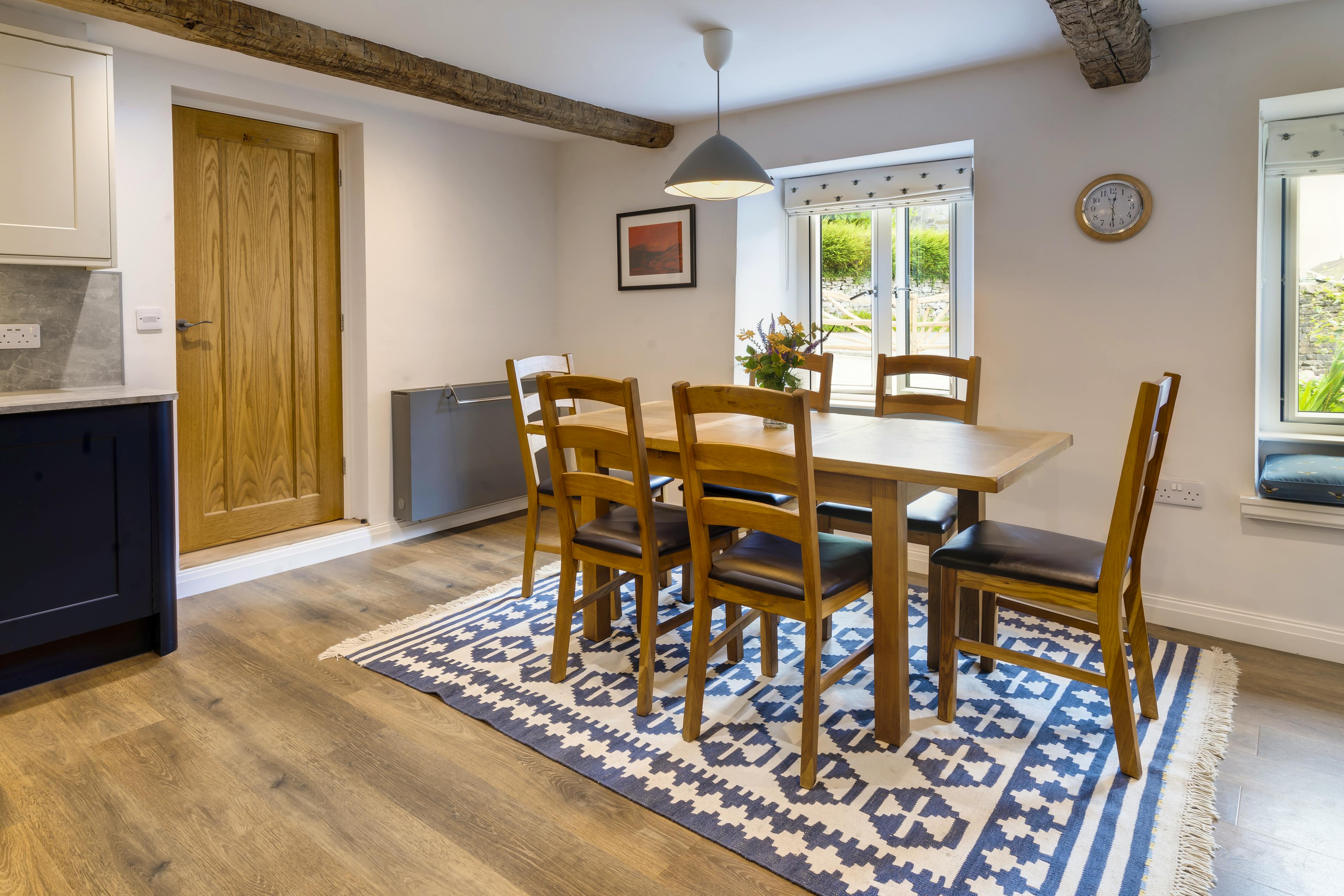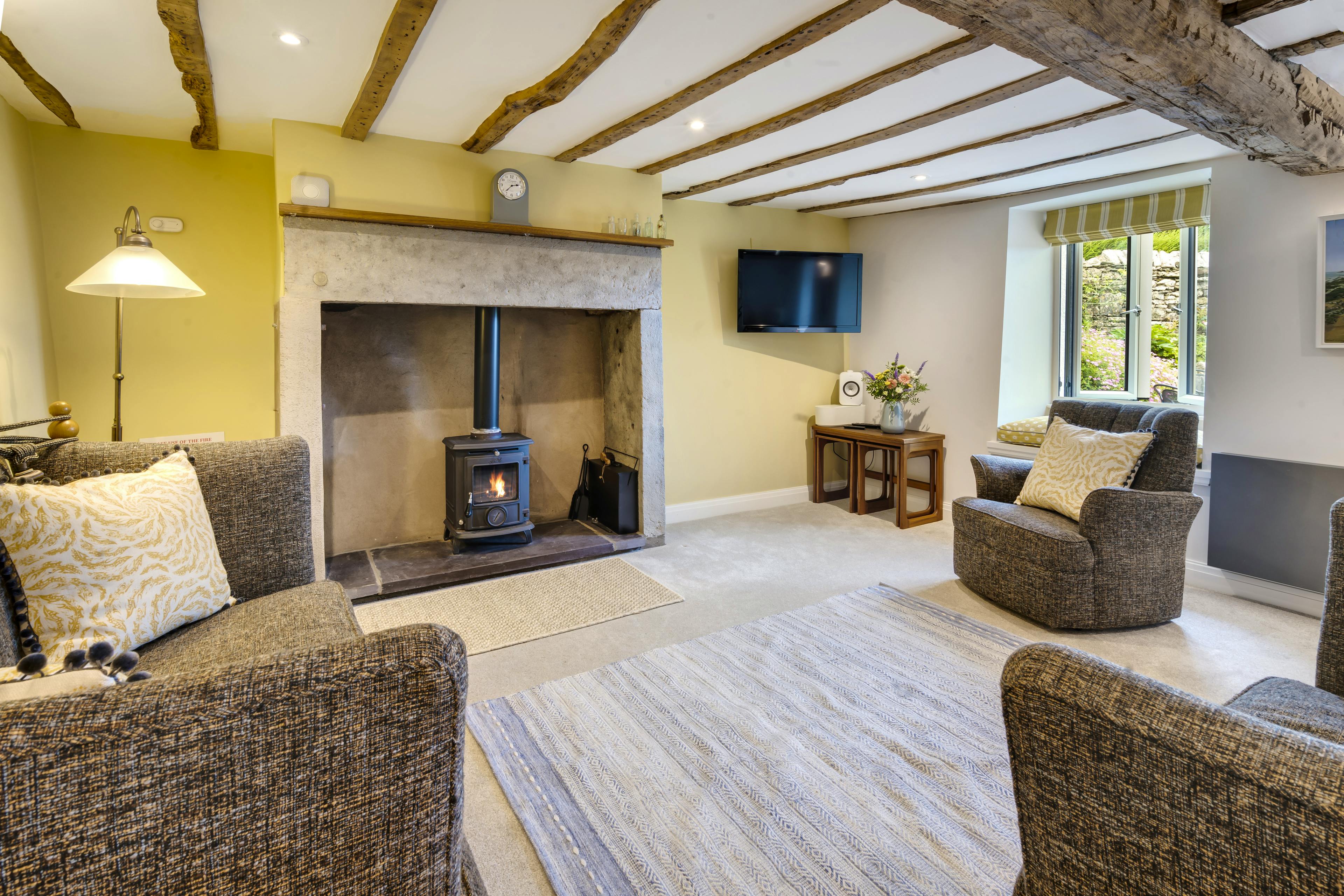 Step into Joe’s Cottage – a lovingly restored 18th-century home in the peaceful Lakeland village of Brigsteer. Once belonging to a much-loved local farmer, this cottage now combines centuries-old character with elegant, contemporary design, creating a retreat full of warmth, charm and thoughtful touches. With its original beams, hand-carved stone fireplaces and picture windows overlooking the Lyth Valley, it’s the perfect spot to relax, recharge and soak up the quiet beauty of the Lake District. Inside, the cottage flows with natural light and texture. The spacious living room invites you to unwind by the glowing AGA wood-burning fire, a fine centrepiece for cosy evenings after a day on the fells. A pair of plush sofas and a swivel armchair make this an inviting space for long, lazy evenings with a book or a film. The heart of the home is the kitchen and dining room — once the old farmhouse kitchen. This fab space is now fitted with a contemporary range of integrated appliances, under-beam lighting and a large wooden table for six. This is an ideal spot for long hearty feasts whether you’re sharing breakfast with sunlight spilling through the window seats or a delicious dinner after a walk to the local pub. Upstairs, two beautiful ensuite bedrooms ensure peaceful nights. The main bedroom features a king-size bed beneath oak beams and a sleek walk-in shower. The second has a super king-size bed that can be arranged as twins, along with a bath and overhead shower. Luxurious linens, natural Pure Lakes toiletries and deep, restful colours create an atmosphere of quiet indulgence. Step outside onto the sunlit patio and you’ll find yourself surrounded by glorious views of the Lyth Valley and the distant fells. The garden, once a cobbled farmyard, now buzzes with birds and bees, while the glass balustrade and cushioned chairs make this an idyllic spot to sip morning coffee or watch the sky turn rose gold at sunset. On clear nights, wrap up in one of the provided blankets and stargaze – Brigsteer’s unlit lanes mean the constellations are dazzling. When you’re ready to explore, numerous scenic walks start right from your doorstep. Wander up to Scout Scar for sweeping panoramas, stroll to the friendly Wheatsheaf Inn for local ales or take a short drive to Bowness-on-Windermere, Ambleside or the literary charm of Cartmel. Joe’s Cottage is an invitation to slow down and savour the best of Lakeland life.