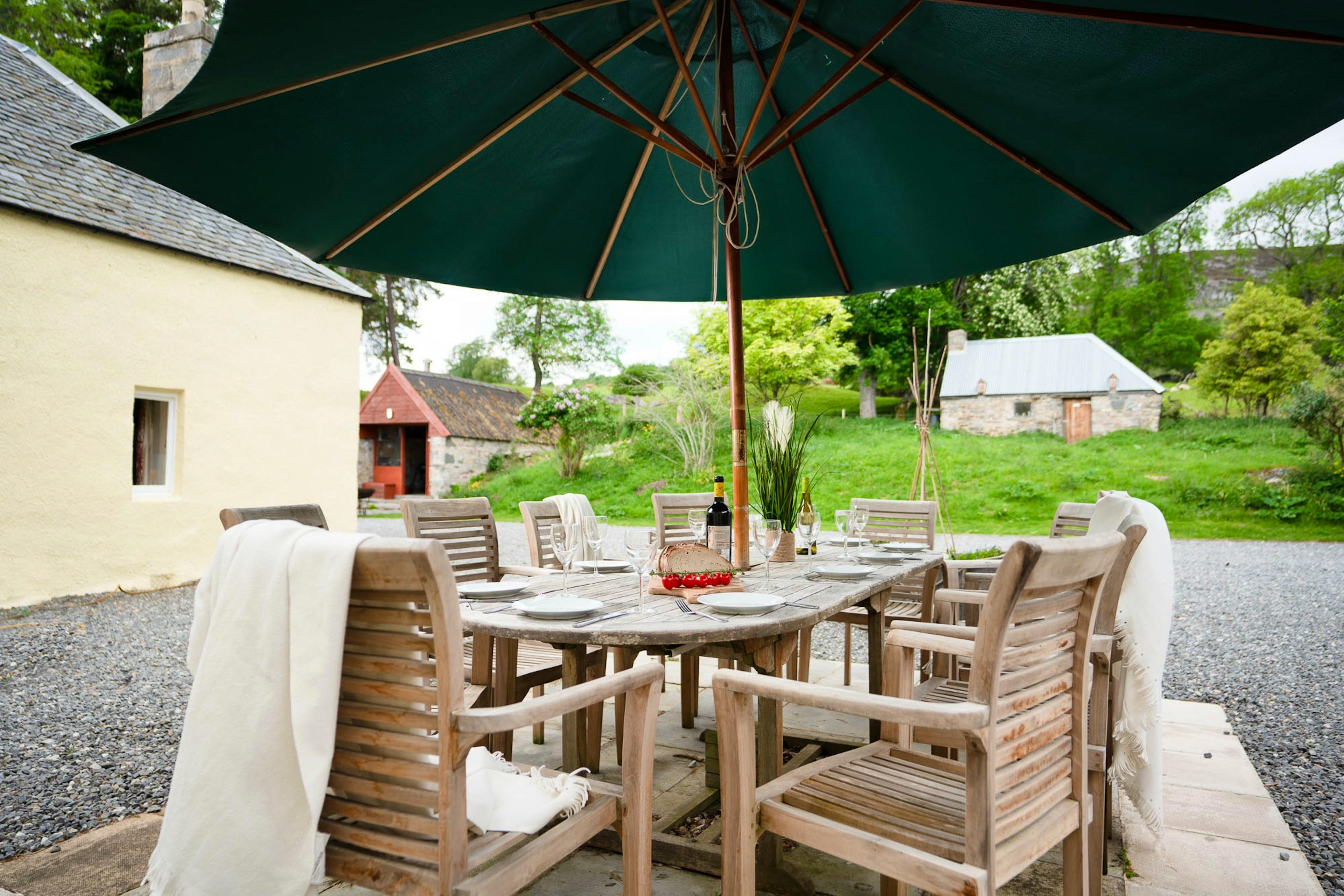 Private hot tub and alfresco dining area within extensive gardens and woodland grounds.
