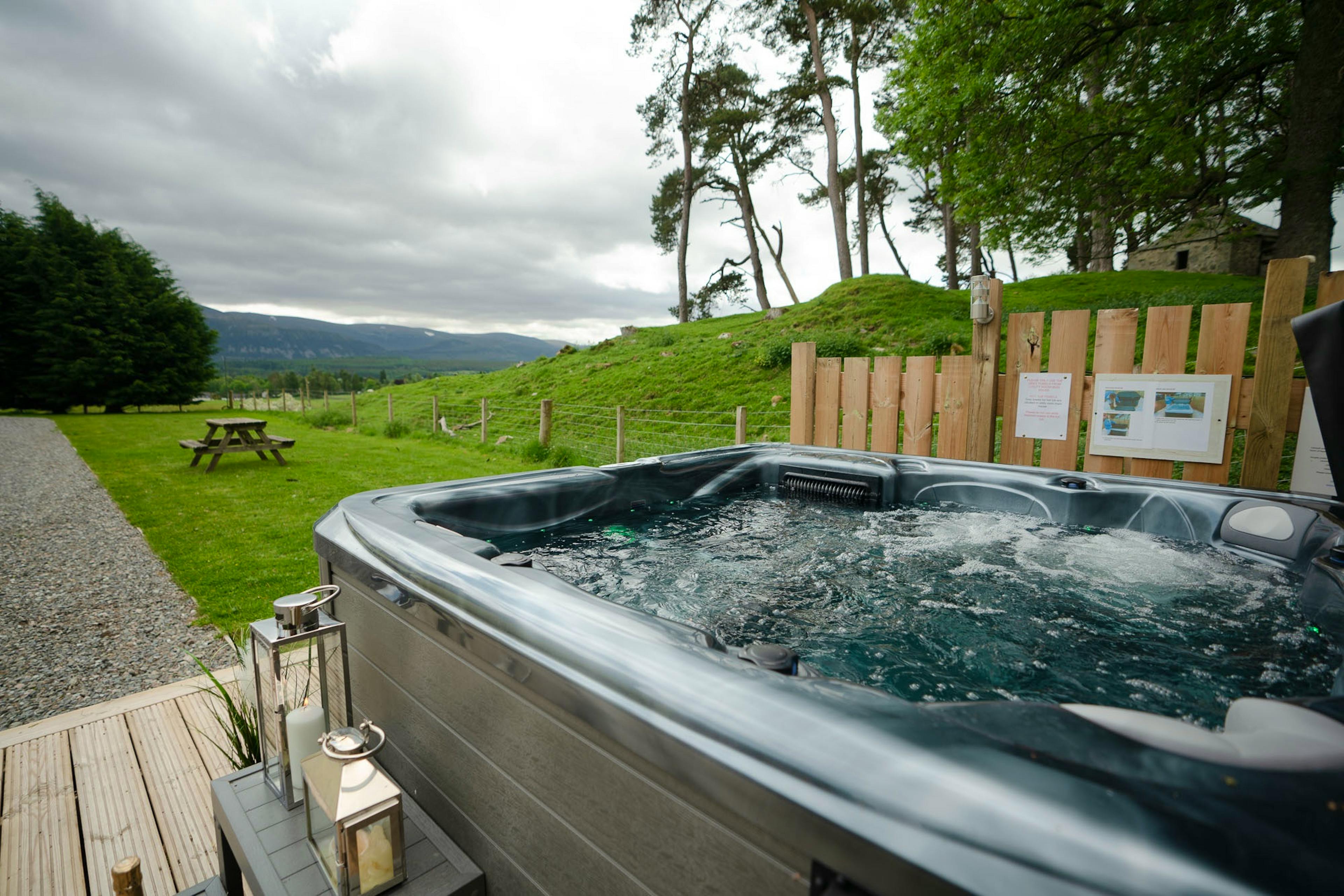 Grand and opulent Highland estate lodge near Aviemore with turret bathroom, hot tub and sweeping Cairngorm views.