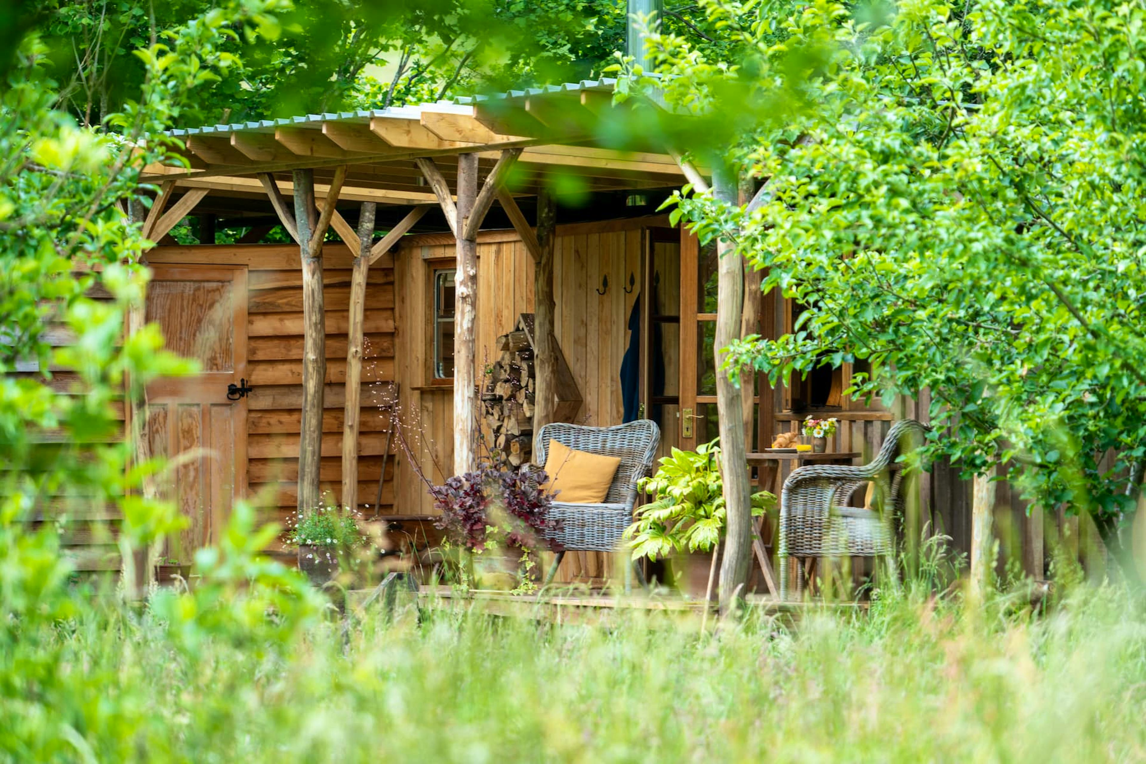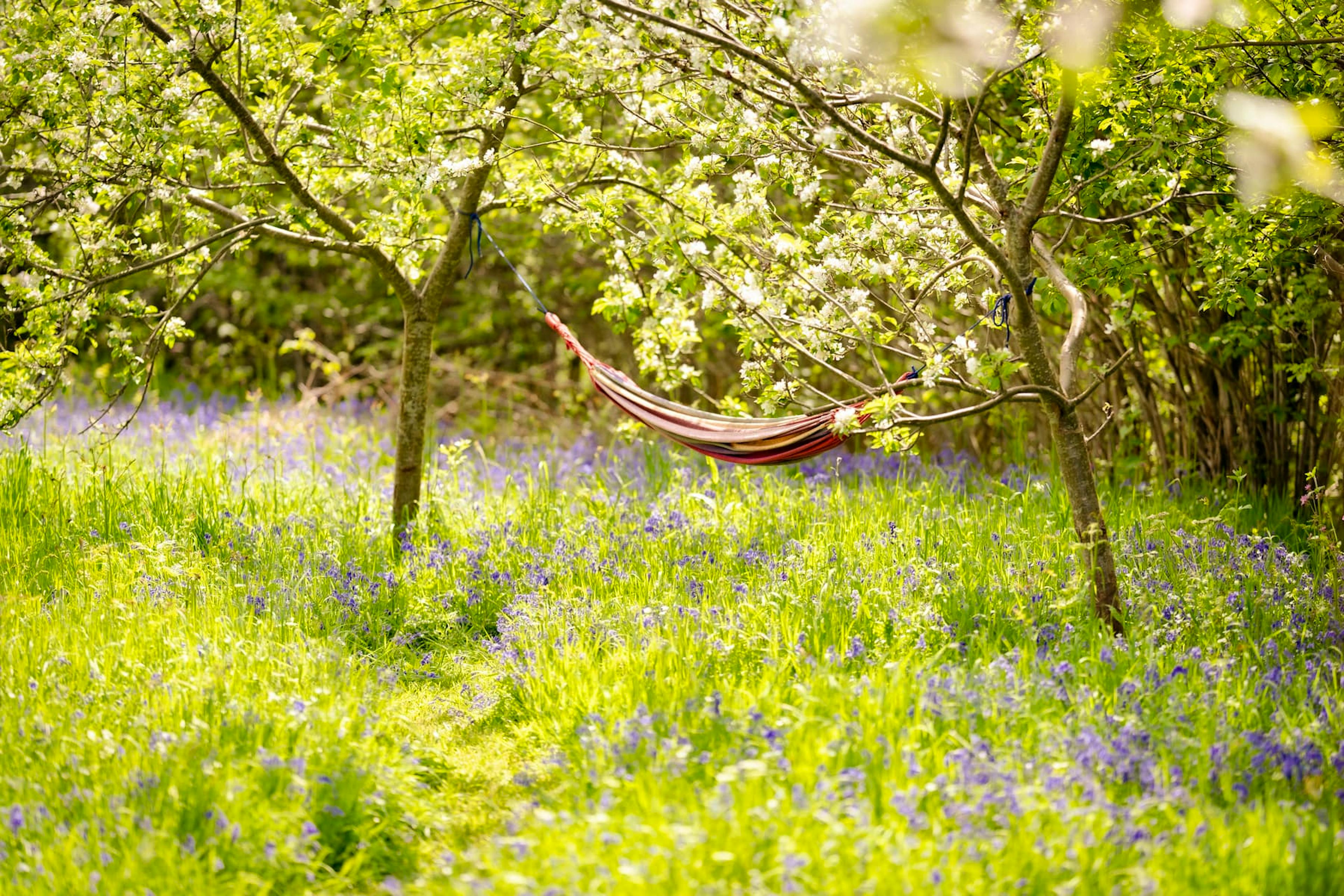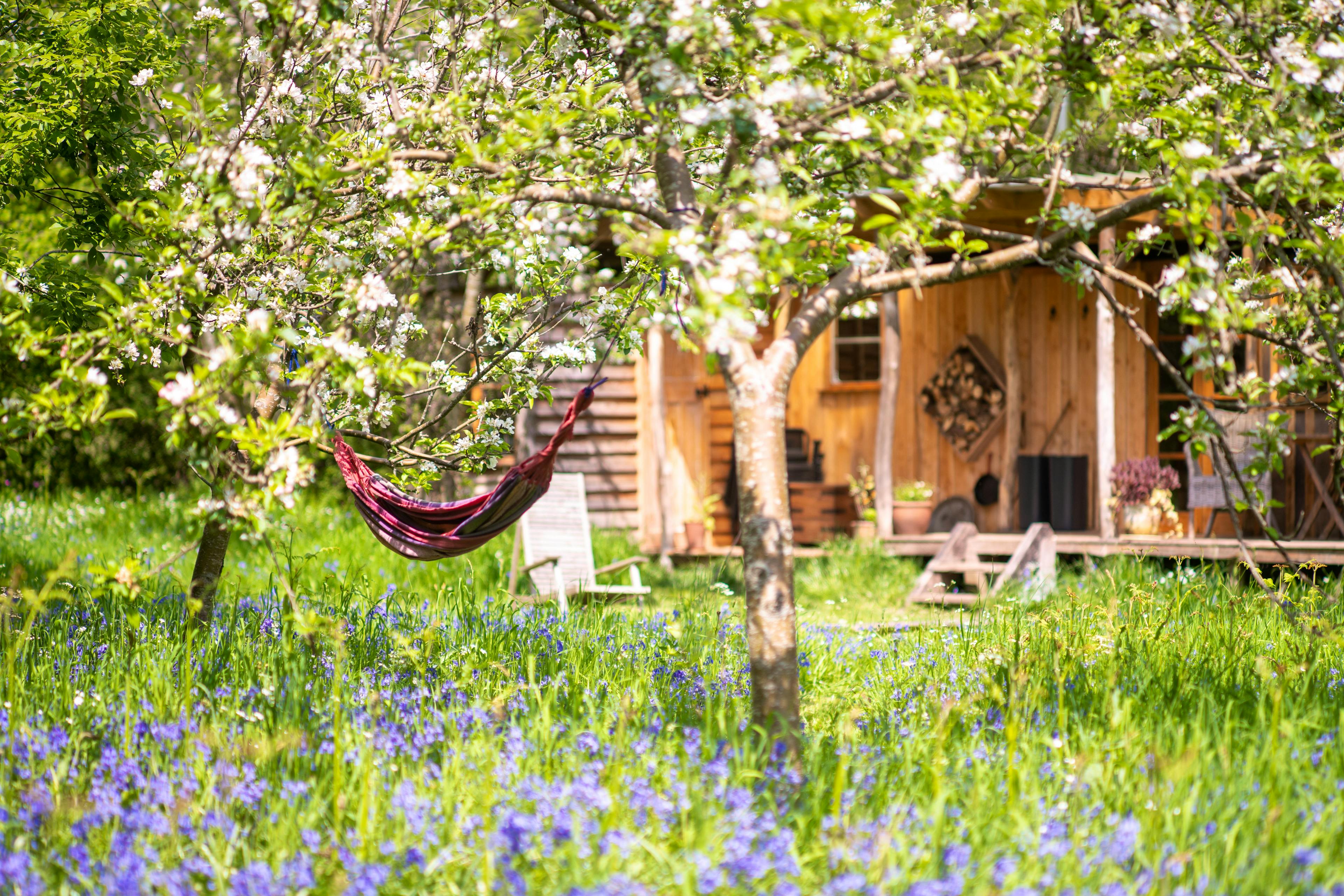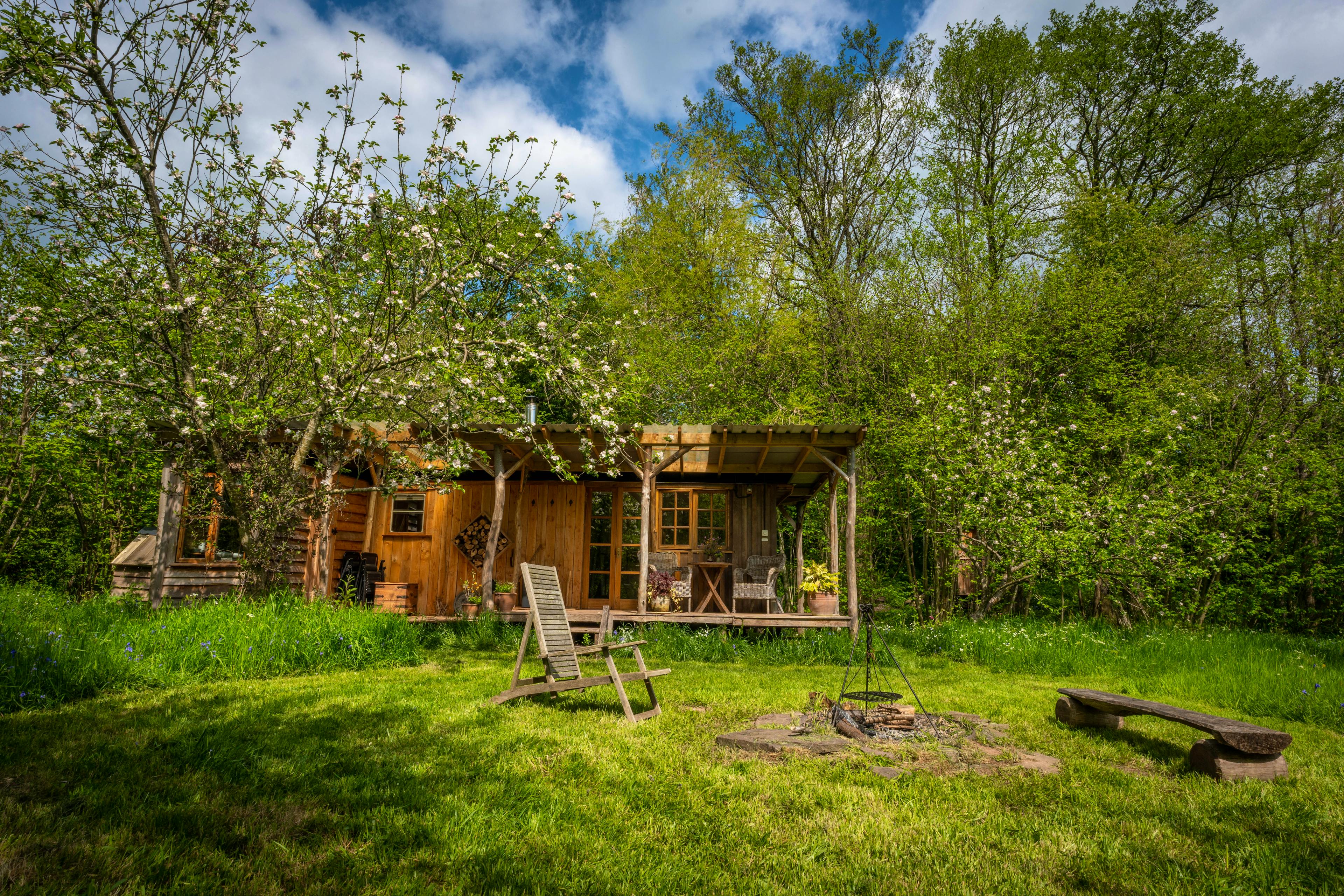 Romantic Retreat snuggled in a secluded orchard next to a babbling brook in rural Herefordshire with wild swimming and ancient woodland all around.