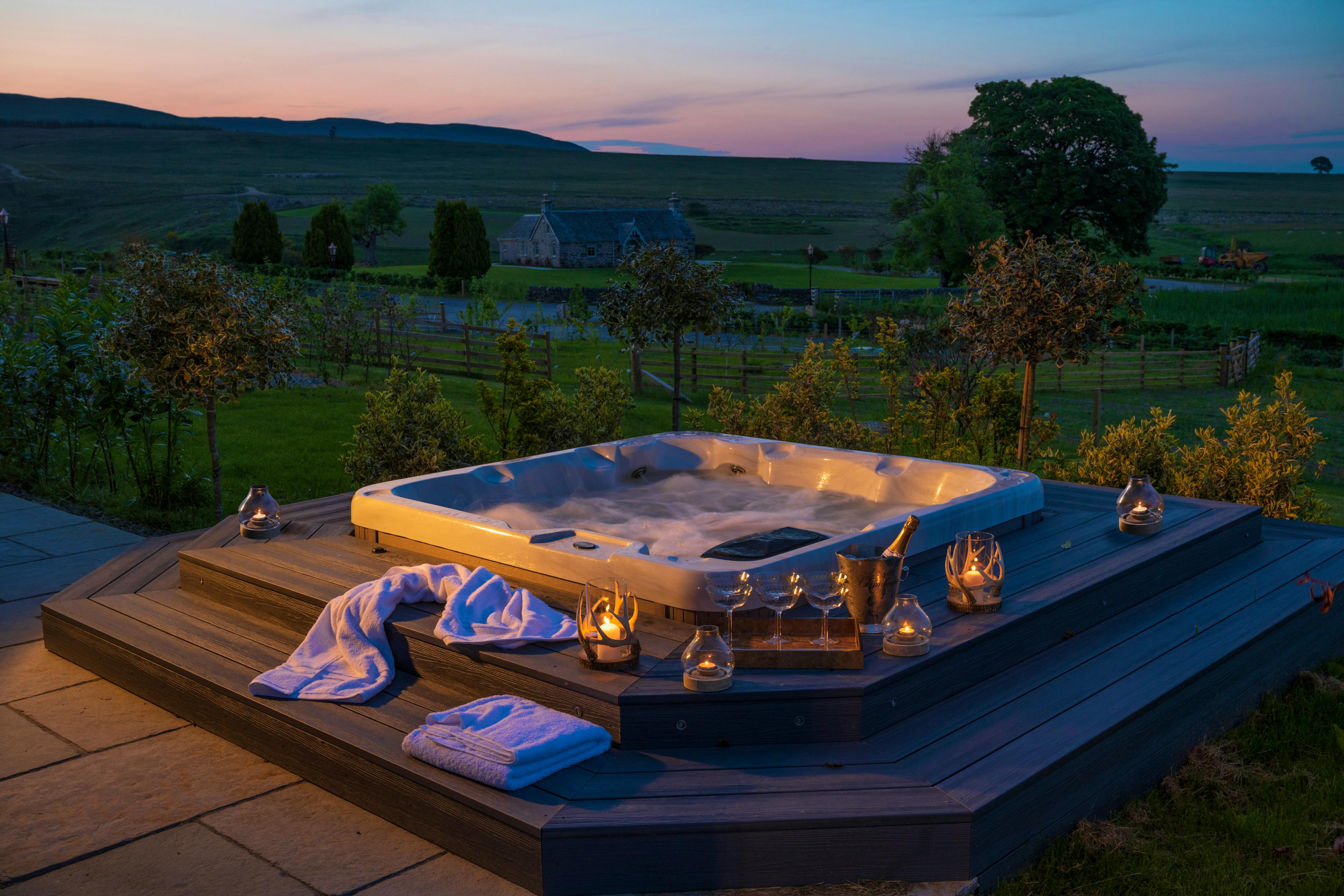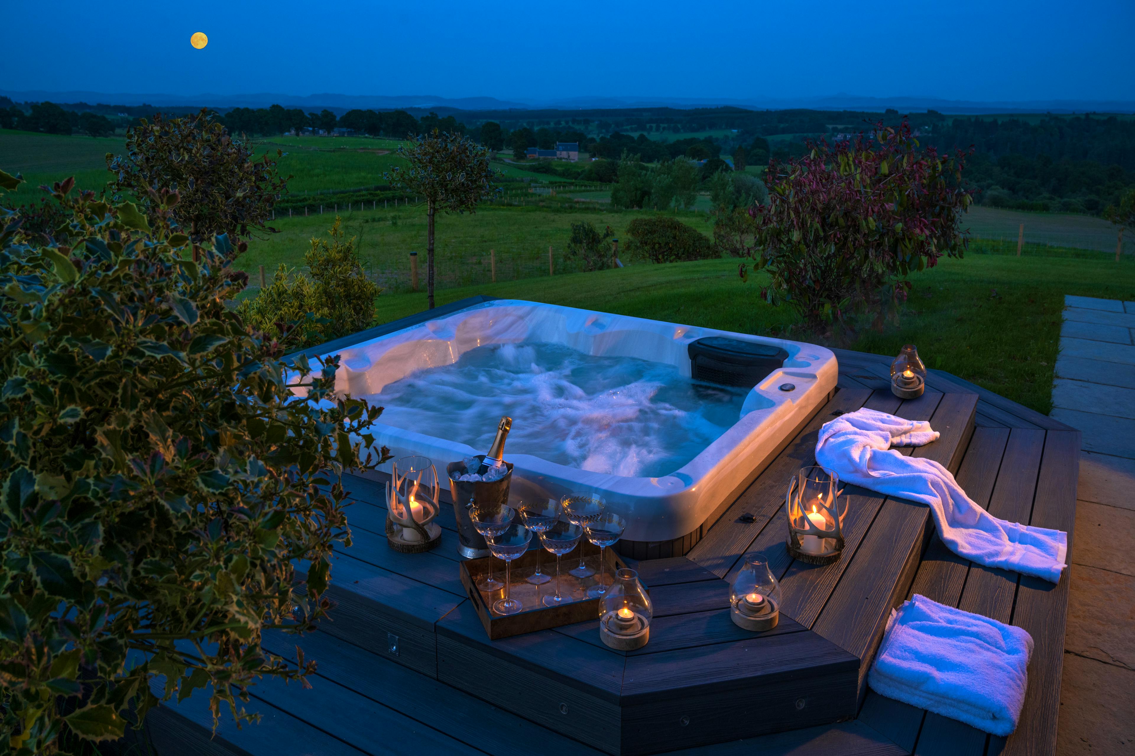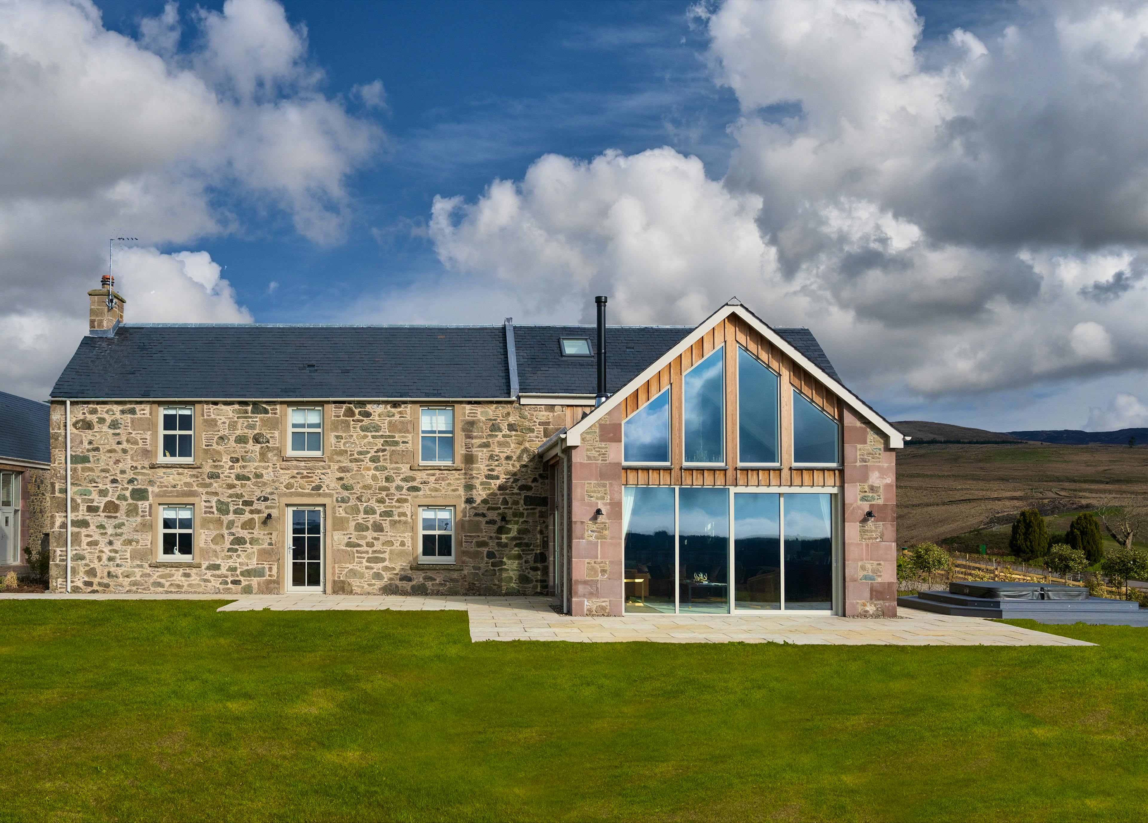 This 1850s Perthshire farmhouse has been beautifully transformed into a modern hunting lodge with a private hot tub, offering timeless luxury amidst stunning countryside.