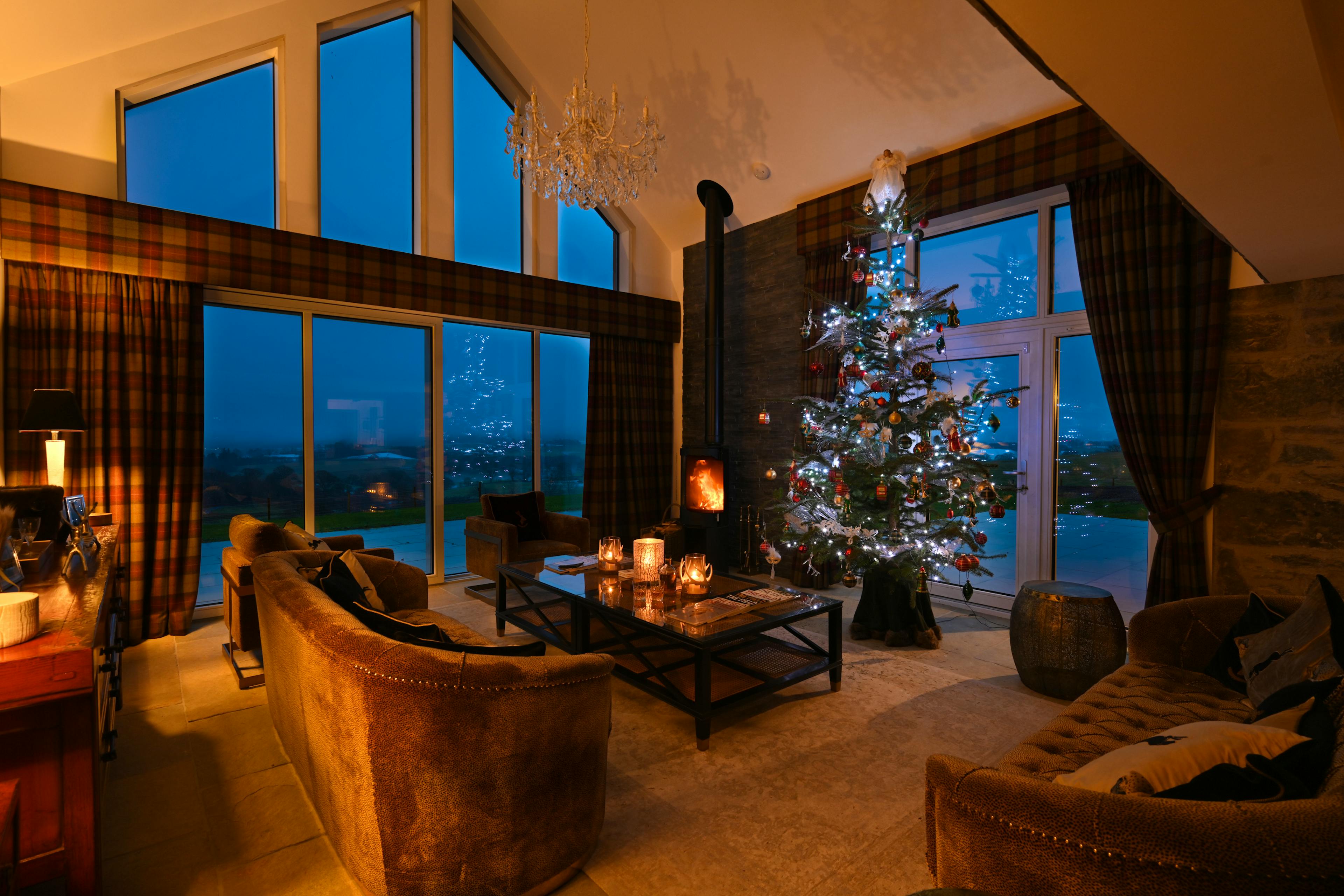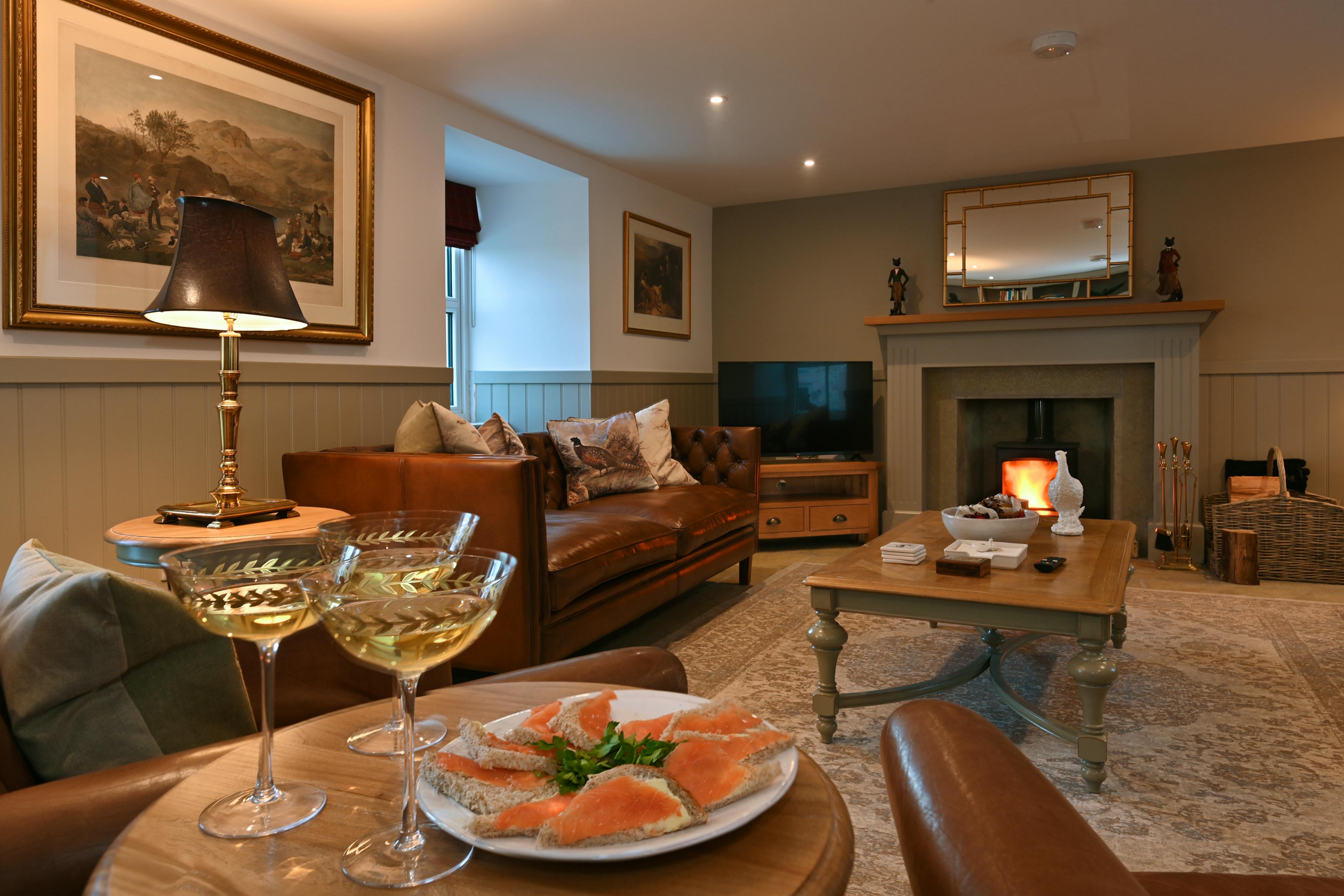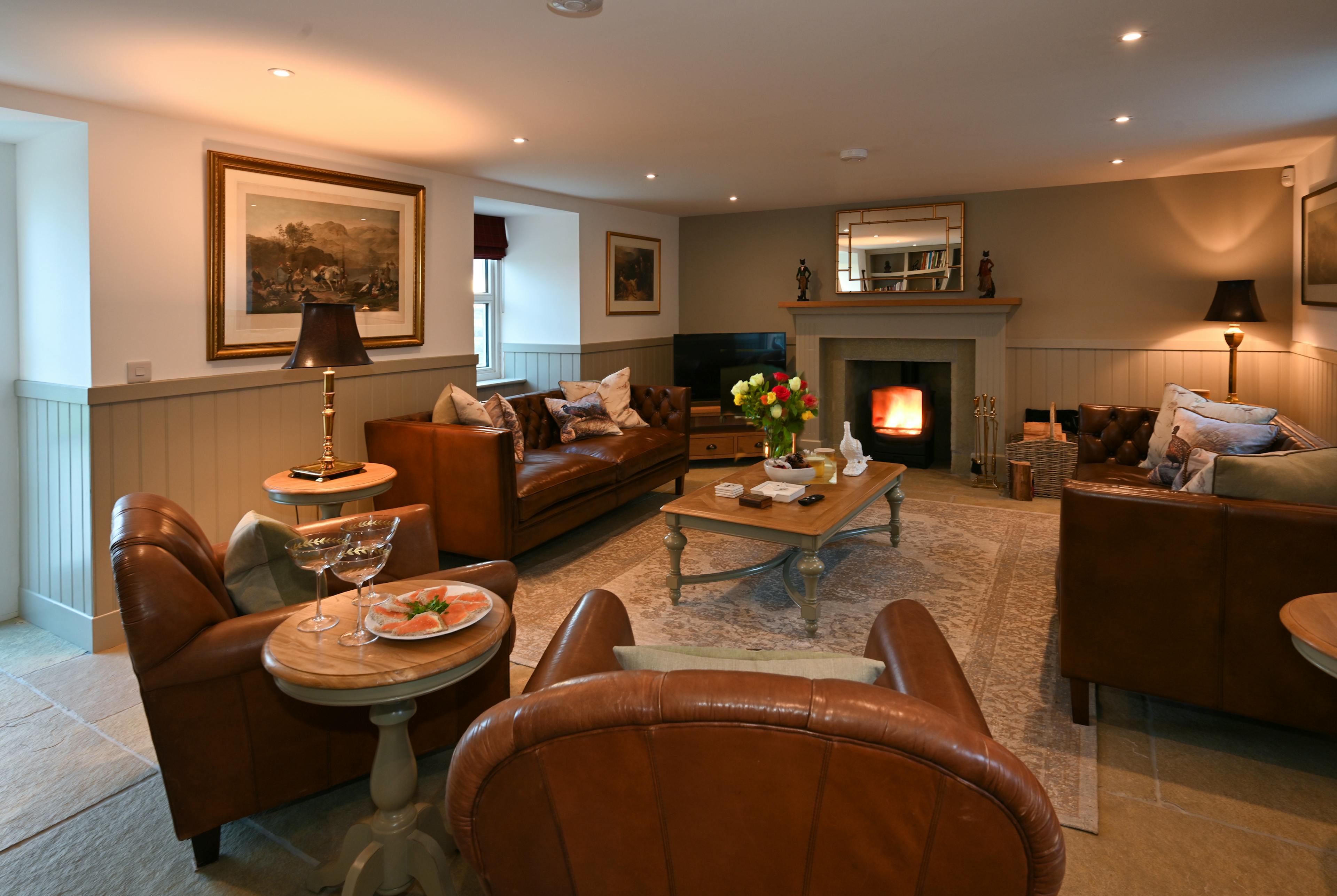 The cosy drawing room with sumptuous leather sofas and a wood-burning stove is an ideal retreat after a day of exploring.