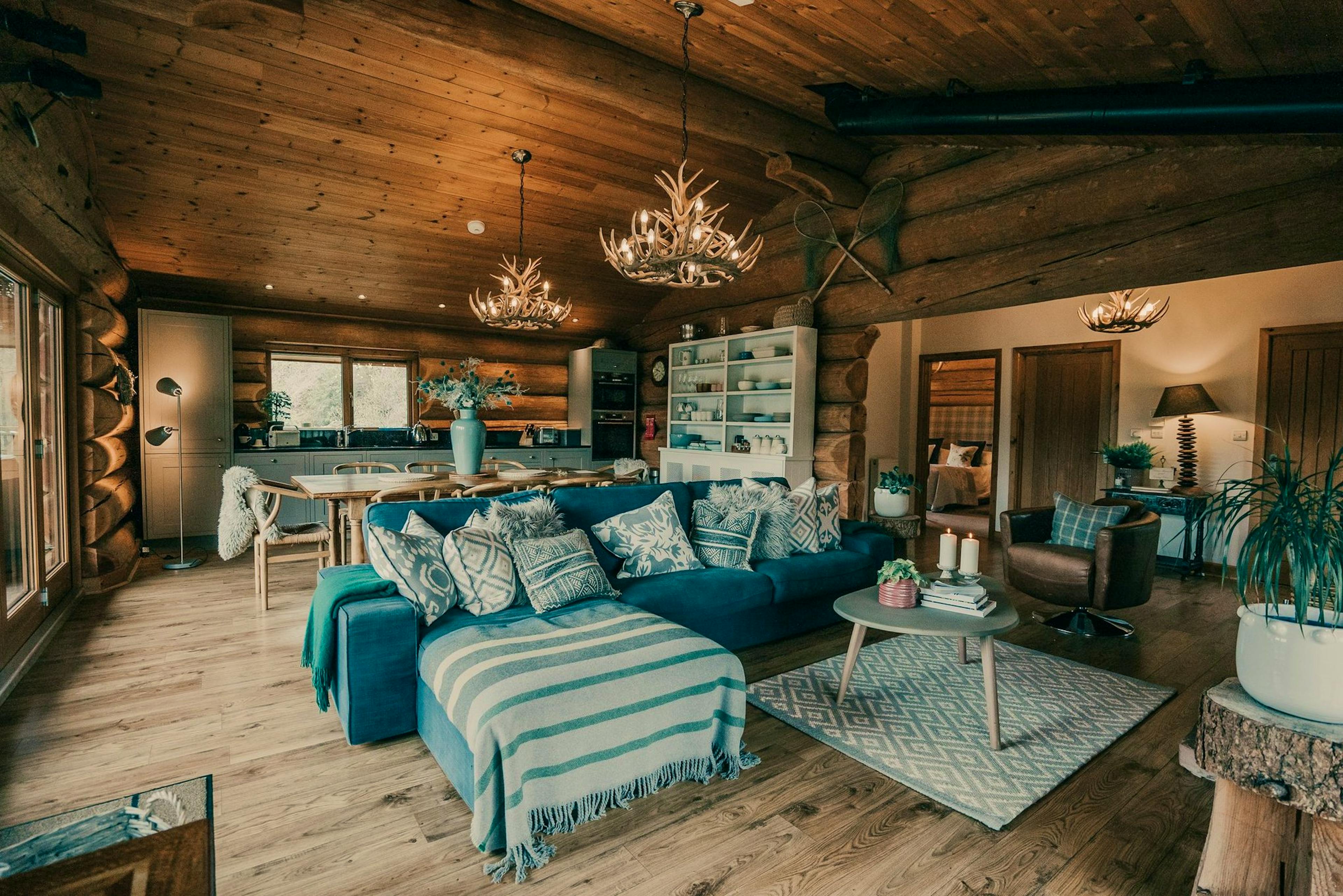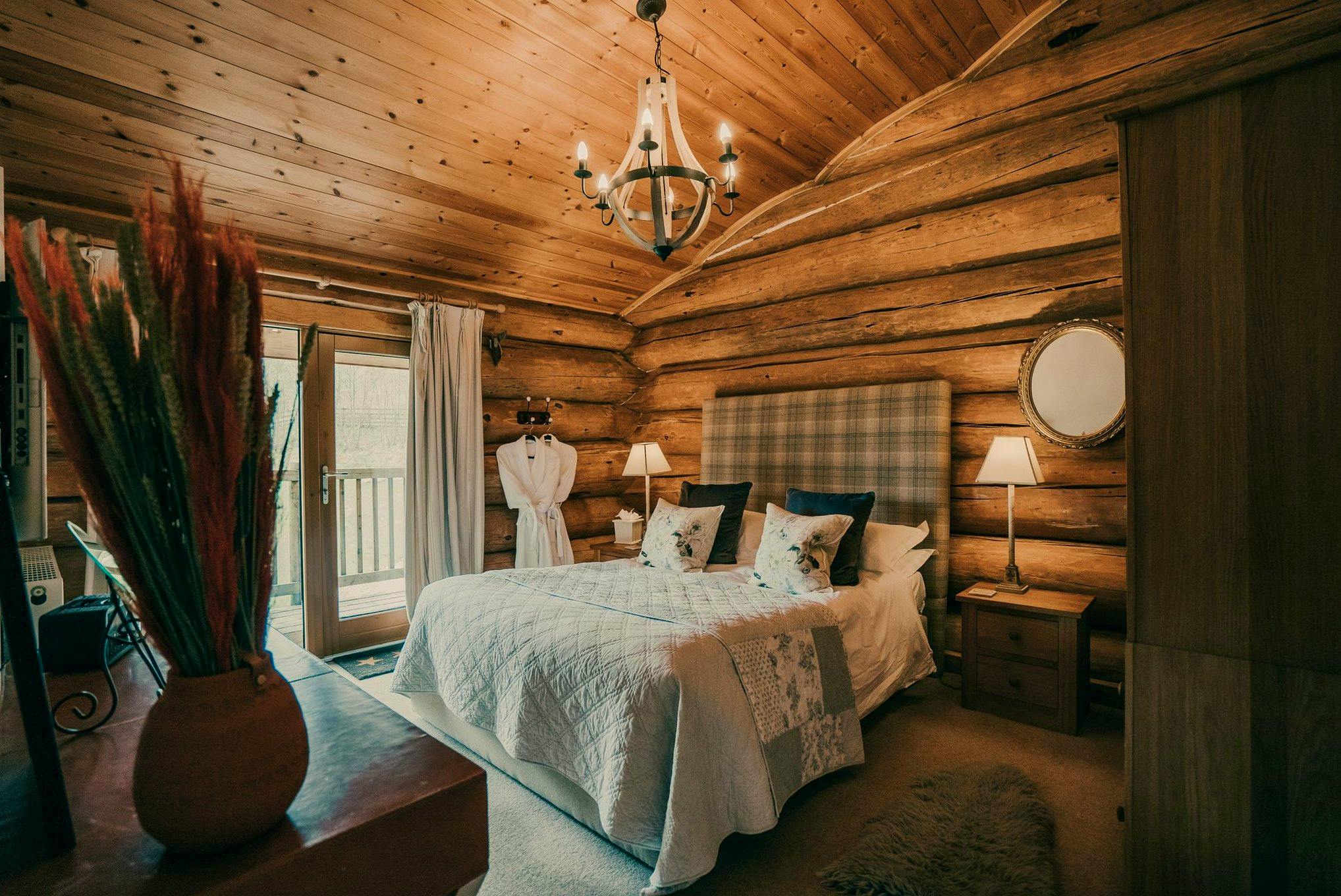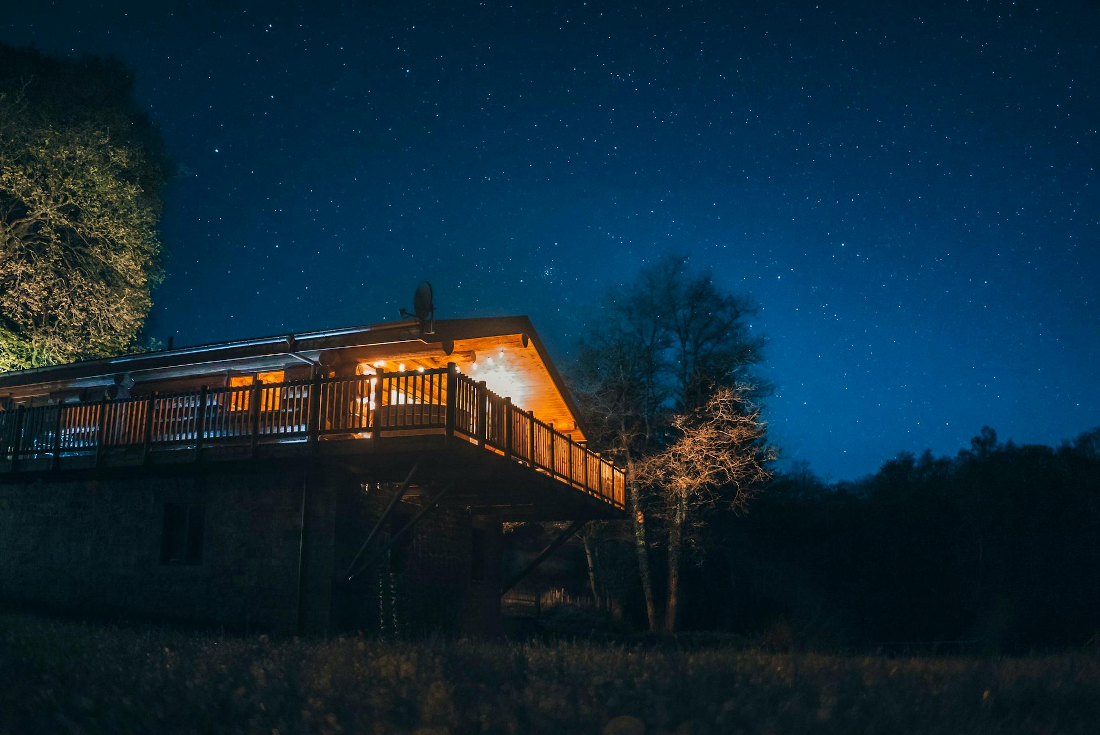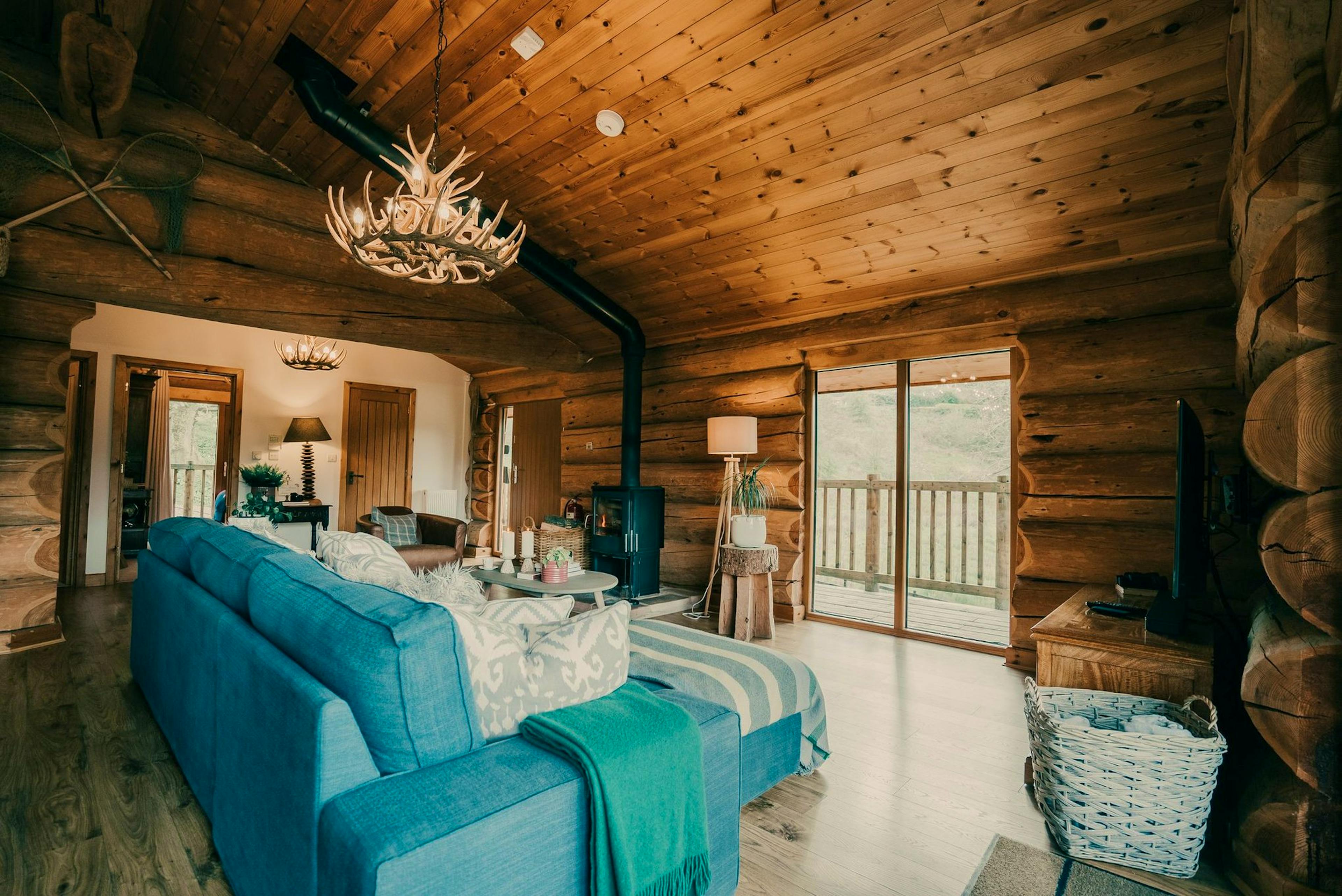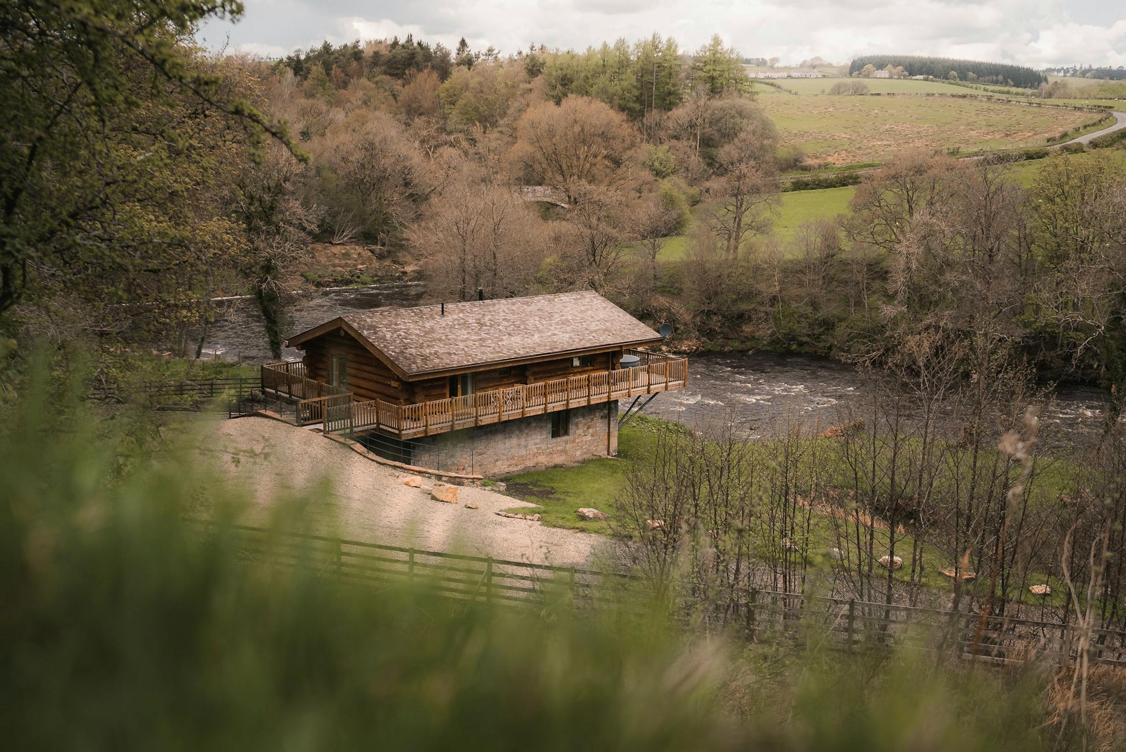 Luxury hand-built cabin on the waterfront surrounded by woodland with stunning scenery and a hot tub on the Cumbria and Dumfriesshire border.