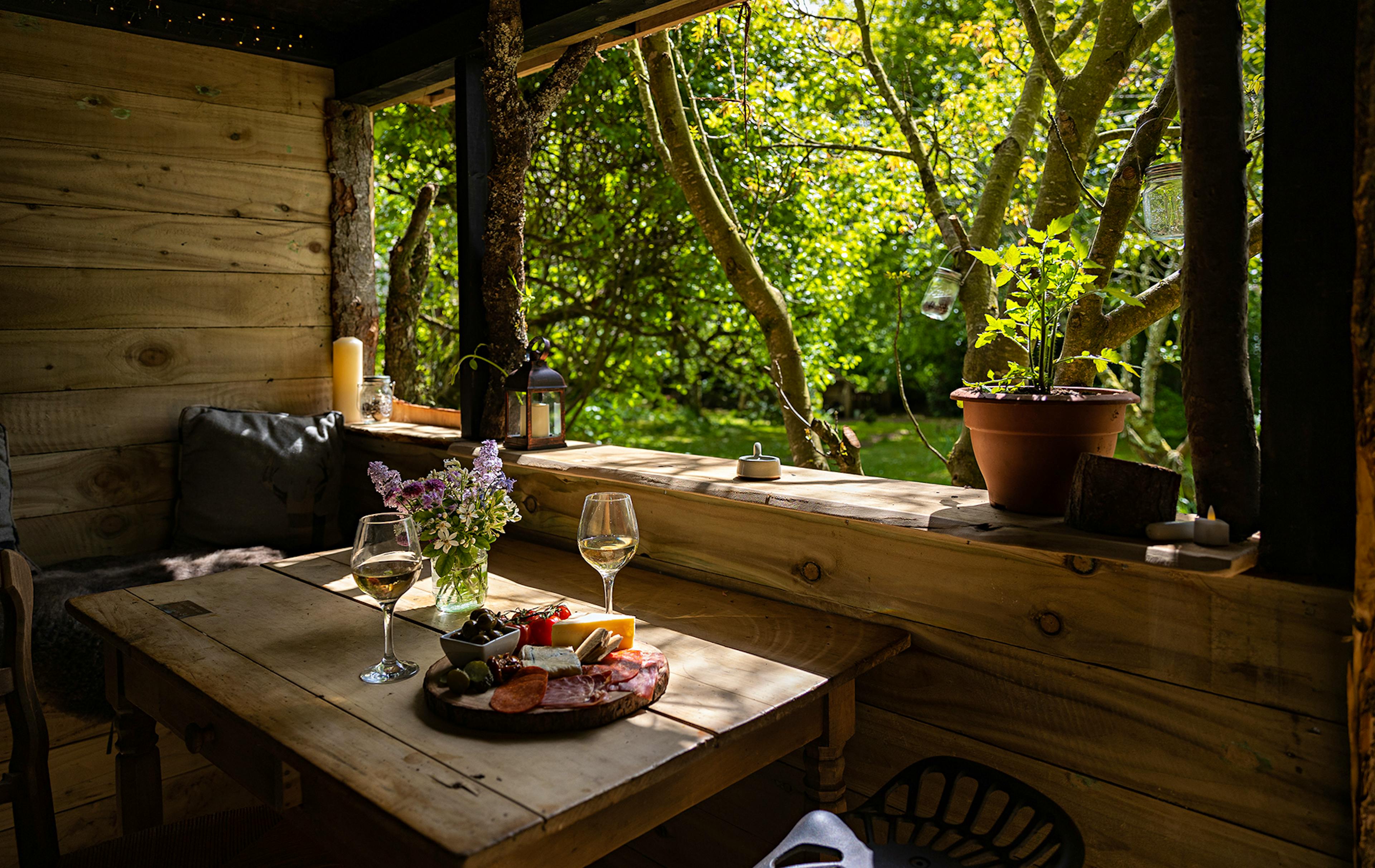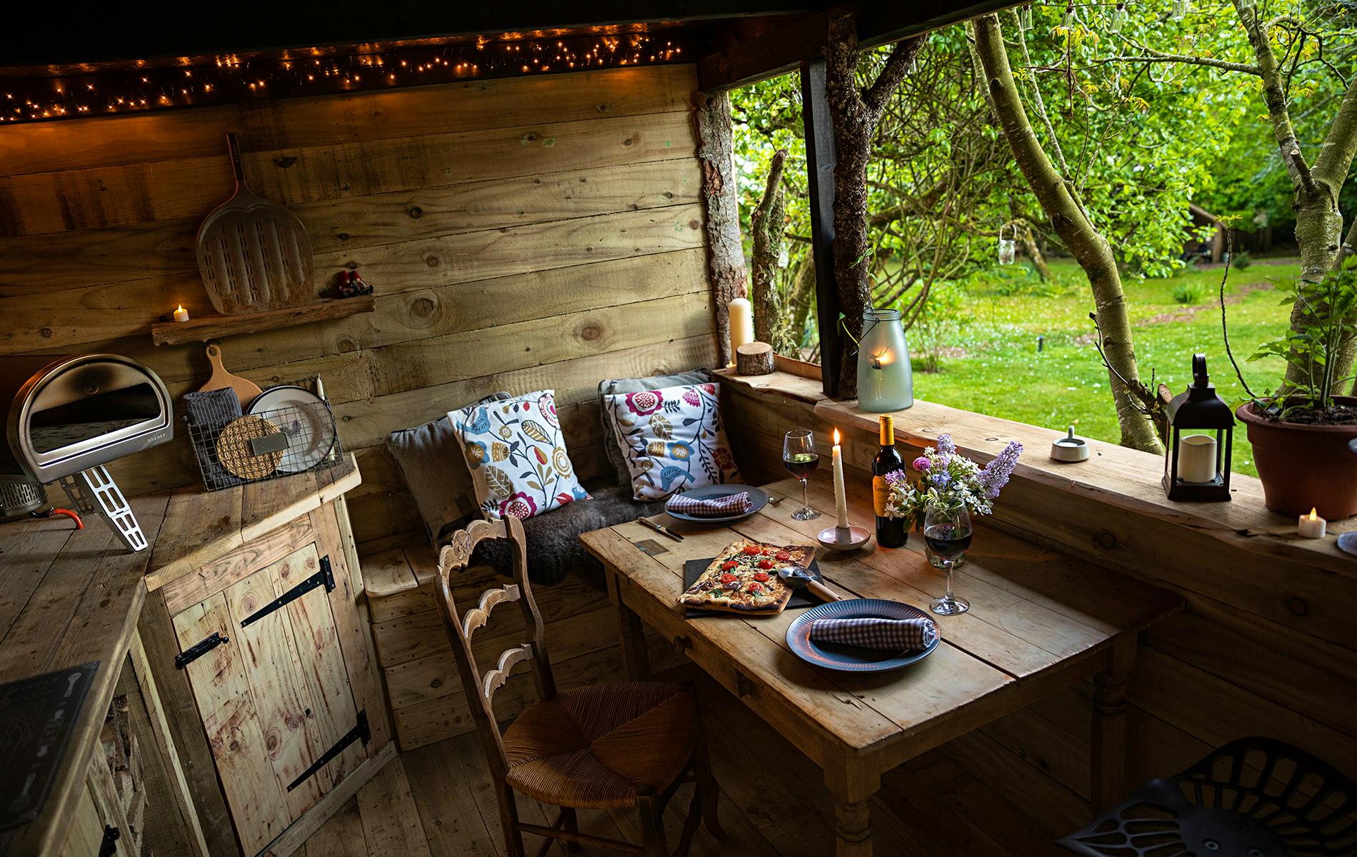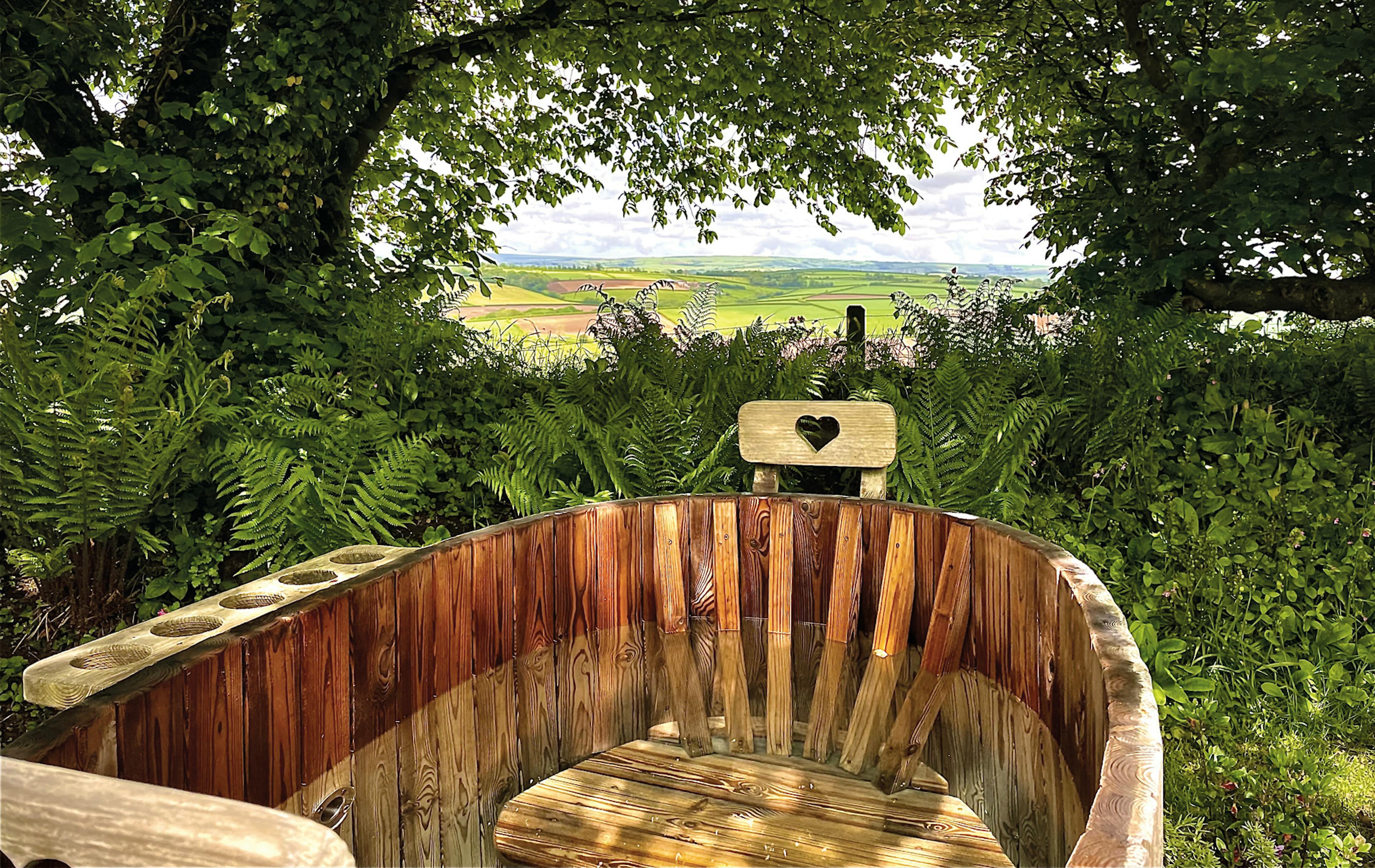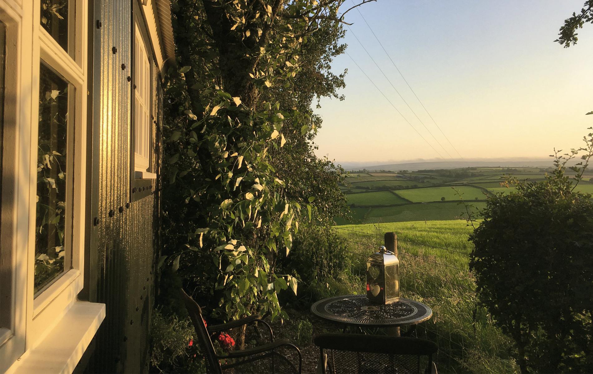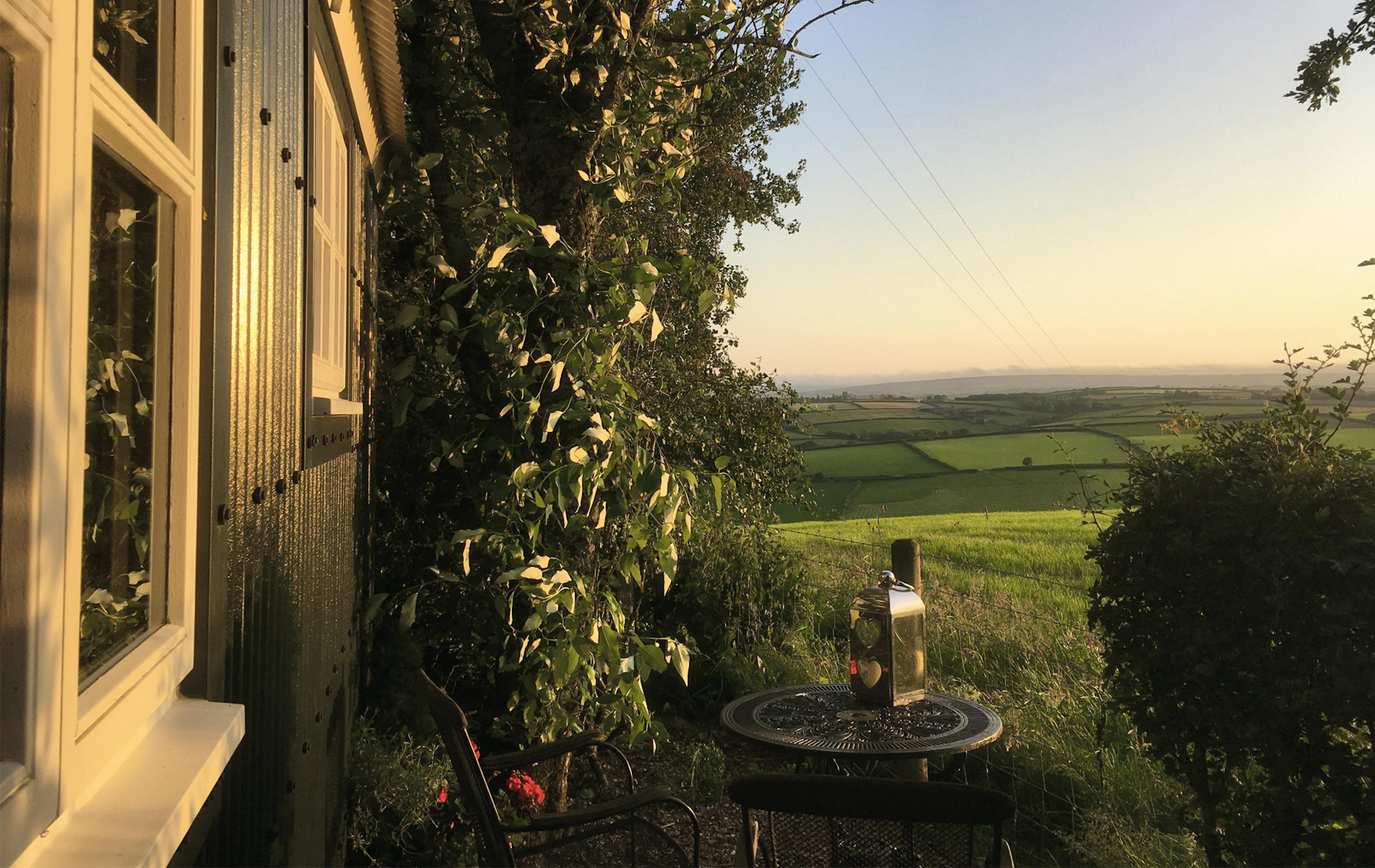 Charming, Scandi-inspired shepherd's hut with stunning views, hot tub, pizza oven and outdoor kitchen lit by twinkling fairy lights, in deepest rural Devon.