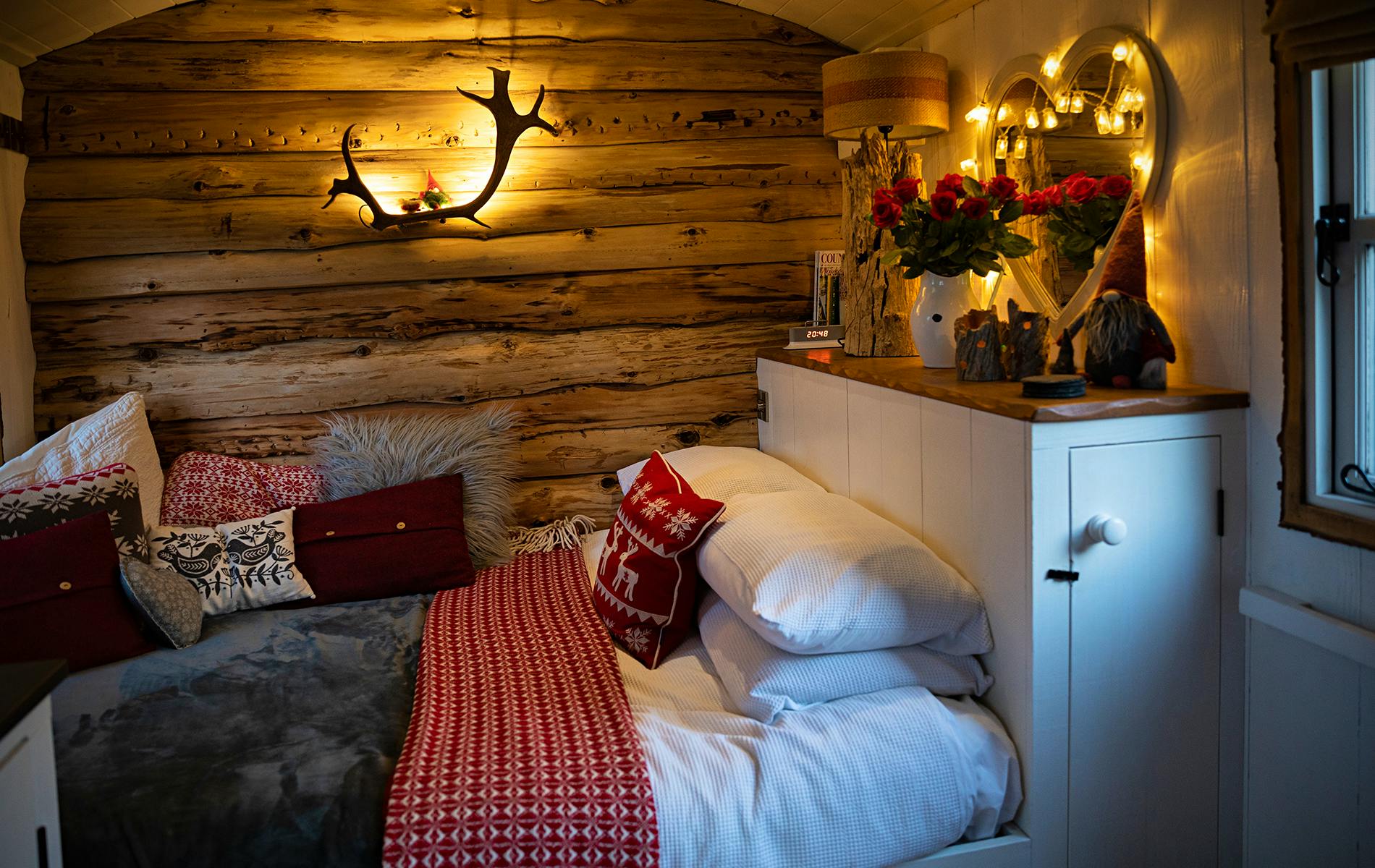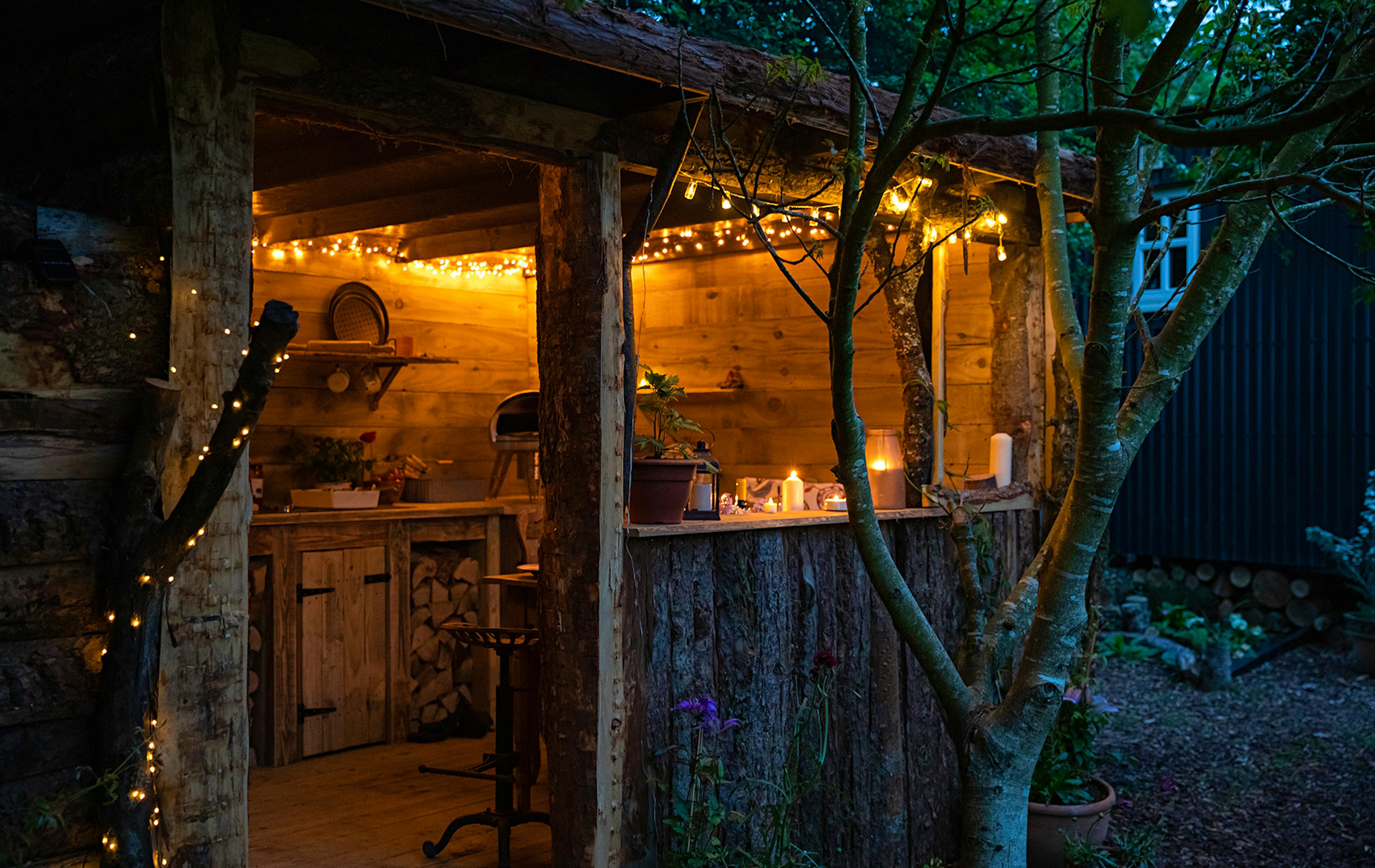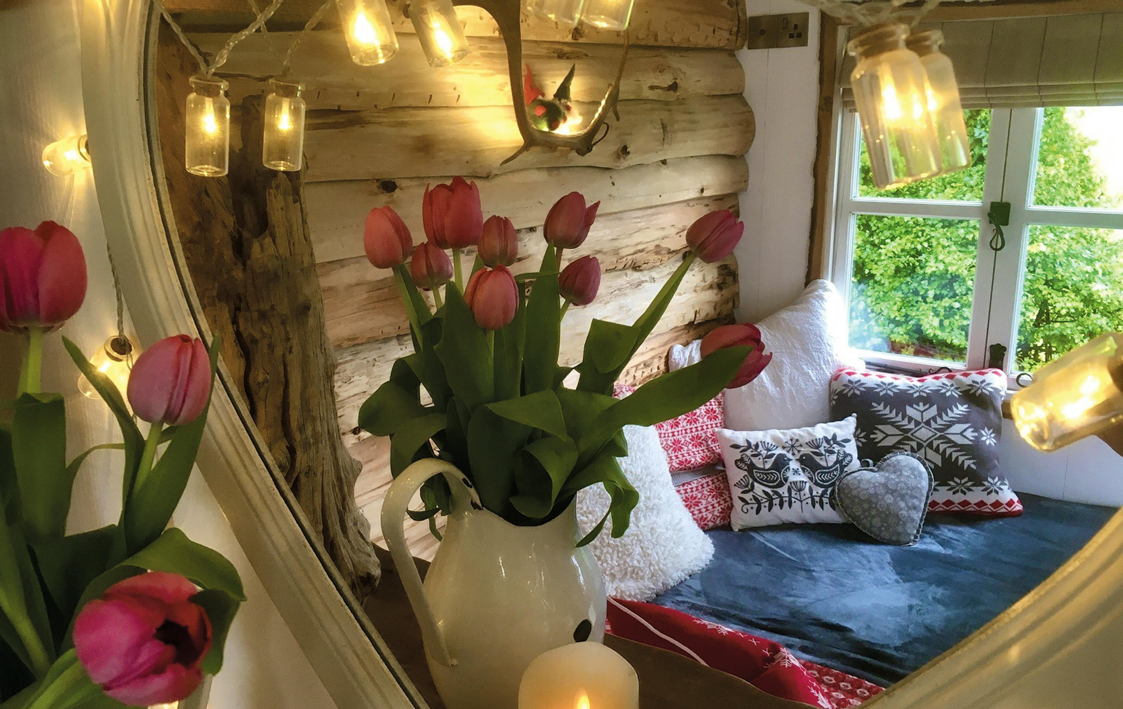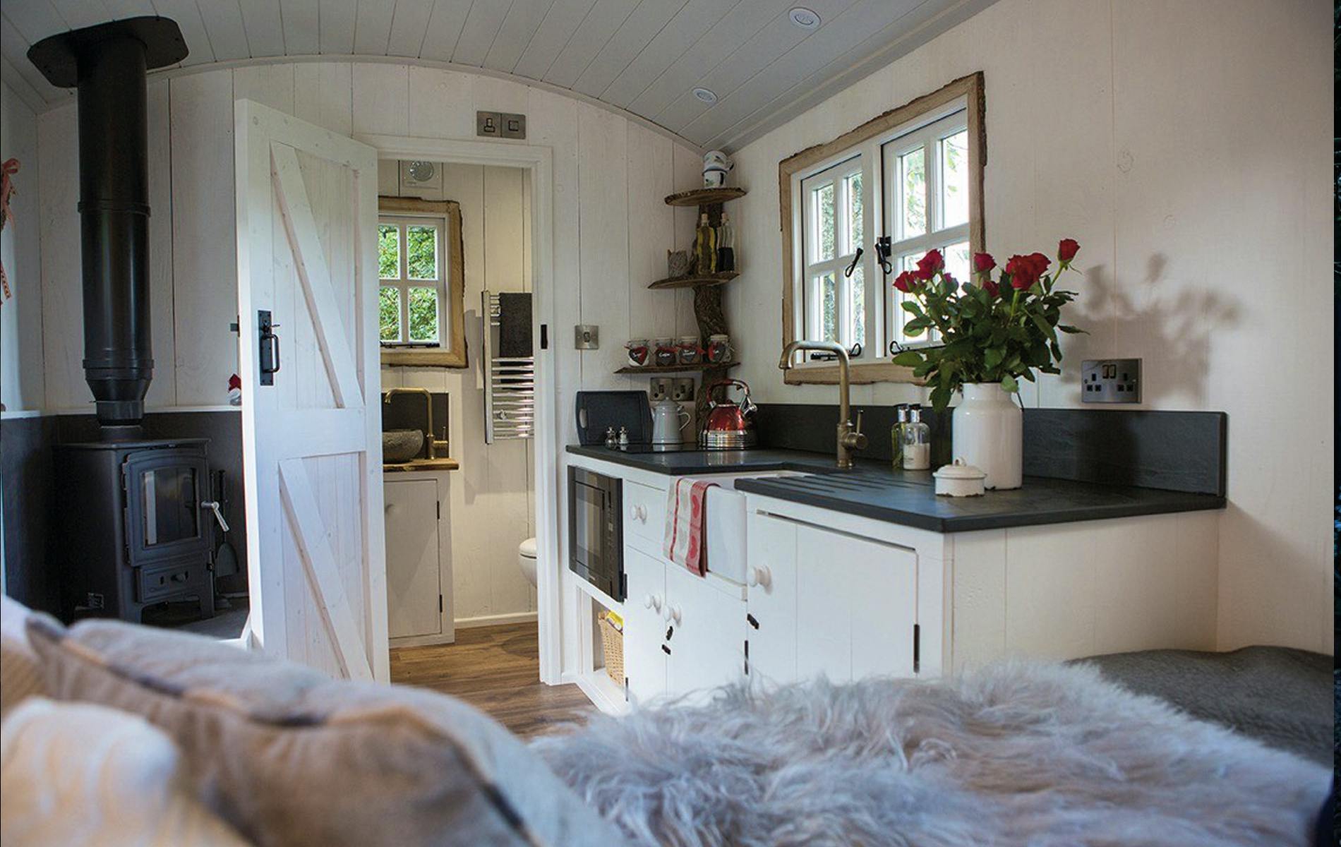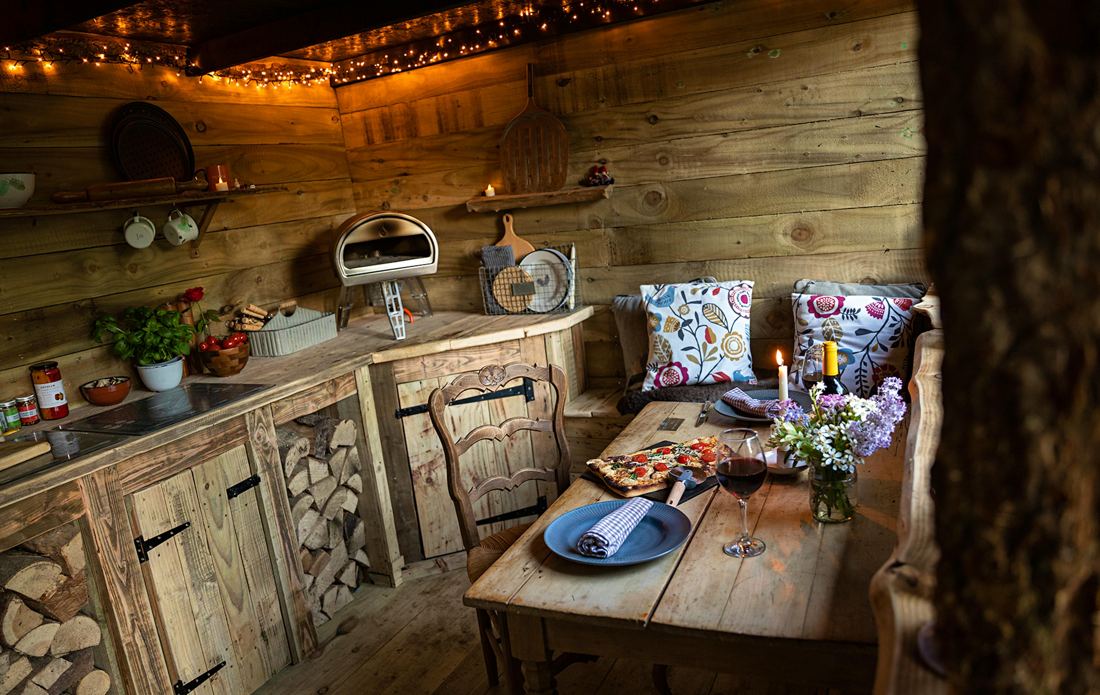 Charming, Scandi-inspired shepherd's hut with stunning views, hot tub, pizza oven and outdoor kitchen lit by twinkling fairy lights, in deepest rural Devon.