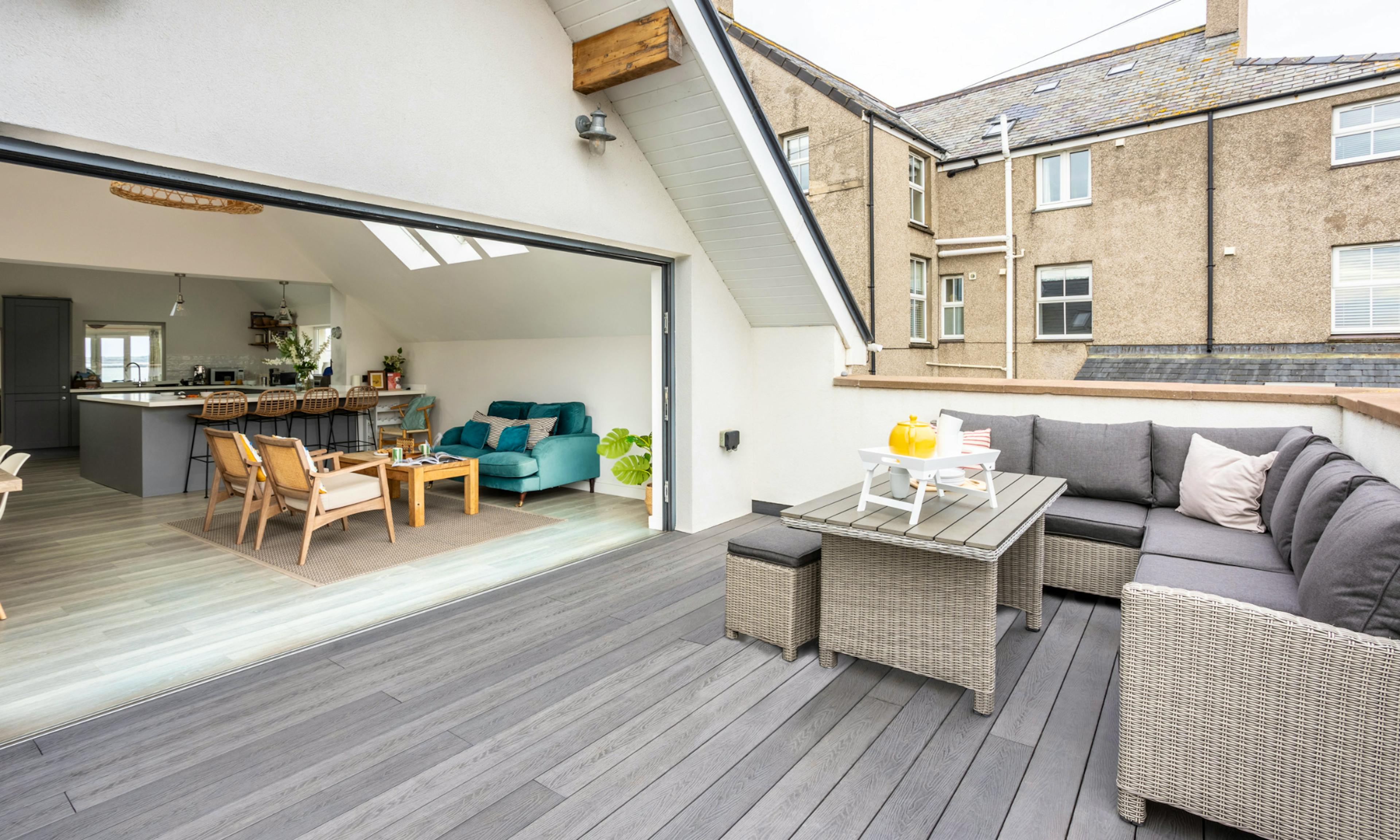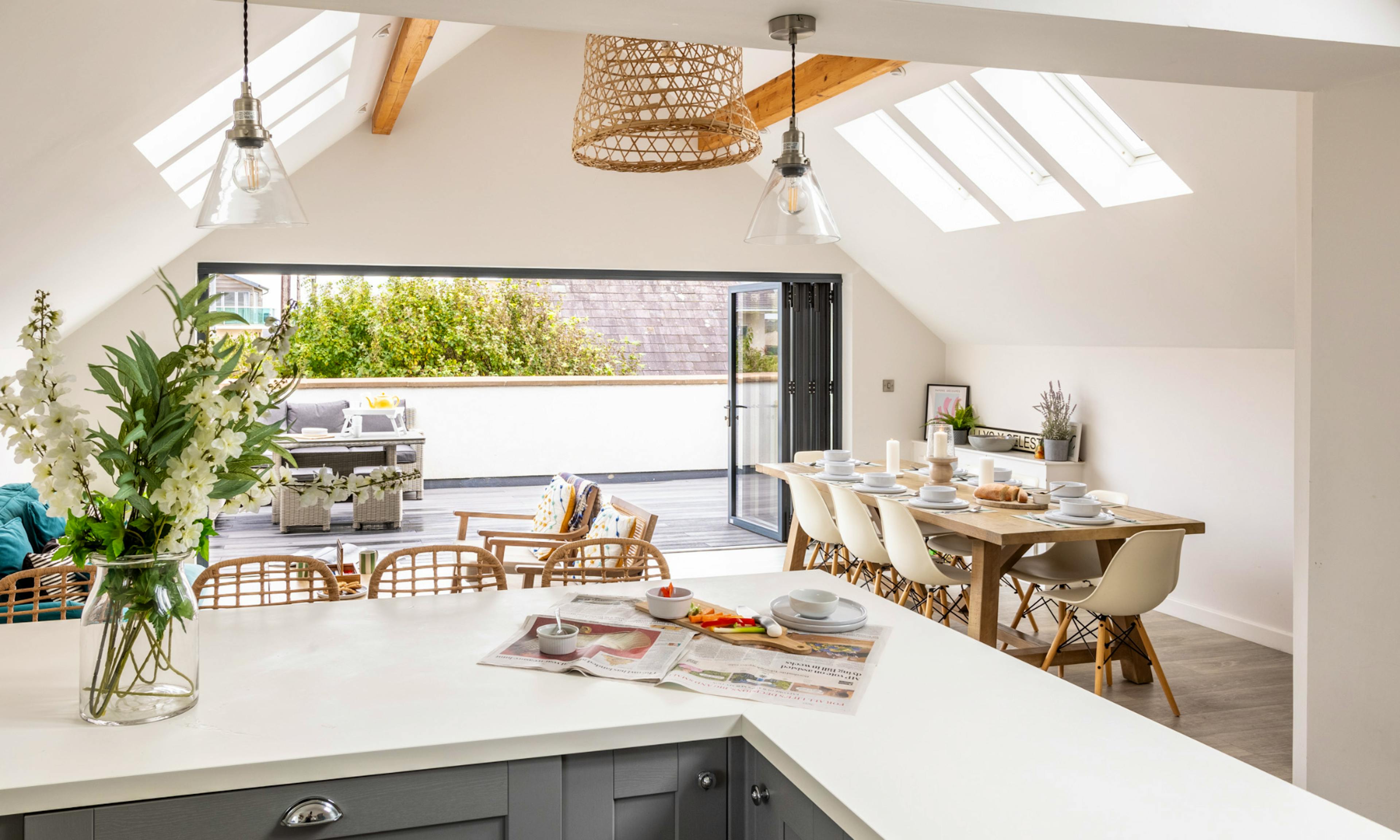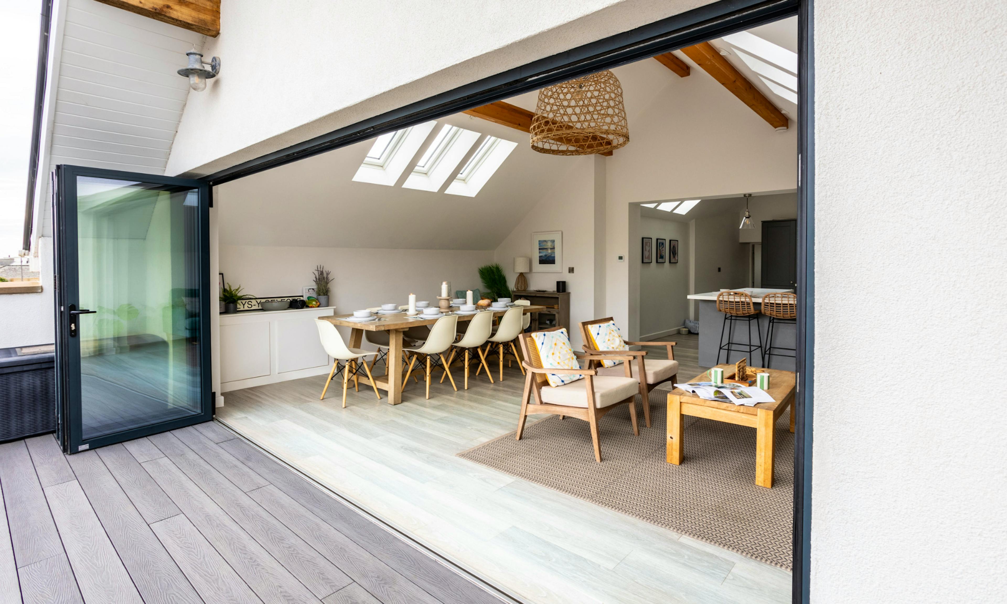 Light-filled open-plan living space upstairs with vaulted ceilings, a sleek kitchen, oversized sofas and a glass wall that opens onto a decked terrace with sea views.
